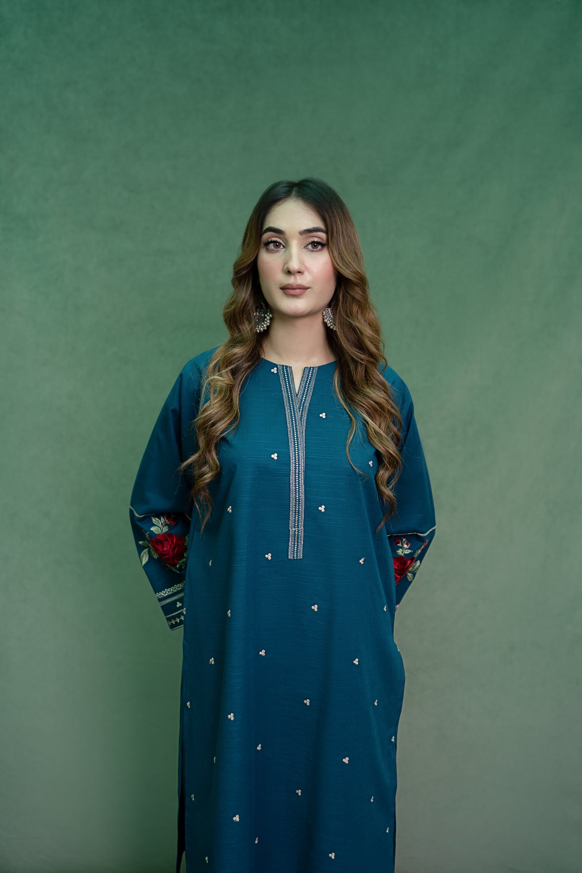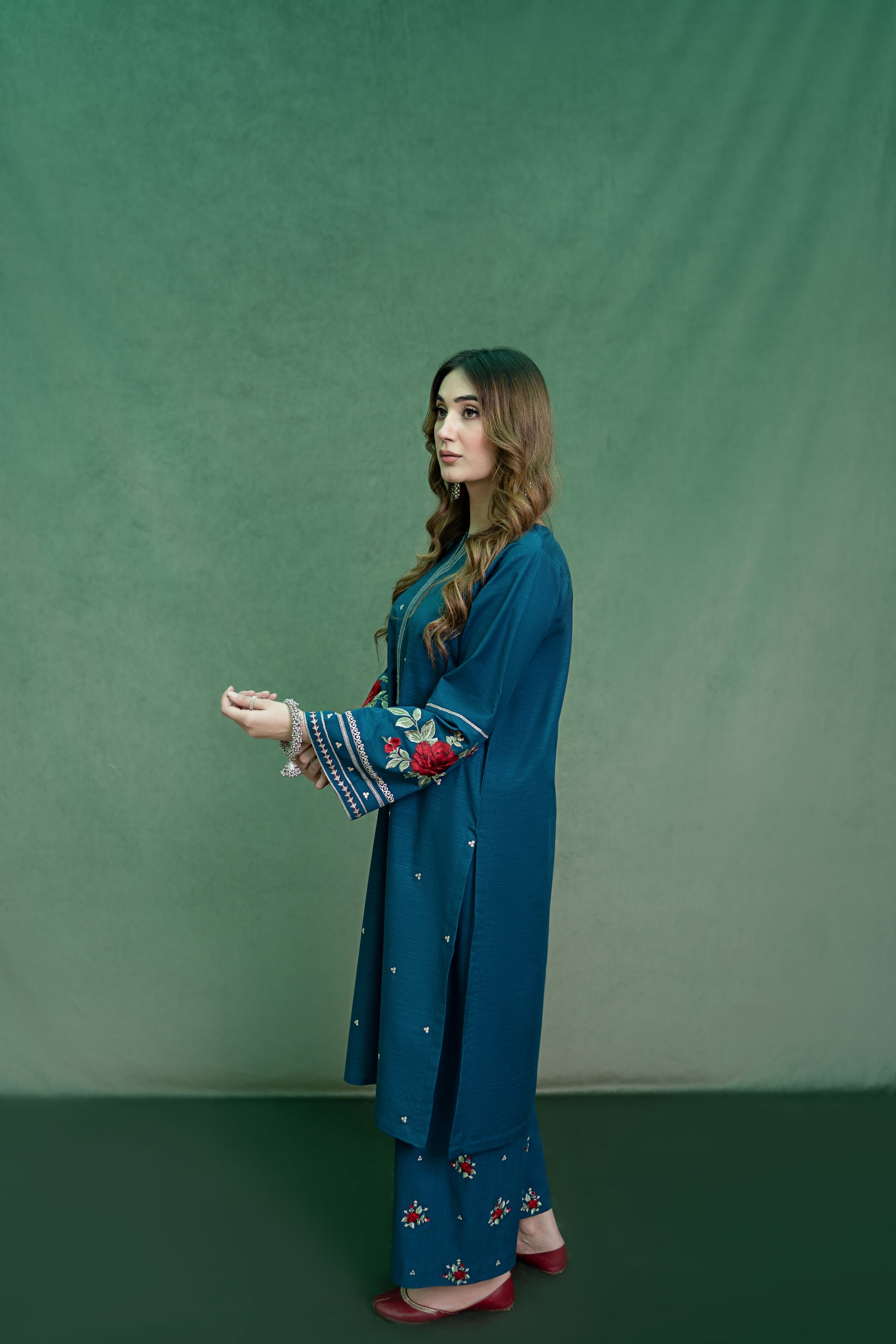 Experience the elegant beauty of GULRUKH, a 2-piece khaddar suit that is ready to wear. Adorned with a spray of embroidered motifs on the neckline and shirt front, this suit exudes a sophisticated charm. The loose sleeves feature a beautiful floral embroidery motif, perfectly paired with loose embroidered trousers. Elevate your wardrobe with GULRUKH.