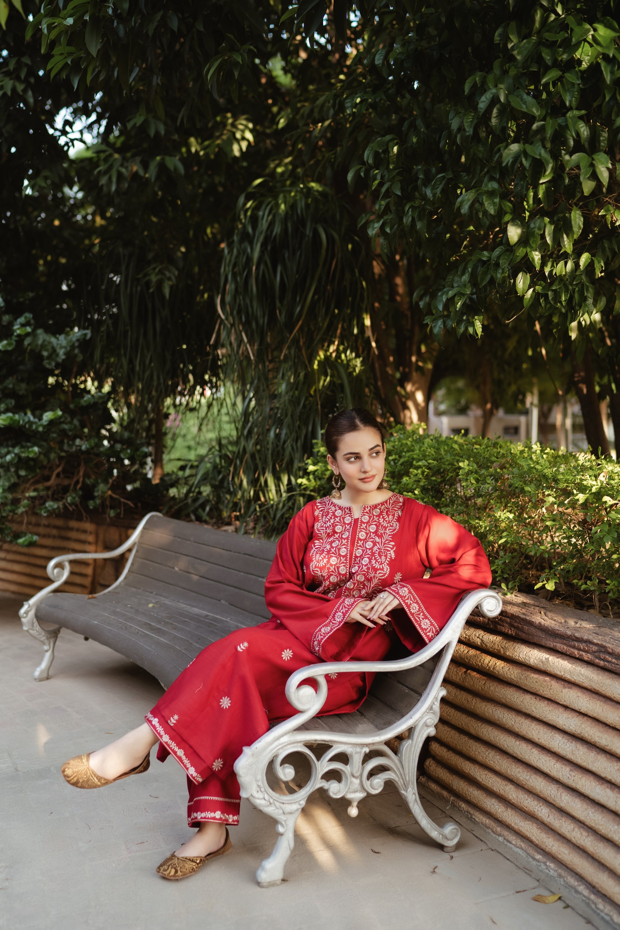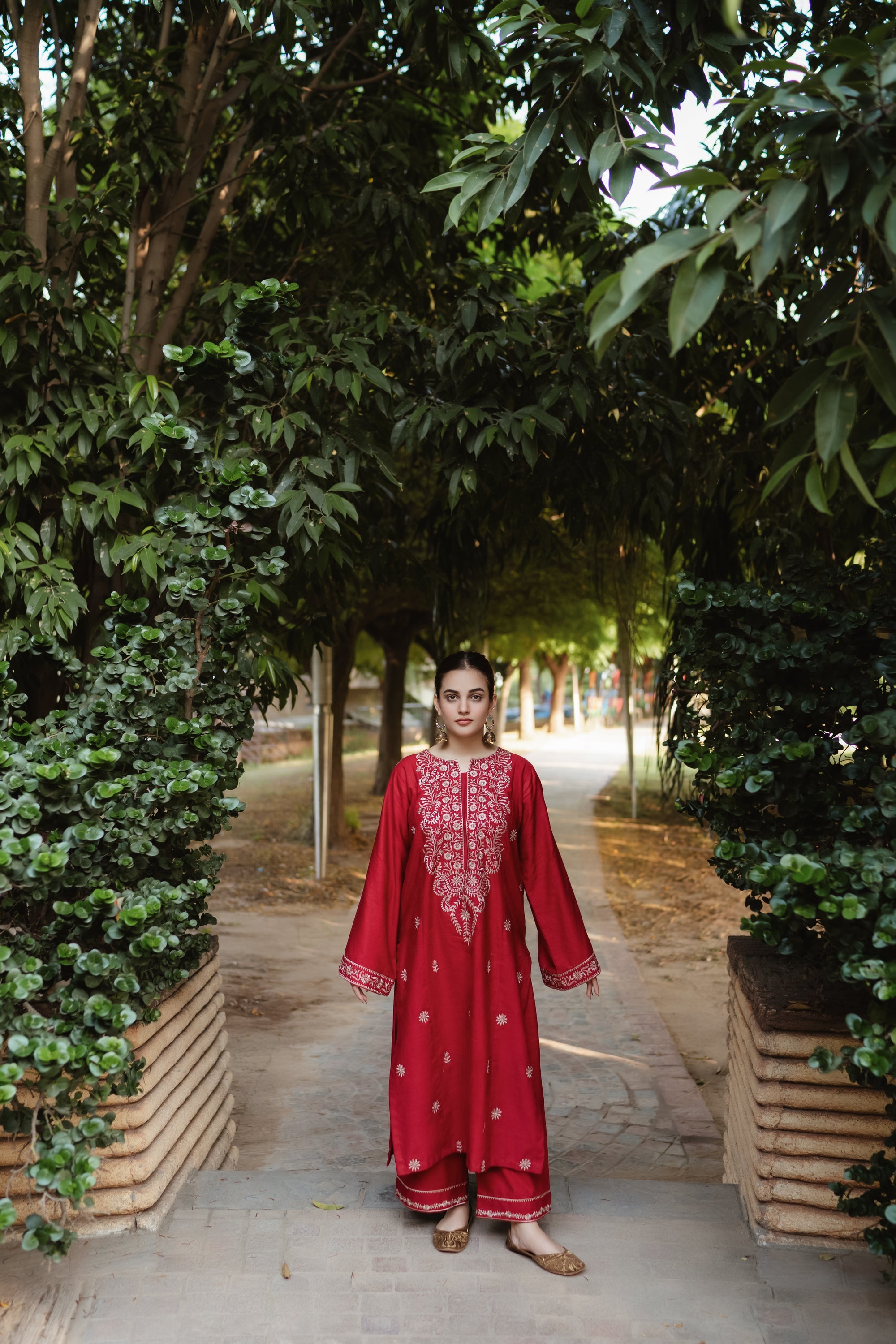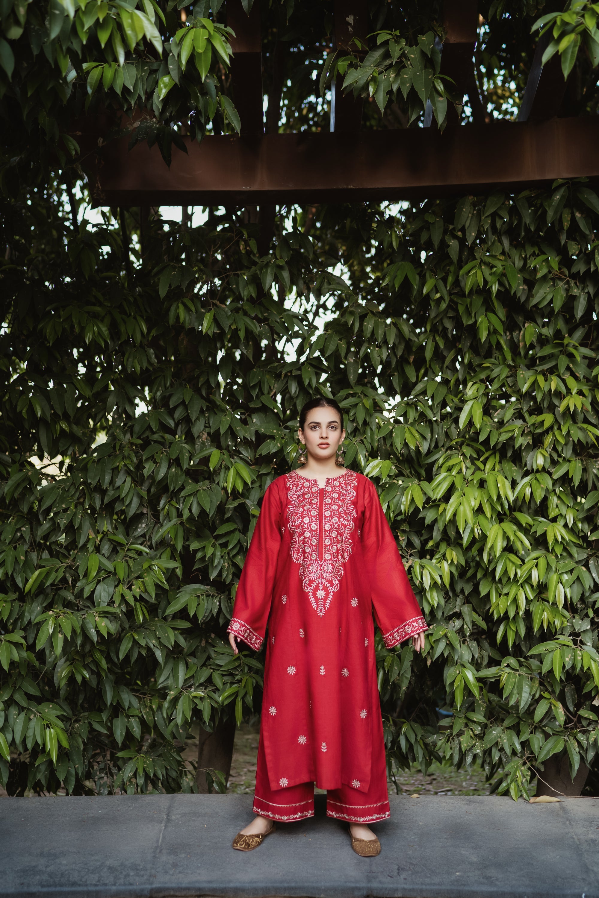 Introducing ISARA - the perfect addition to your wardrobe. This 2pc embroidered khaddar suit is ready to wear, featuring exquisite embroidery on the neckline and a delicate spray of embroidery motifs on the shirt front. Paired with embroidered loose sleeves and trousers, this suit exudes elegance and style. Available now!