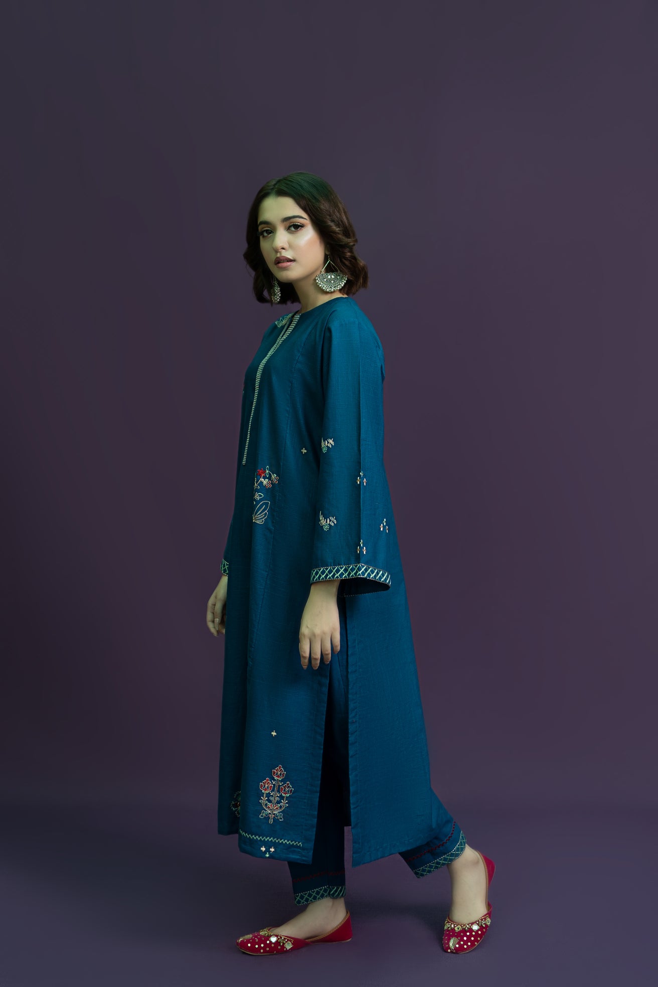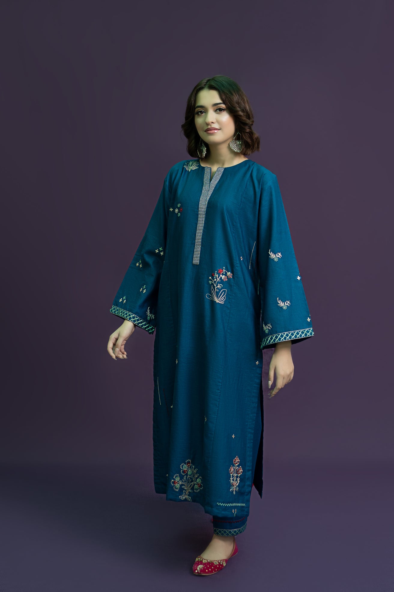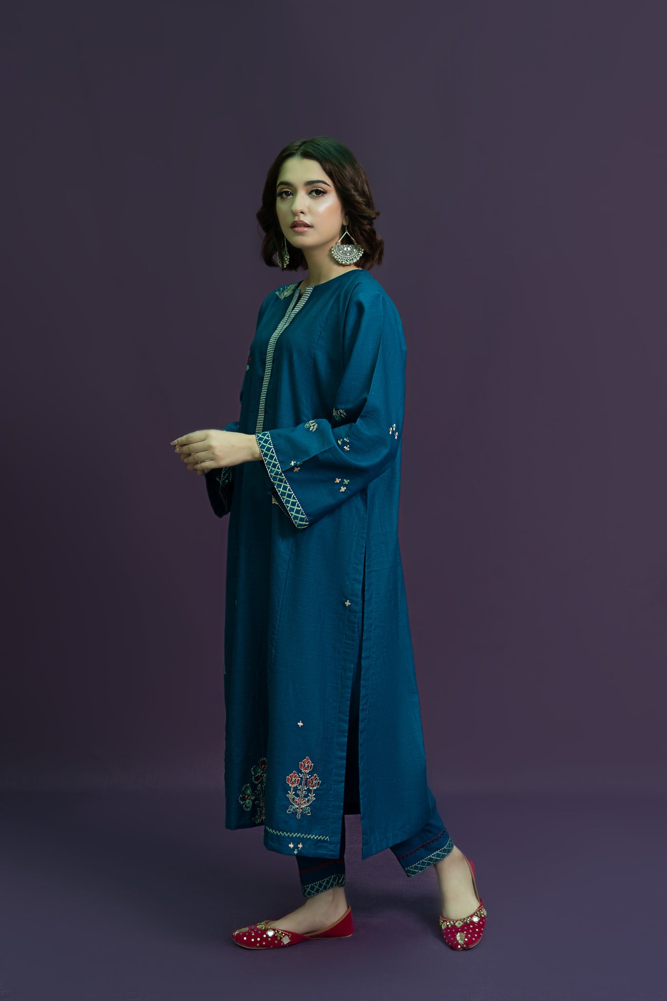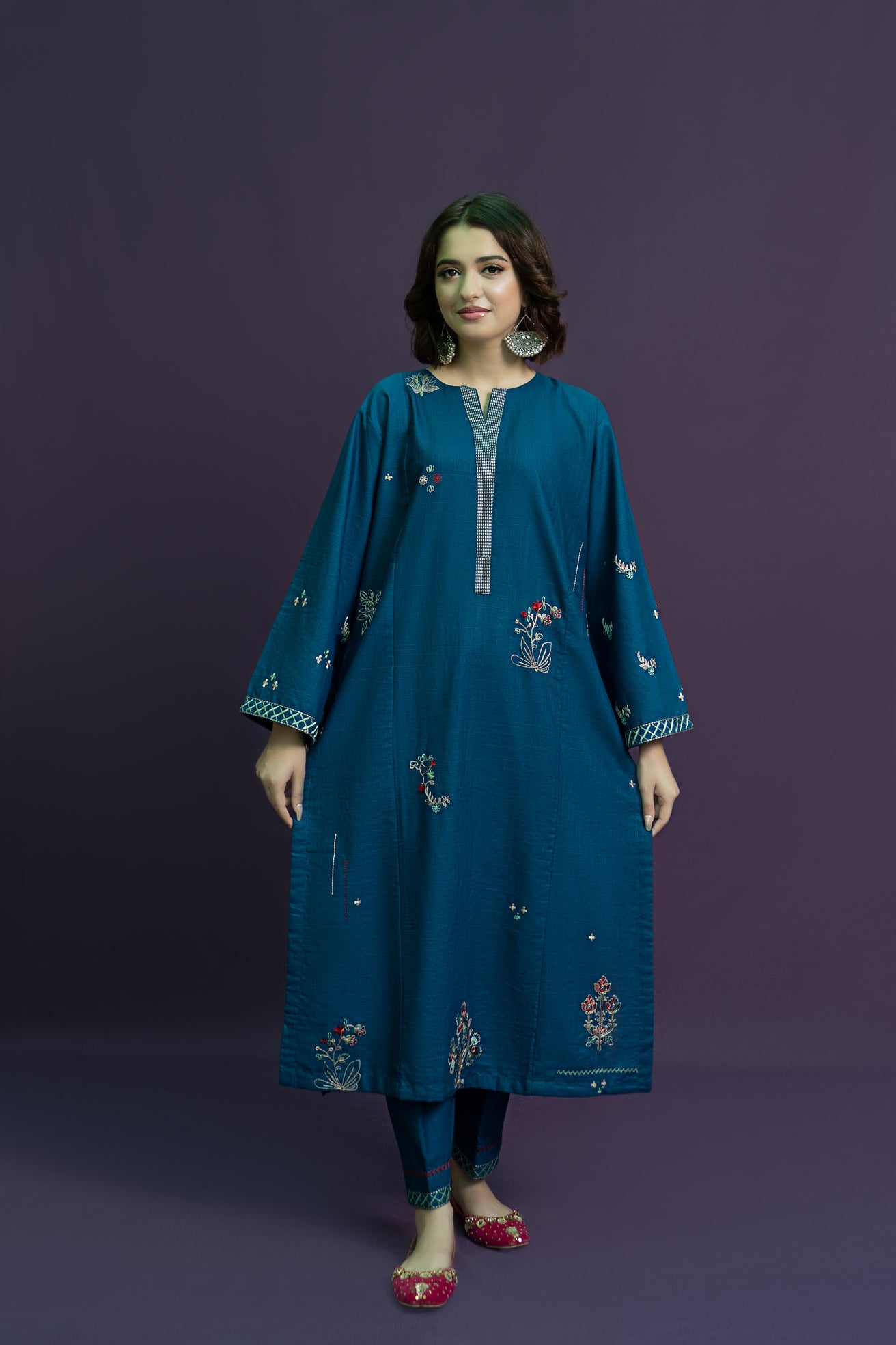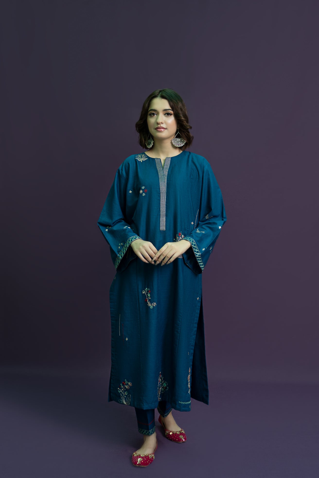 Introducing TARA, the perfect ready-to-wear 2pc embroidered khaddar suit. Featuring unique embroidery motifs on the shirt front and sleeves, paired with embroidered straight trousers. Elevate your style with this one-of-a-kind ensemble.