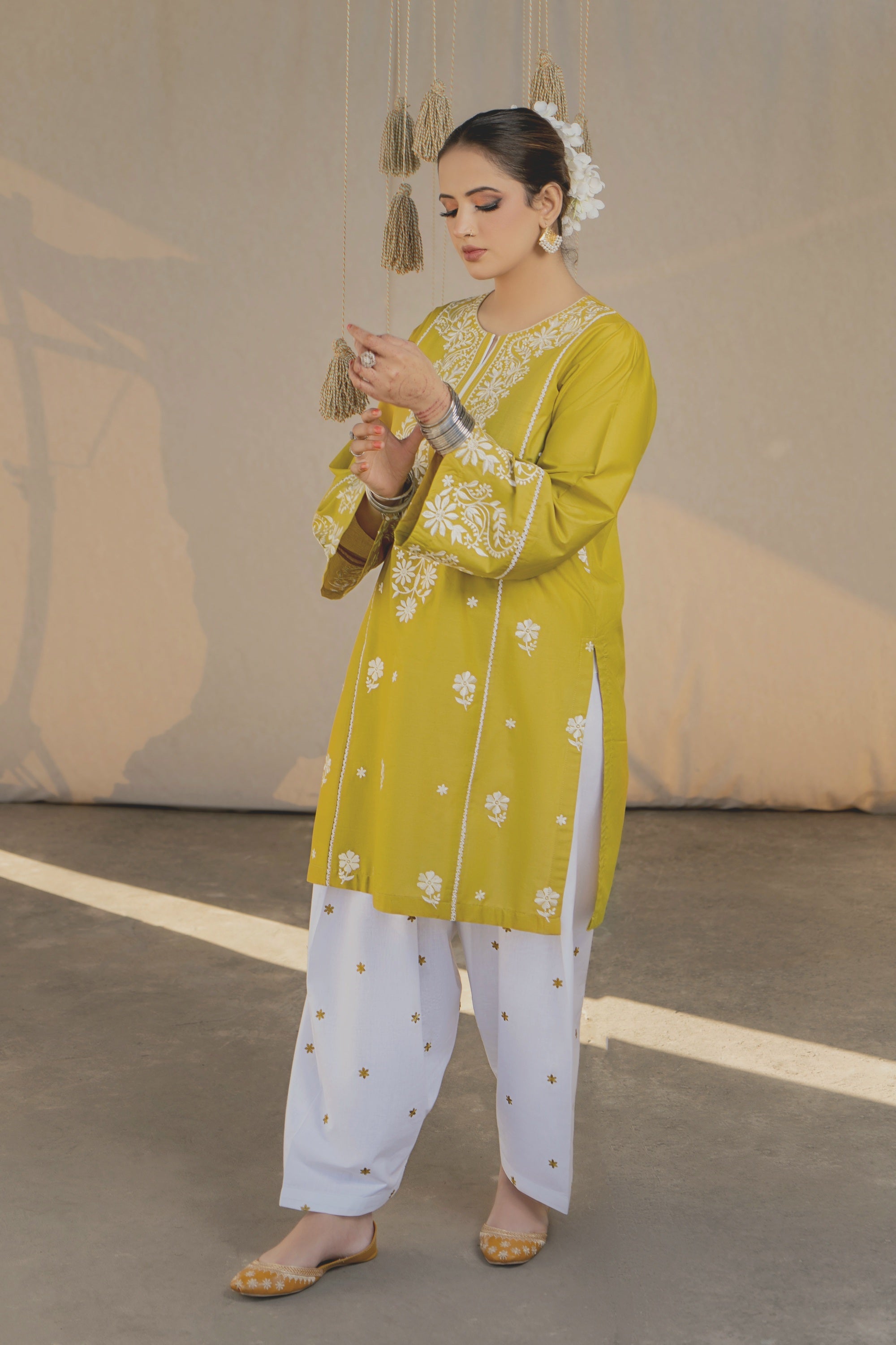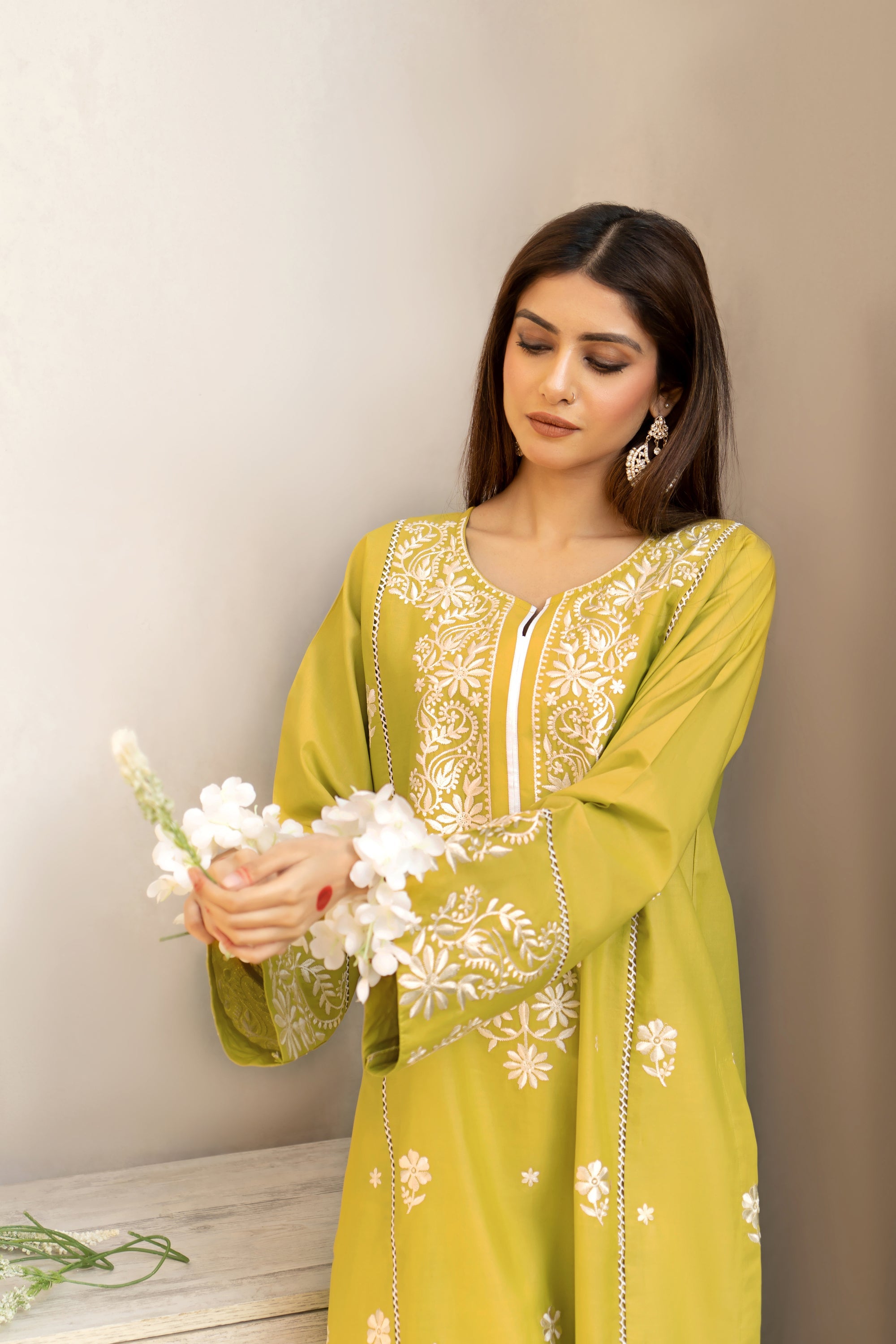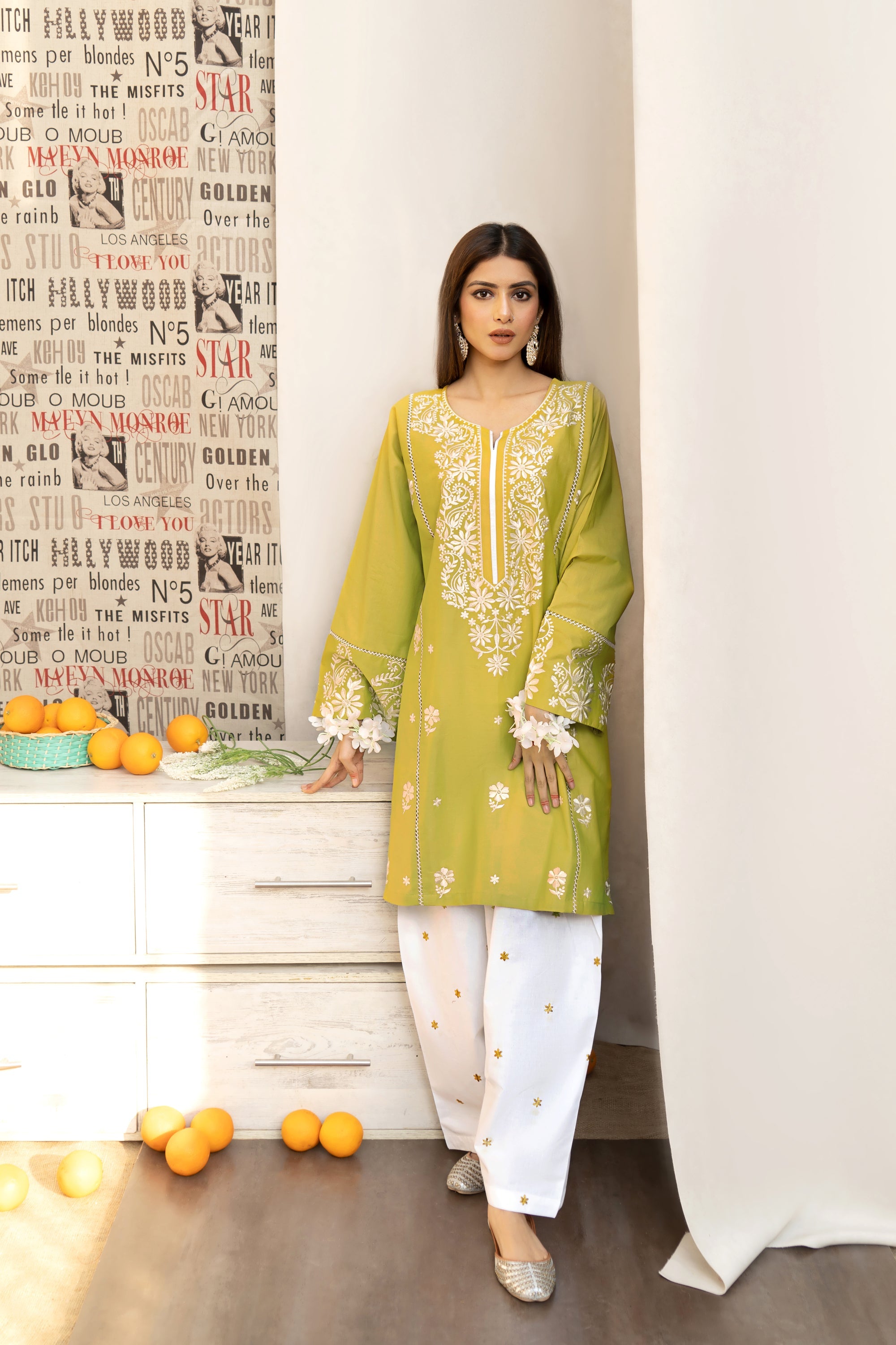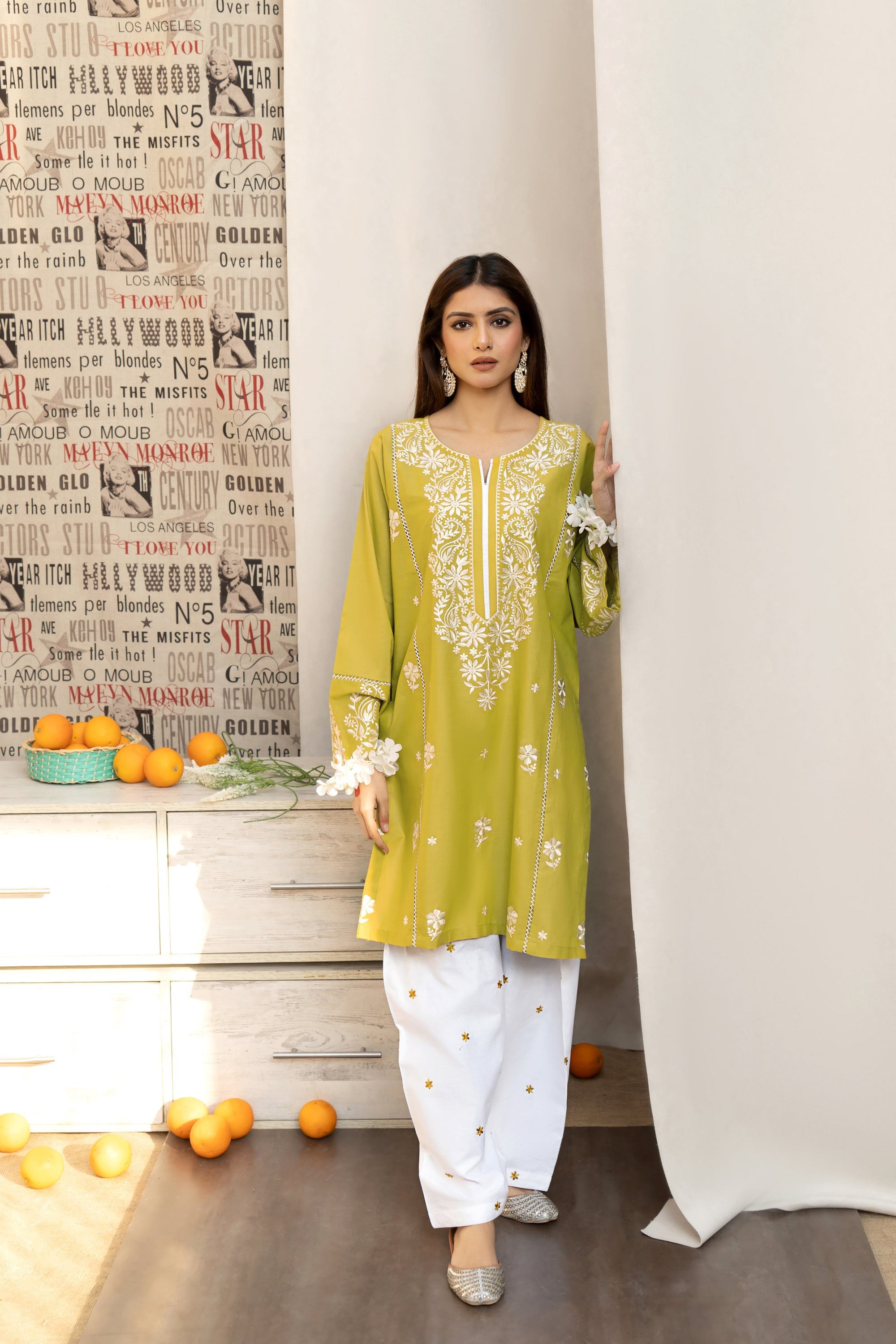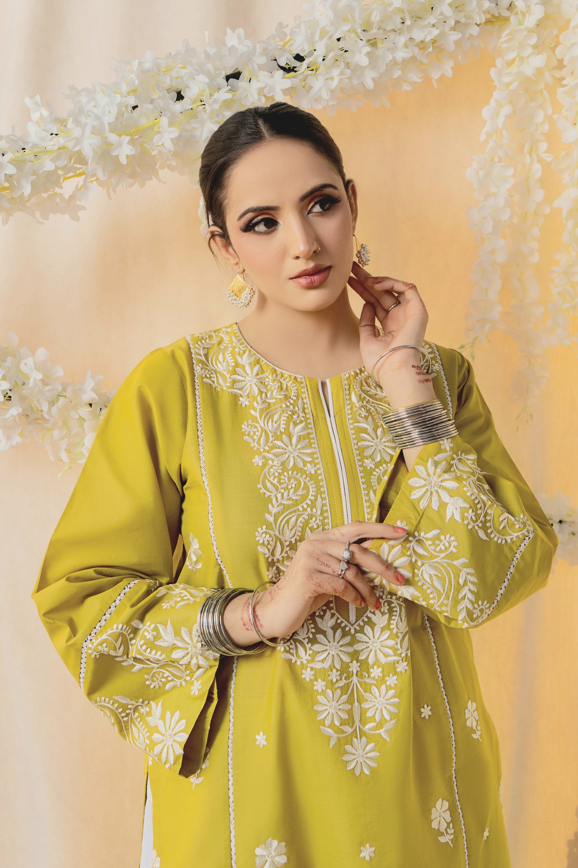 Get ready to elevate your summer style with the must-have ensemble of the season: the Ready-to-Wear 2-Piece Embroidered Suit! This effortlessly chic outfit features a short shirt adorned with stunning floral embroidery delicately gracing the neckline, exuding feminine charm with every detail. But the magic doesn't stop there - a delightful spray of intricate embroidery motifs adorns both the shirt and sleeves, adding a touch of whimsy and sophistication. Paired with a classic shalwar, this ensemble is the epitome of summer desi elegance, promising to turn heads and make a statement wherever you go. Embrace the essence of summer in style with this timeless ensemble!