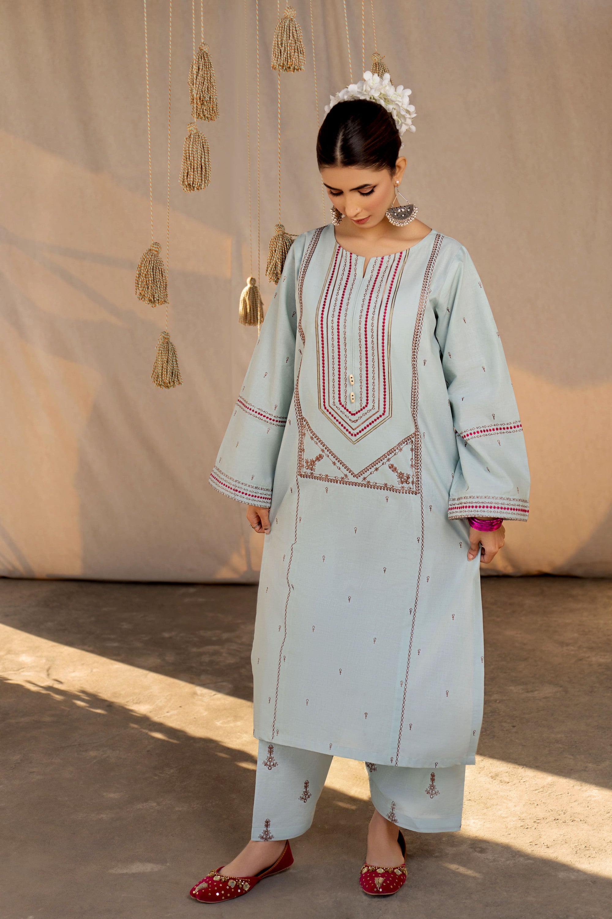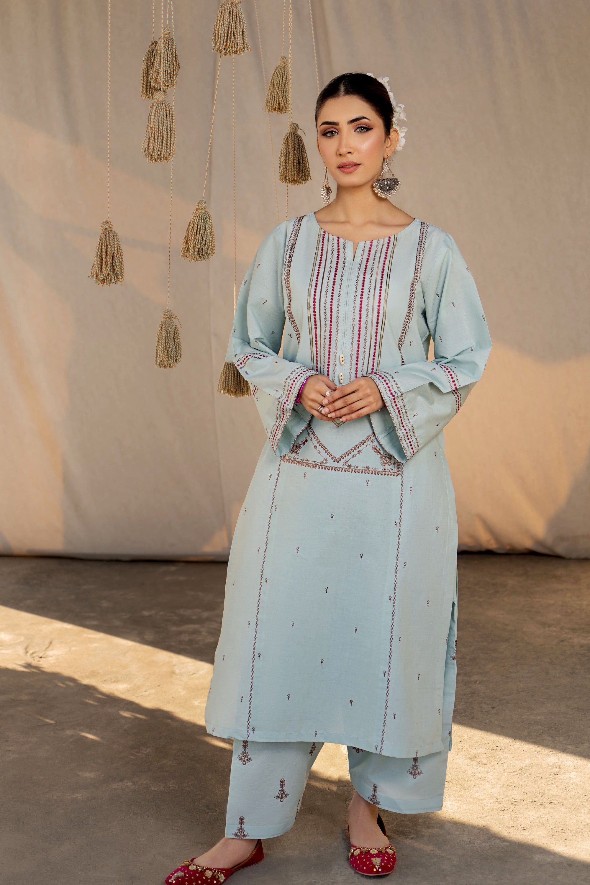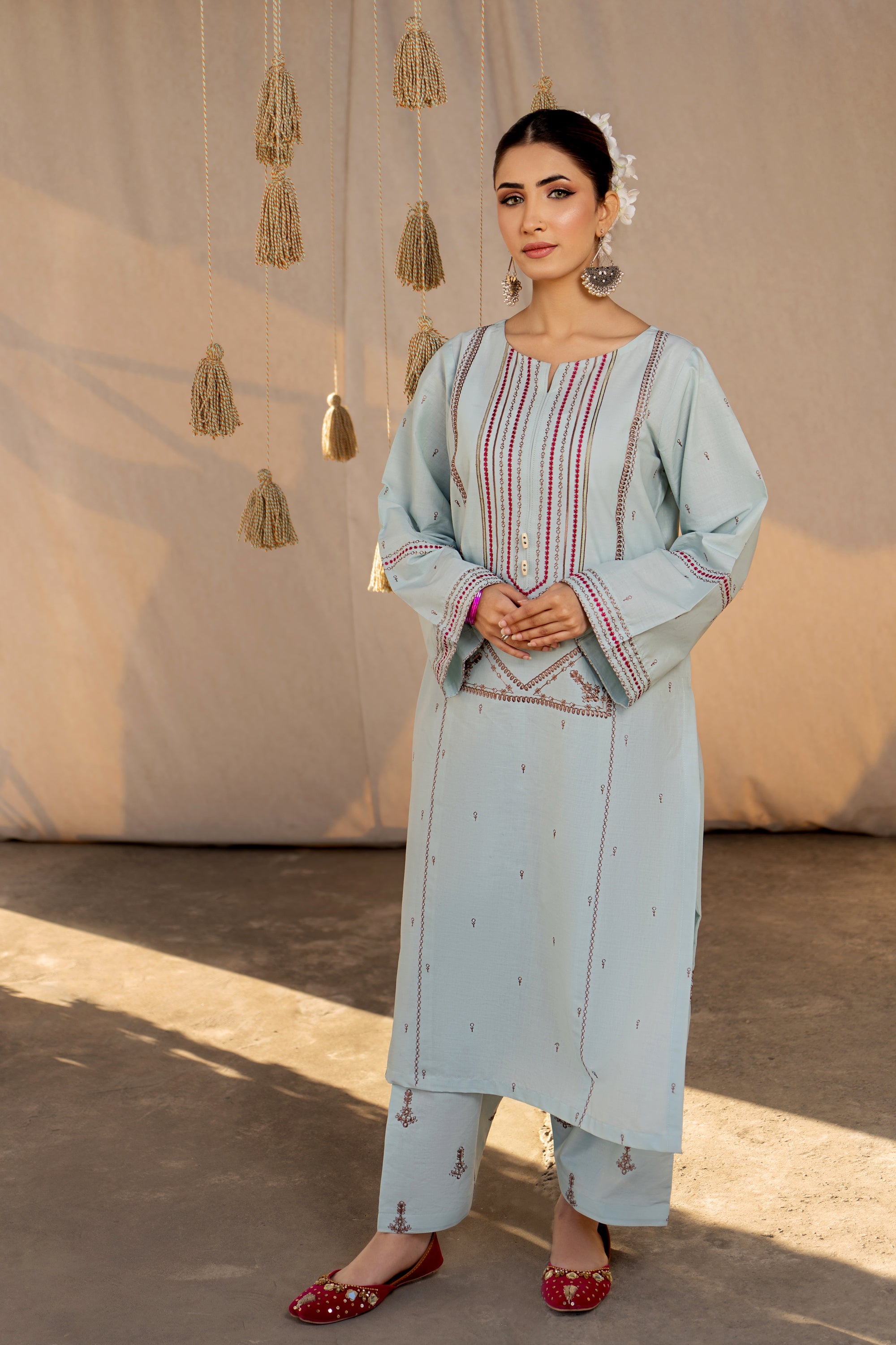 Dive into a world of ethnic allure and timeless elegance with this captivating ready-to-wear 2-piece lawn embroidered suit. The shirt steals the spotlight with a mesmerizing spray of motifs embellishing the front, sleeves, and trousers, exuding an enchanting charm that's hard to resist. A focal point of beauty lies in the exquisite embroidery gracing the center panel, adding a touch of tradition and grace to the ensemble. With delicate borders adorning the sleeves, every detail is meticulously crafted to evoke a sense of sophistication and cultural richness. Perfect for any occasion, this ensemble effortlessly blends contemporary style with ethnic allure, ensuring you make a statement wherever you go. Paired with the classic shalwar, it completes the look with a nod to tradition, elevating your style with a touch of timeless sophistication.