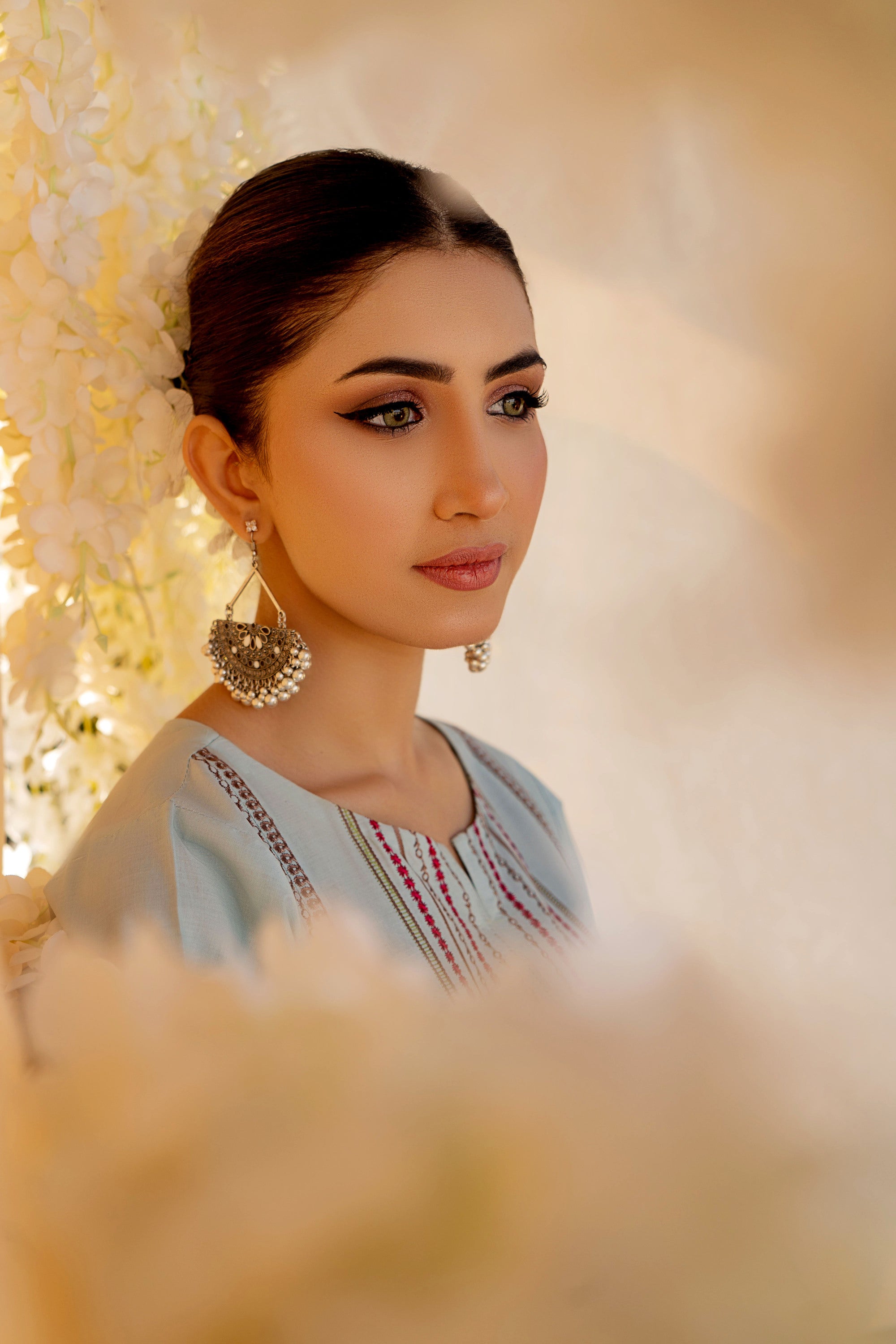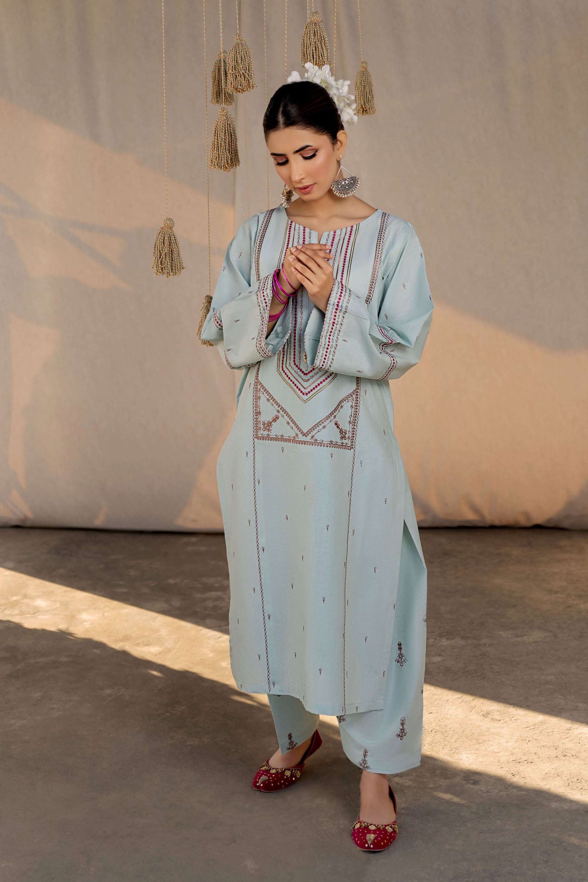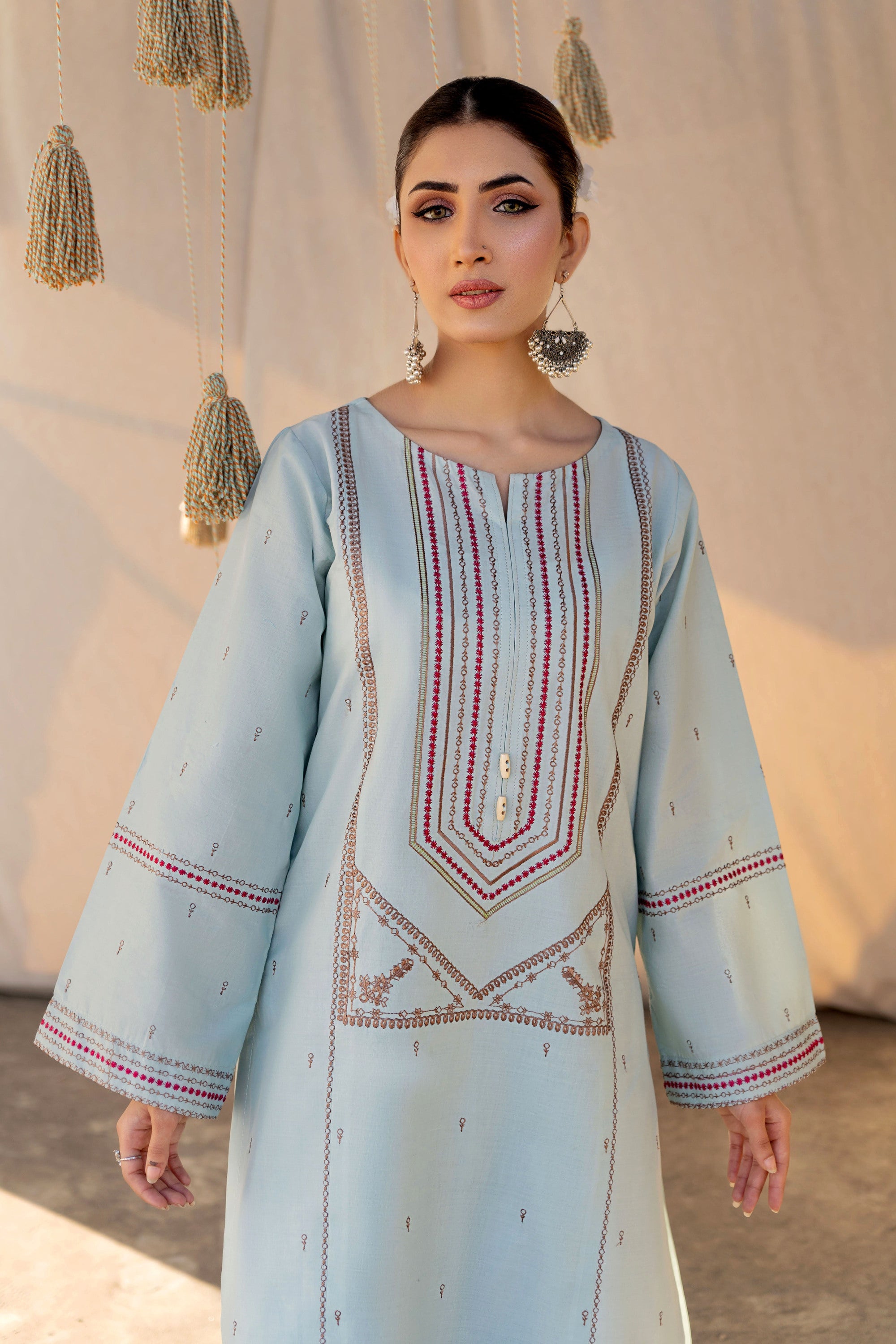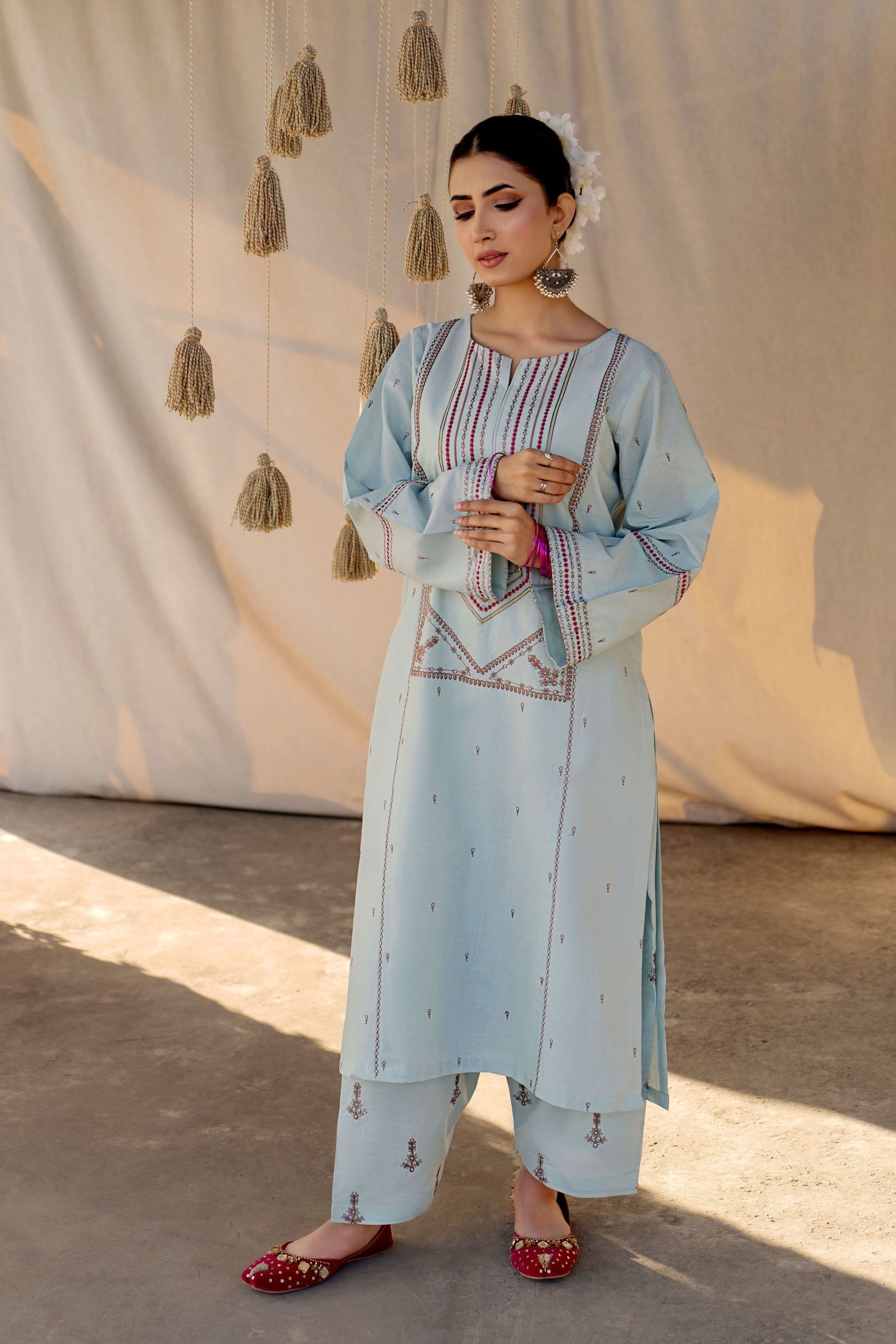 Dive into a world of ethnic allure and timeless elegance with this captivating ready-to-wear 2-piece lawn embroidered suit. The shirt steals the spotlight with a mesmerizing spray of motifs embellishing the front, sleeves, and trousers, exuding an enchanting charm that's hard to resist. A focal point of beauty lies in the exquisite embroidery gracing the center panel, adding a touch of tradition and grace to the ensemble. With delicate borders adorning the sleeves, every detail is meticulously crafted to evoke a sense of sophistication and cultural richness. Perfect for any occasion, this ensemble effortlessly blends contemporary style with ethnic allure, ensuring you make a statement wherever you go. Paired with the classic shalwar, it completes the look with a nod to tradition, elevating your style with a touch of timeless sophistication.
