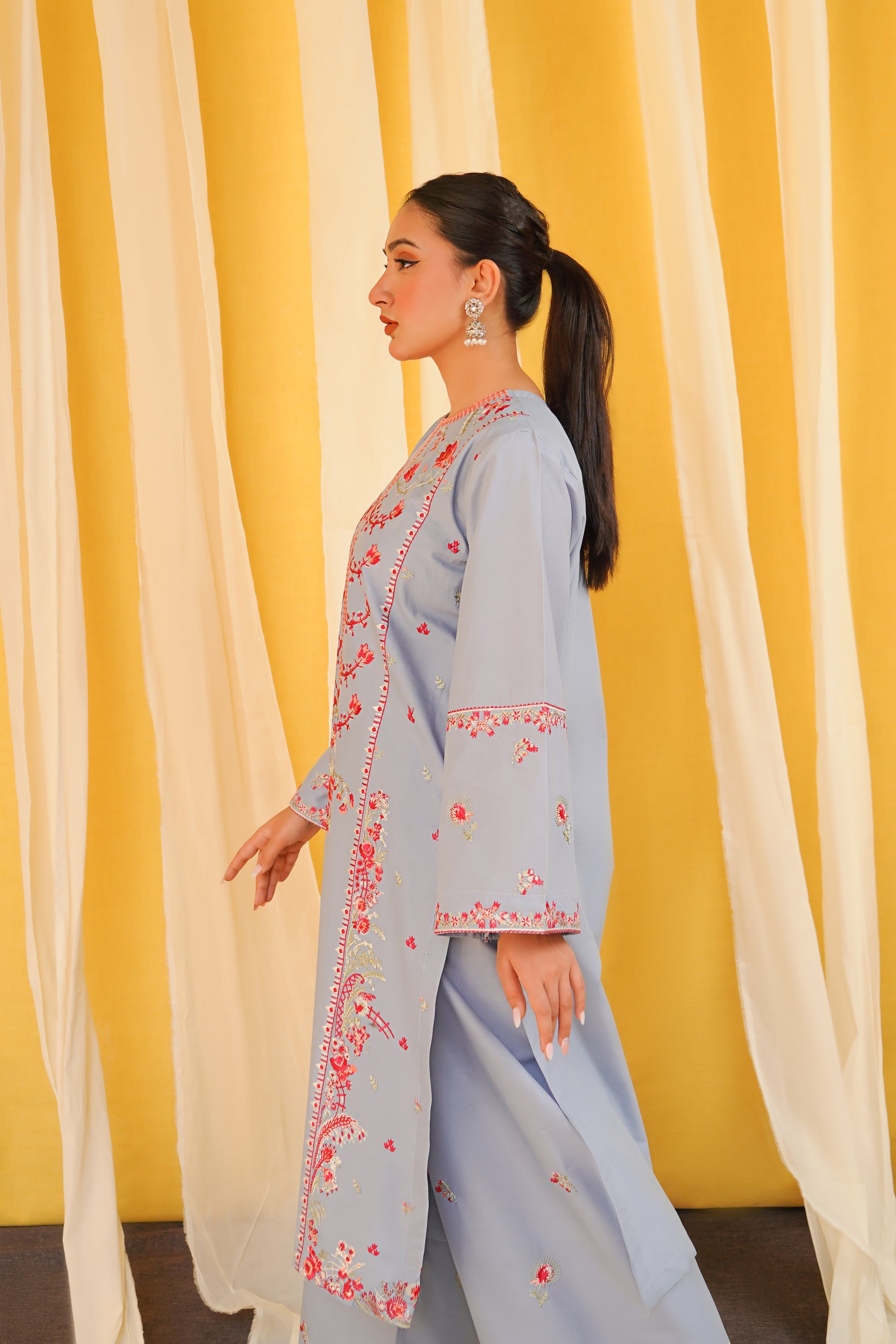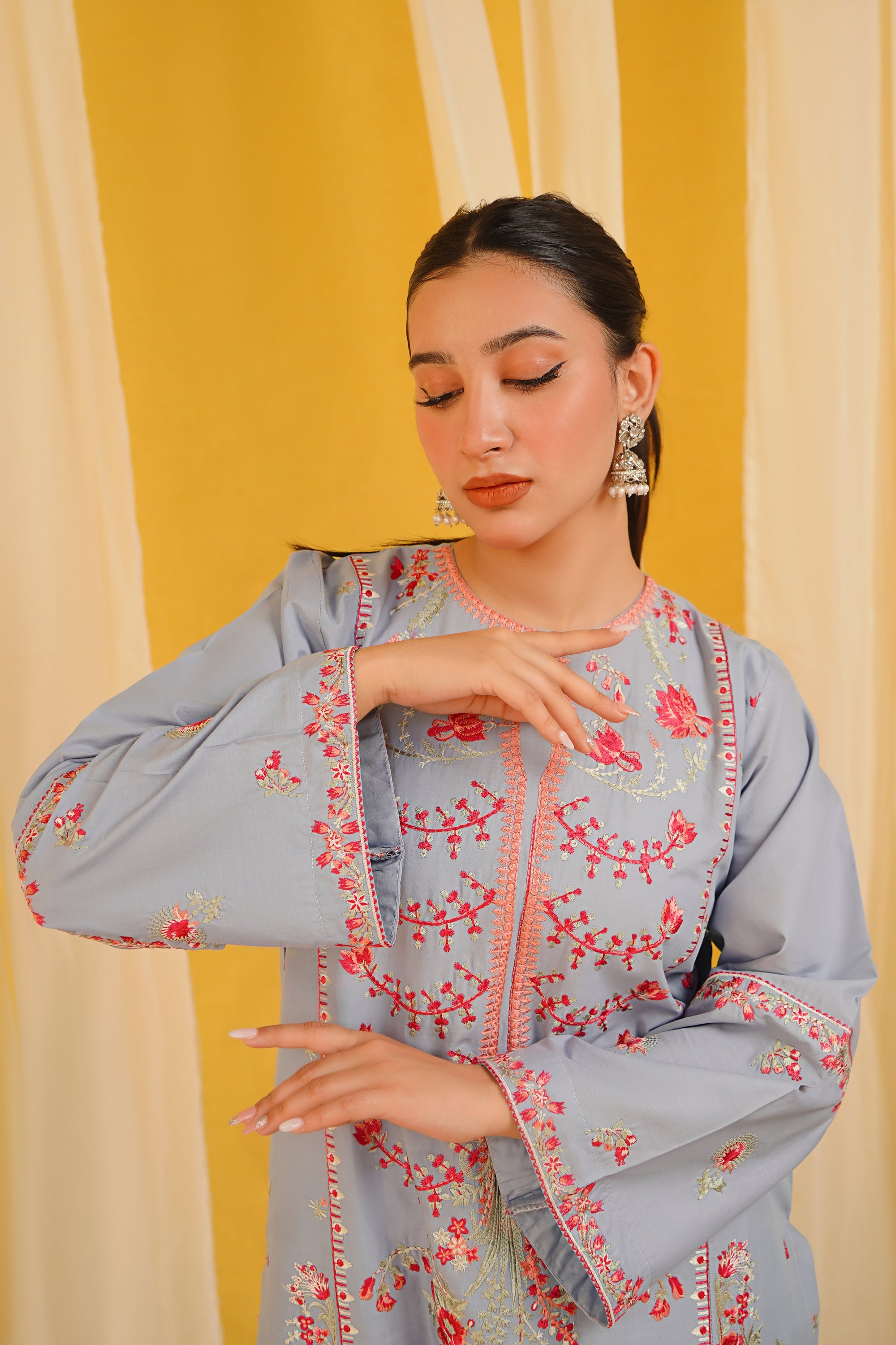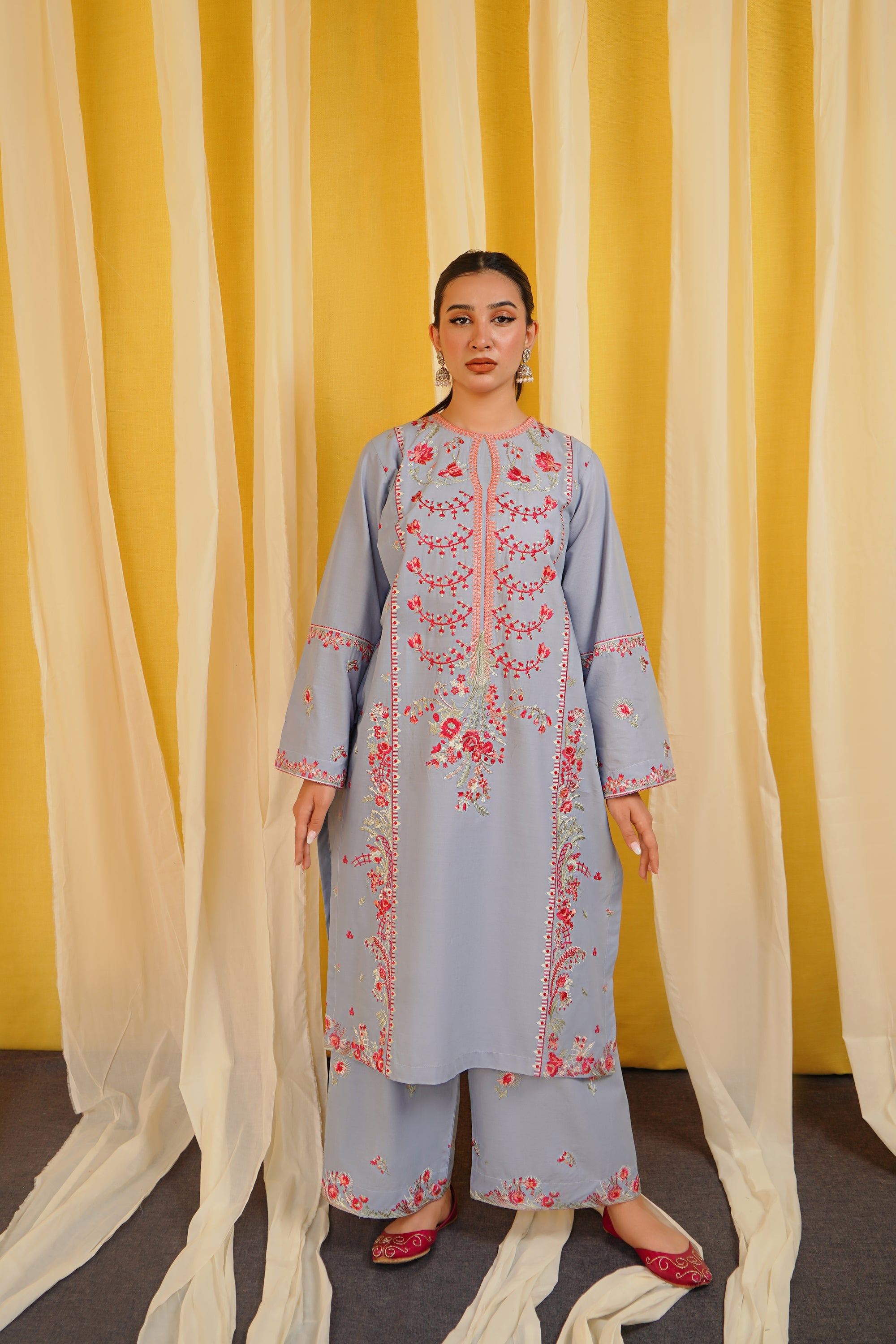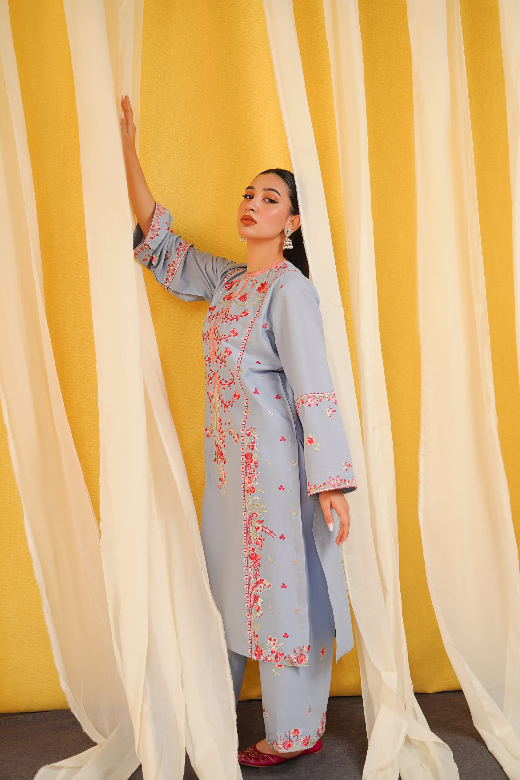Step into style effortlessly with this ready-to-wear 2-piece embroidered lawn suit! Adorned with beautiful embroidery on the shirt's front neckline and side panels, complemented by intricate motifs on the sleeves, this ensemble exudes elegance. Paired with loose trousers featuring matching embroidery, it's the perfect blend of comfort and sophistication for any occasion.