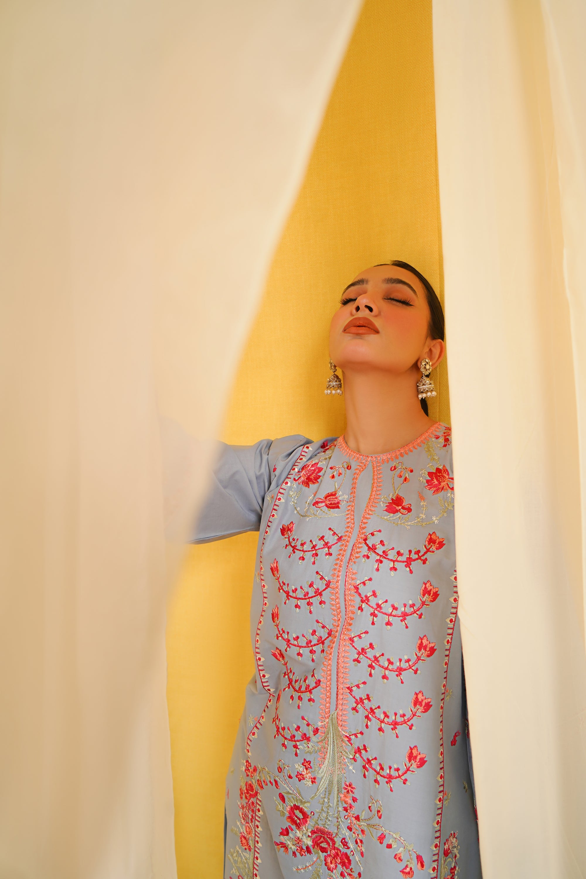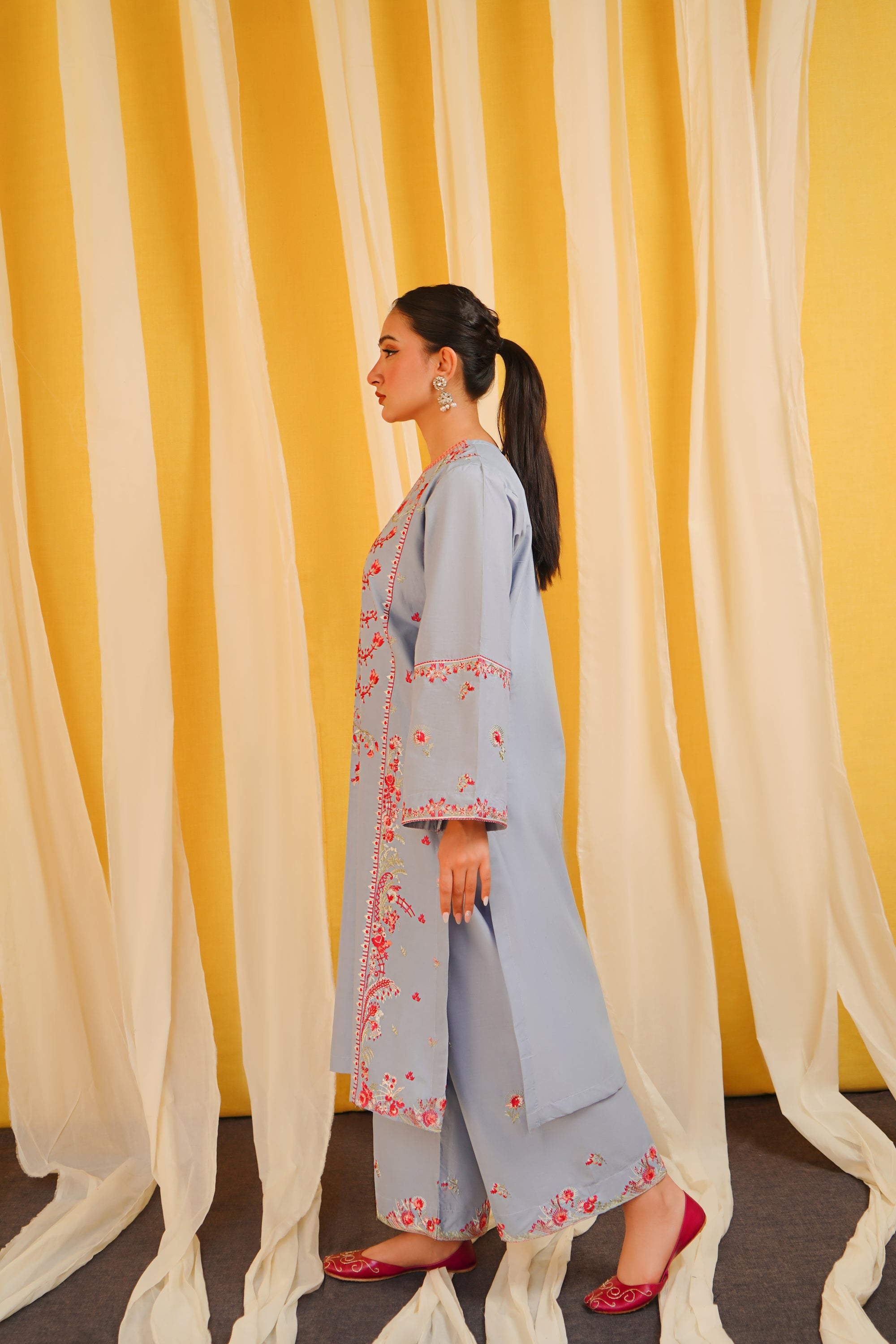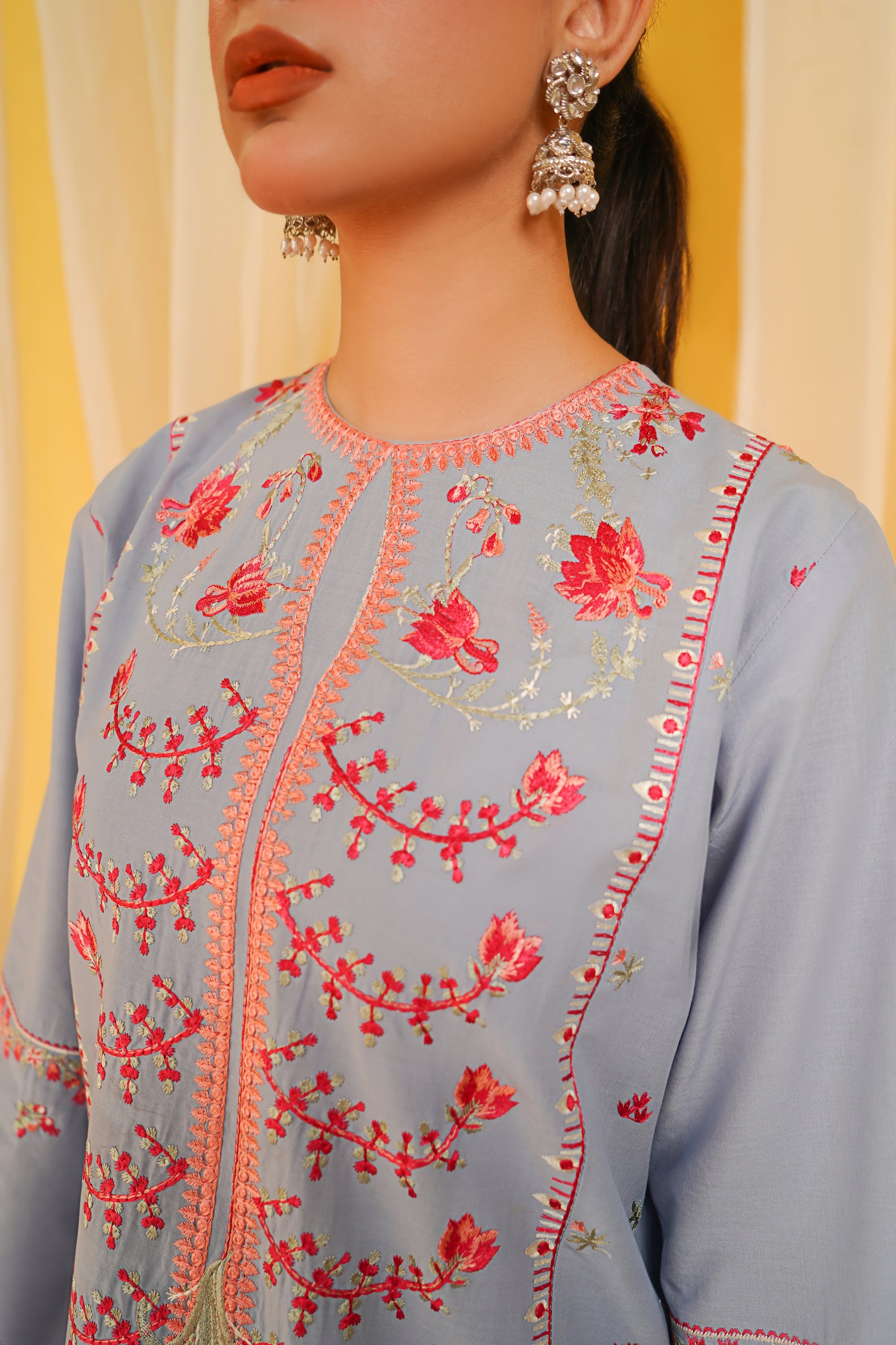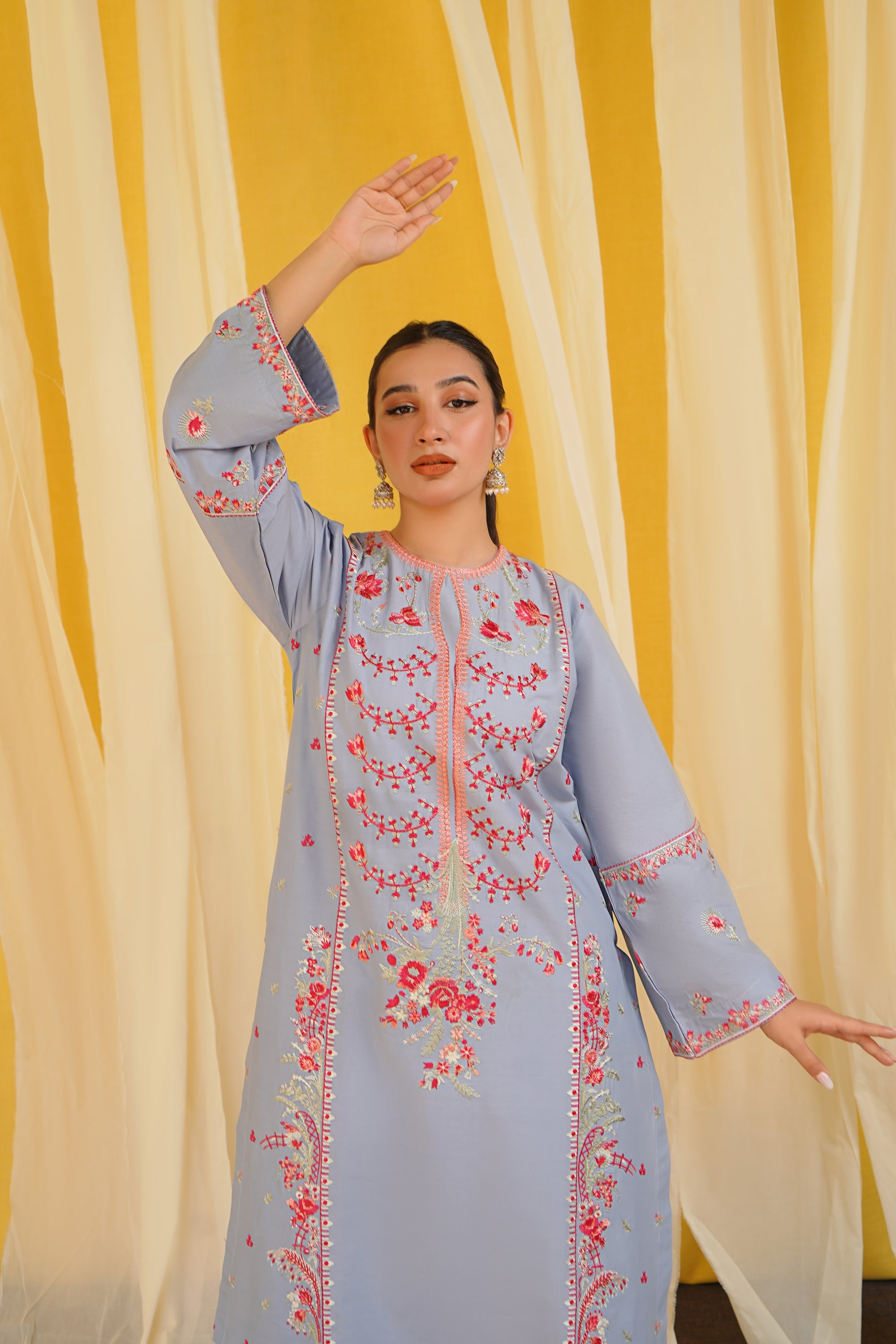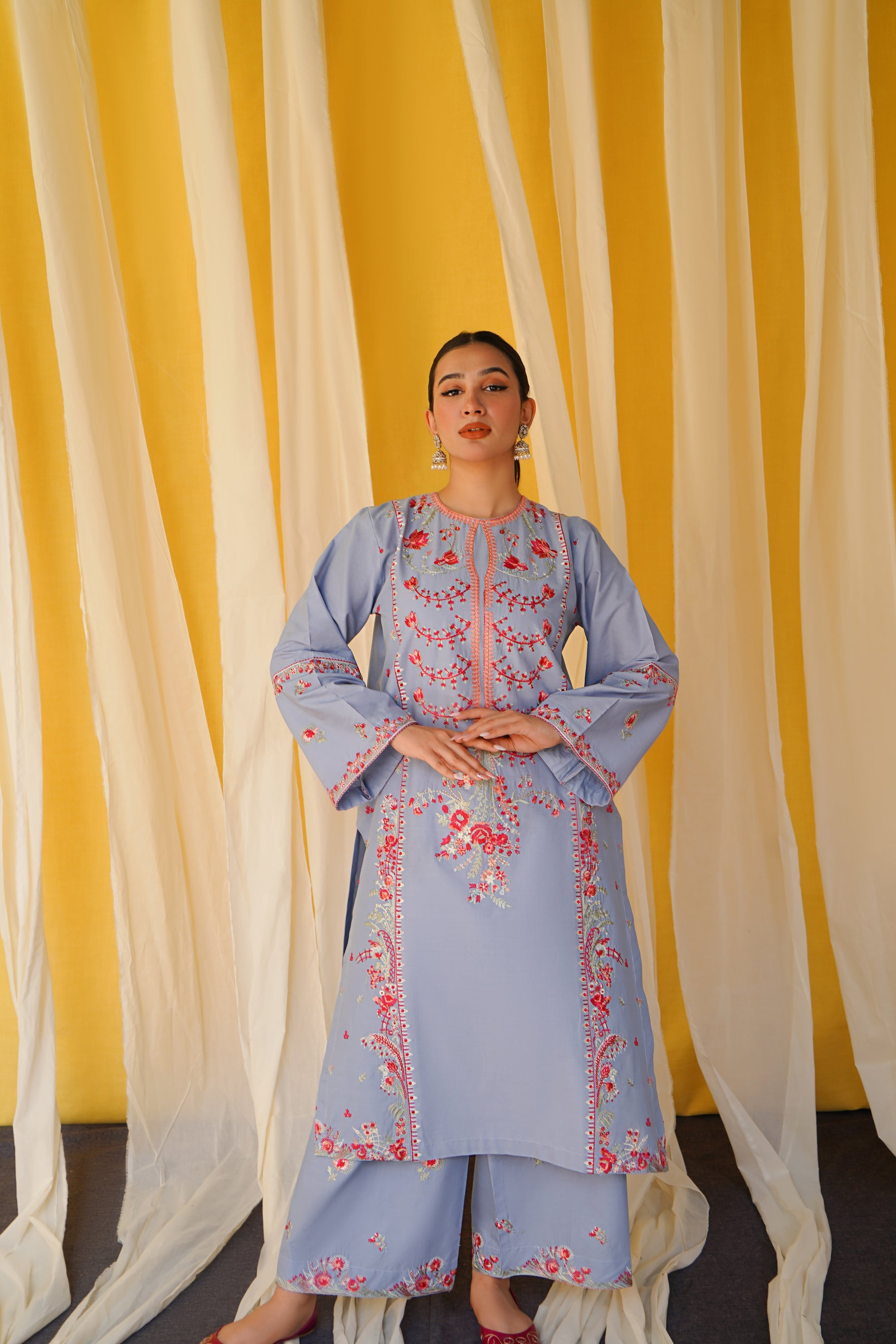 Step into style effortlessly with this ready-to-wear 2-piece embroidered lawn suit! Adorned with beautiful embroidery on the shirt's front neckline and side panels, complemented by intricate motifs on the sleeves, this ensemble exudes elegance. Paired with loose trousers featuring matching embroidery, it's the perfect blend of comfort and sophistication for any occasion.