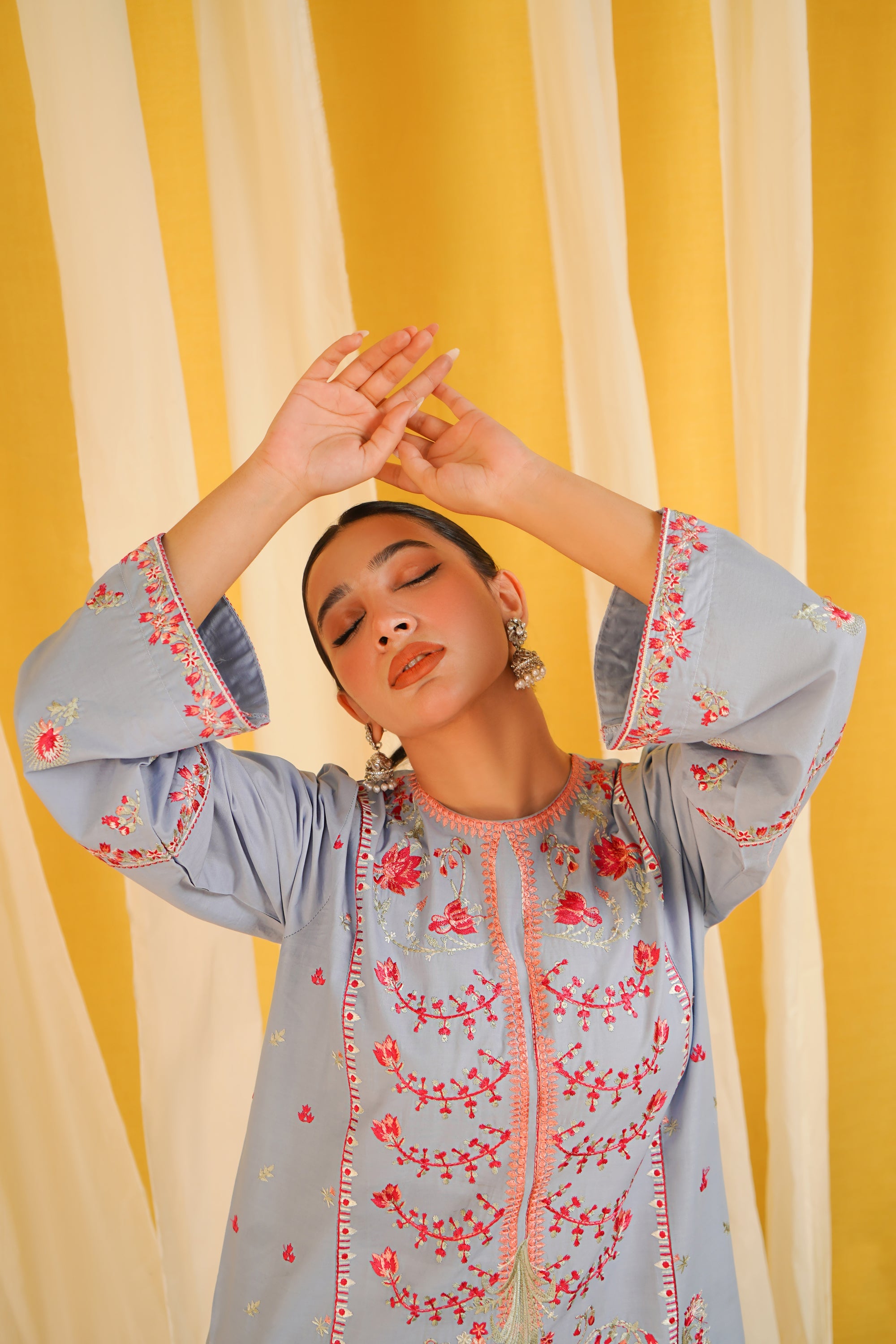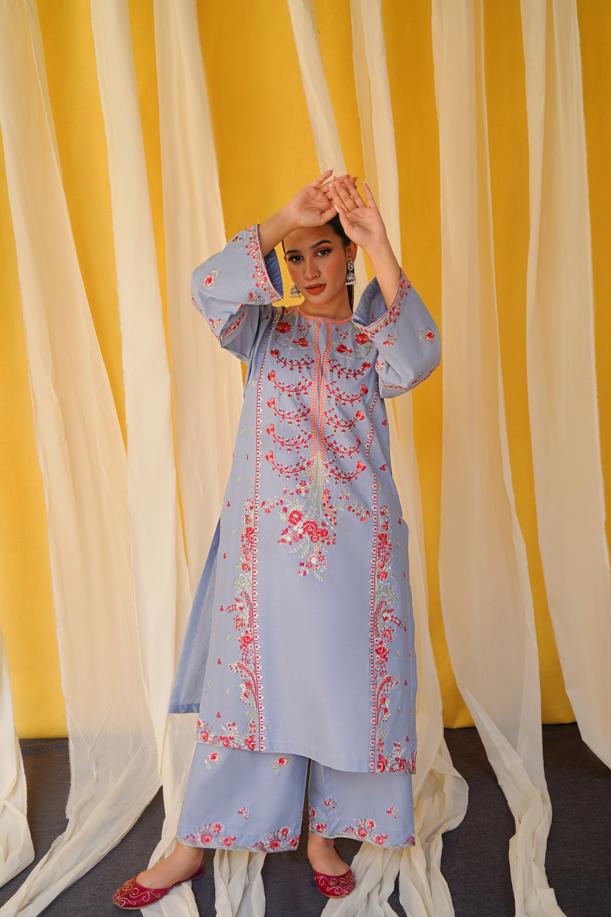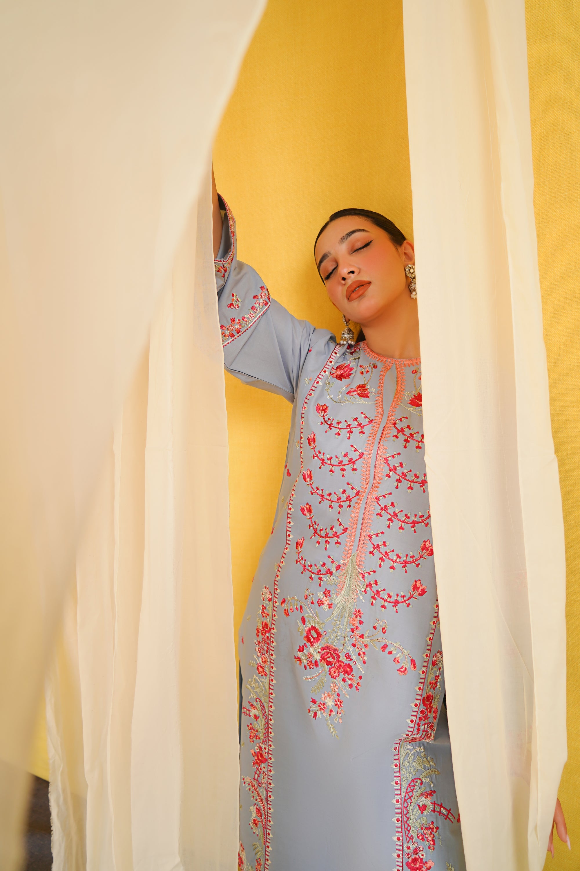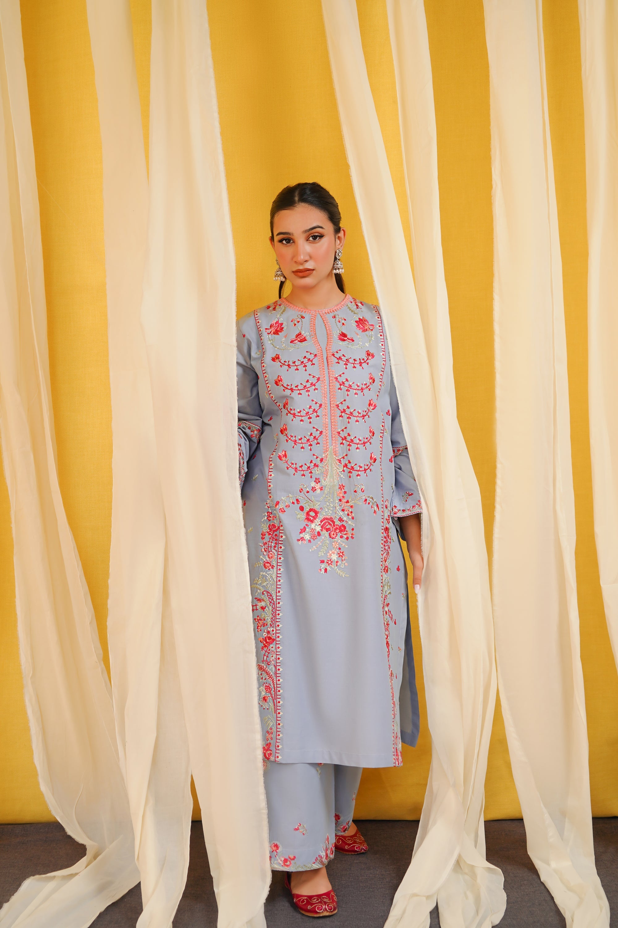 Step into style effortlessly with this ready-to-wear 2-piece embroidered lawn suit! Adorned with beautiful embroidery on the shirt's front neckline and side panels, complemented by intricate motifs on the sleeves, this ensemble exudes elegance. Paired with loose trousers featuring matching embroidery, it's the perfect blend of comfort and sophistication for any occasion.