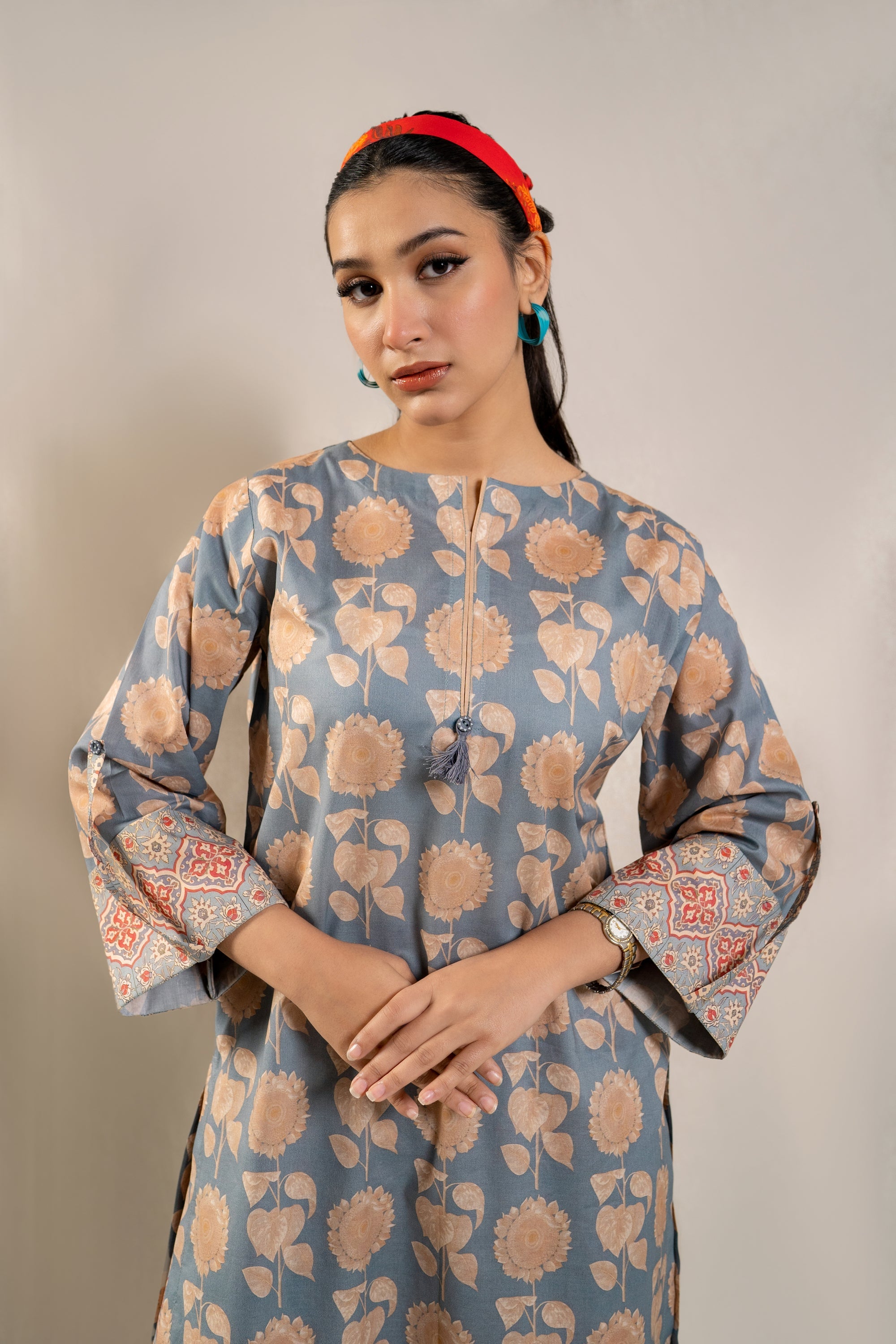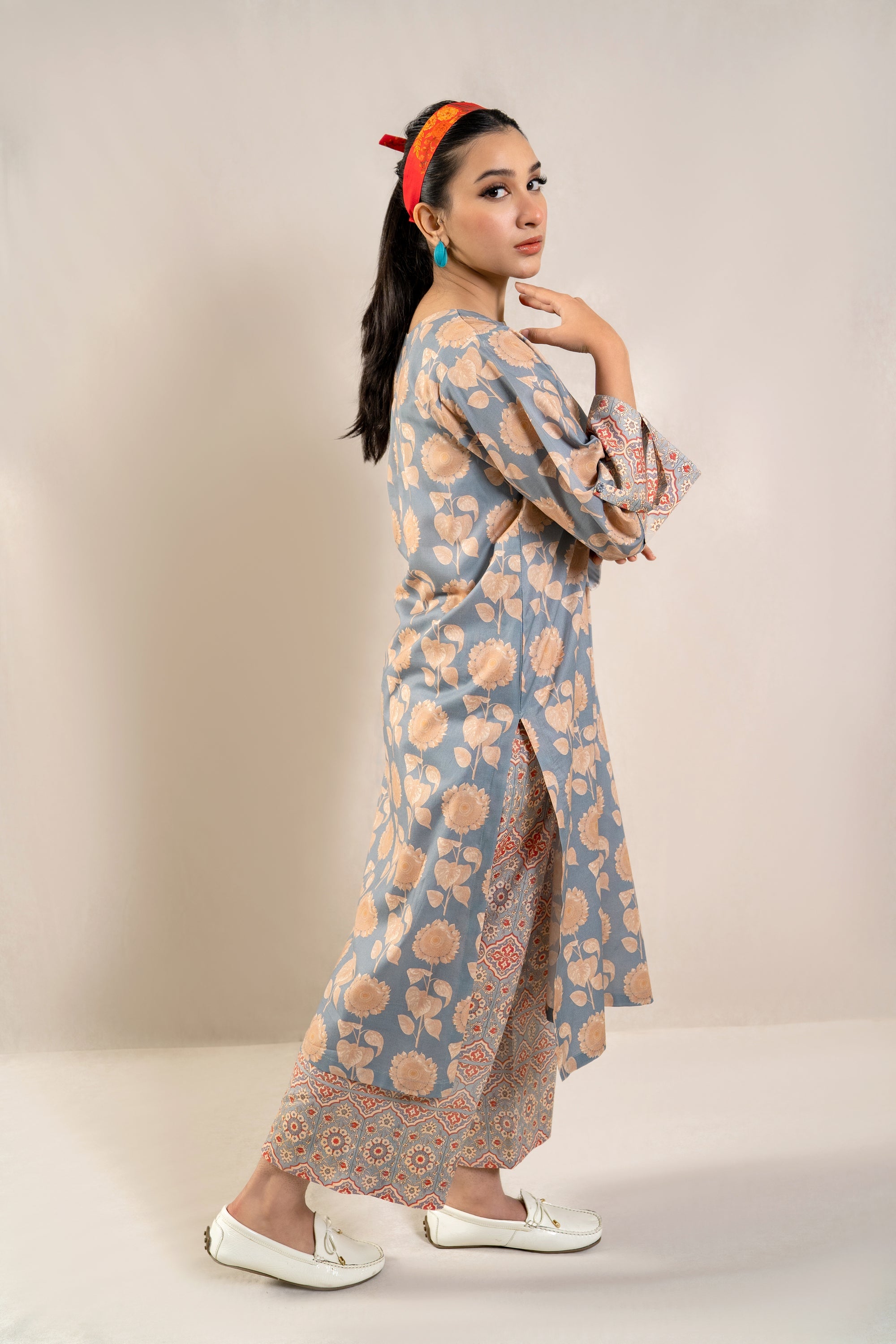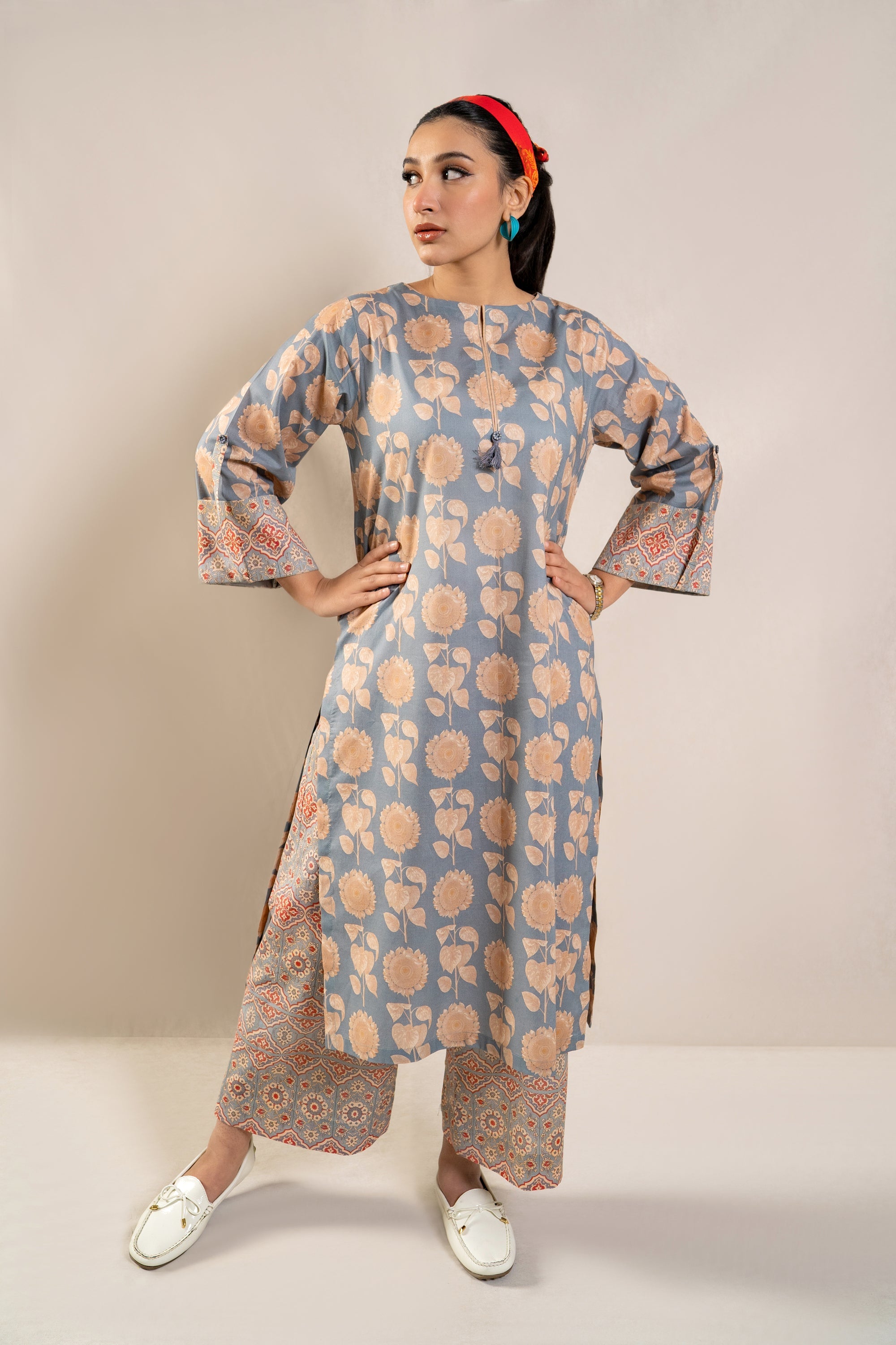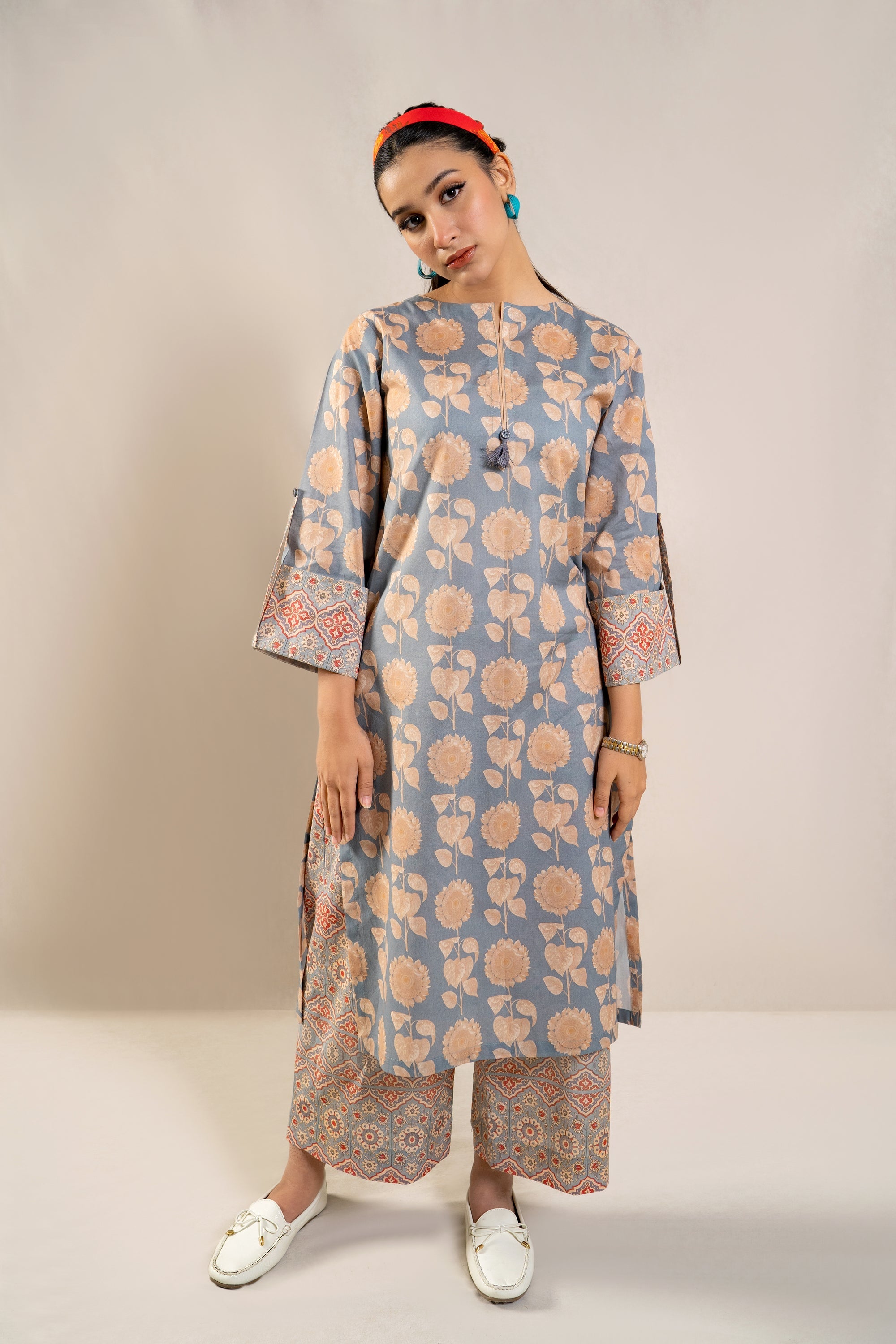 Elevate your summer wardrobe with the must-have ready-to-wear 2-piece lawn printed suit! This ensemble features a stunning long printed shirt adorned with folded sleeves, exuding effortless elegance and chic style. Paired with contrasting printed loose trousers, this outfit is a statement piece that promises comfort and sophistication. Whether you're strolling along the beach or exploring the city streets, this ensemble is a definite summer essential that ensures you stay on-trend and fashion-forward wherever you go.