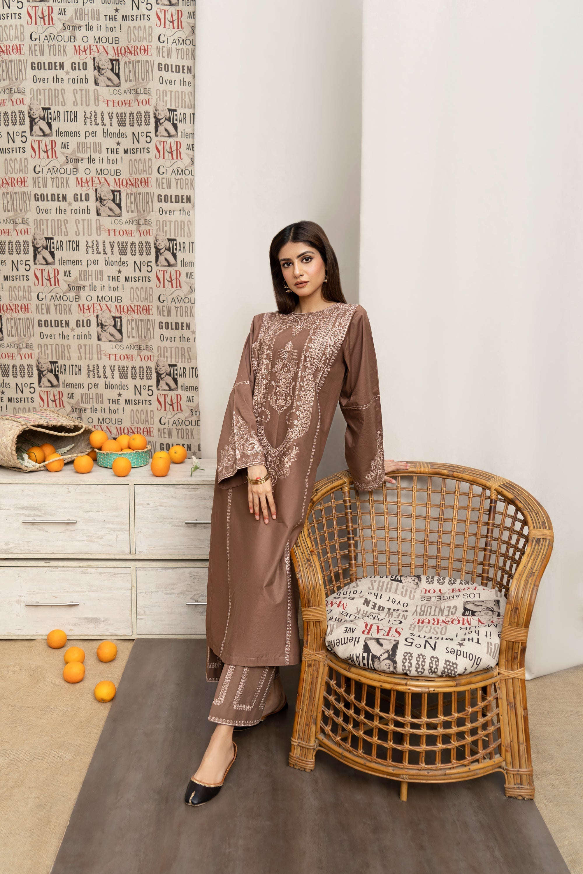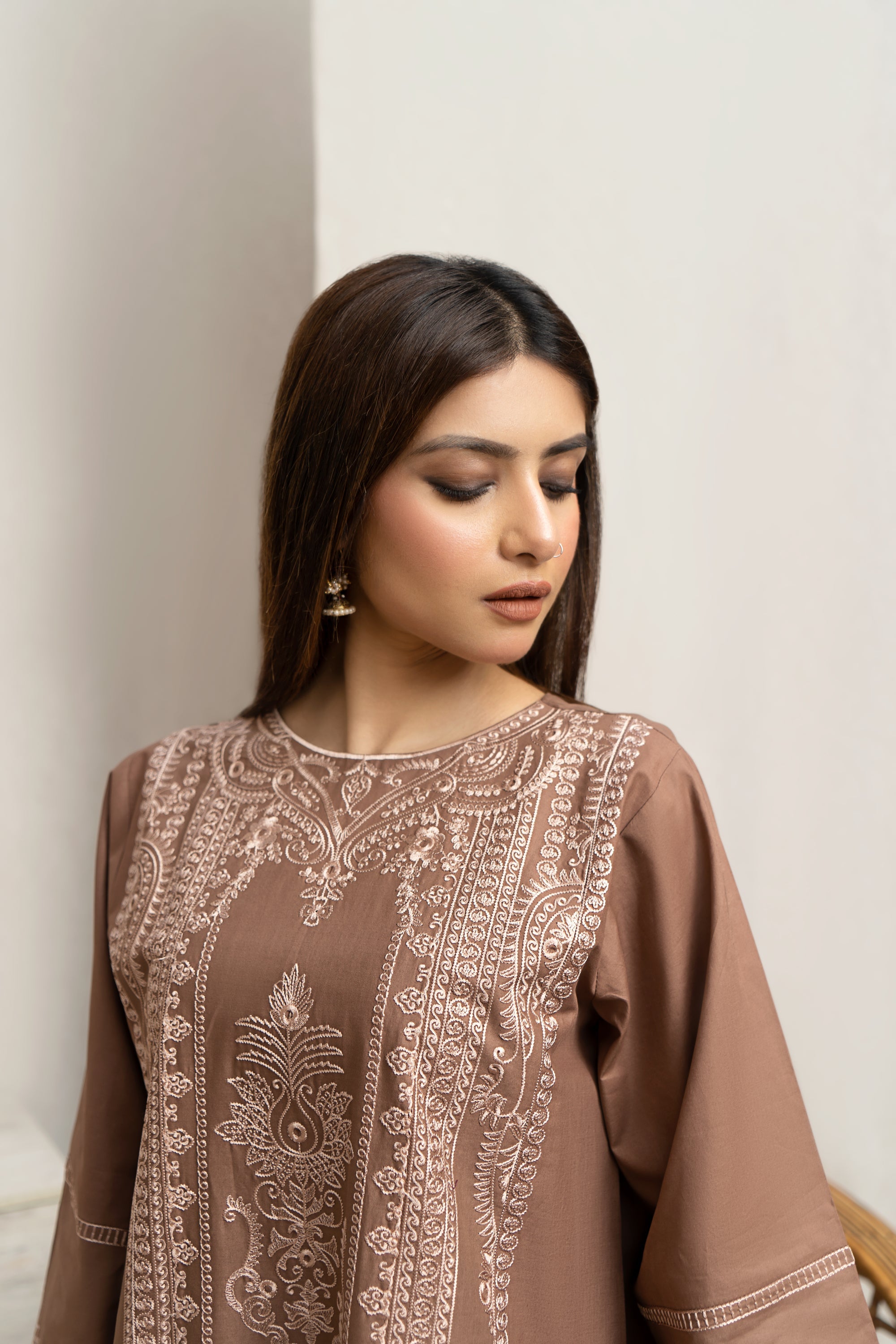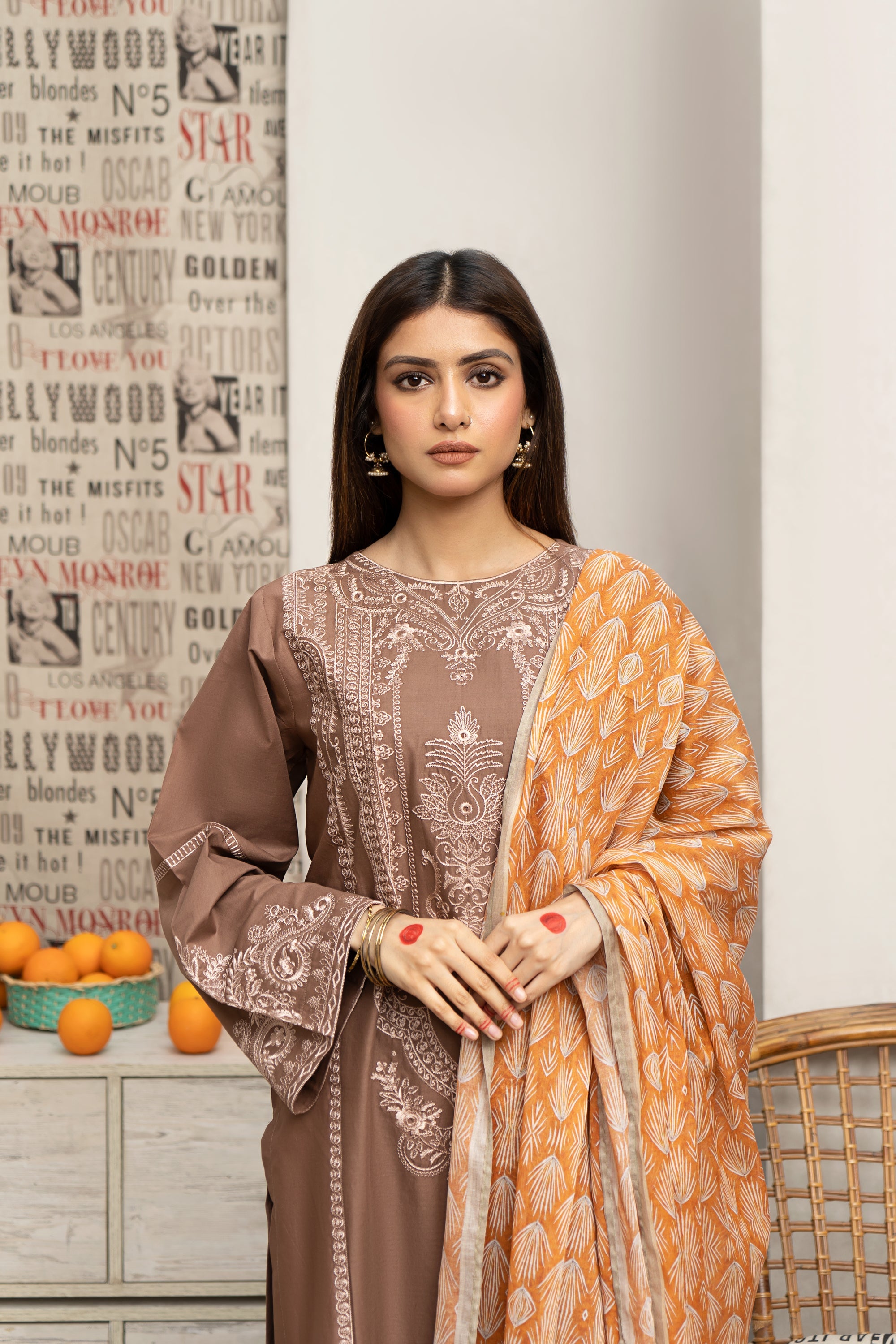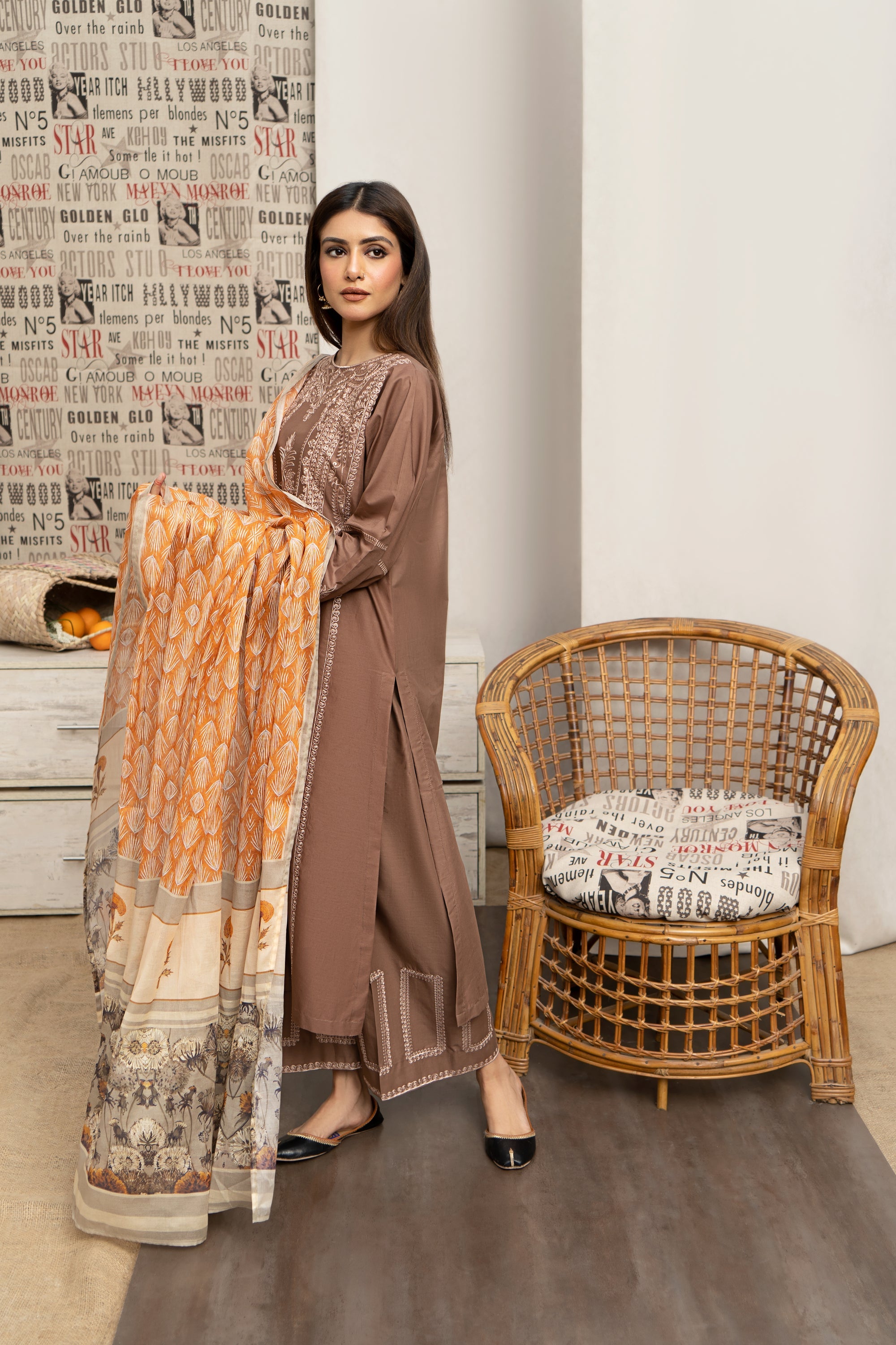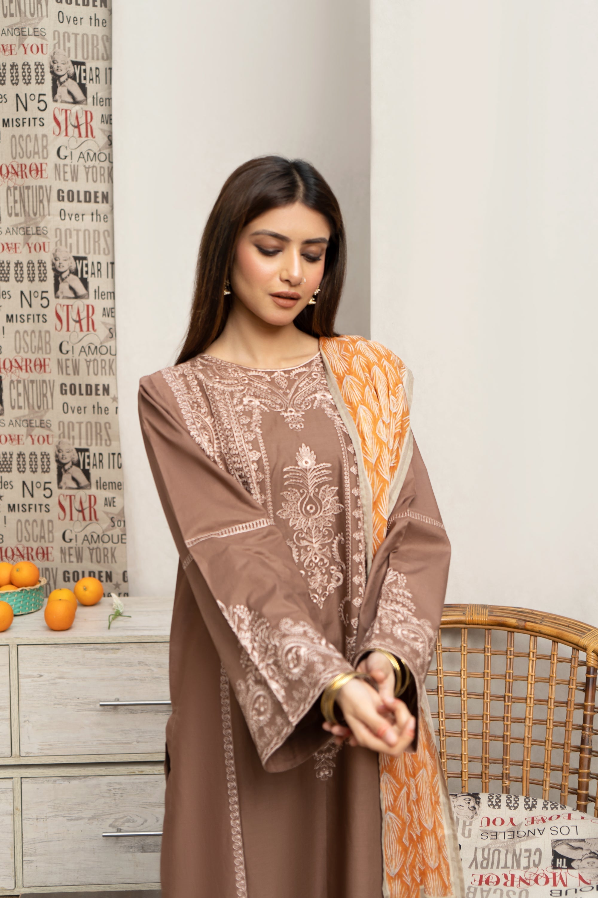 Get set for effortless elegance with this ready-to-wear 3-piece embroidered lawn suit, matched with a printed voile dupatta. The shirt boasts subtle tone-on-tone embroidery along the front neckline, complemented by captivating embroidered motifs on the sleeves. Complete the ensemble with embroidered loose trousers for a chic and comfortable look that's perfect for any occasion.