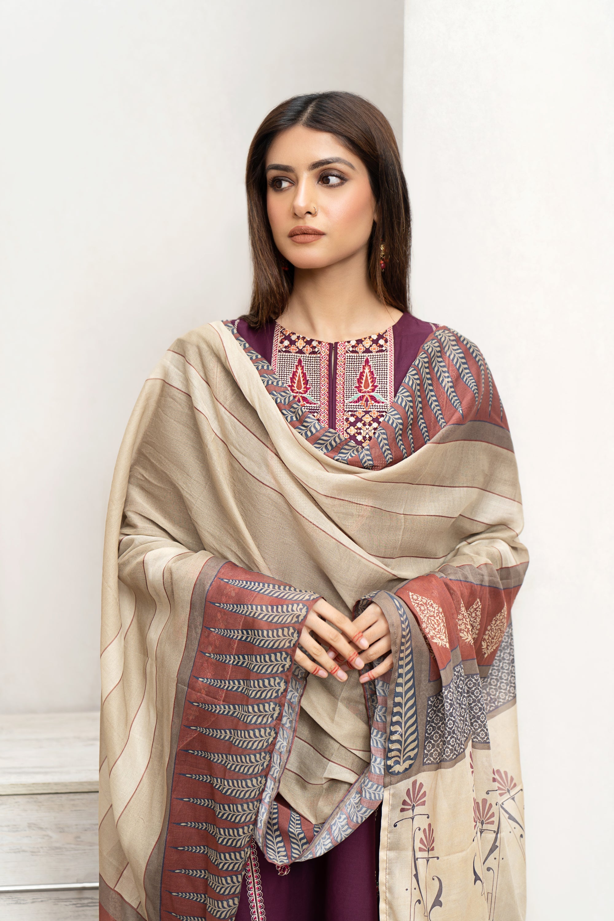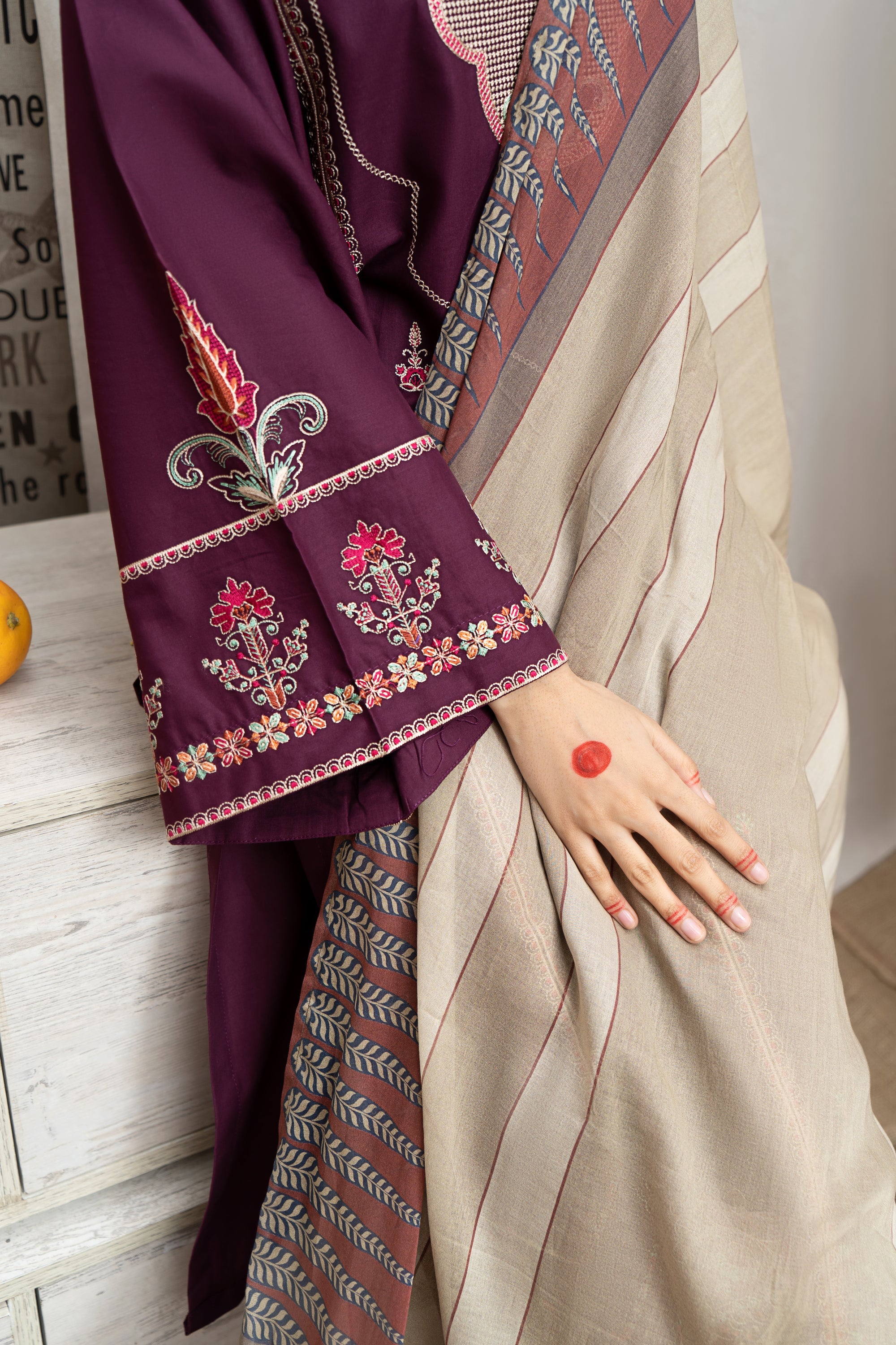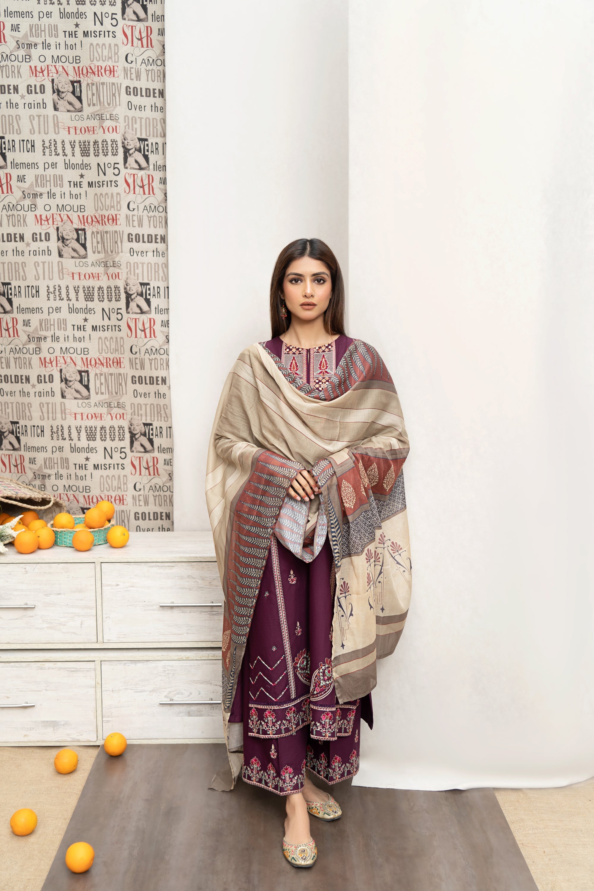 Get set to stun in this ready-to-wear 3-piece embroidered lawn suit, matched with a gorgeous printed voile dupatta. The shirt features lovely embroidery along the neckline and hemline, as well as charming motifs on the sleeves, adding a touch of elegance. Complete the look with embroidered loose trousers for a comfortable yet stylish outfit perfect for any occasion.