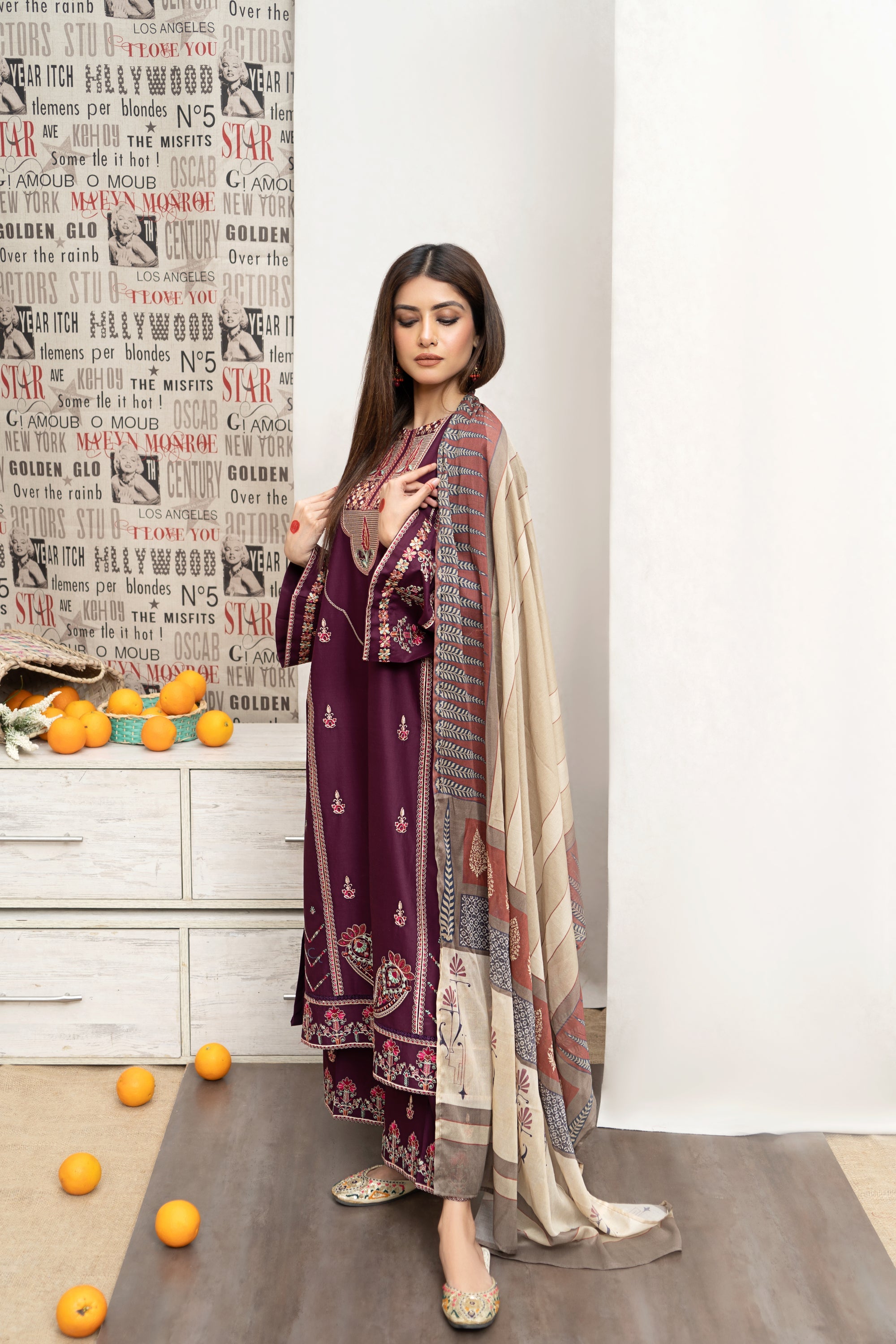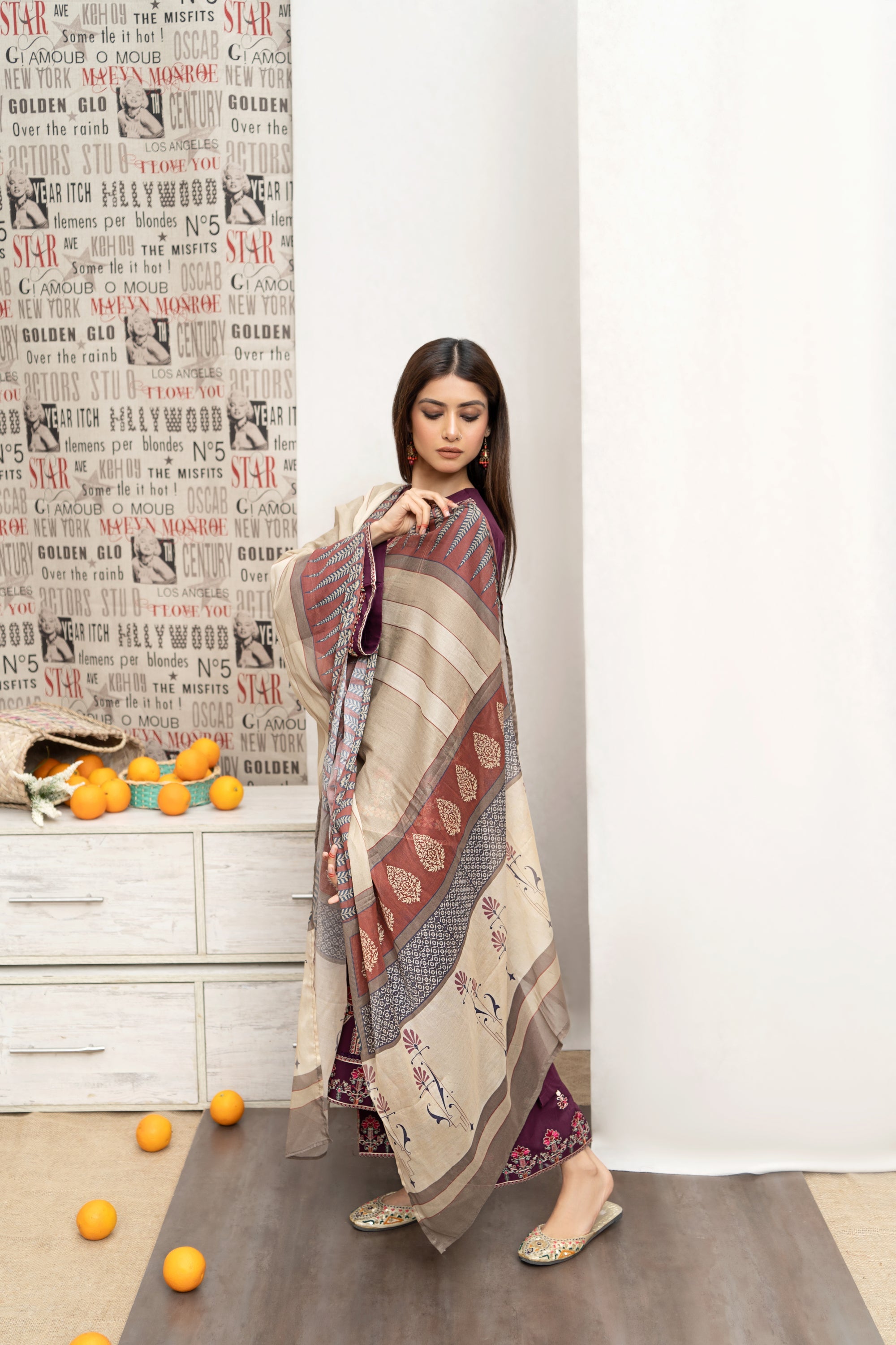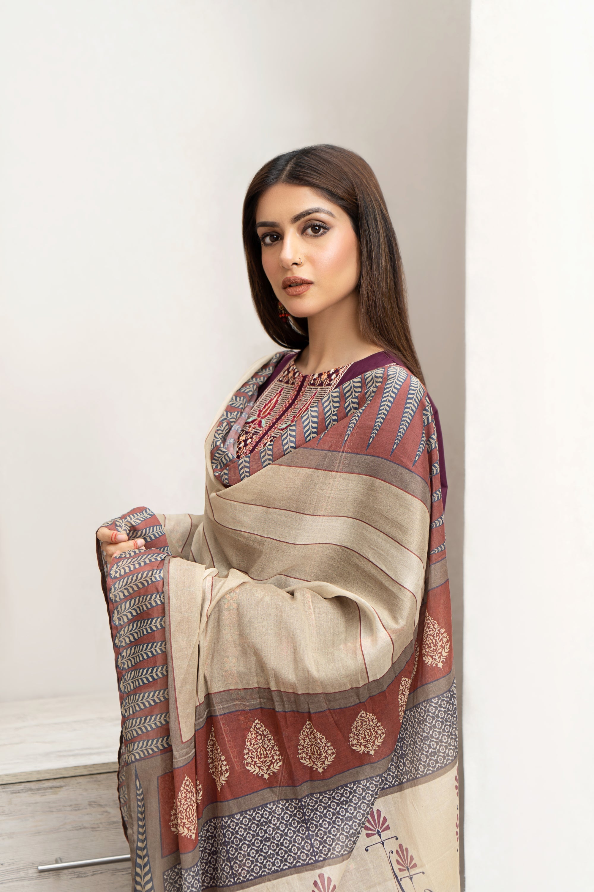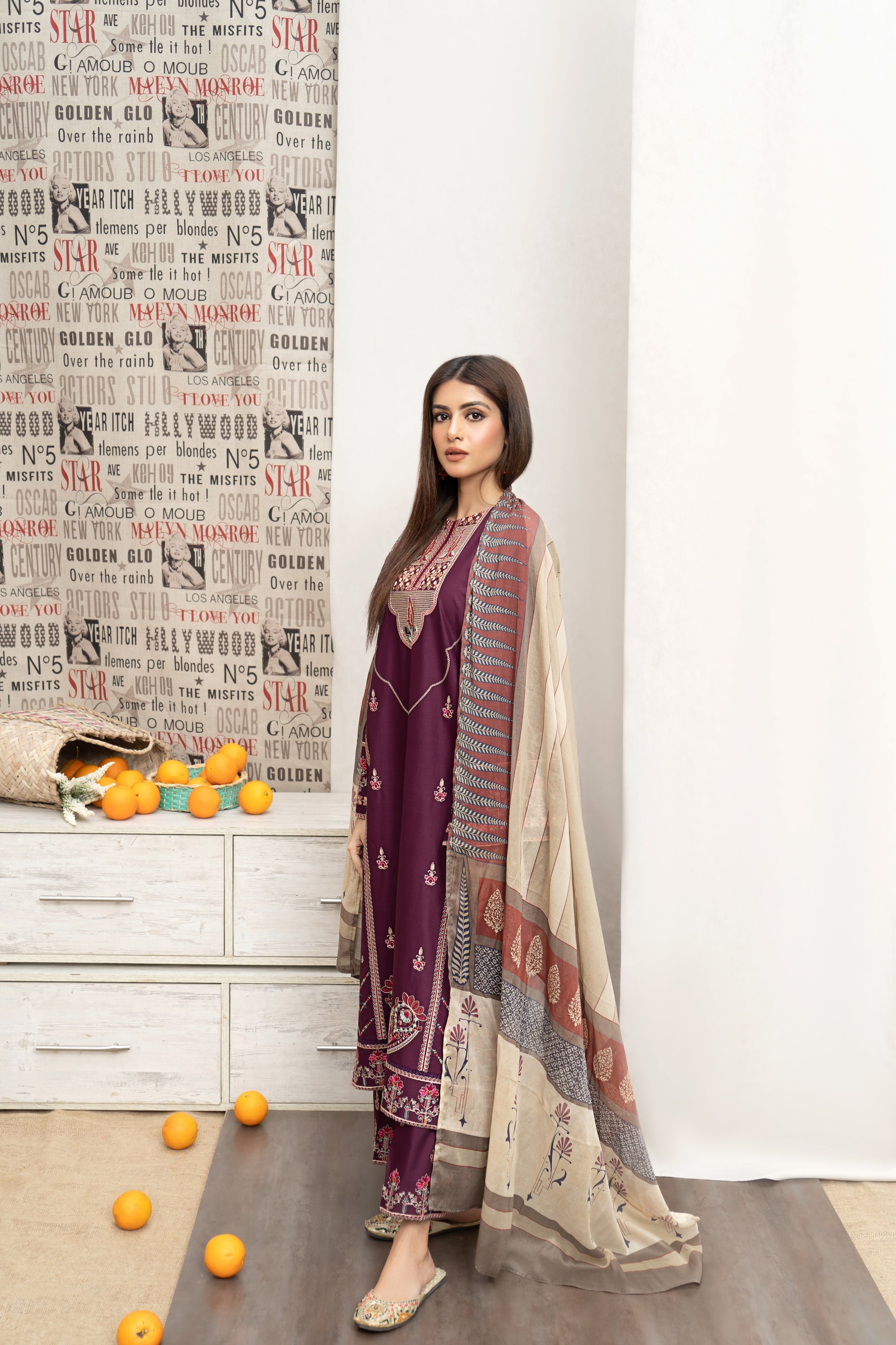 Get set to stun in this ready-to-wear 3-piece embroidered lawn suit, matched with a gorgeous printed voile dupatta. The shirt features lovely embroidery along the neckline and hemline, as well as charming motifs on the sleeves, adding a touch of elegance. Complete the look with embroidered loose trousers for a comfortable yet stylish outfit perfect for any occasion.
