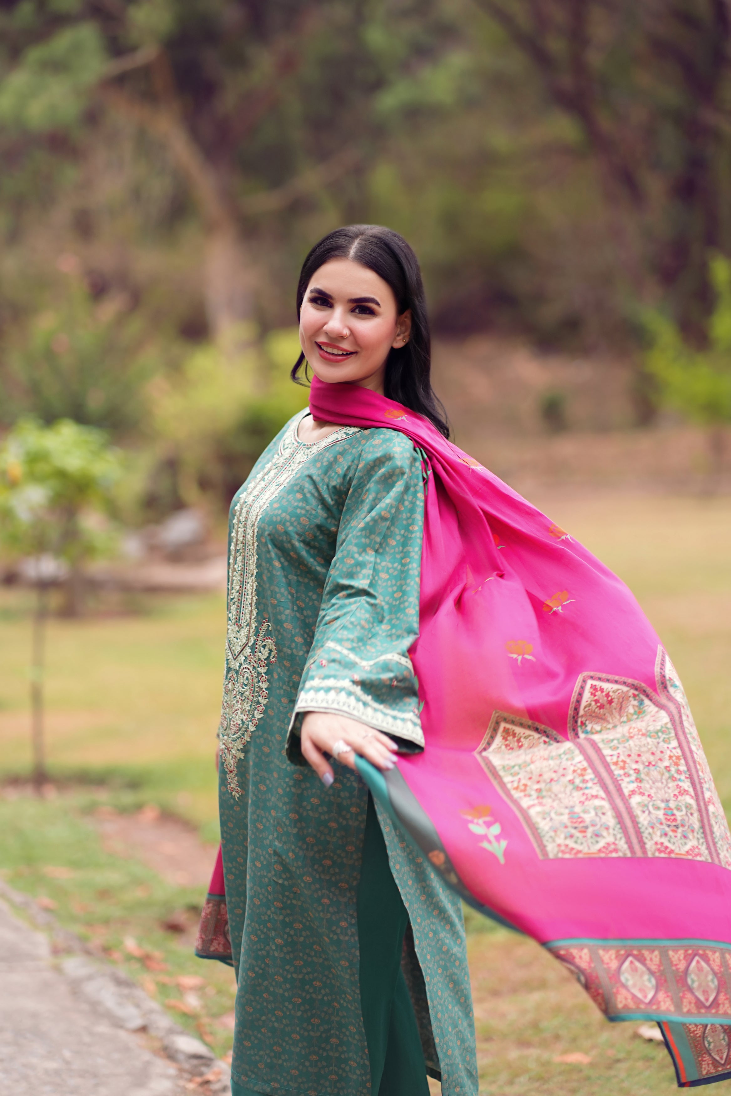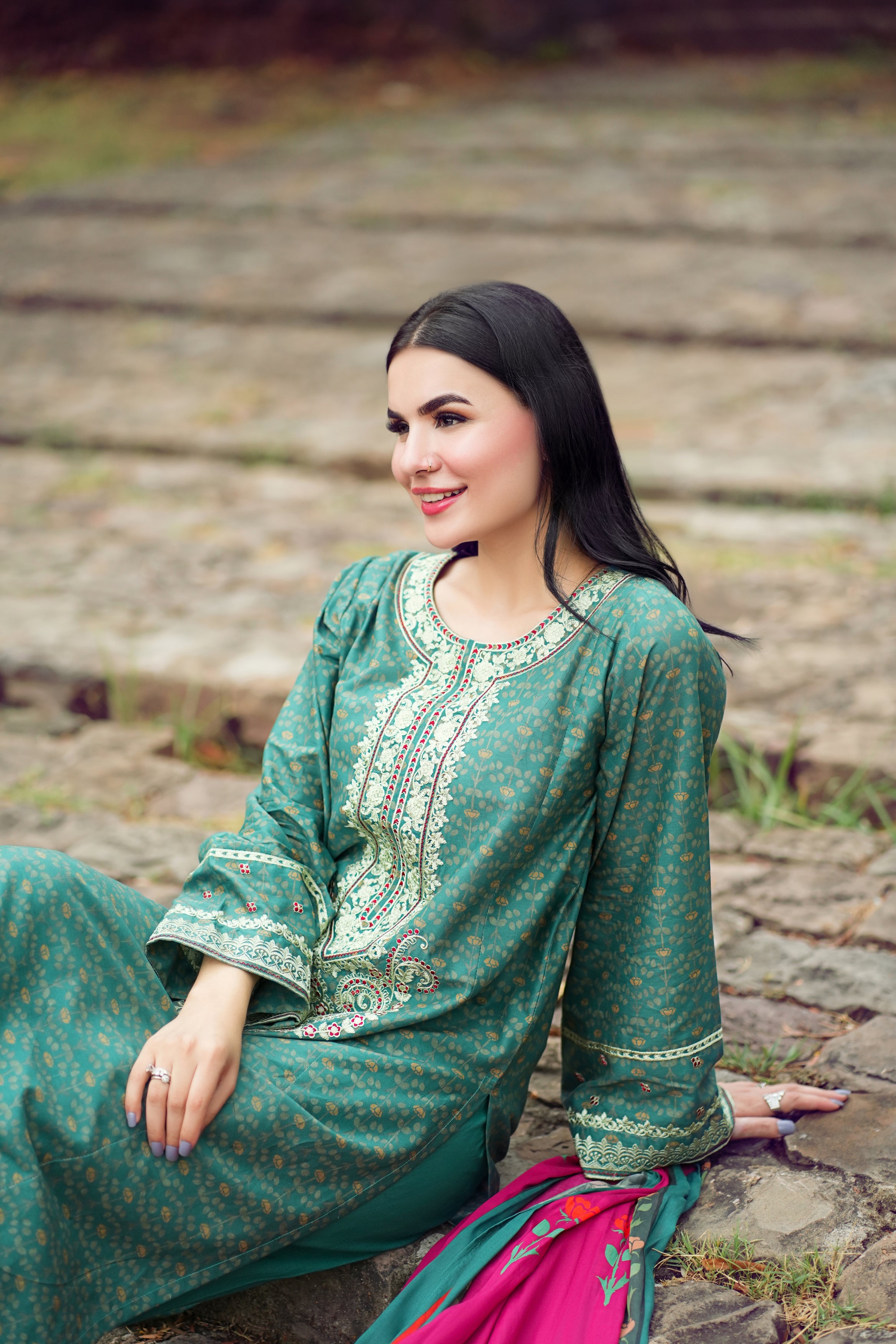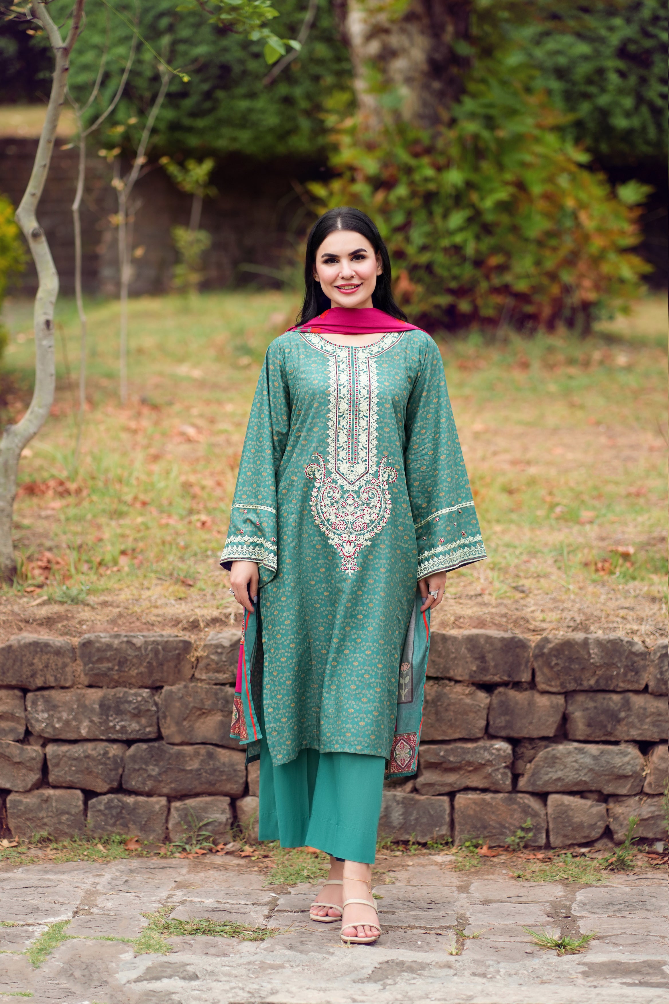 Experience comfort and style with ARYA 2 - a ready-to-wear 3Pc lawn suit. This elegant ensemble features a beautifully printed shirt with embroidery on the neckline and sleeves. Paired with a contrasting voile dupatta and plain loose trousers, it offers effortless elegance for any occasion.