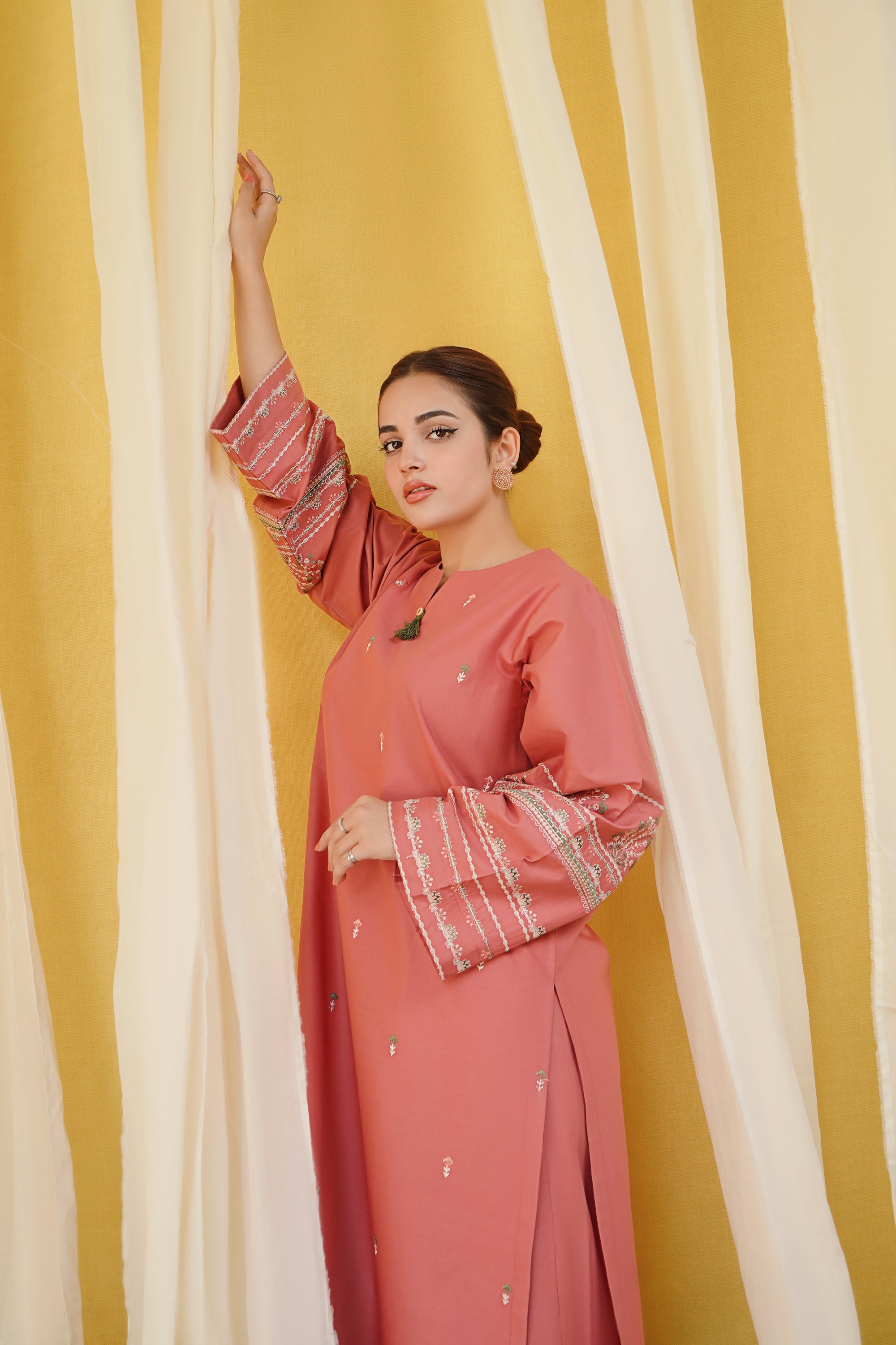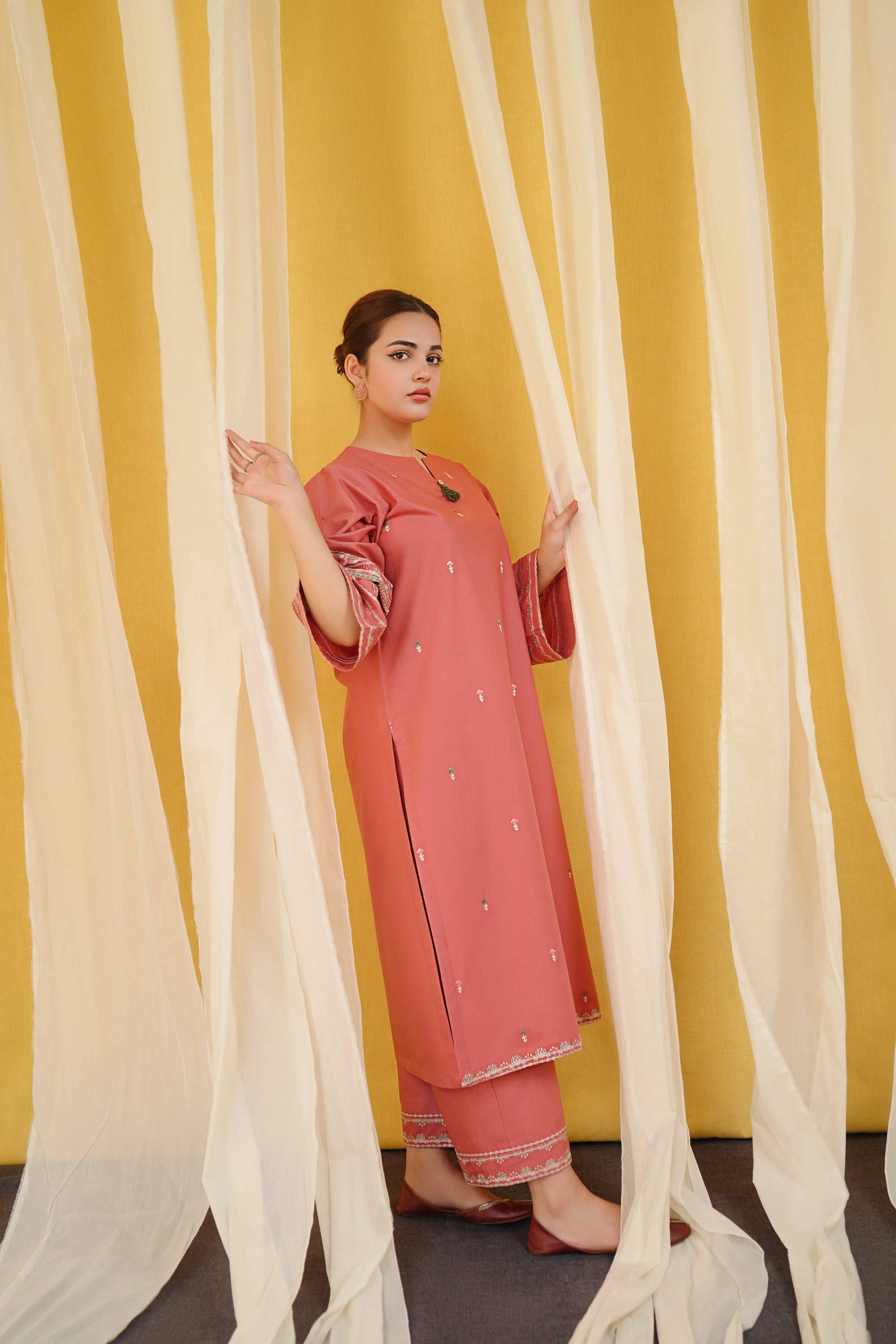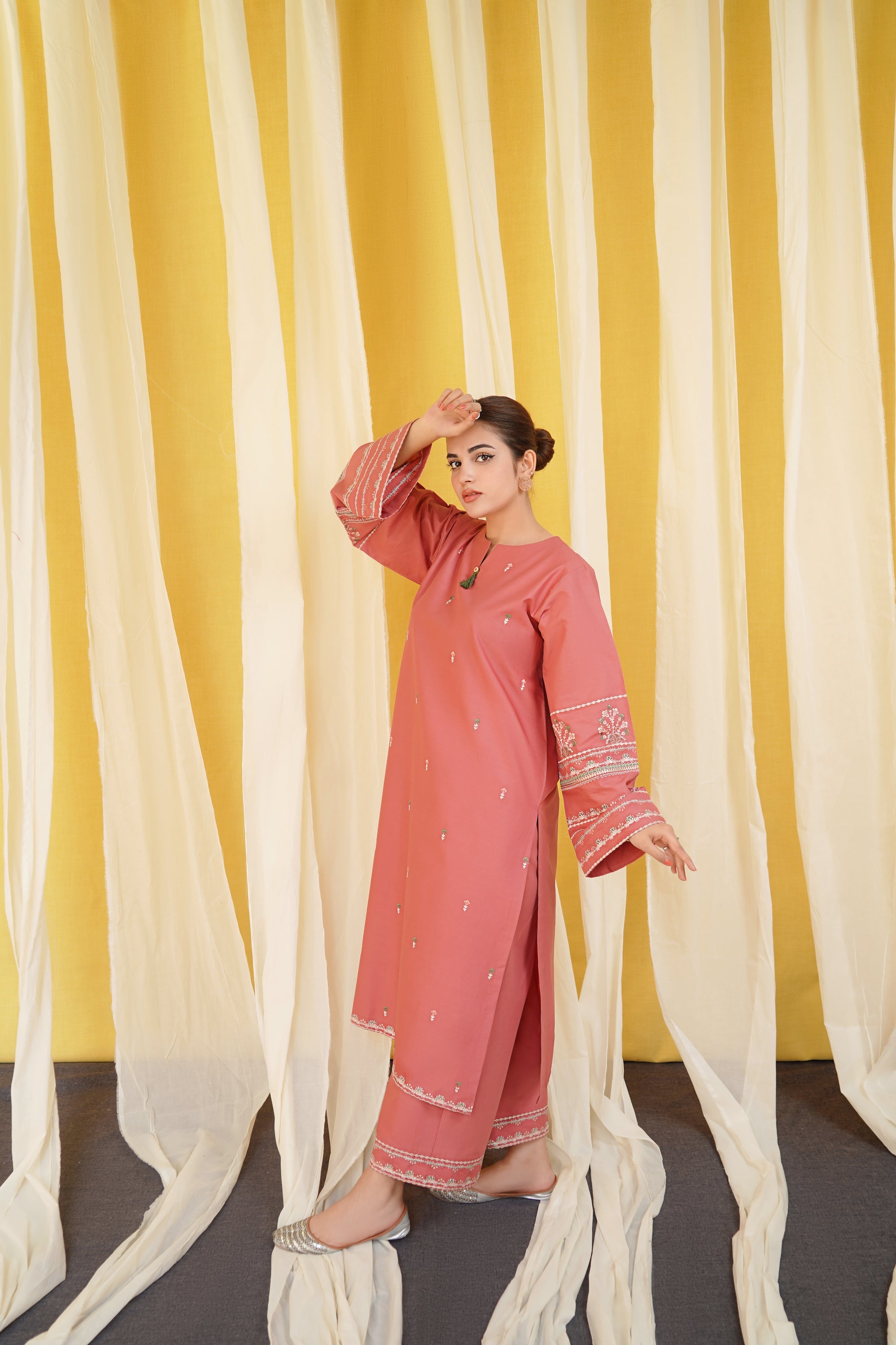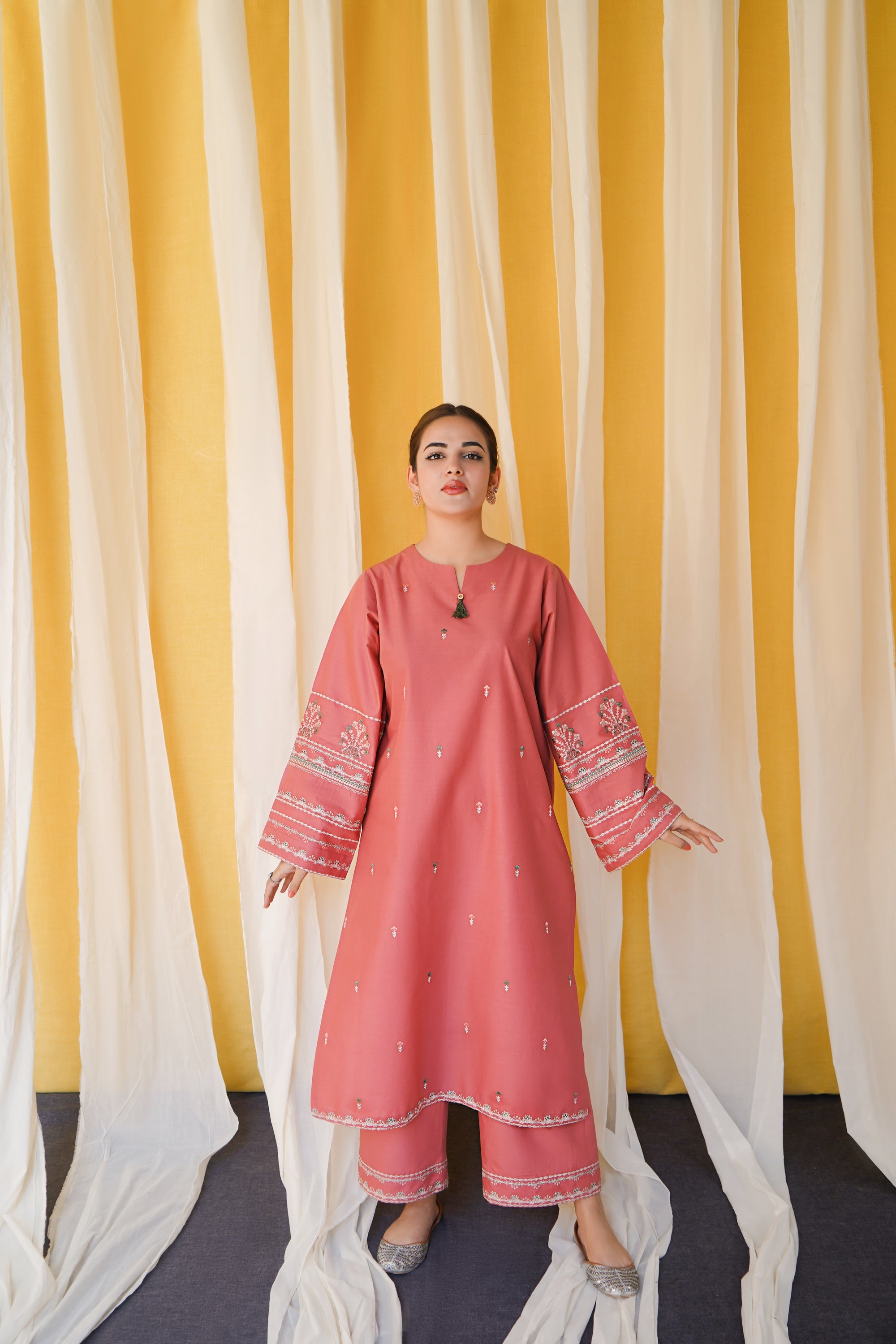 Get ready to dazzle in this 2-piece embroidered lawn suit. The shirt features delicate embroidery motifs sprayed across the front, with loose sleeves adorned with beautiful embroidery. Paired with loose trousers, which also boast an embroidered border, this ensemble exudes elegance and style.