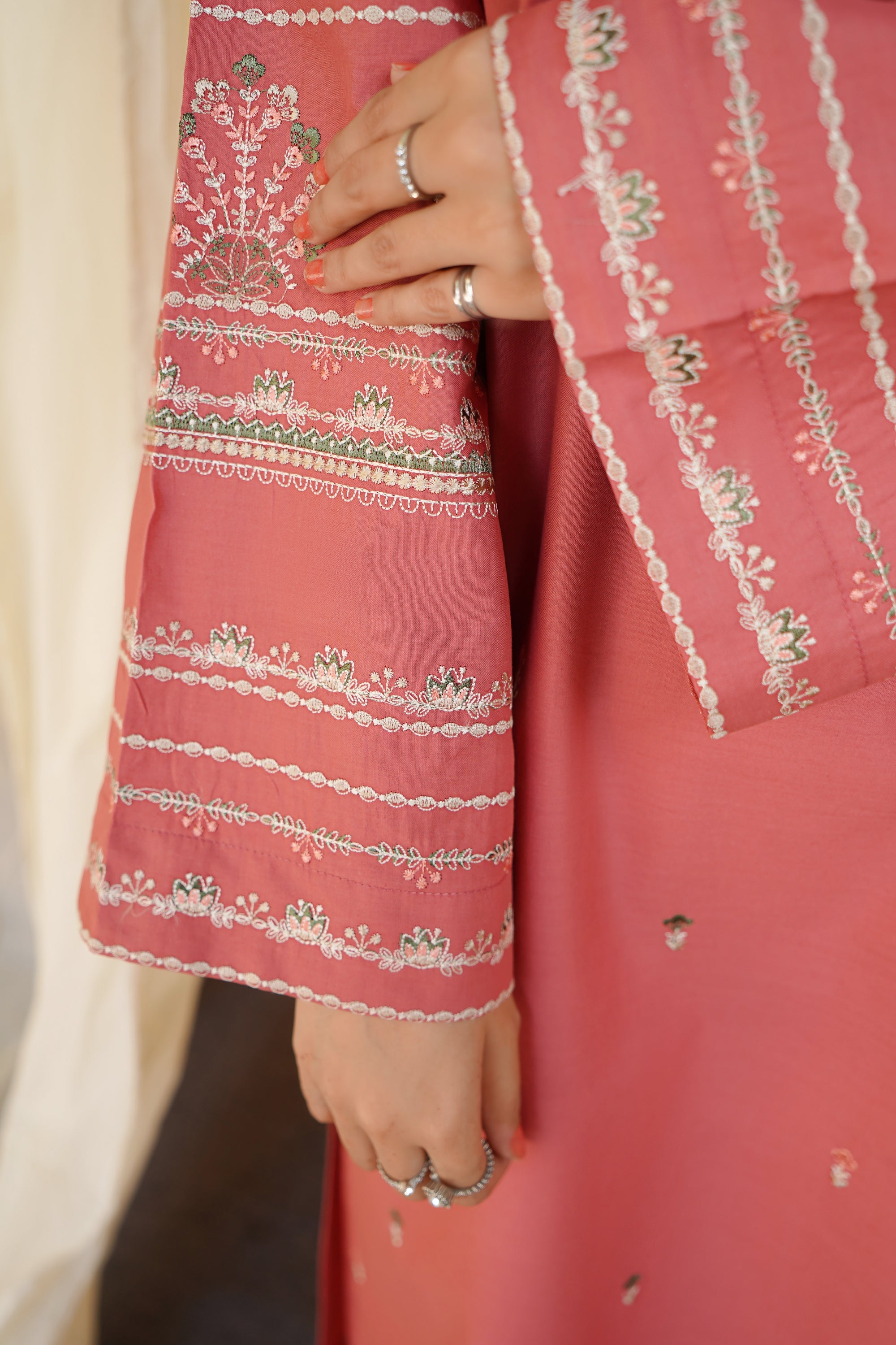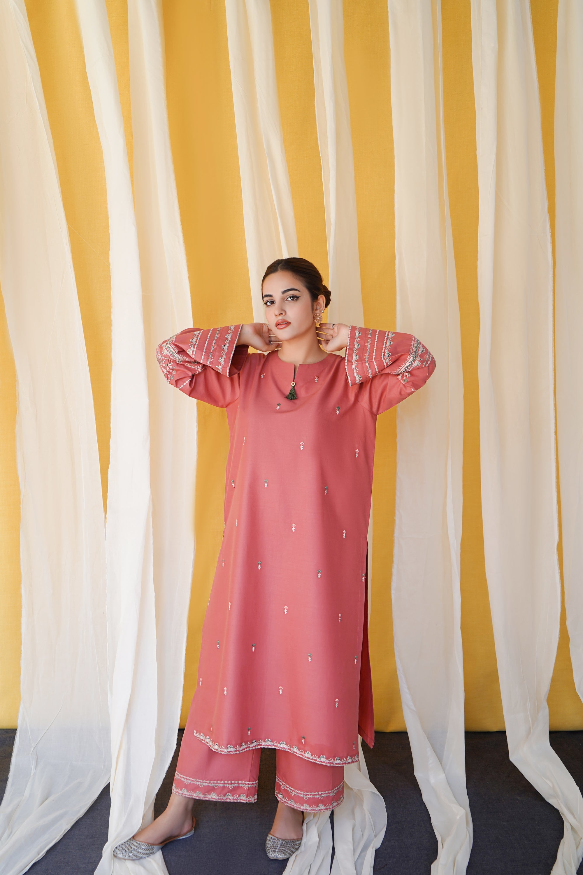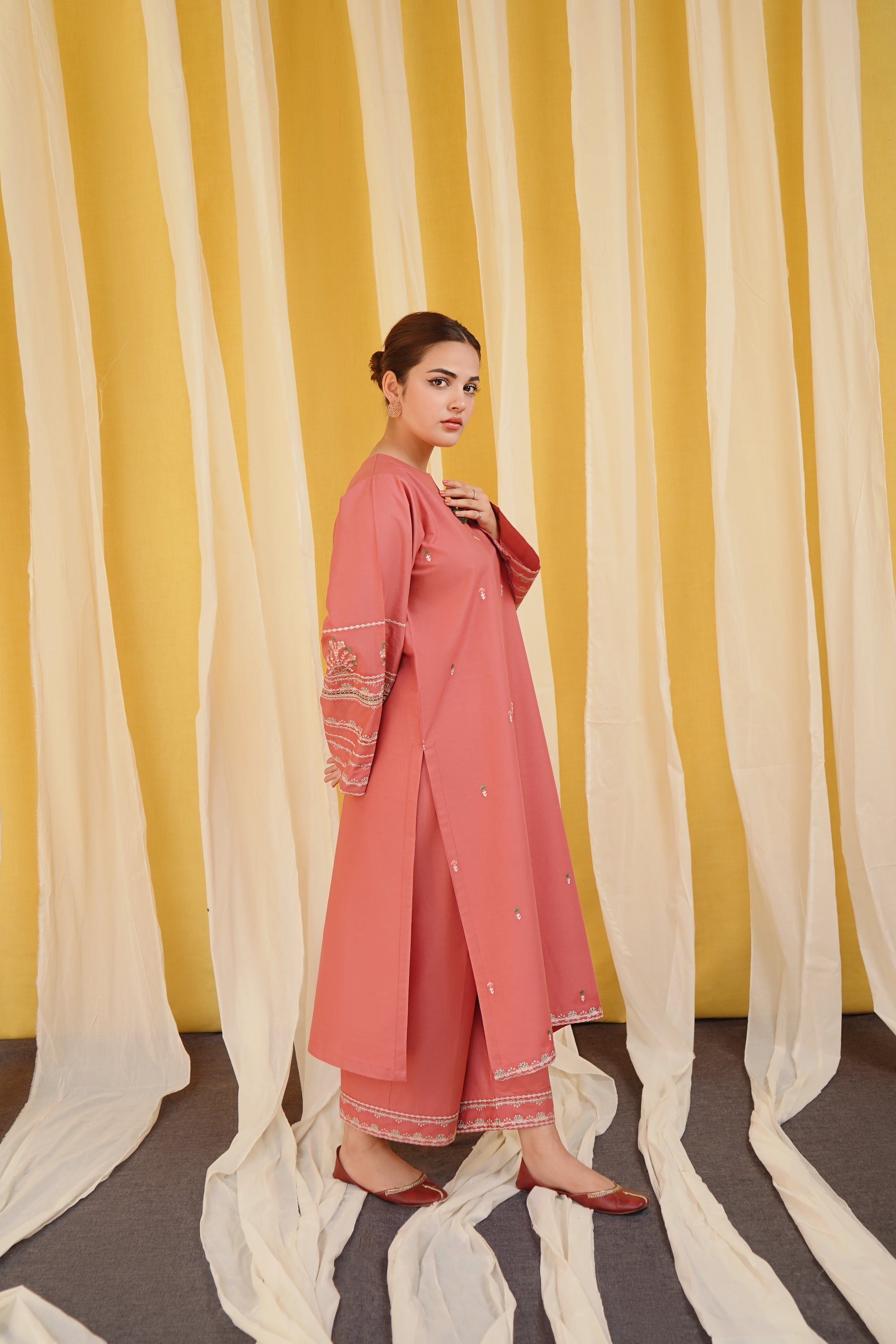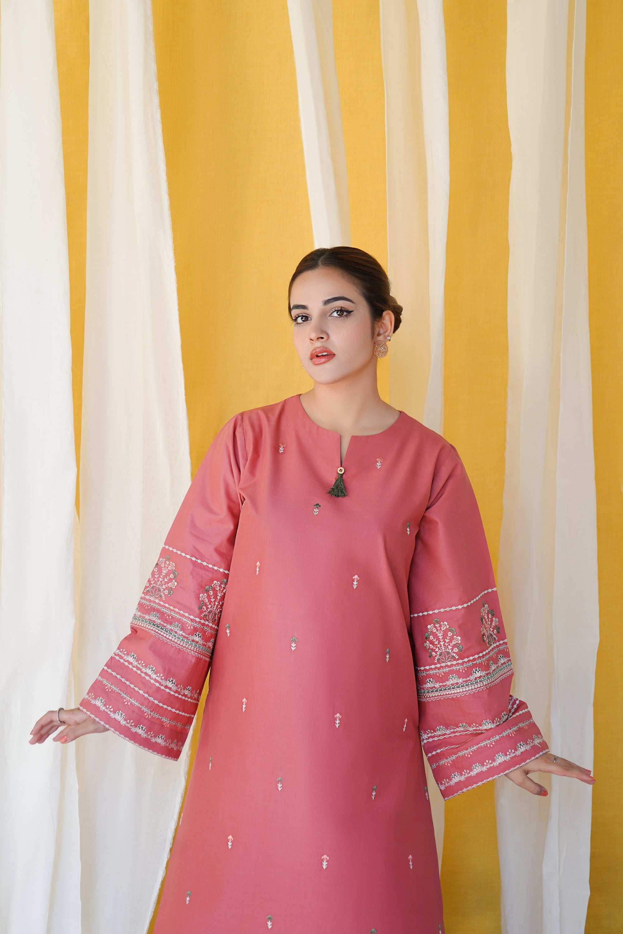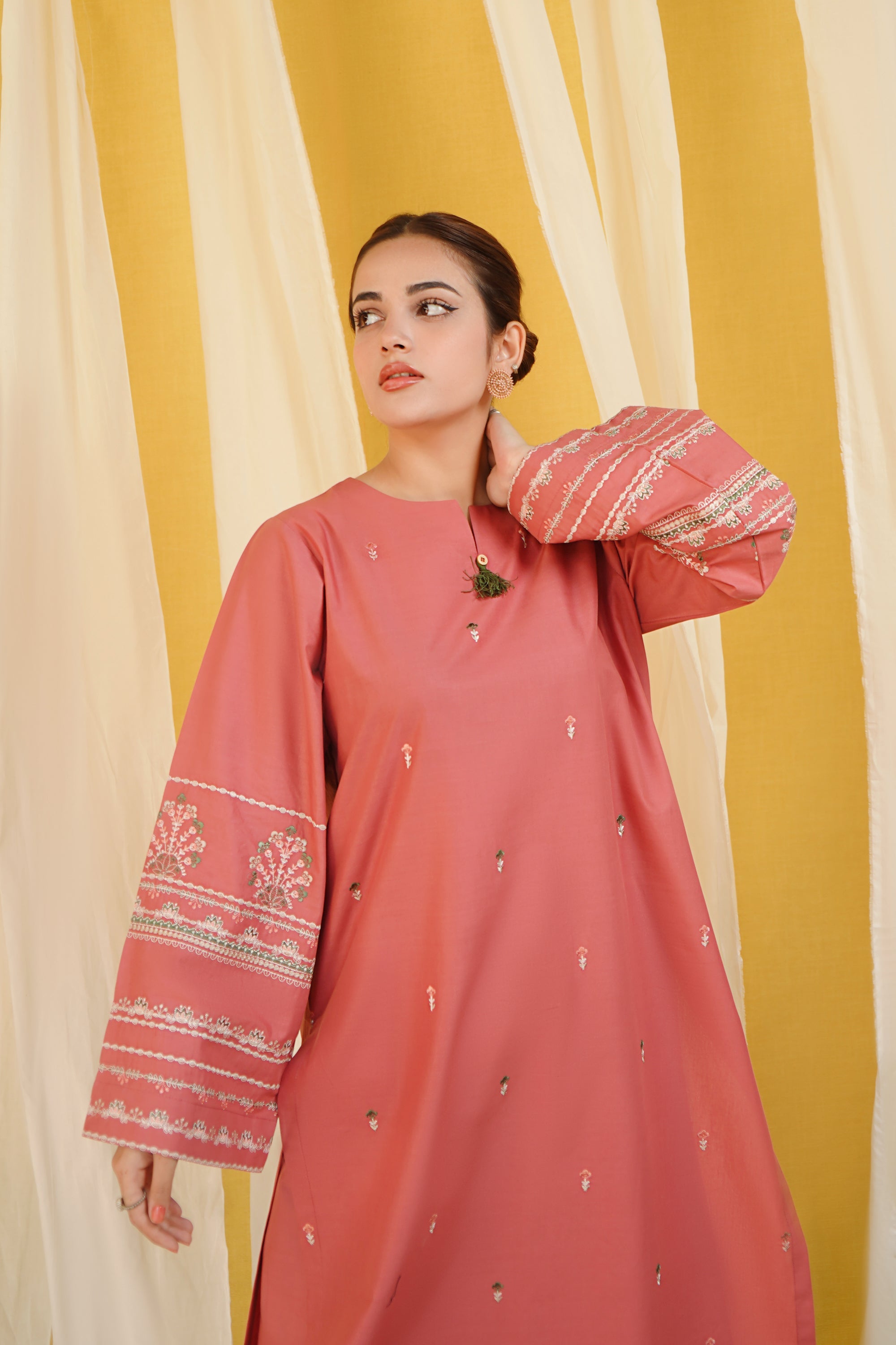 Get ready to dazzle in this 2-piece embroidered lawn suit. The shirt features delicate embroidery motifs sprayed across the front, with loose sleeves adorned with beautiful embroidery. Paired with loose trousers, which also boast an embroidered border, this ensemble exudes elegance and style.