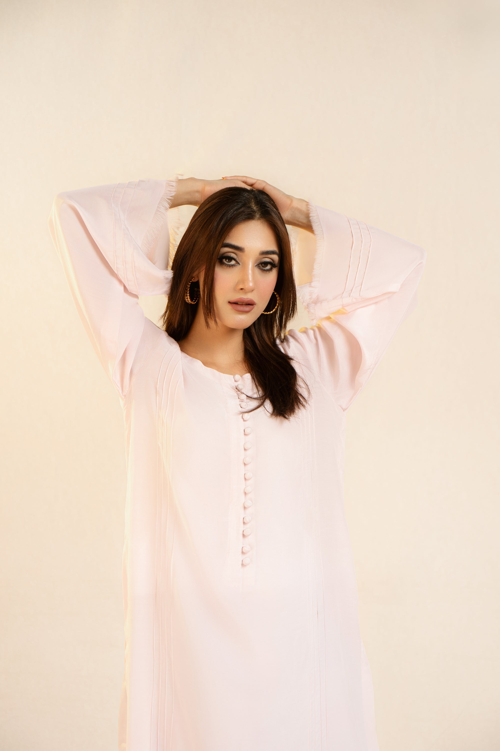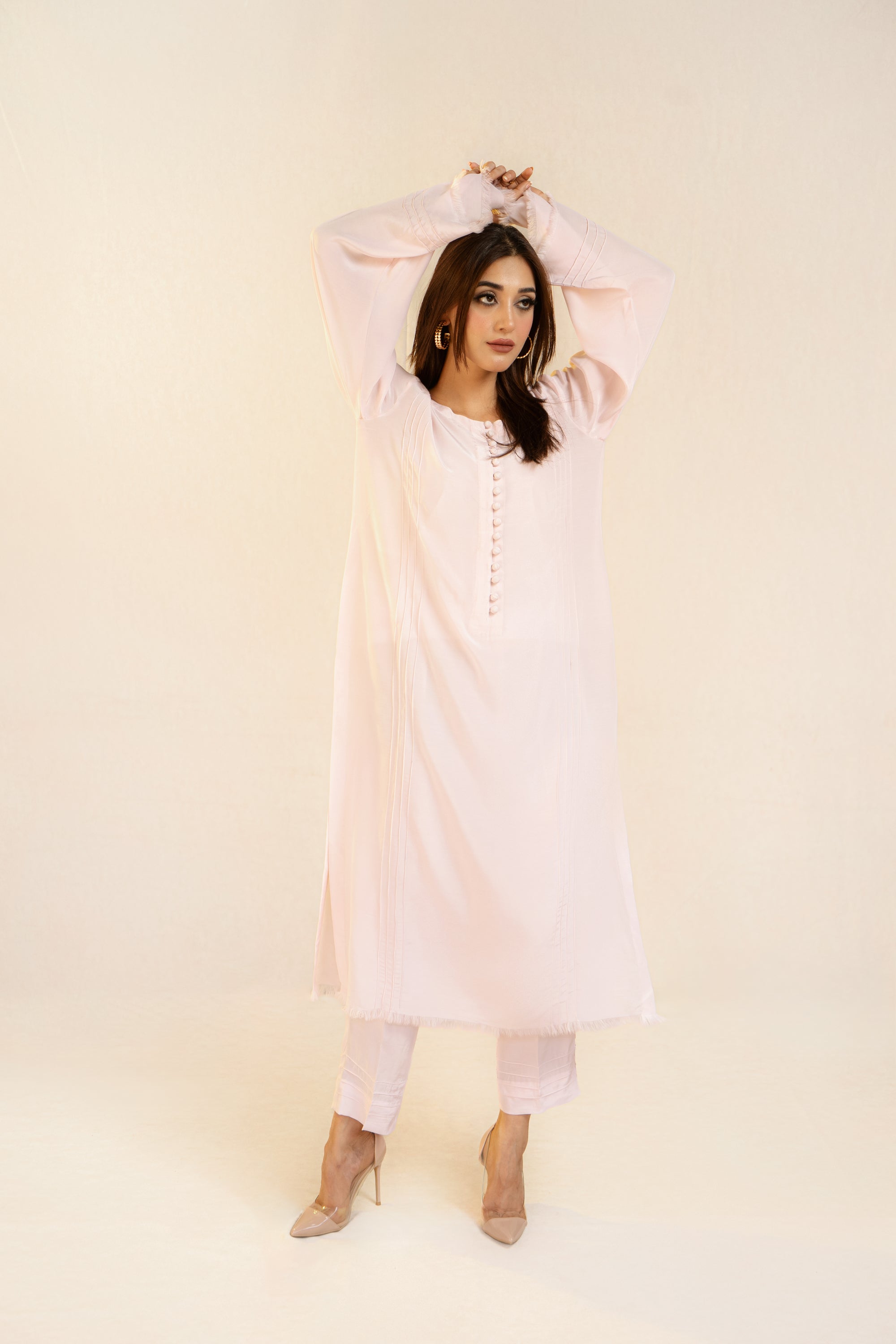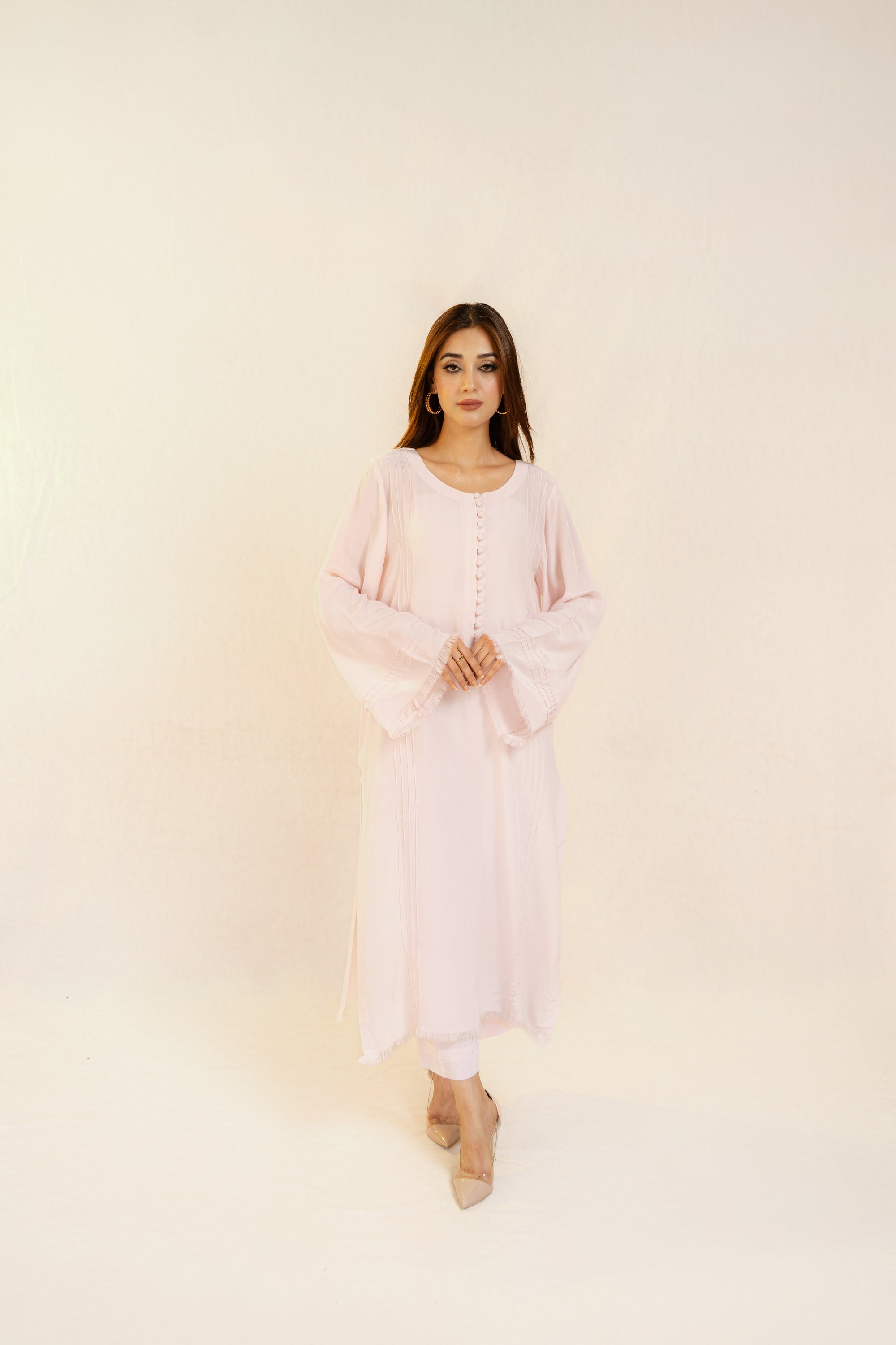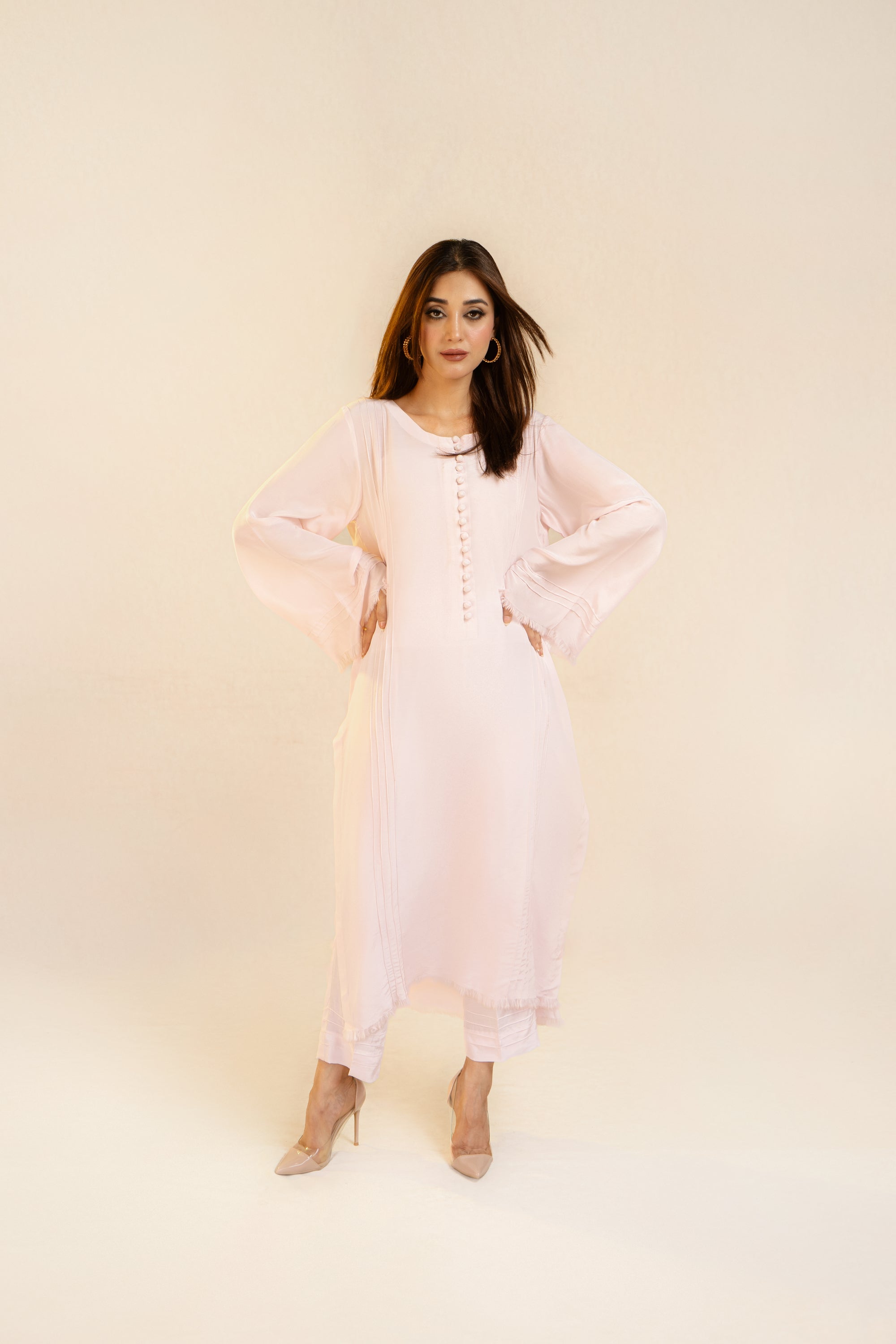 Shirt viscose and linen blend, buttoned front detail with pintex. full sleeves with frayed edges.