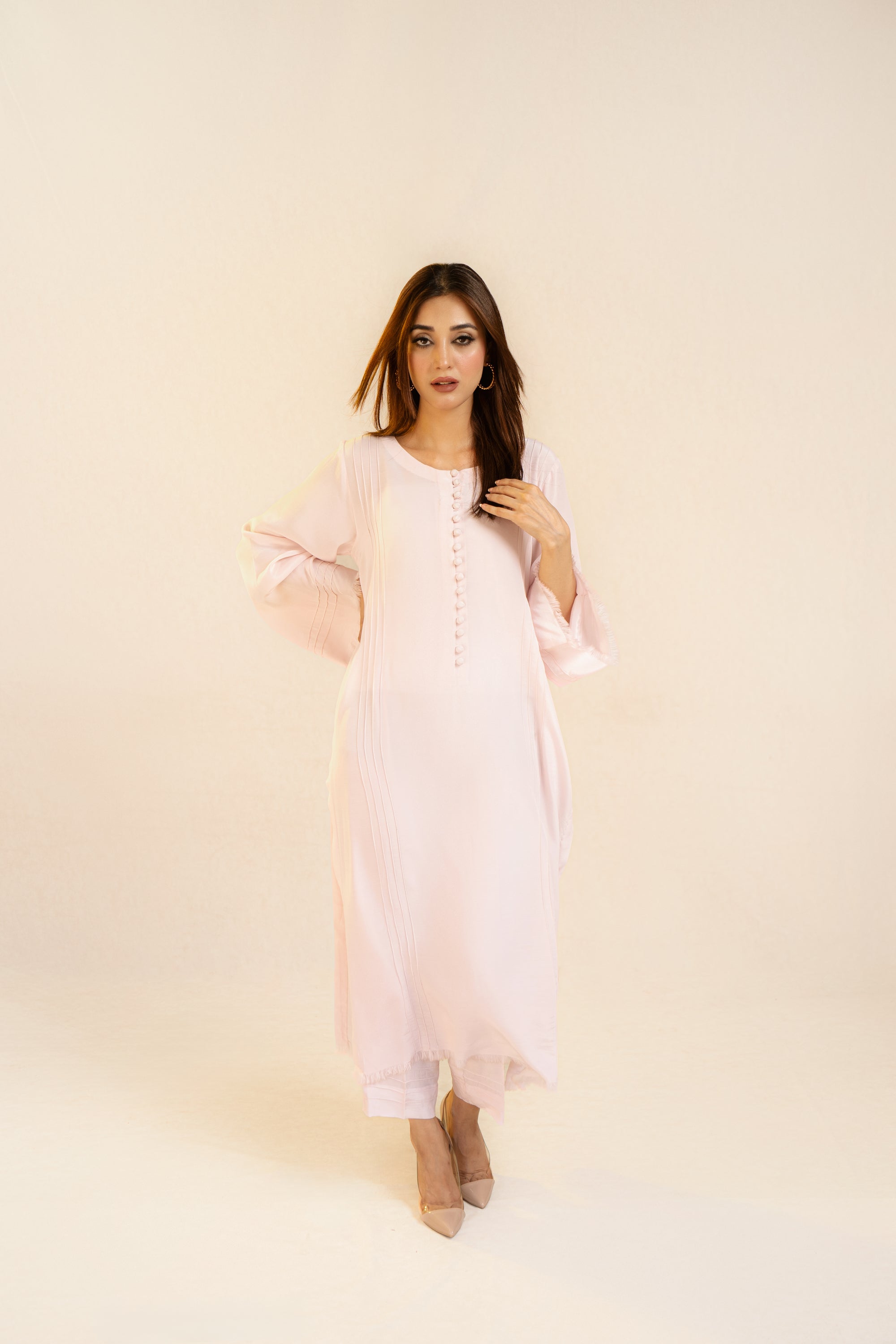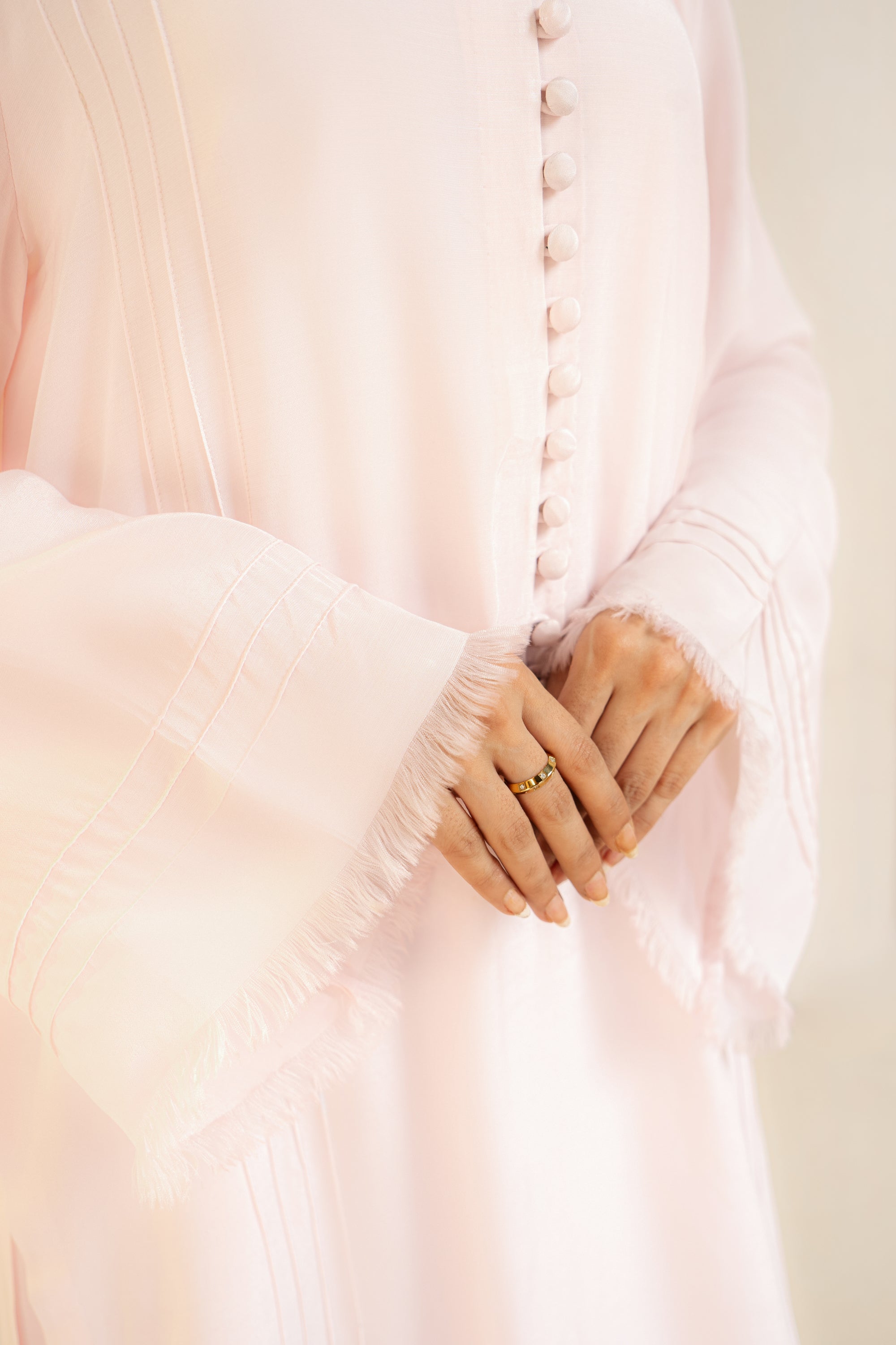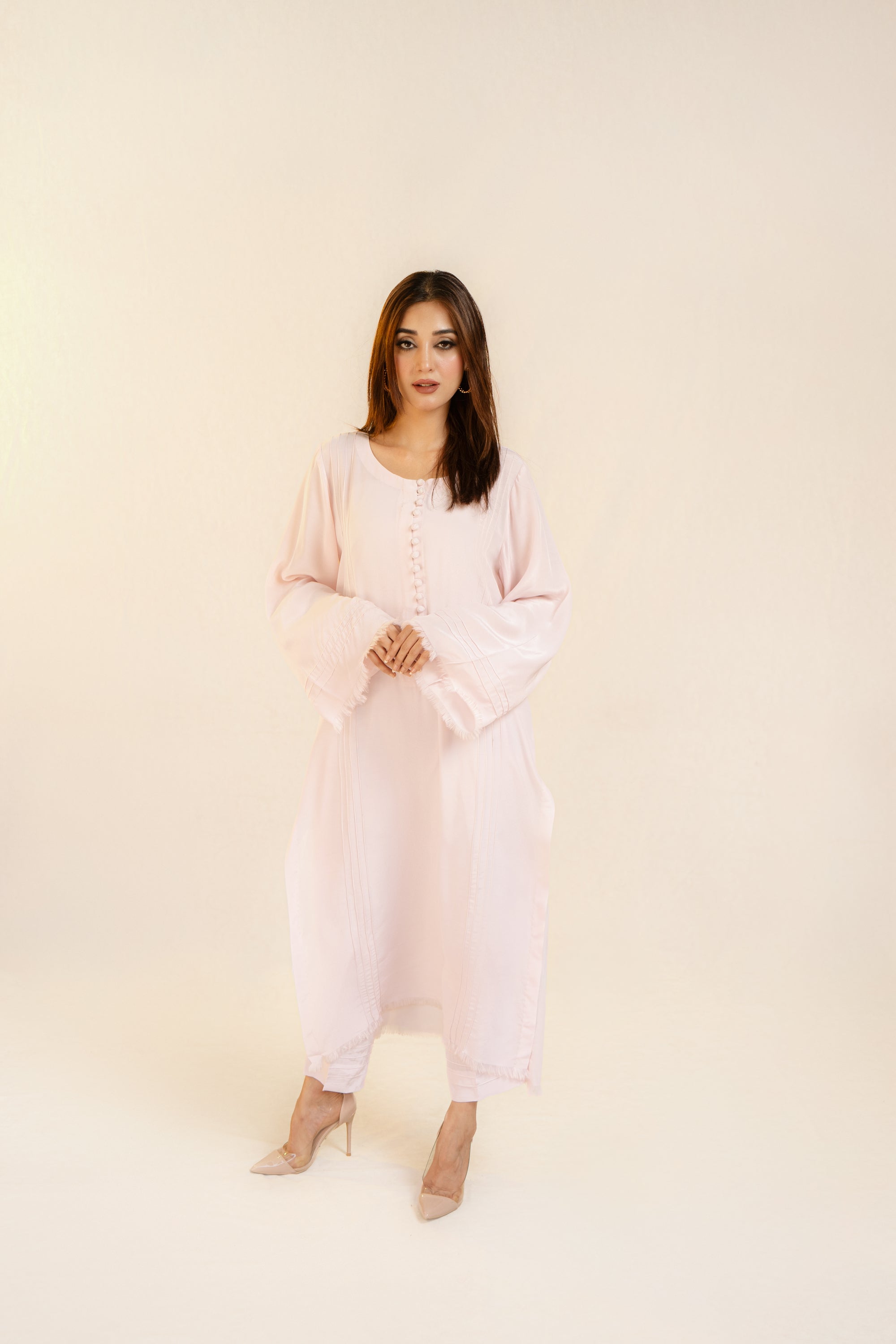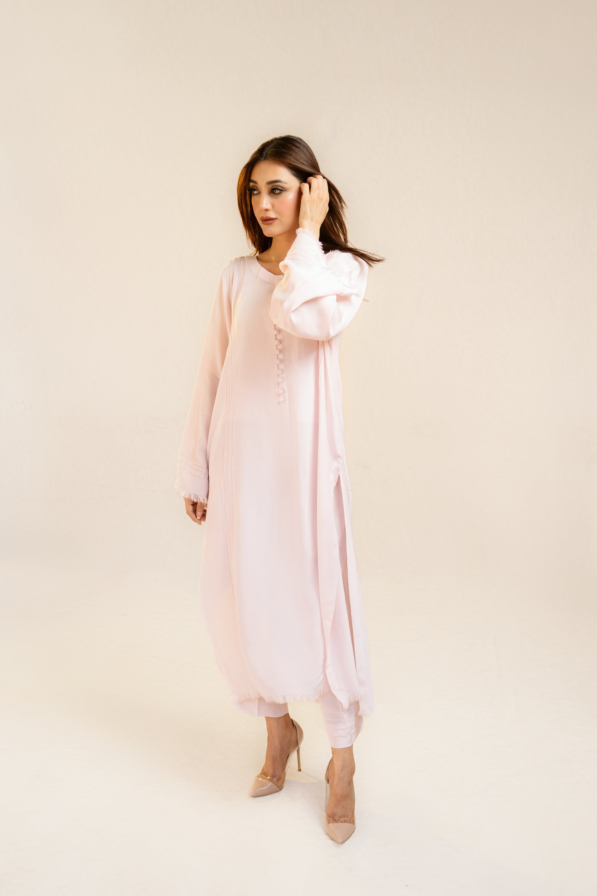 Shirt viscose and linen blend, buttoned front detail with pintex. full sleeves with frayed edges.