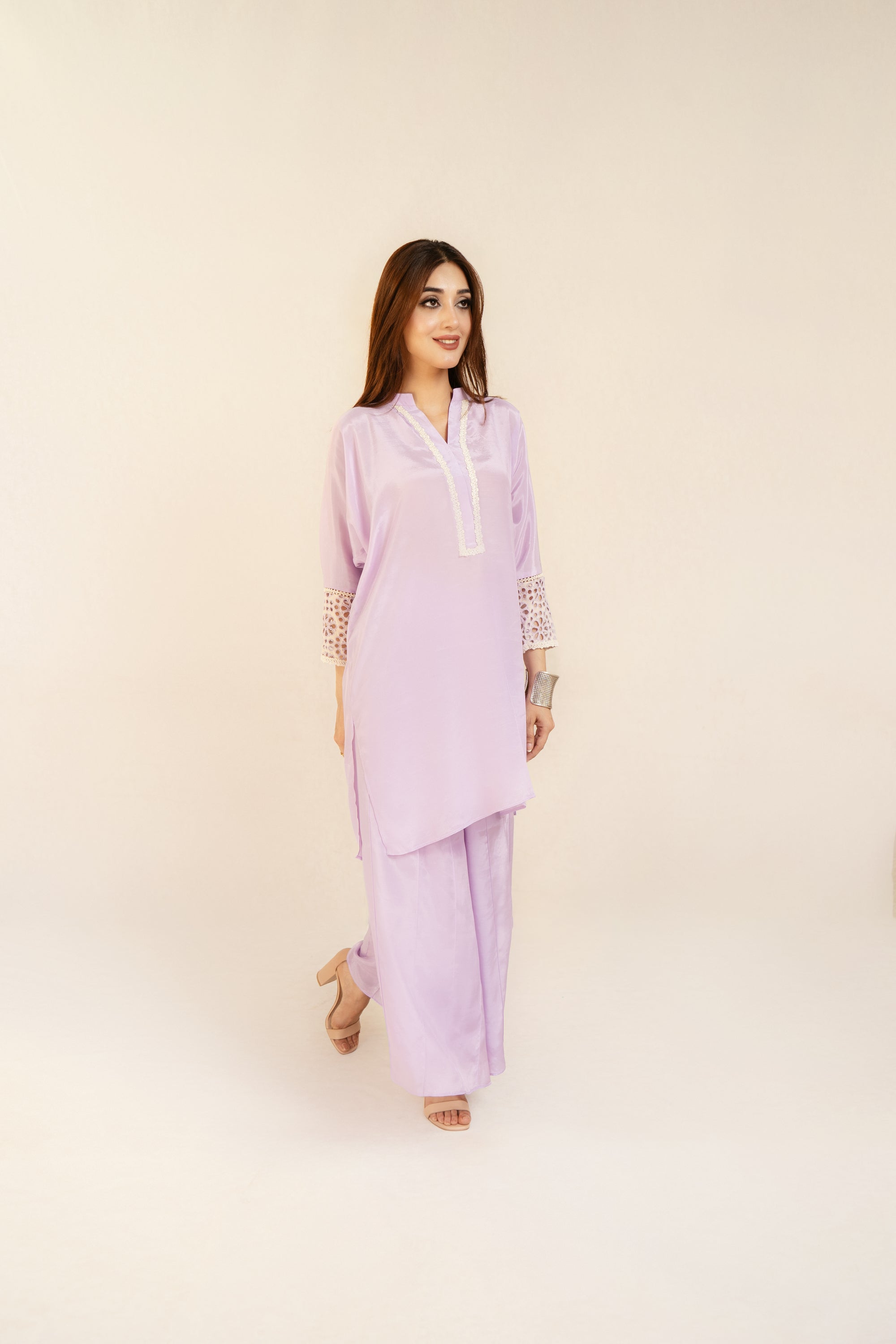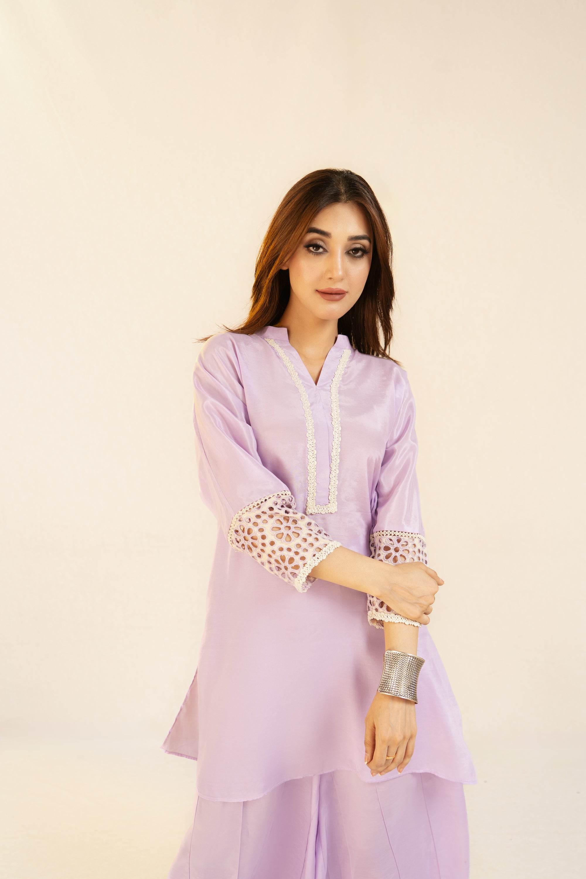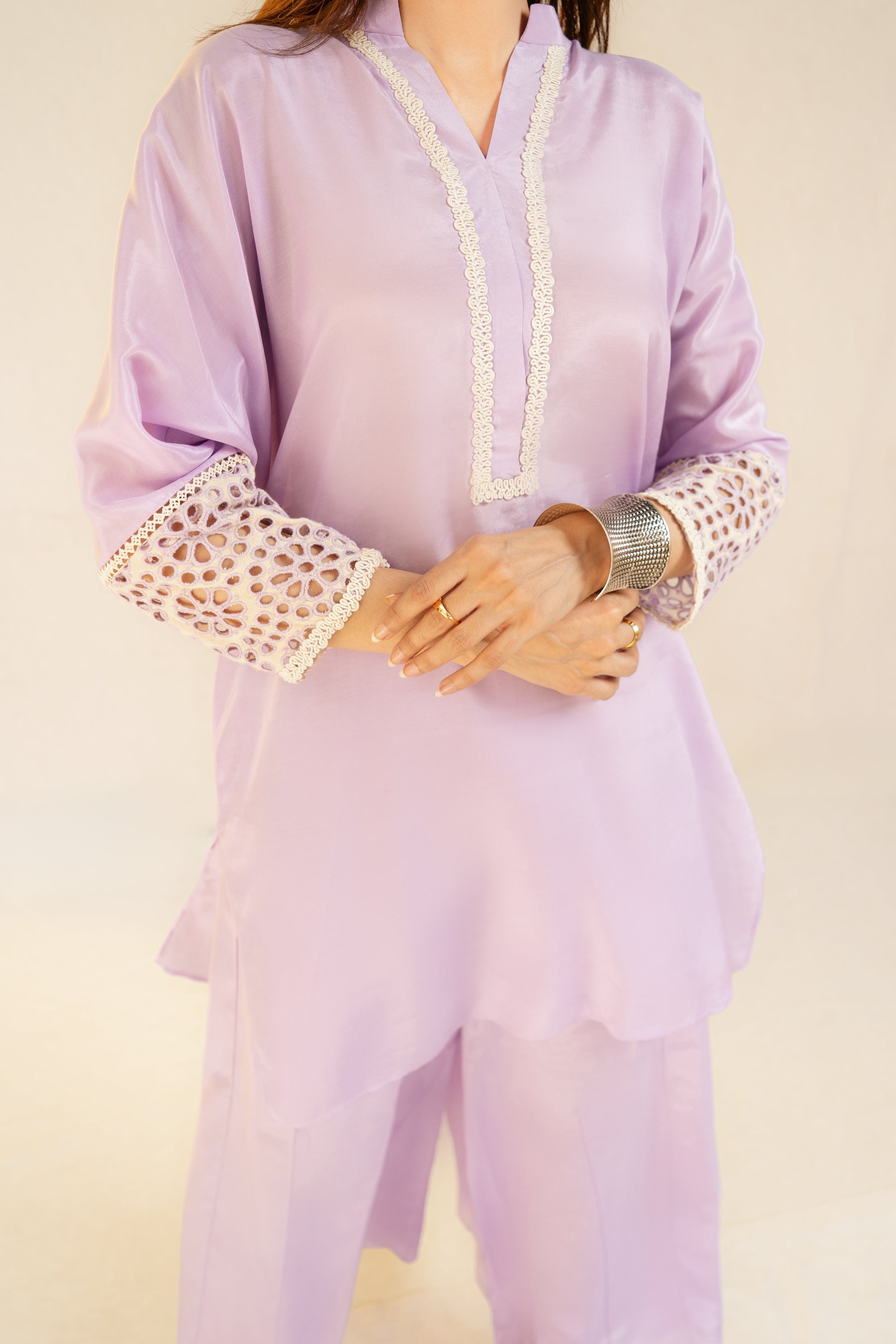 Shirt viscose and linen blend, lace detail on the neckline. Raglan sleeves with eyelet embroidery detail.