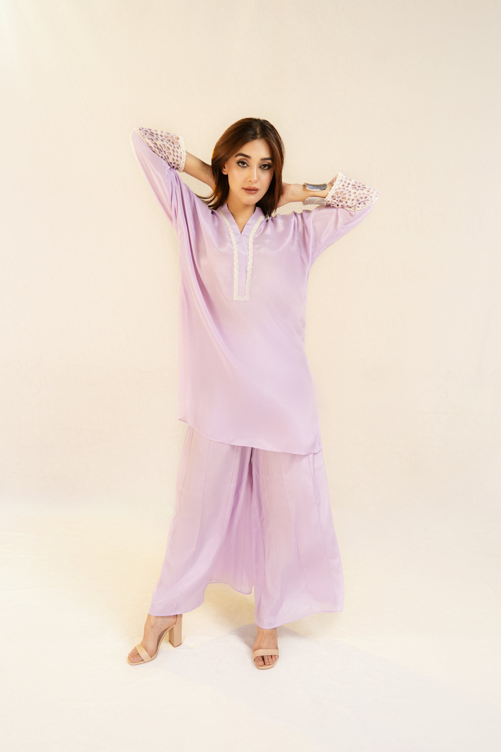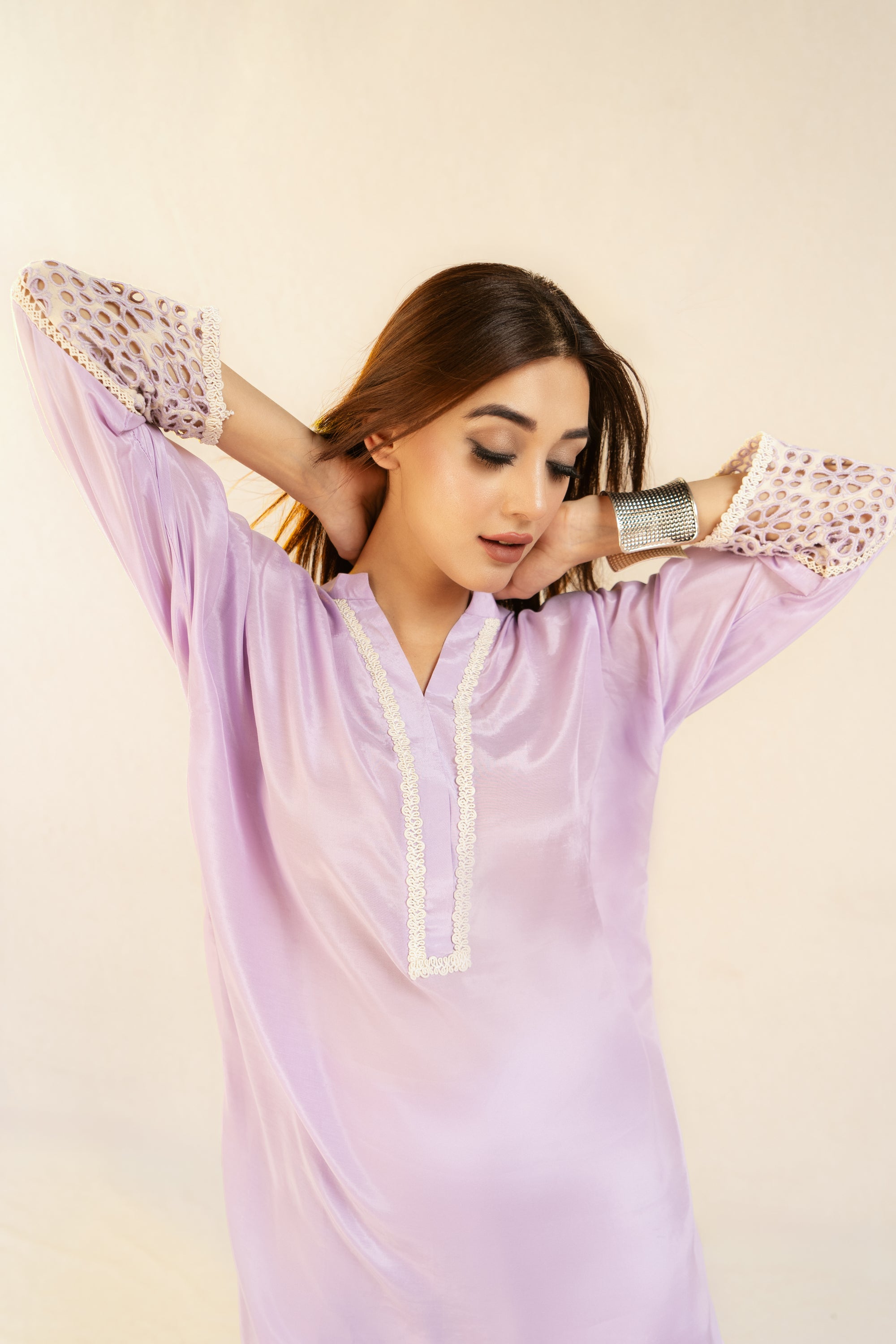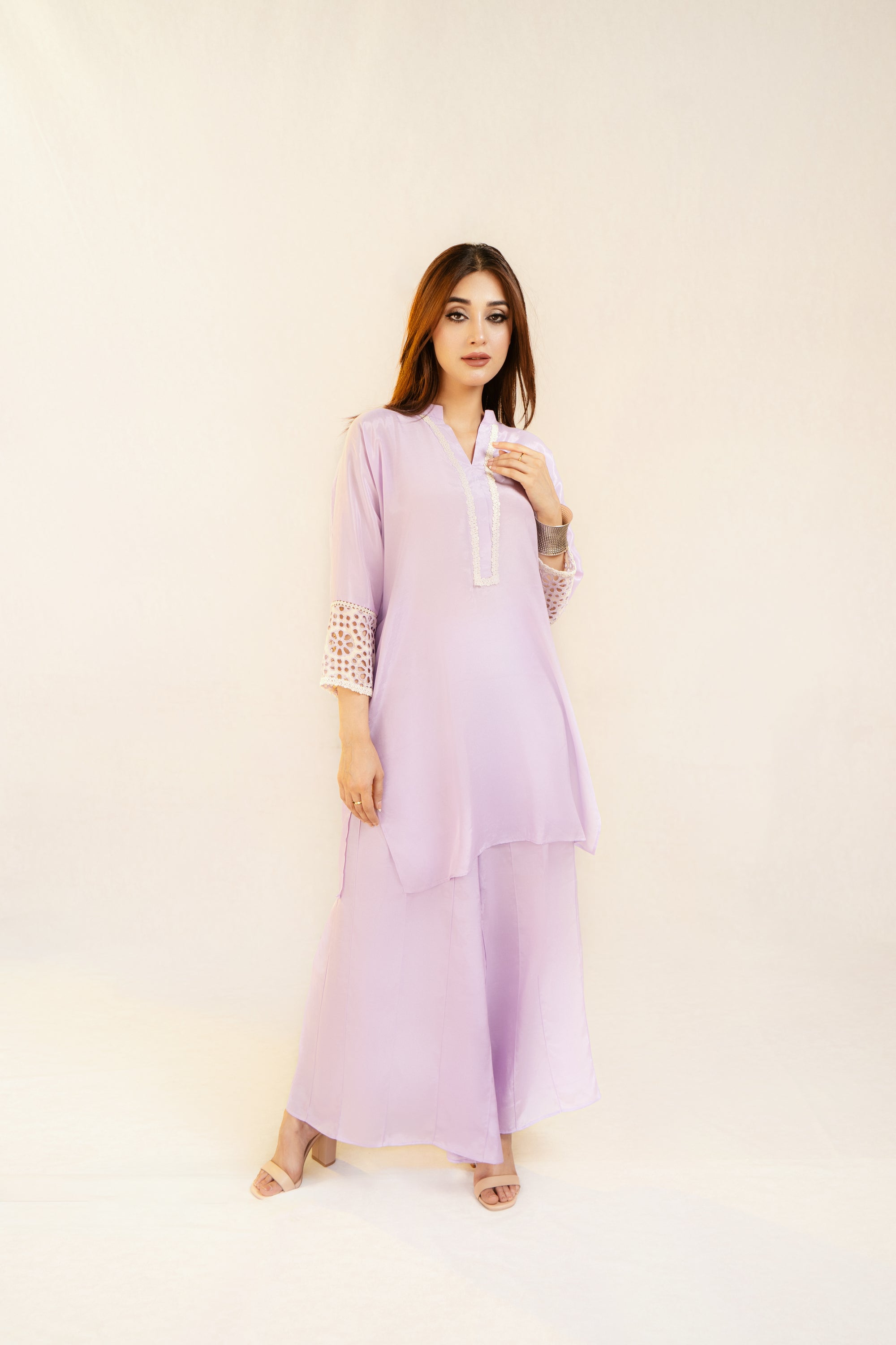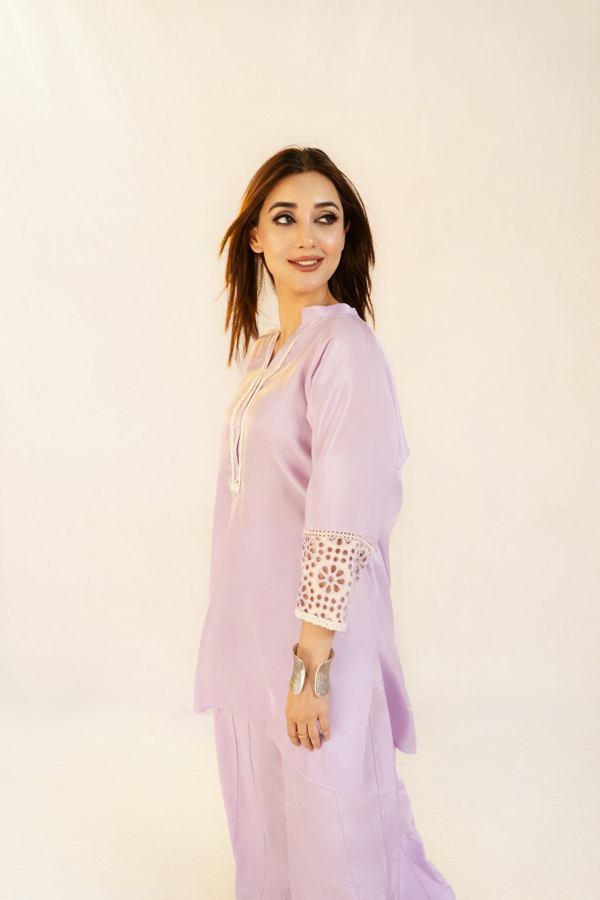 Shirt viscose and linen blend, lace detail on the neckline. Raglan sleeves with eyelet embroidery detail.
