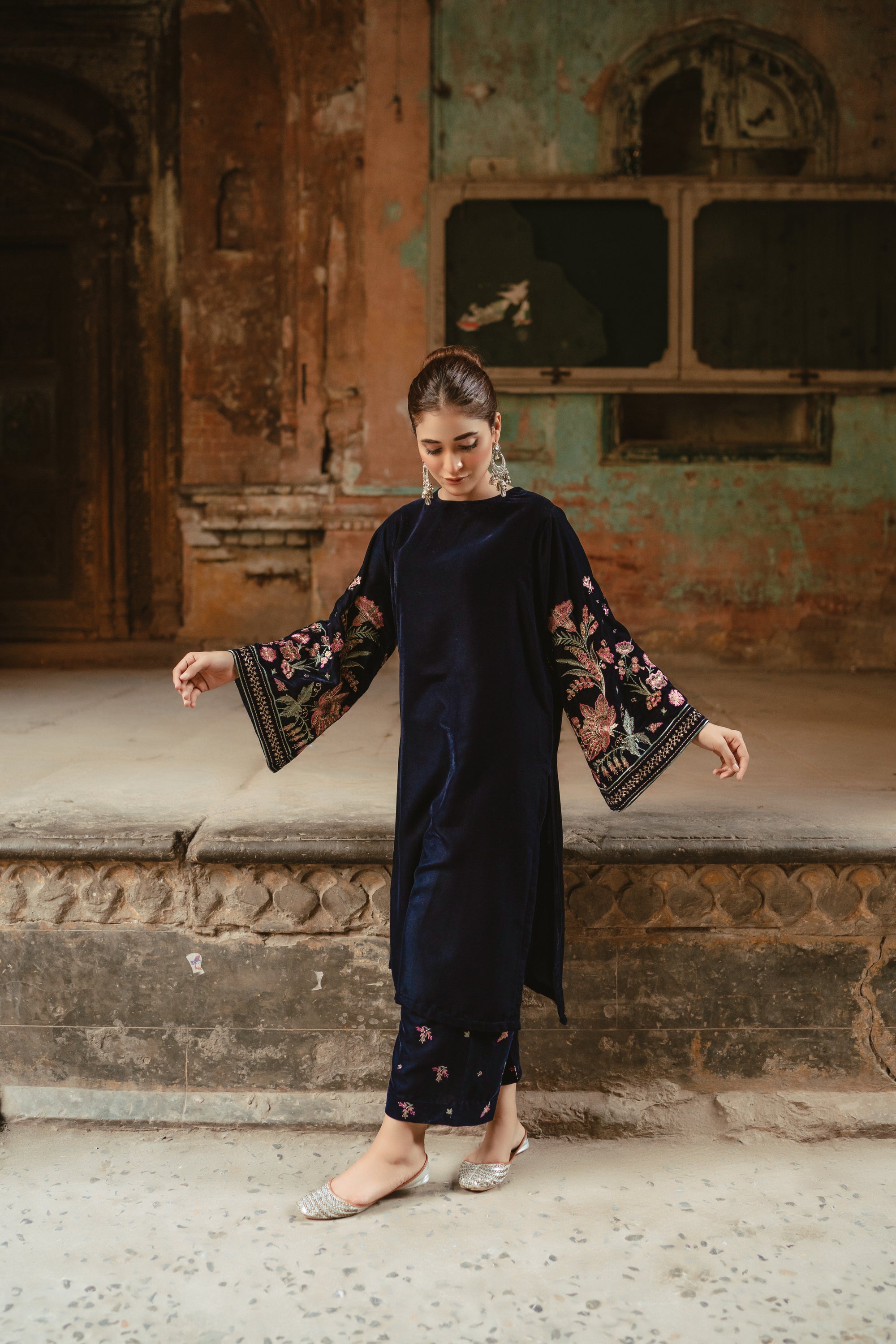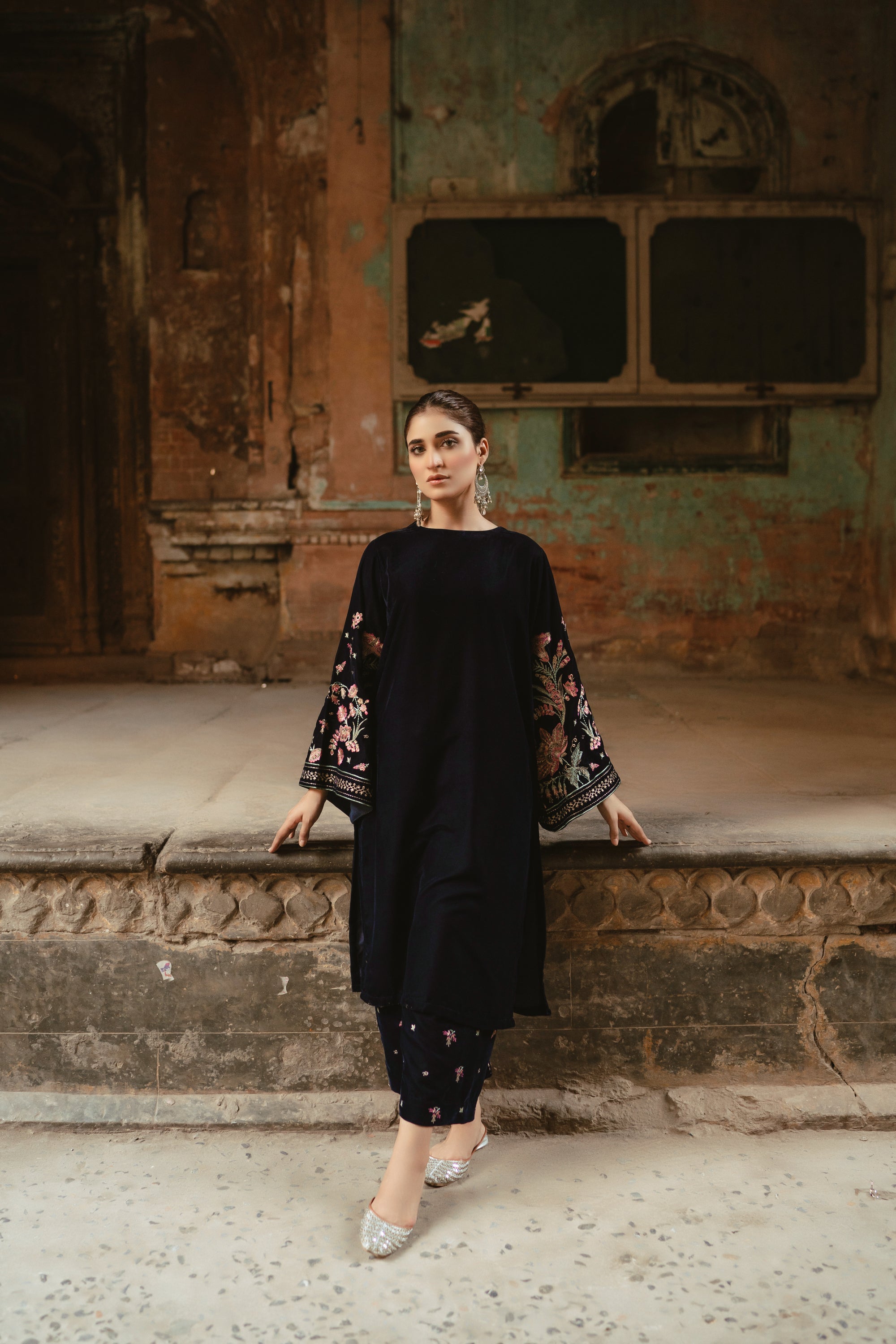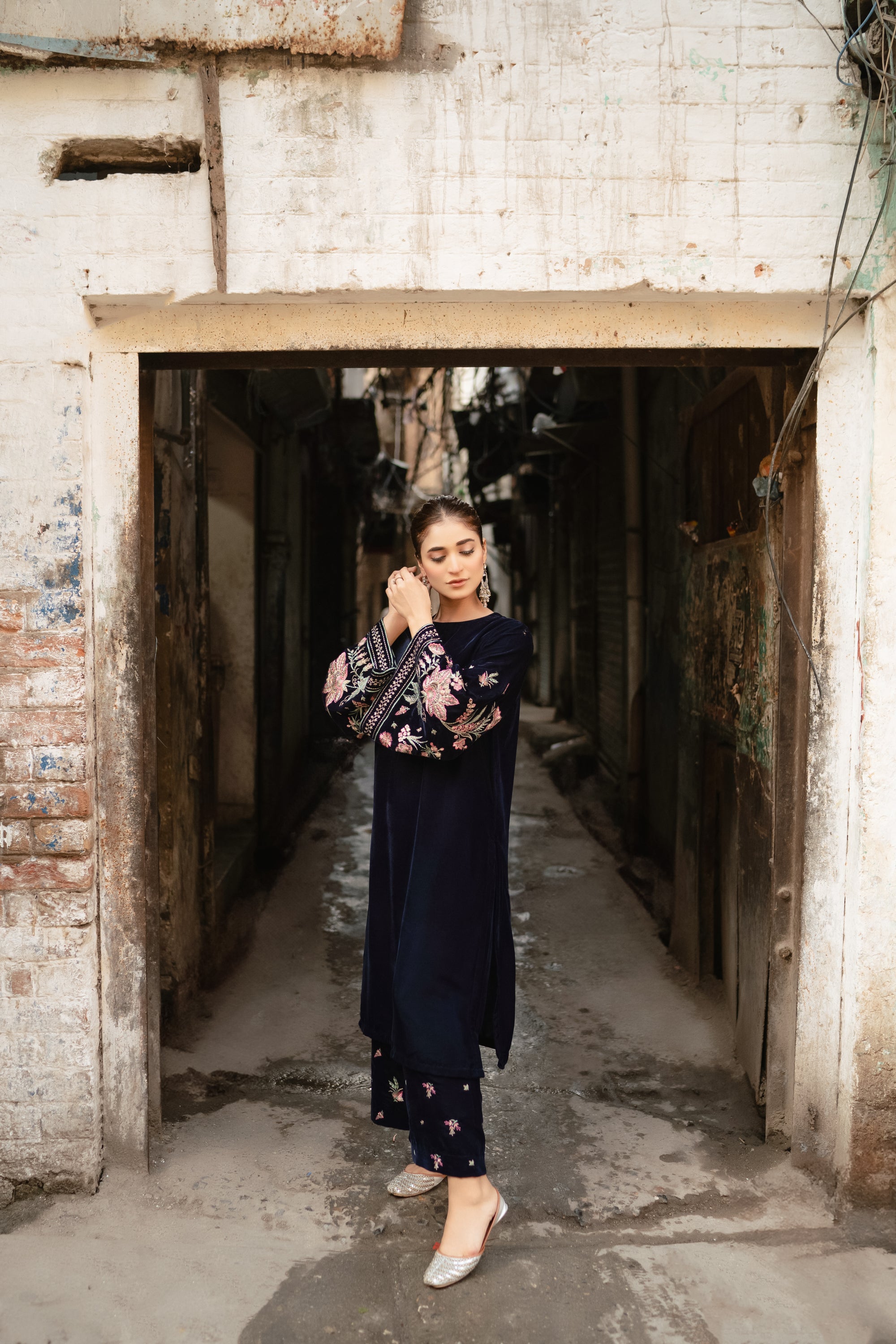 Update your wardrobe with ZOHRA, the ready-to-wear 2-piece velvet suit featuring a beautiful floral embroidery on the sleeves. The loose embroidered trousers add a touch of elegance to this ensemble. Elevate your style game with this versatile and trendy outfit.