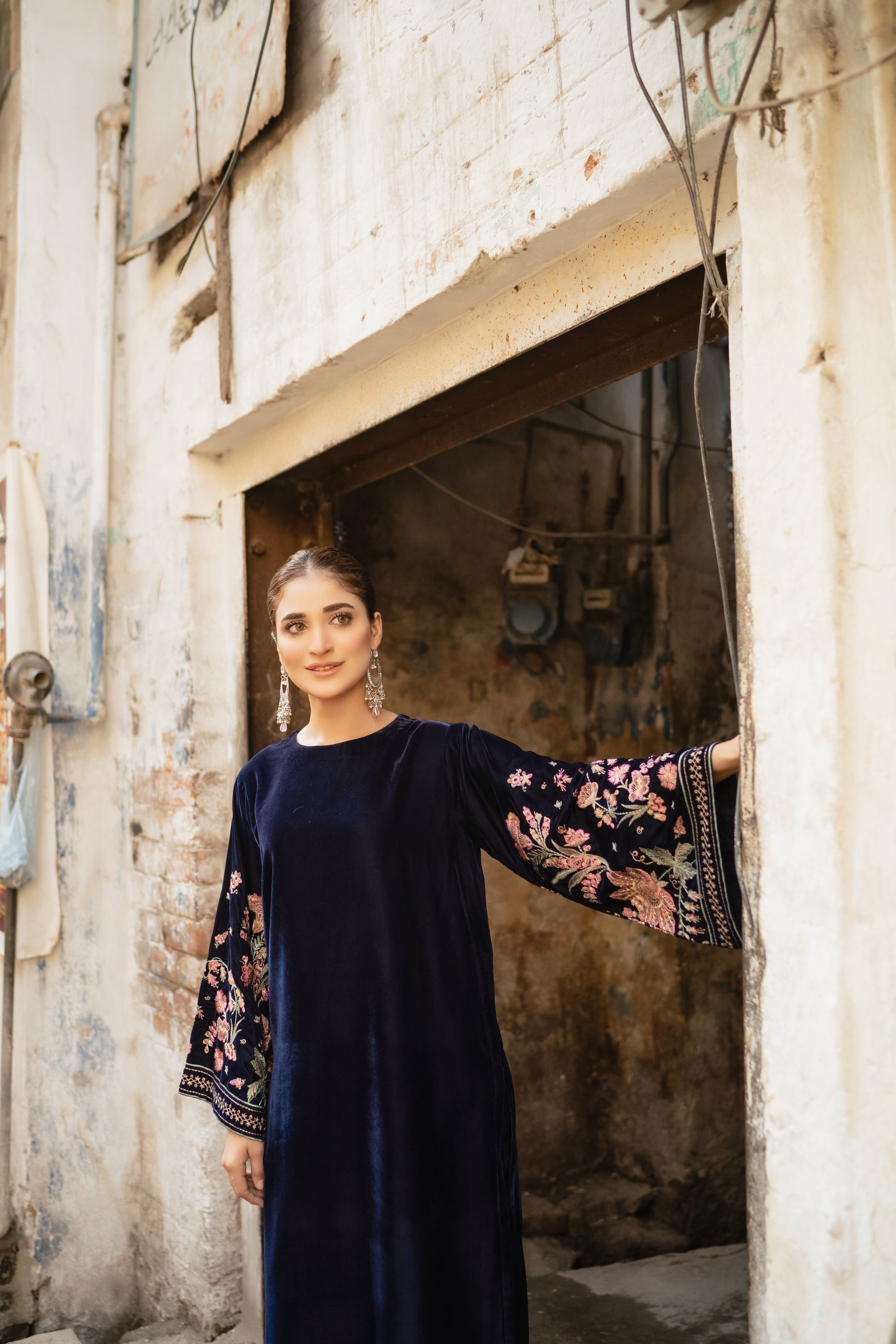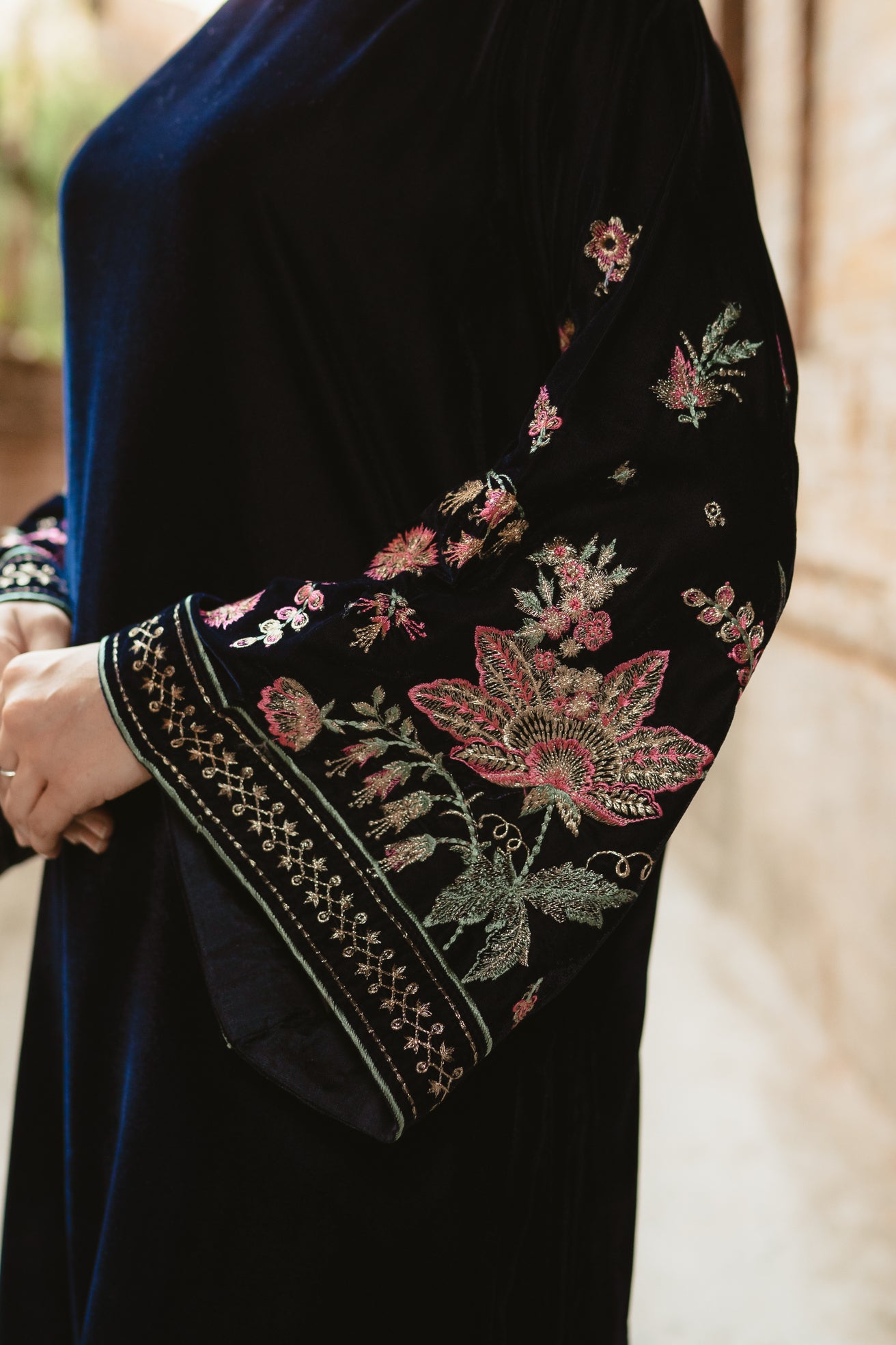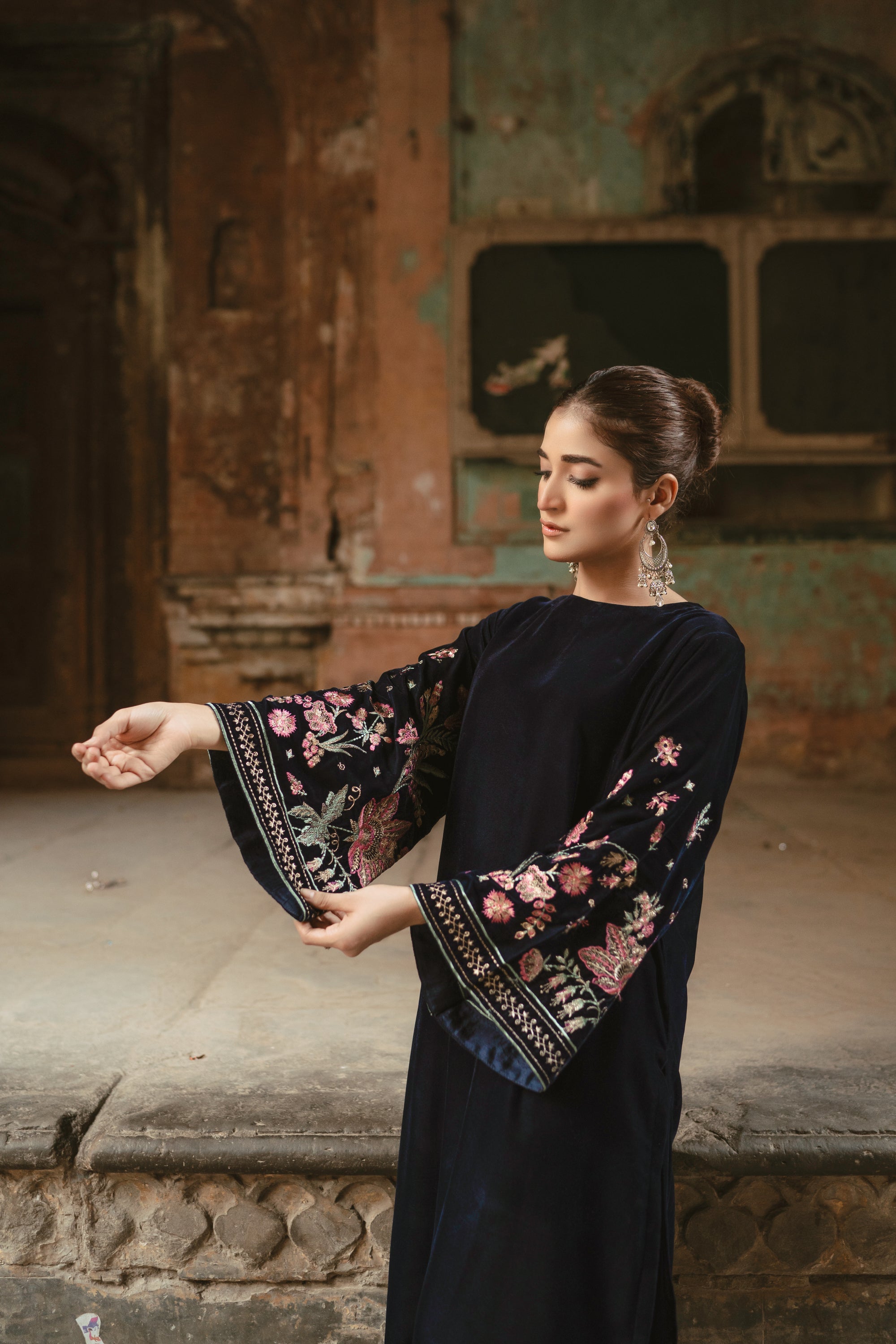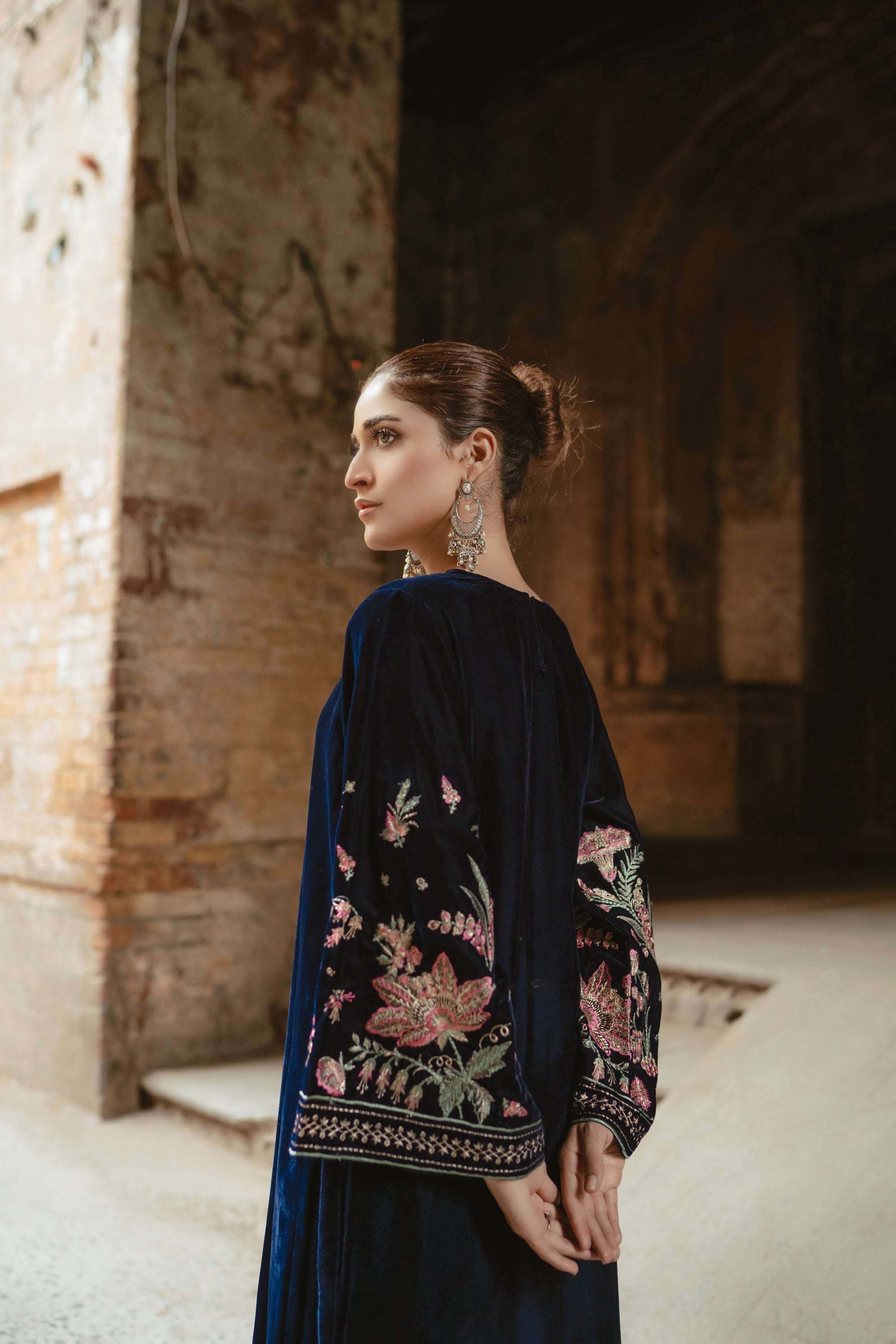 Update your wardrobe with ZOHRA, the ready-to-wear 2-piece velvet suit featuring a beautiful floral embroidery on the sleeves. The loose embroidered trousers add a touch of elegance to this ensemble. Elevate your style game with this versatile and trendy outfit.