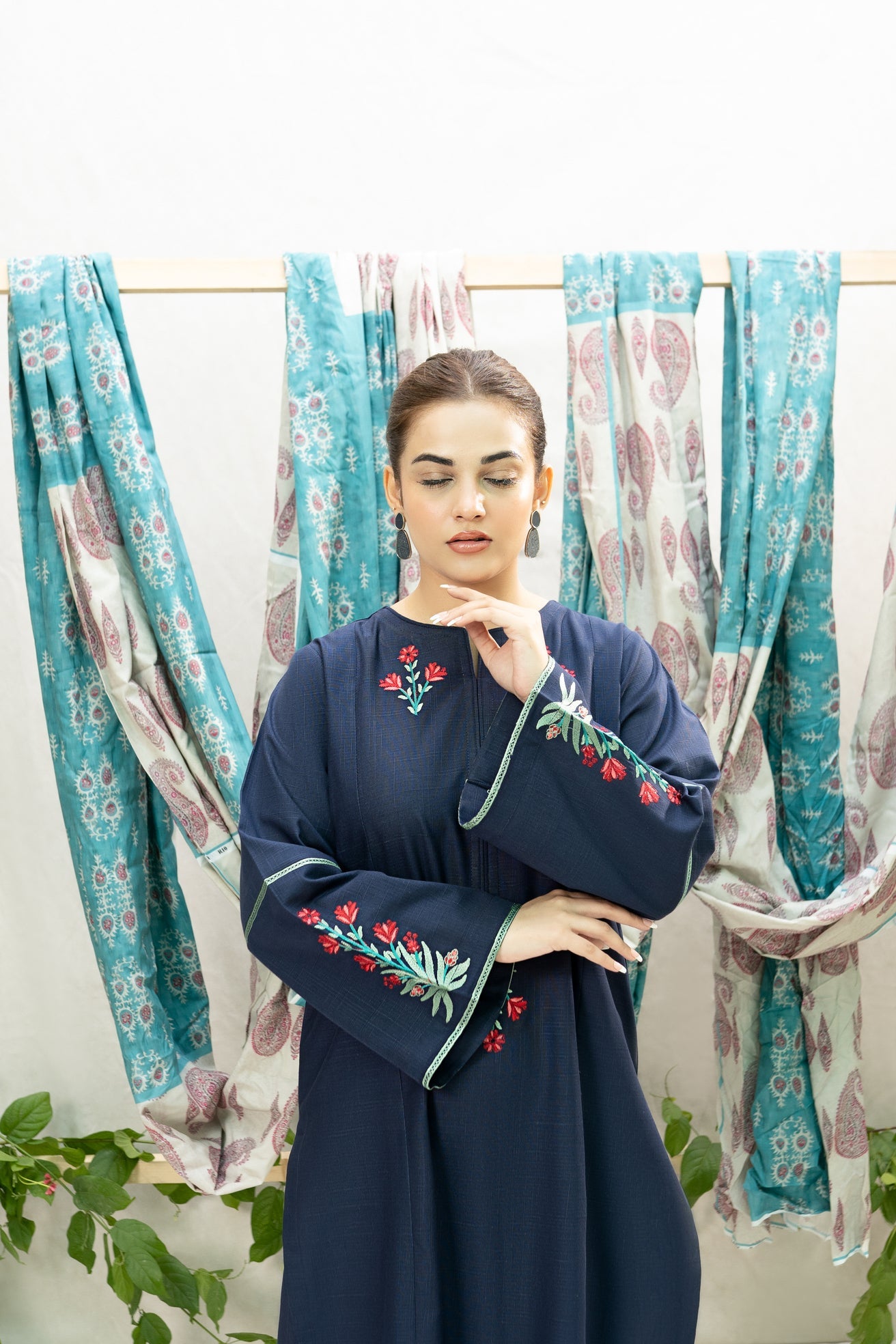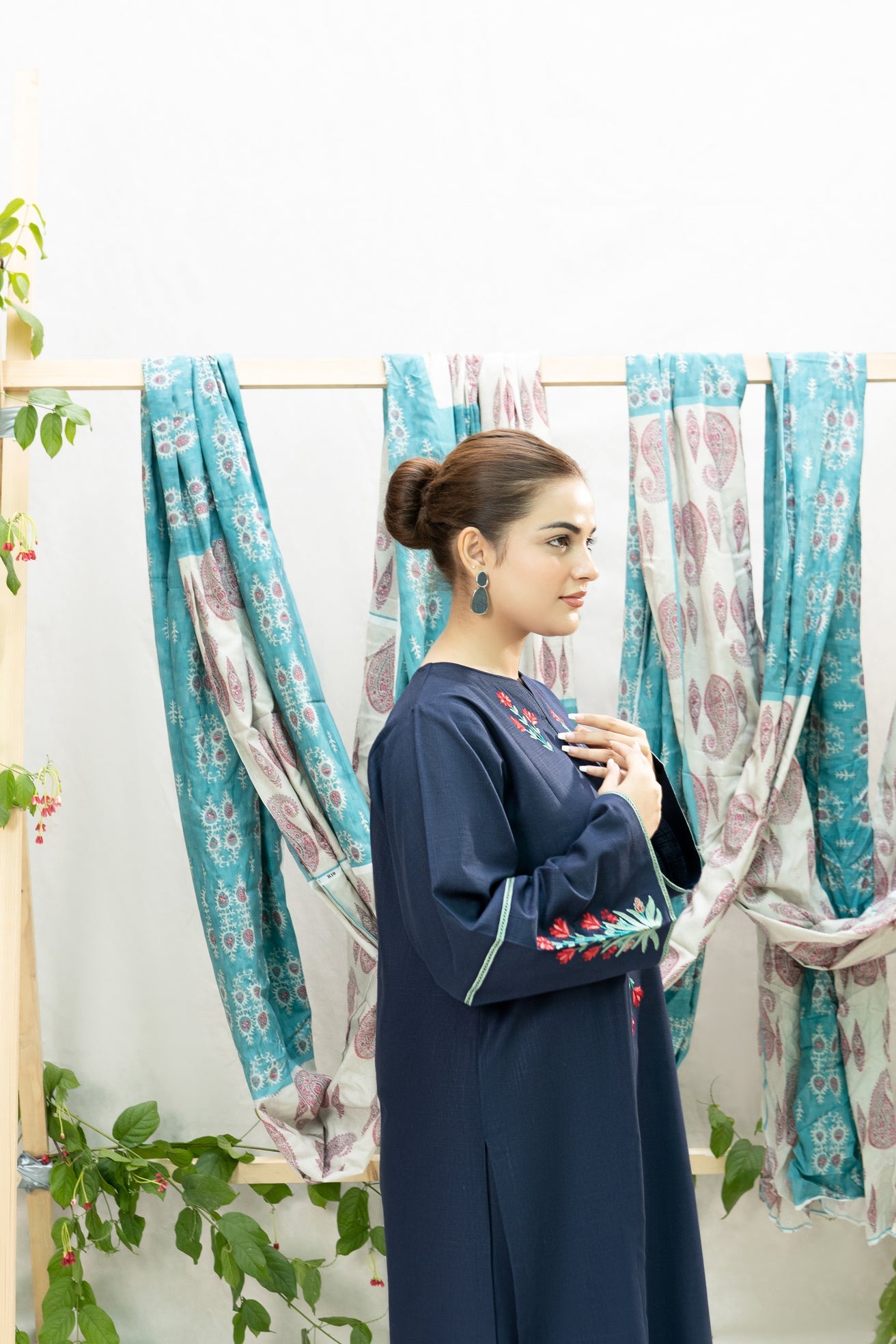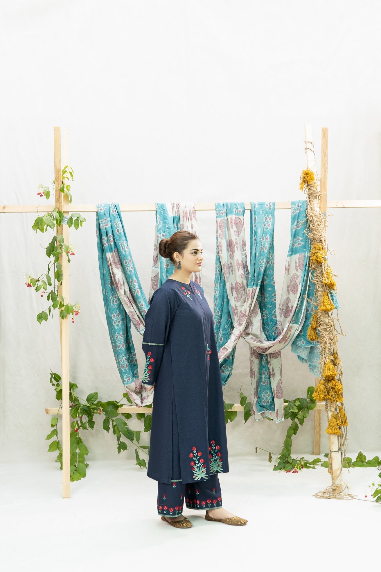 Introducing ARZOO, our new 2pc khaddar embroidered suit that is ready to wear. This elegant ensemble features a long shirt adorned with beautiful floral motifs on the front and sleeves, paired with loose embroidered trousers. Make a statement with ARZOO.