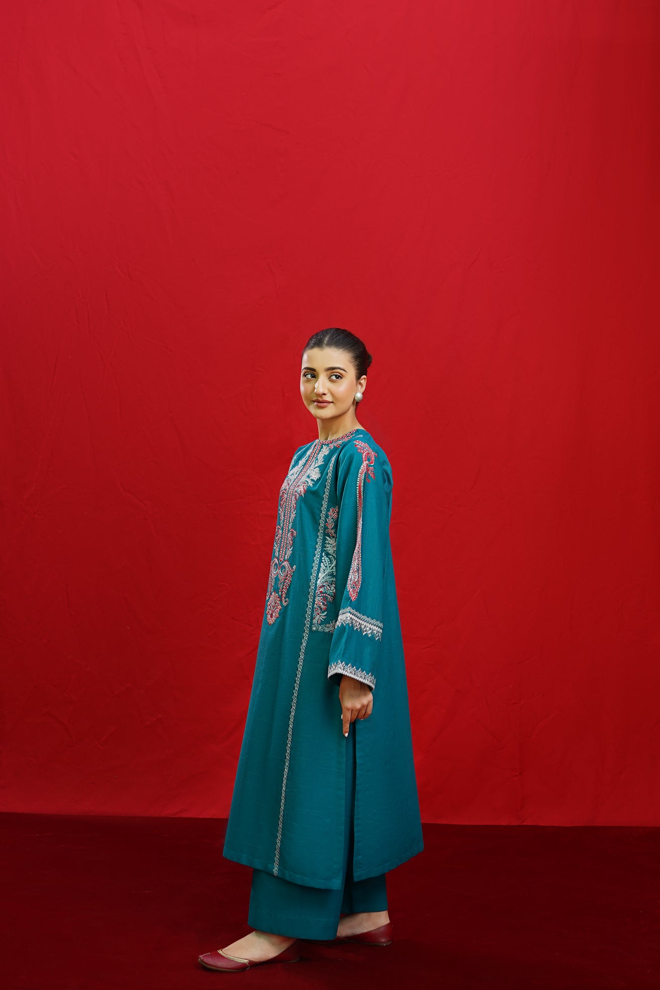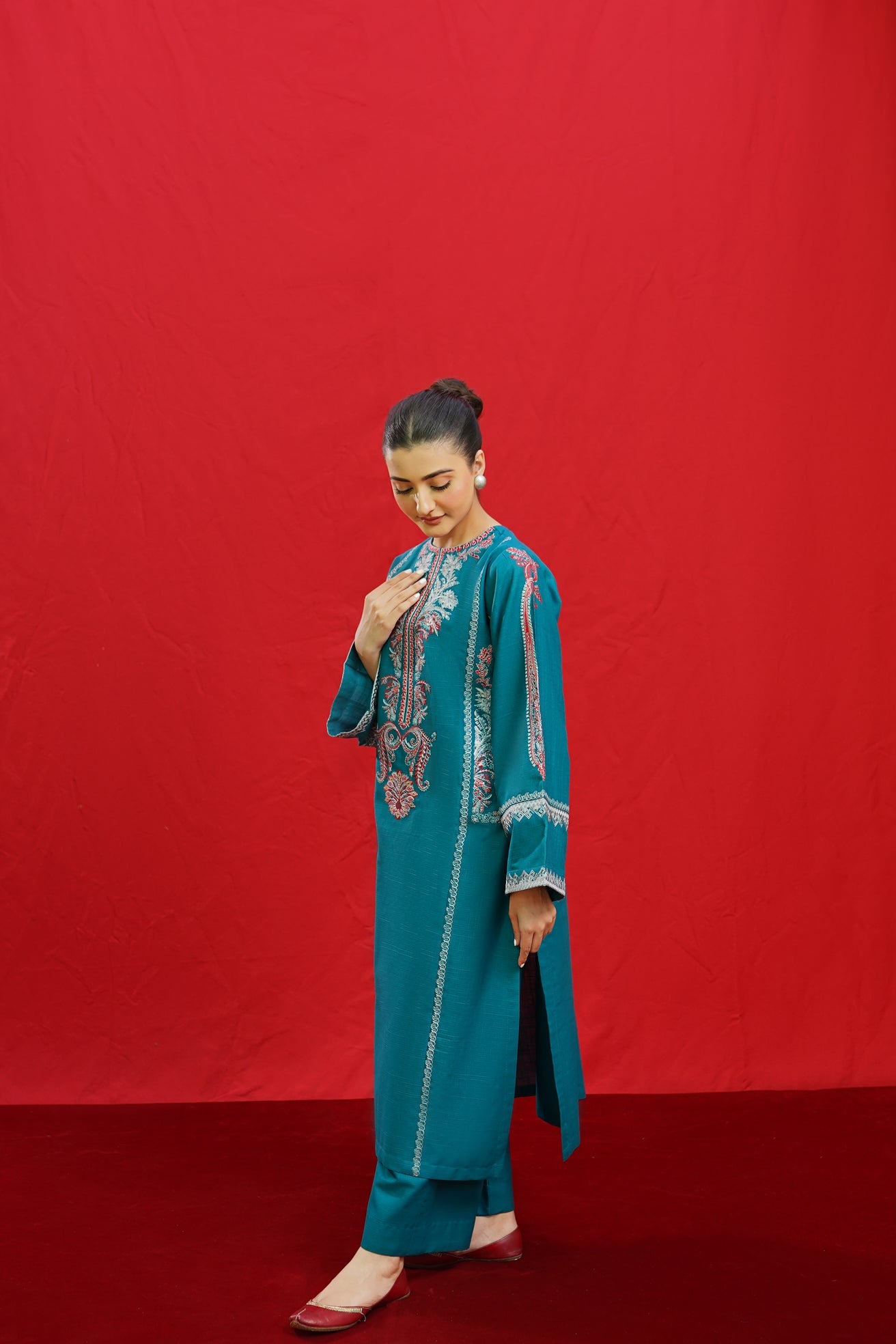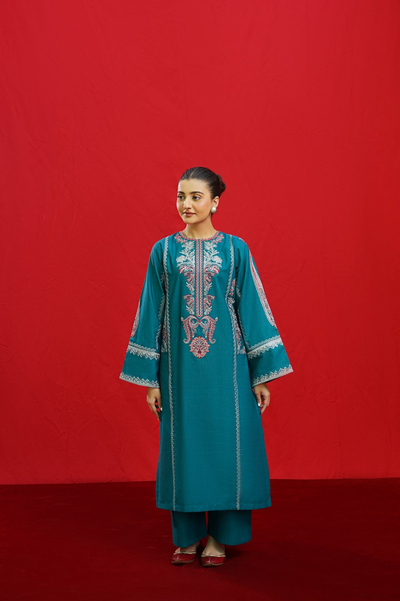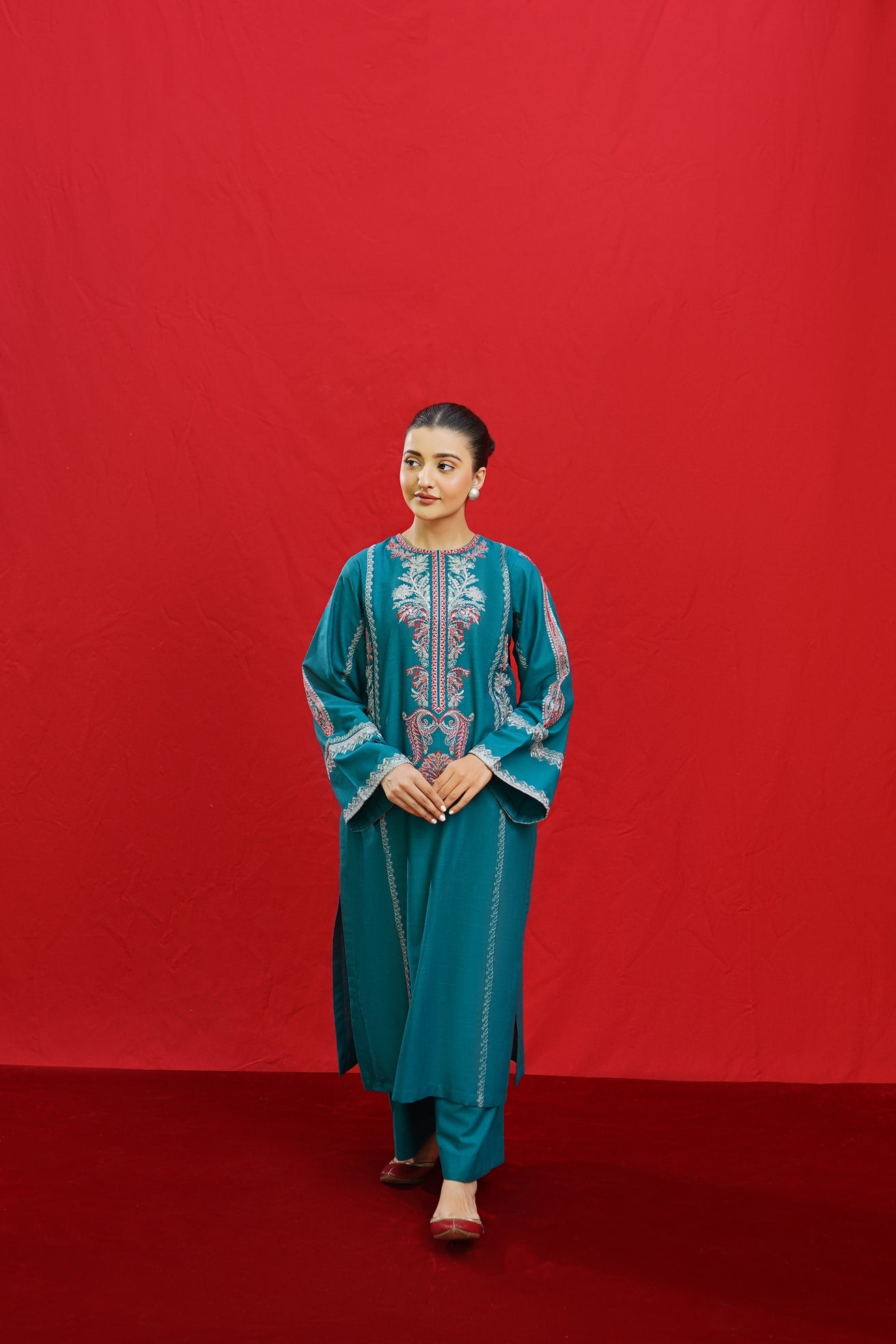 Discover the elegance of BORGIA, a 2-piece ready-to-wear khaddar suit featuring intricate embroidery on the shirt neckline, side panels, and sleeves. This beautifully crafted suit is paired with plain loose trousers, making it a versatile and timeless addition to your wardrobe. Elevate your style with BORGIA today.