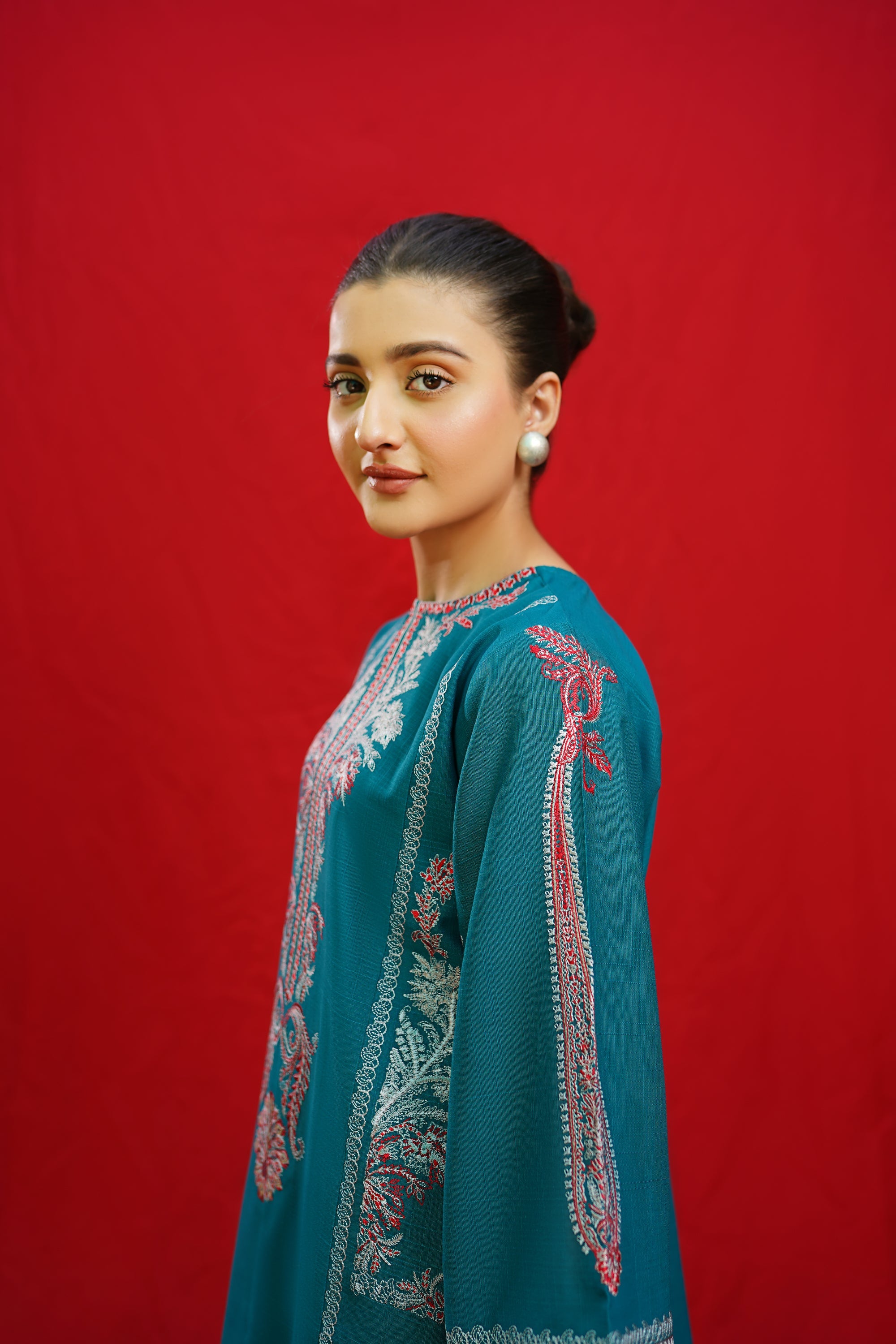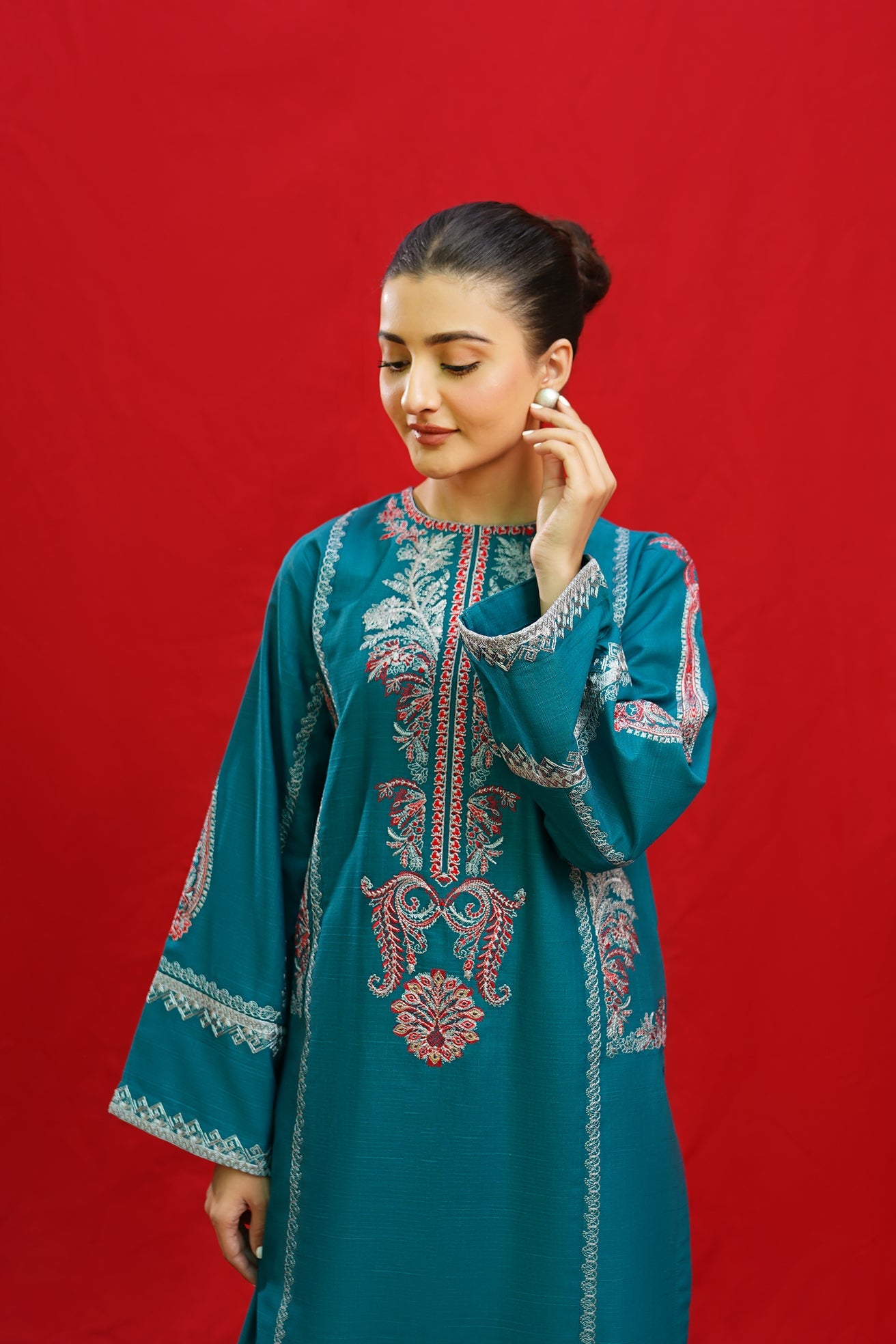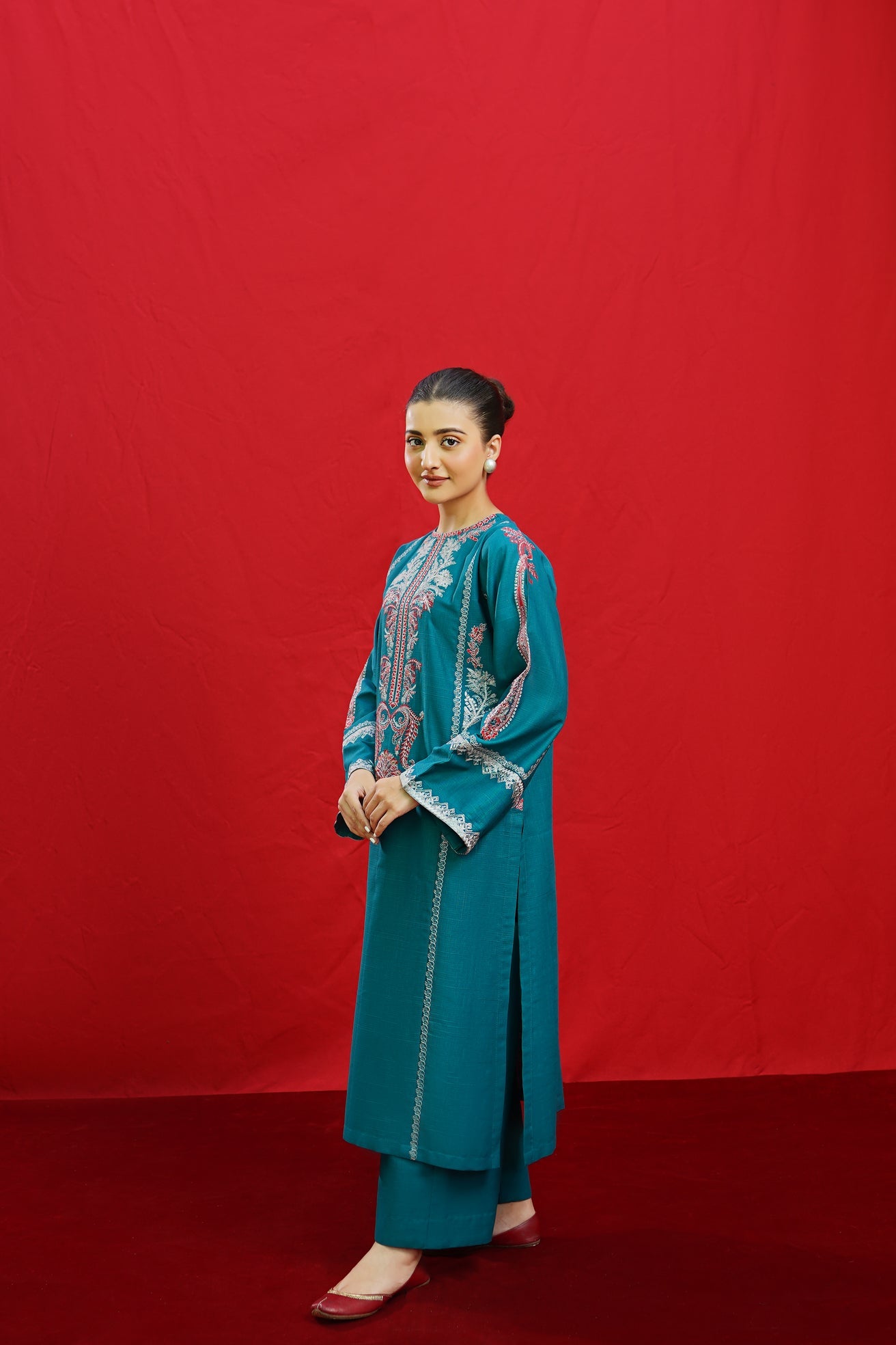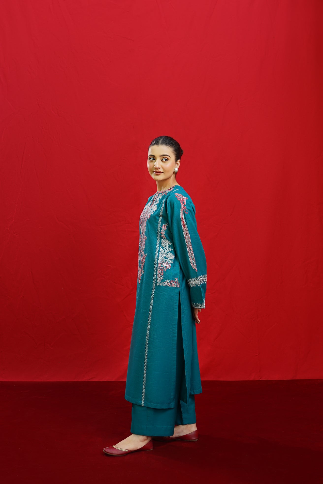 Discover the elegance of BORGIA, a 2-piece ready-to-wear khaddar suit featuring intricate embroidery on the shirt neckline, side panels, and sleeves. This beautifully crafted suit is paired with plain loose trousers, making it a versatile and timeless addition to your wardrobe. Elevate your style with BORGIA today.