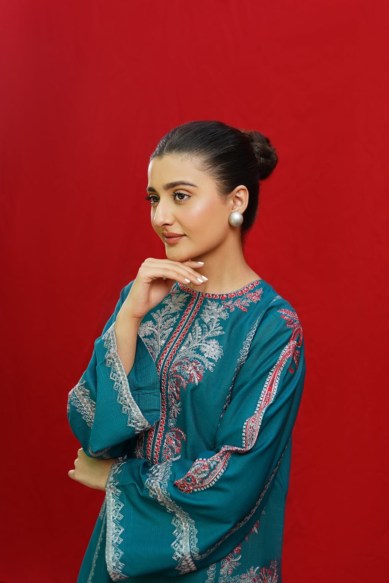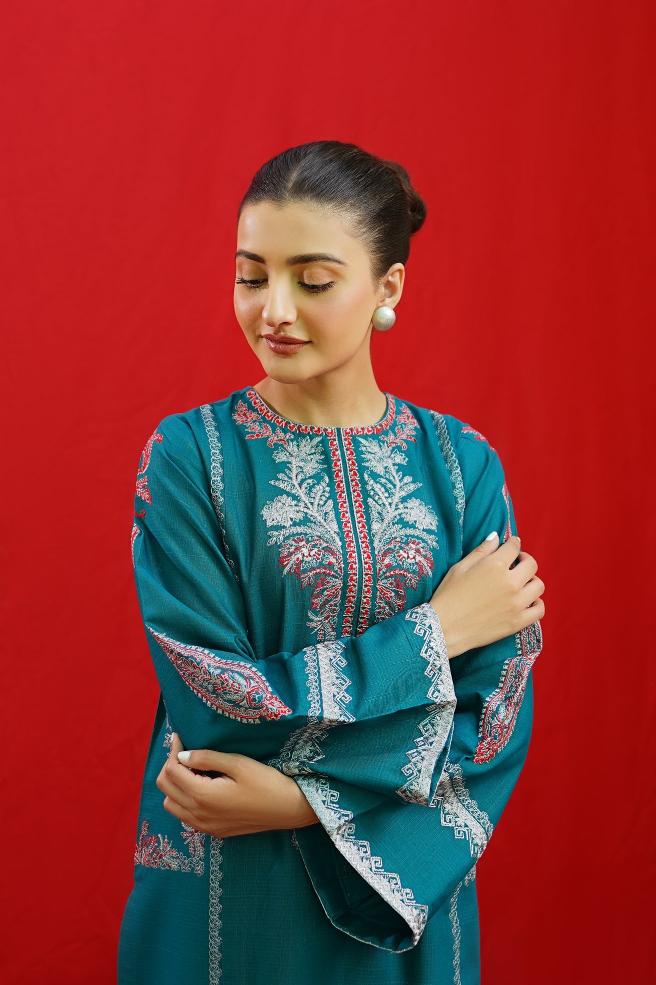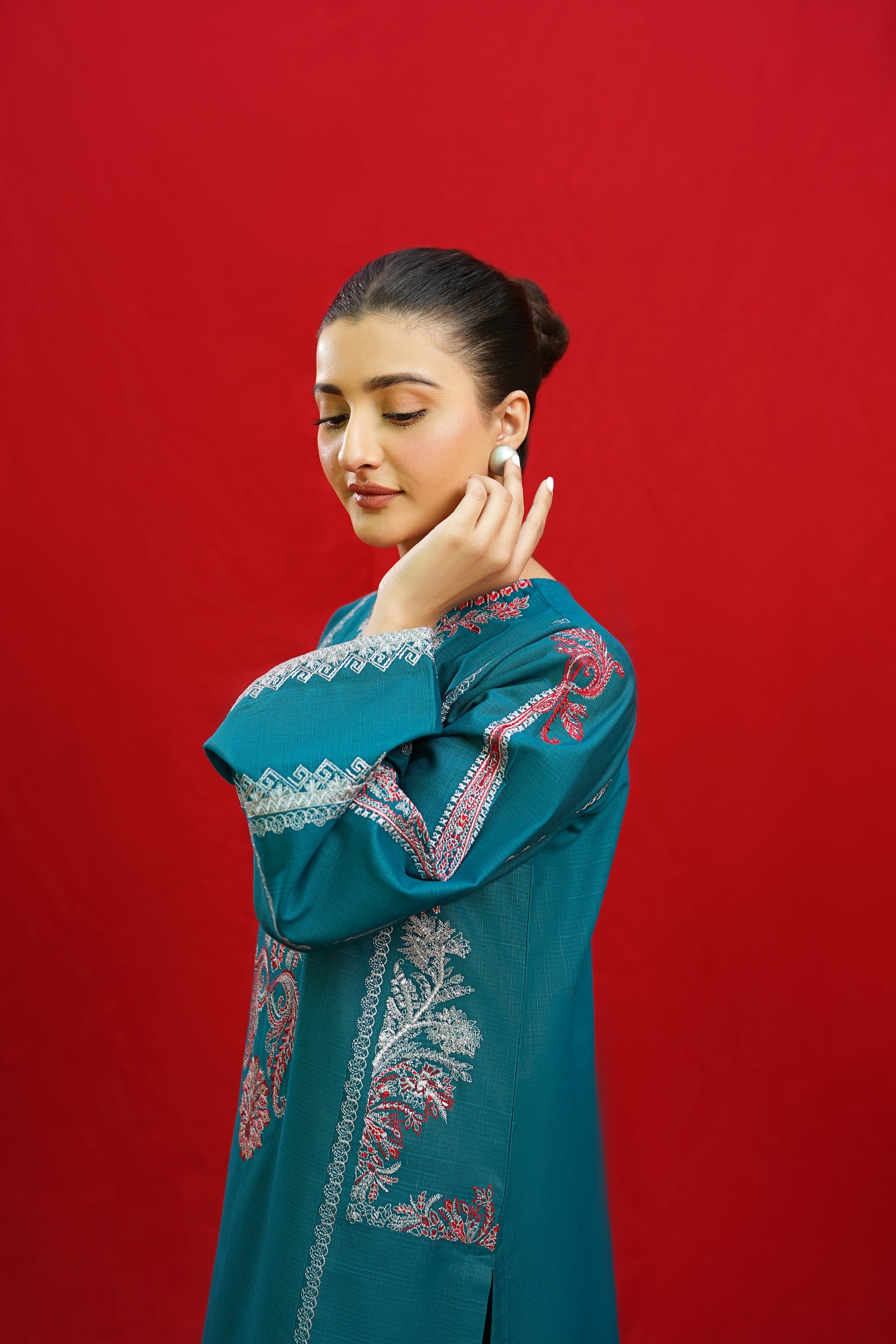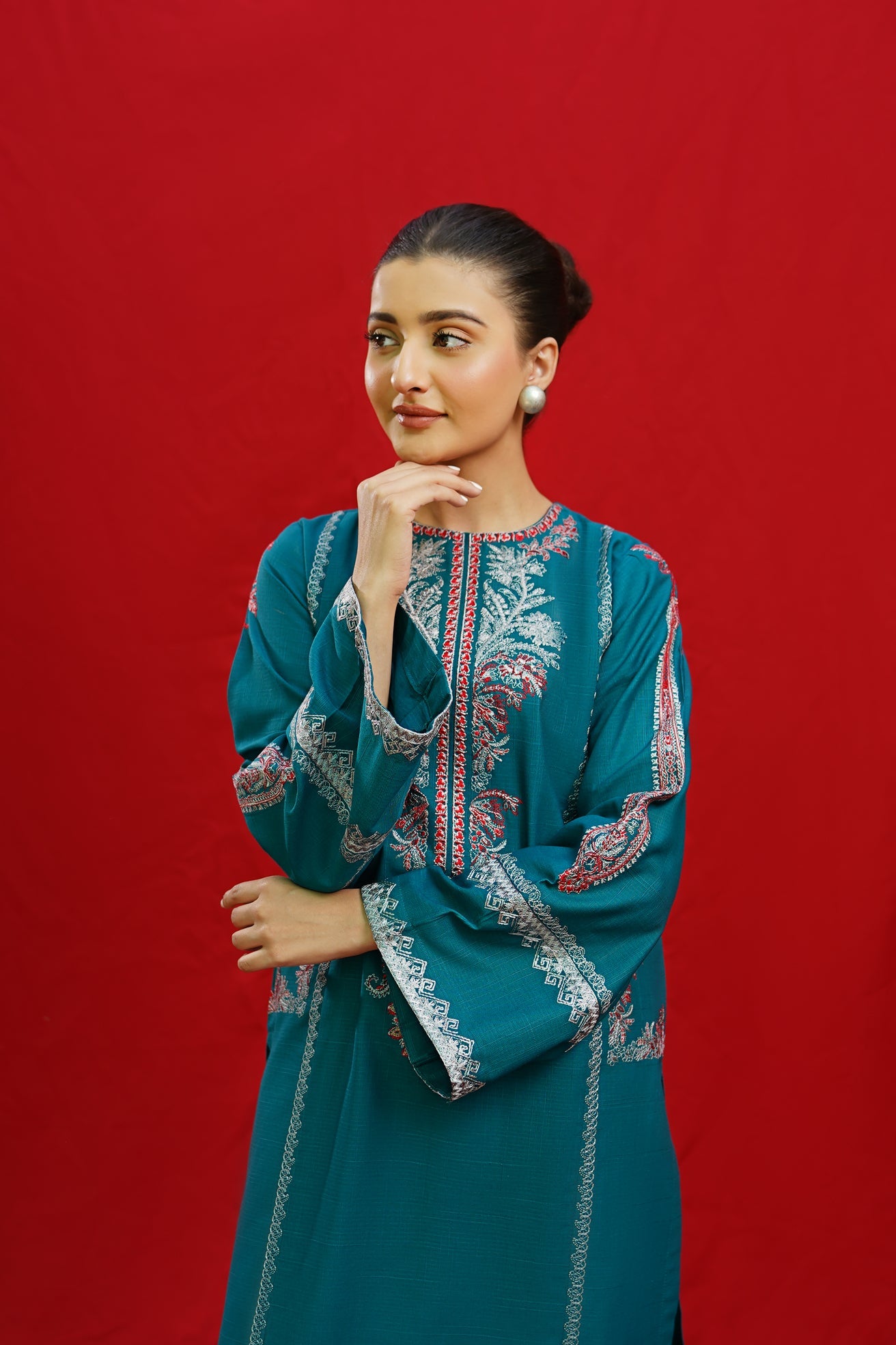 Discover the elegance of BORGIA, a 2-piece ready-to-wear khaddar suit featuring intricate embroidery on the shirt neckline, side panels, and sleeves. This beautifully crafted suit is paired with plain loose trousers, making it a versatile and timeless addition to your wardrobe. Elevate your style with BORGIA today.
