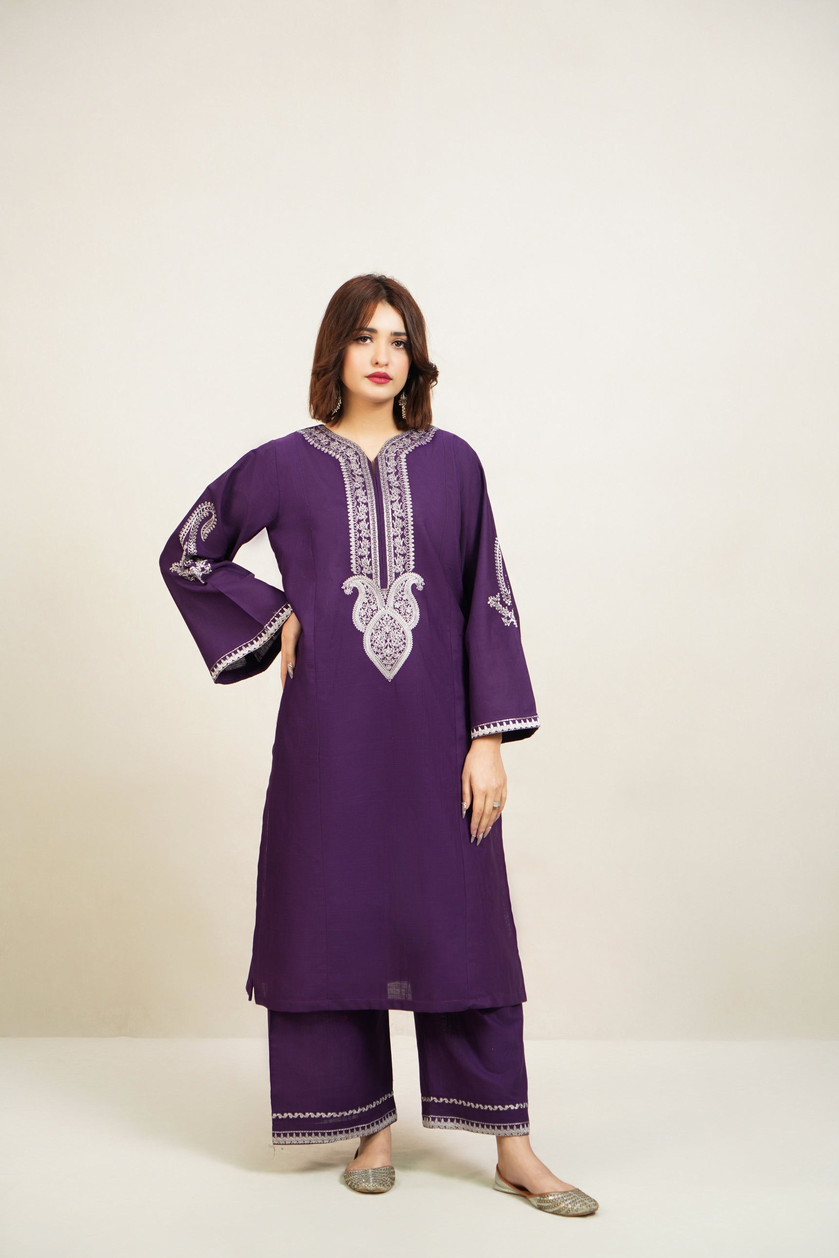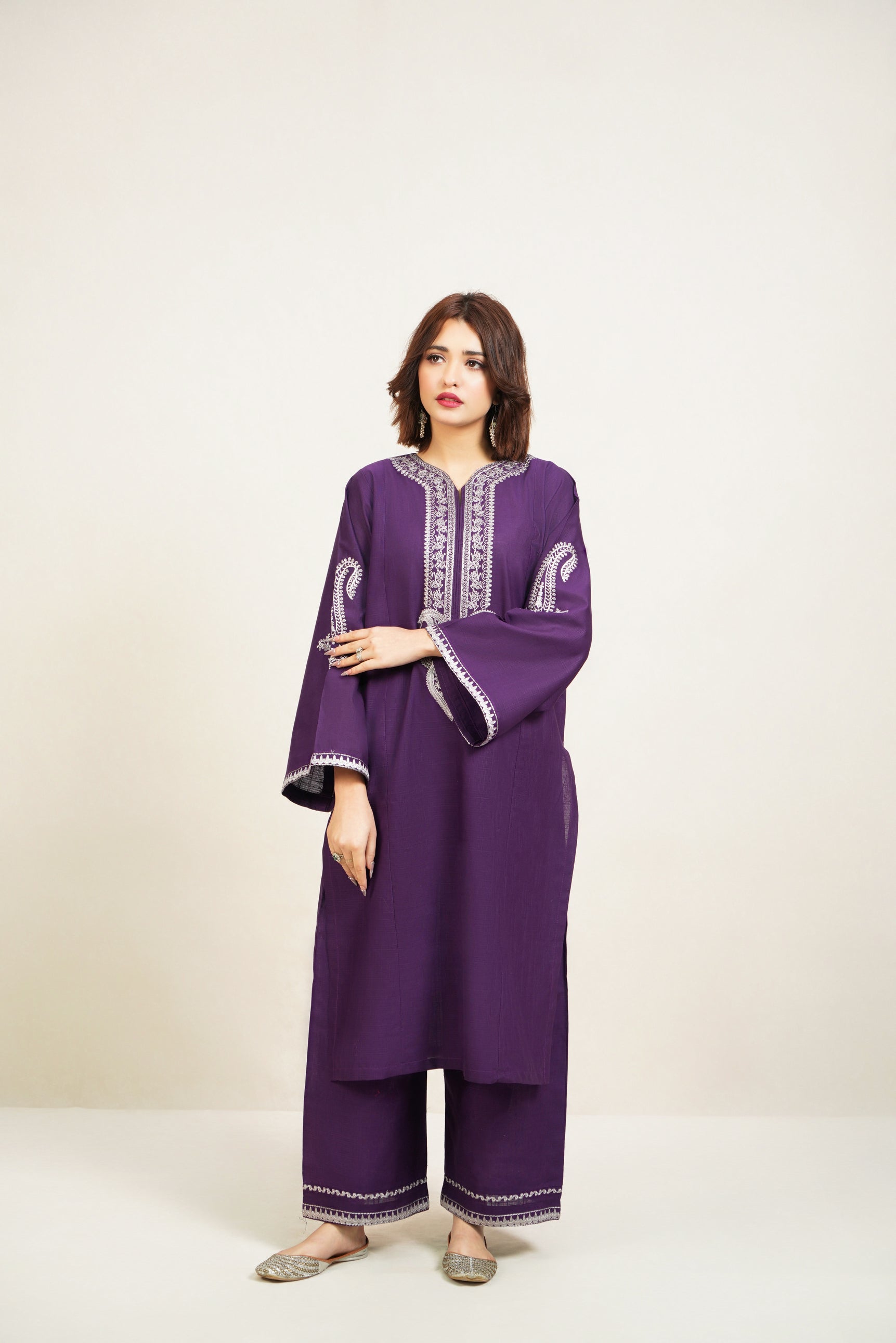 Introducing CLAIRE, the perfect 2-piece Khaddar embroidered suit for any occasion. The intricate embroidery on the neckline and sleeves adds a touch of elegance, while the loose trousers provide both comfort and style. Get ready to wear this stunning ensemble and make a lasting impression.