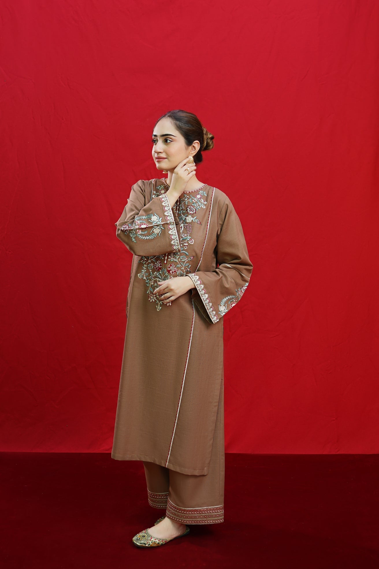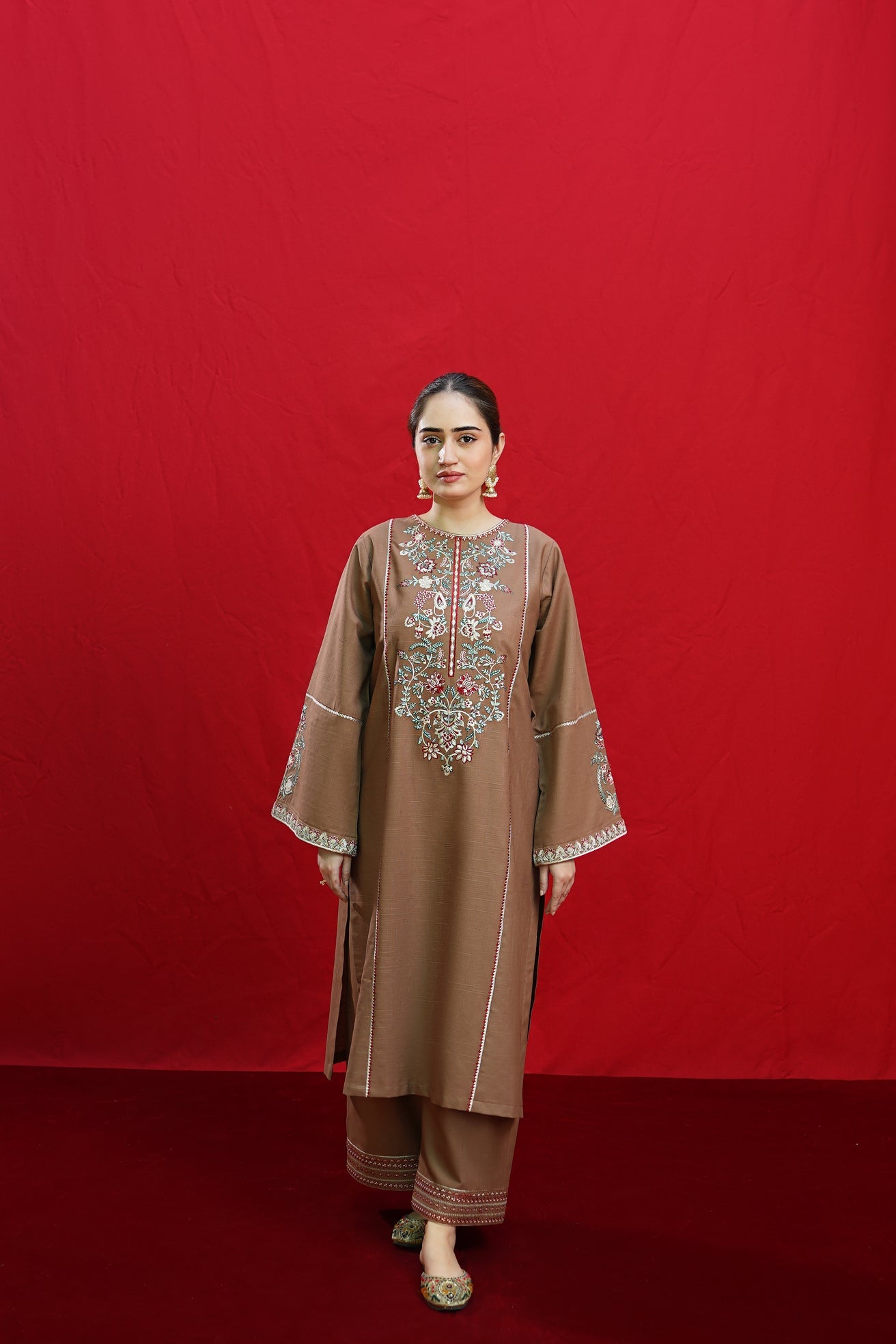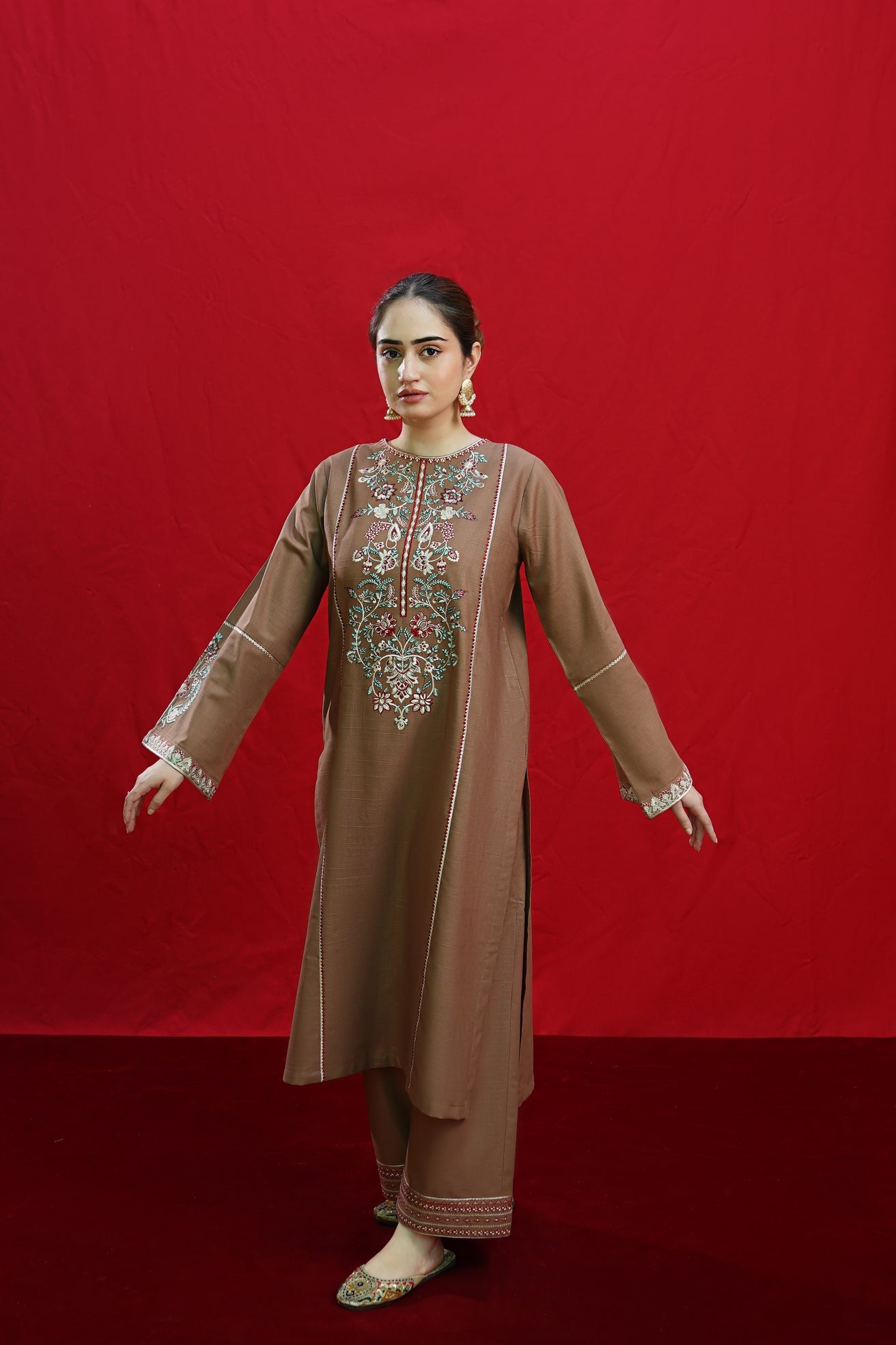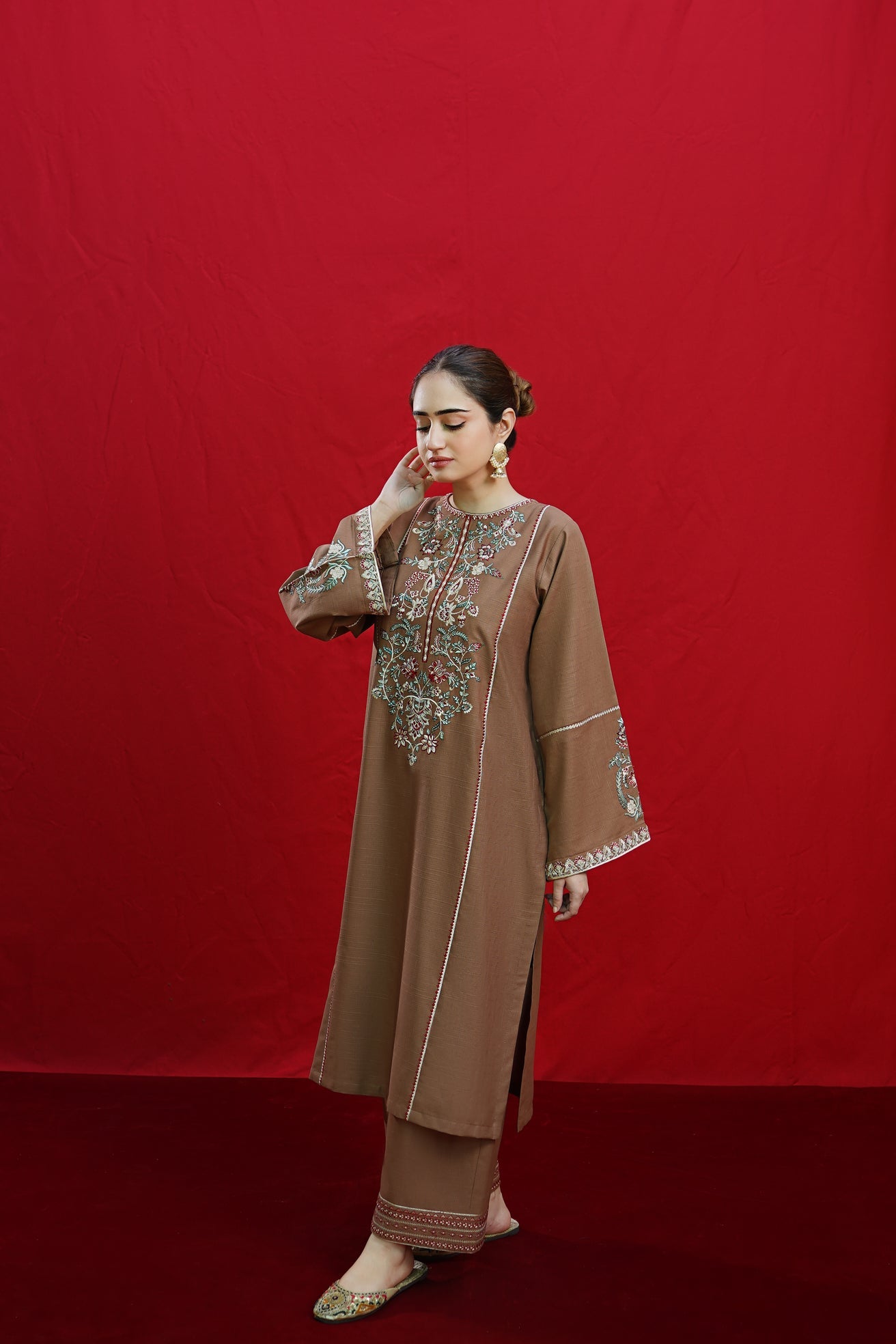Elevate your style with ELYNOR, a stunning ready-to-wear 2pc khaddar suit. Featuring delicate floral embroidery on the neckline and sleeves, paired with loose embroidered trousers for a complete look. Perfect for any occasion.