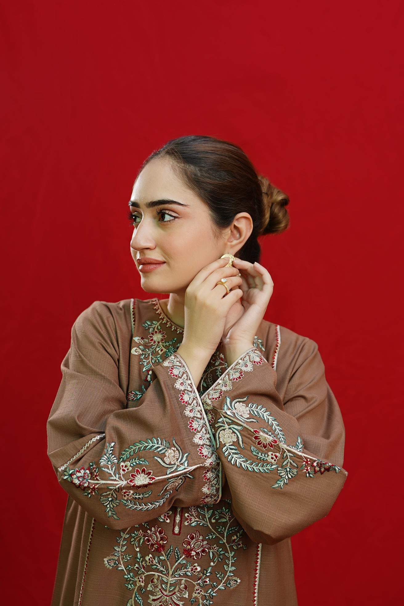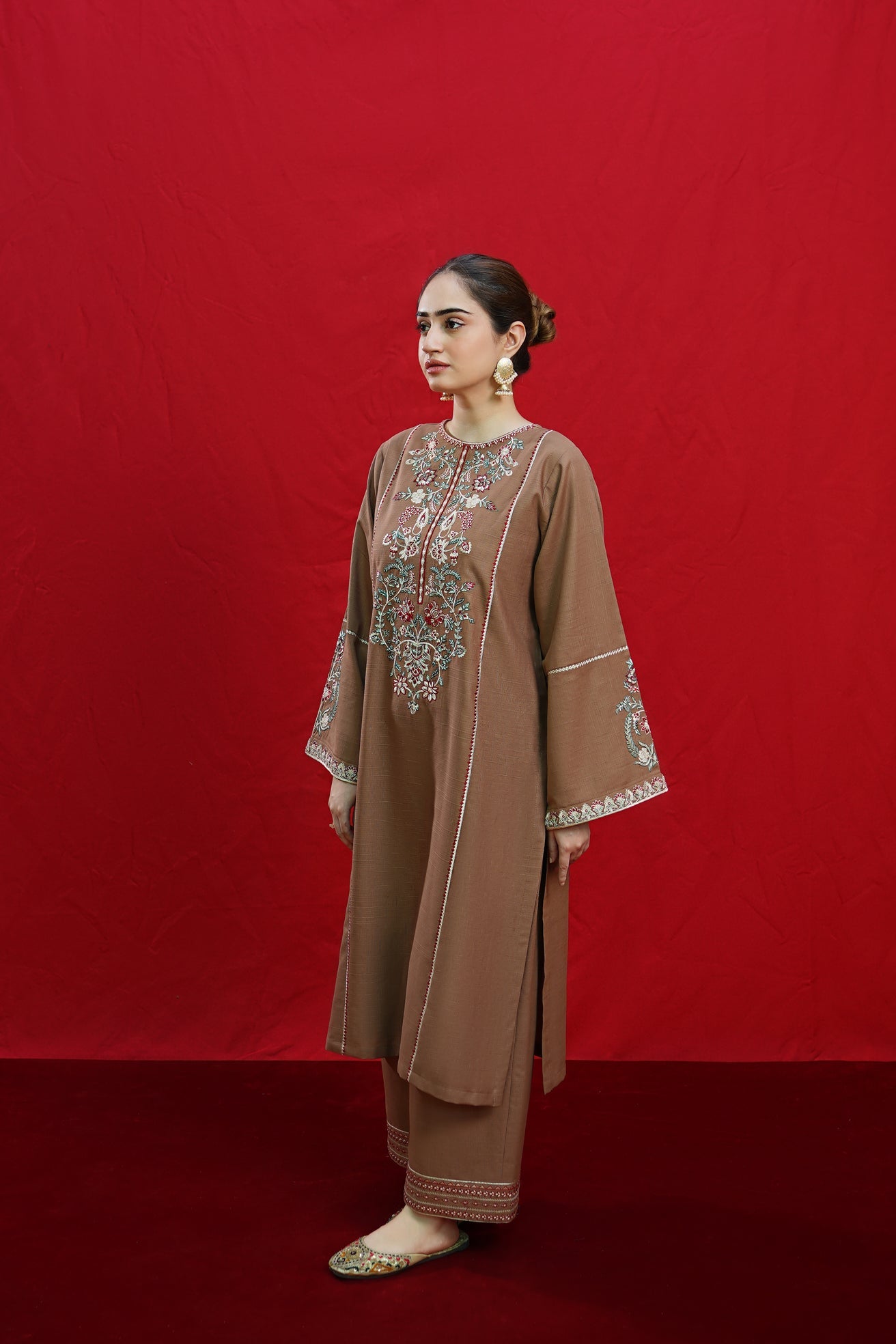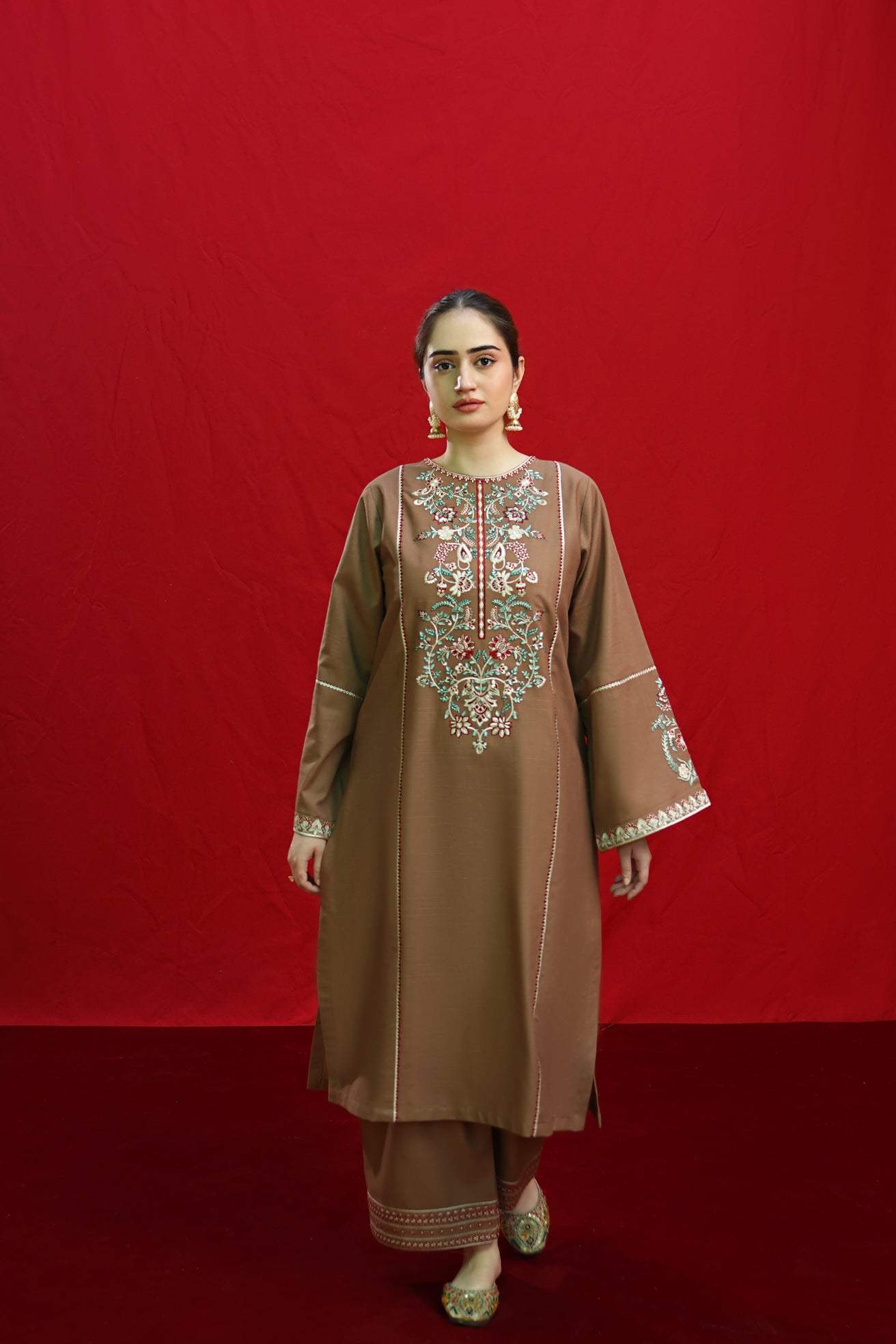 Elevate your style with ELYNOR, a stunning ready-to-wear 2pc khaddar suit. Featuring delicate floral embroidery on the neckline and sleeves, paired with loose embroidered trousers for a complete look. Perfect for any occasion.