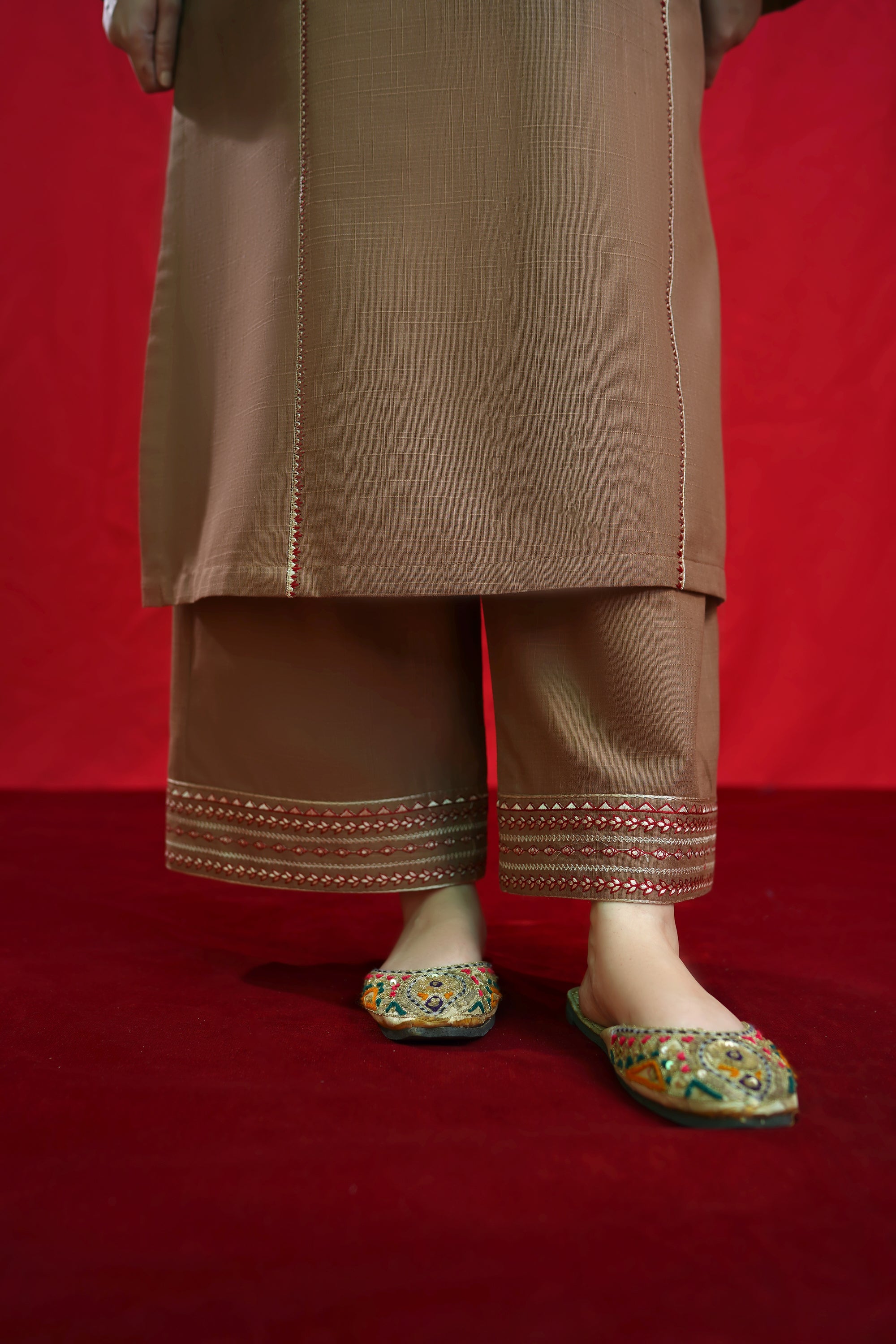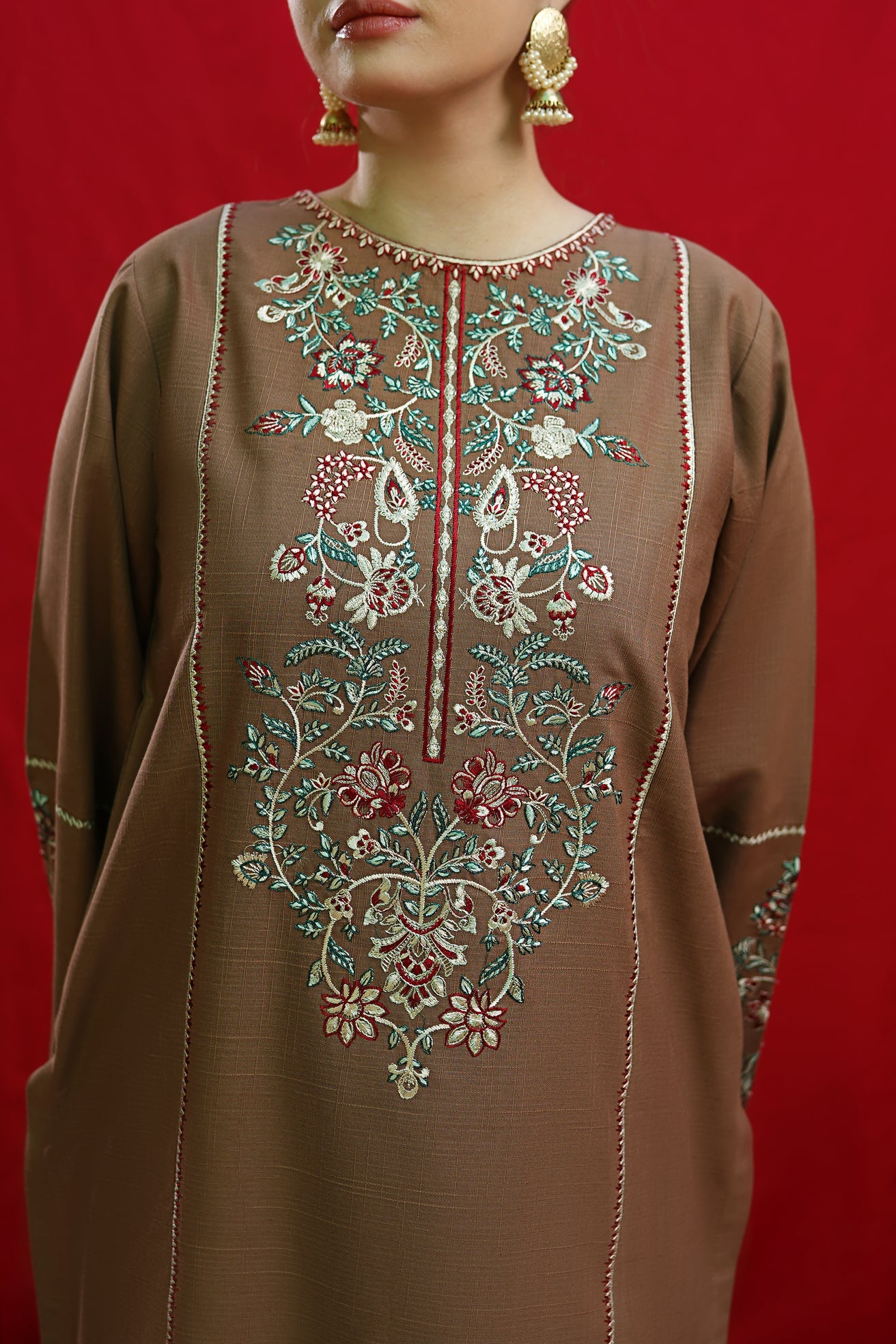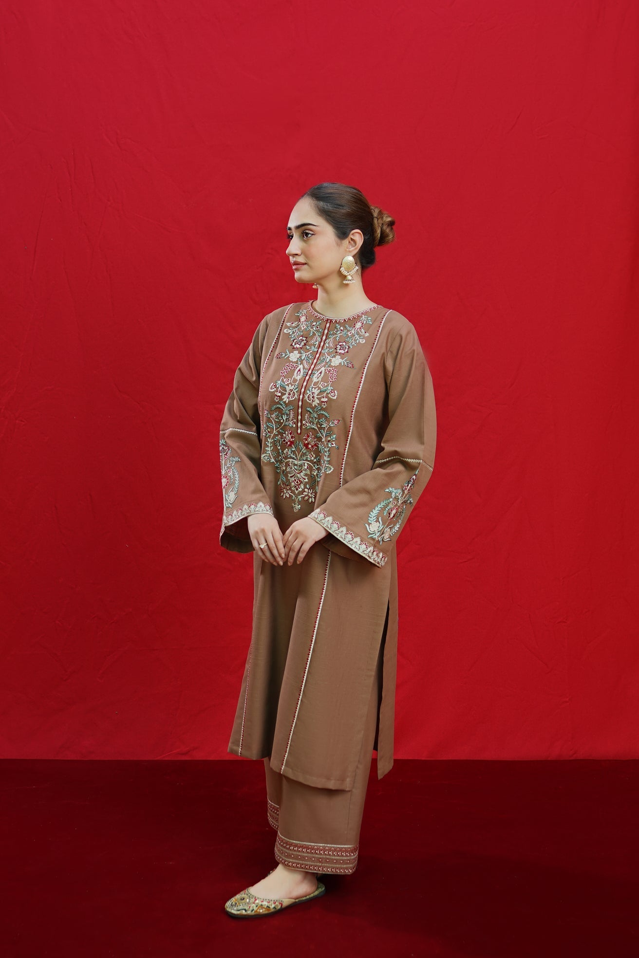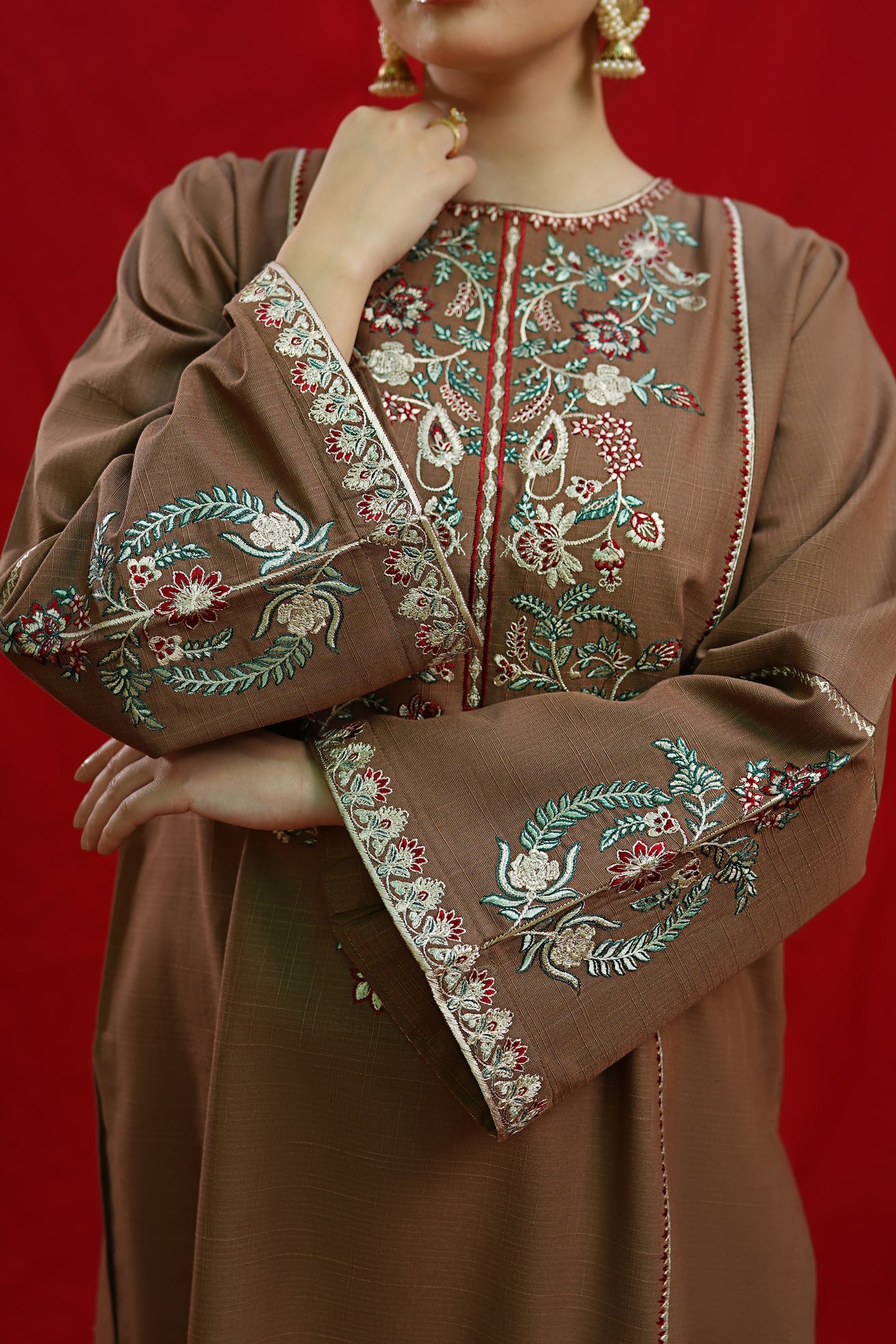 Elevate your style with ELYNOR, a stunning ready-to-wear 2pc khaddar suit. Featuring delicate floral embroidery on the neckline and sleeves, paired with loose embroidered trousers for a complete look. Perfect for any occasion.