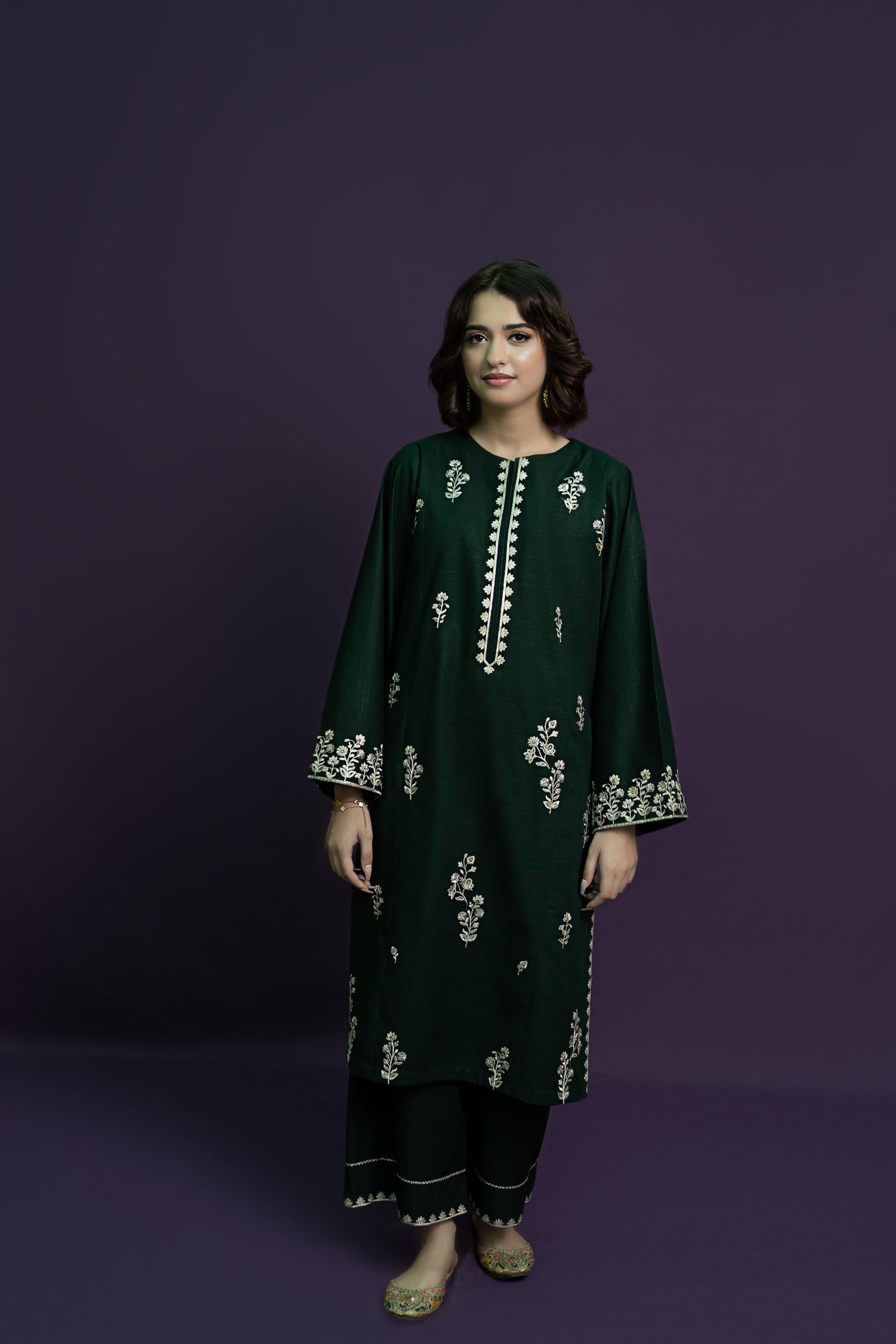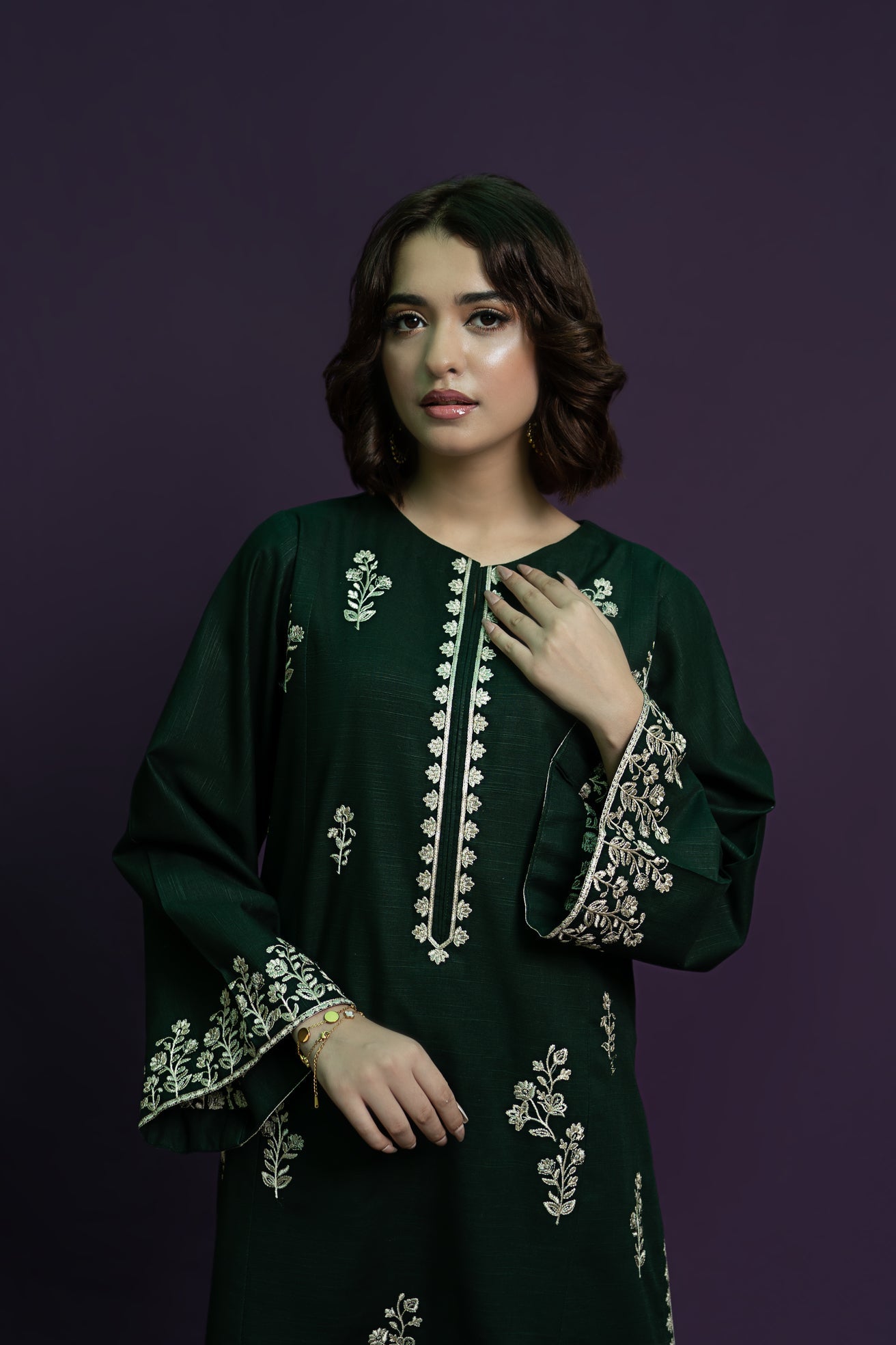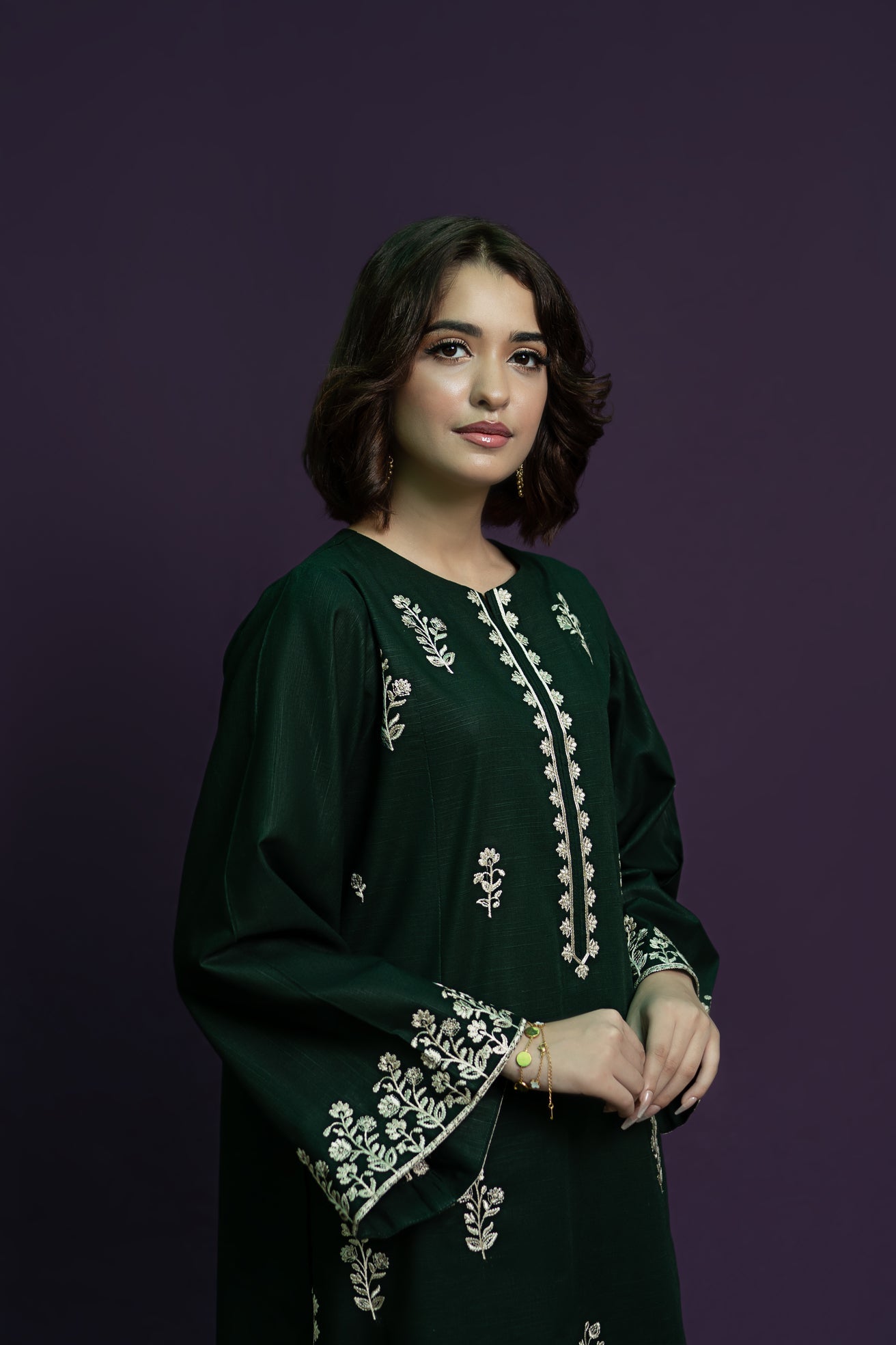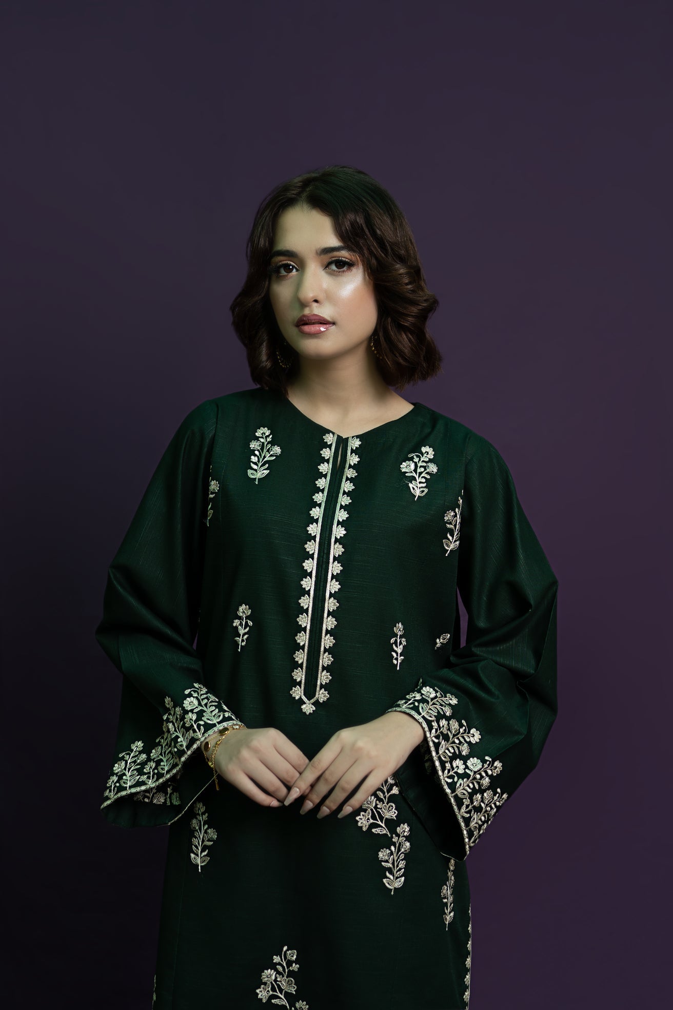 Elevate your wardrobe with HAYAT - the perfect 2pc embroidered suit. Flaunt the beautiful floral motif embroidery on the shirt front and sleeves border. Complete the look with embroidered loose trousers. Ready to wear, so you can effortlessly stand out with style.