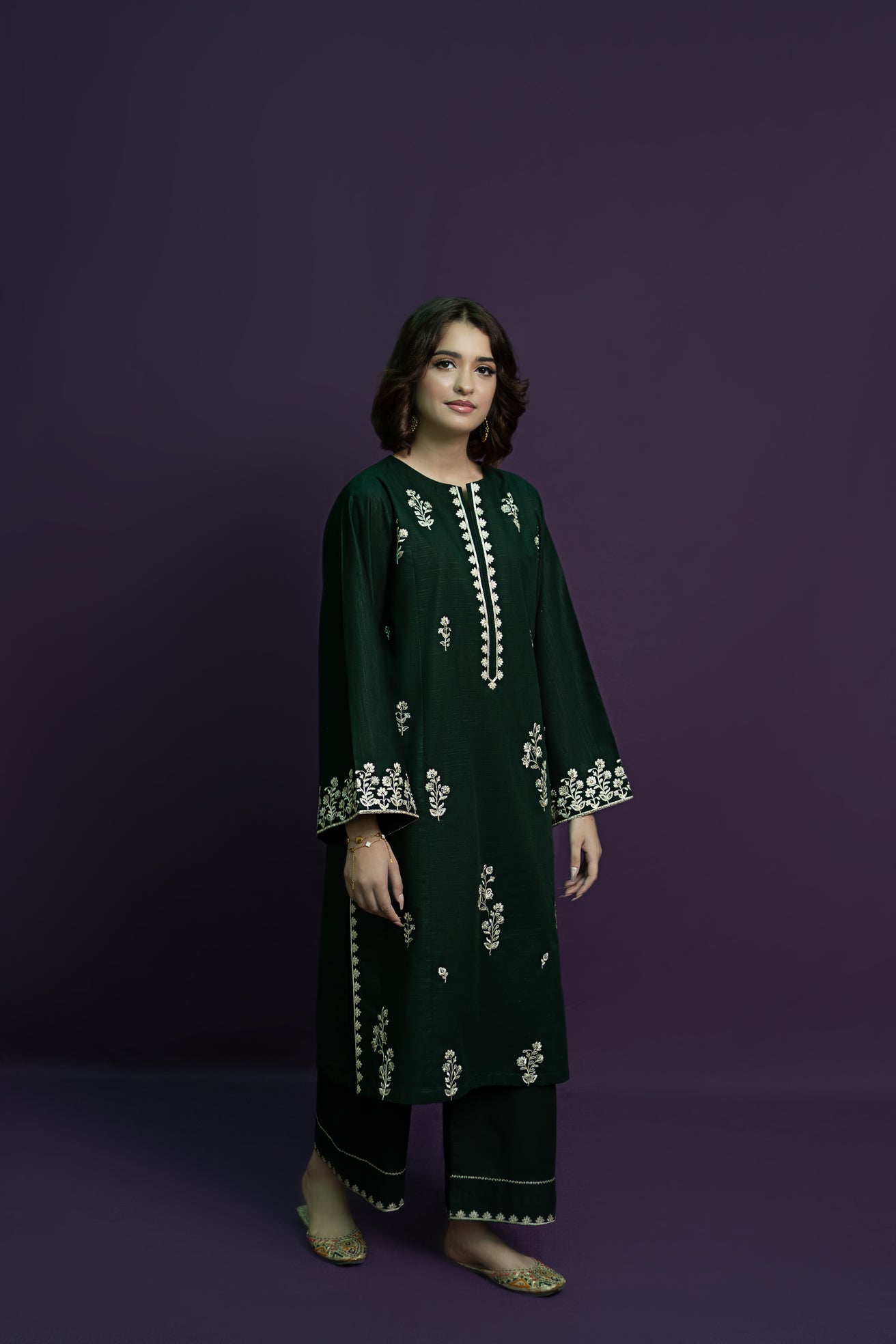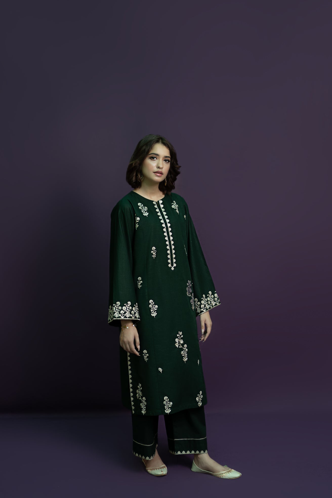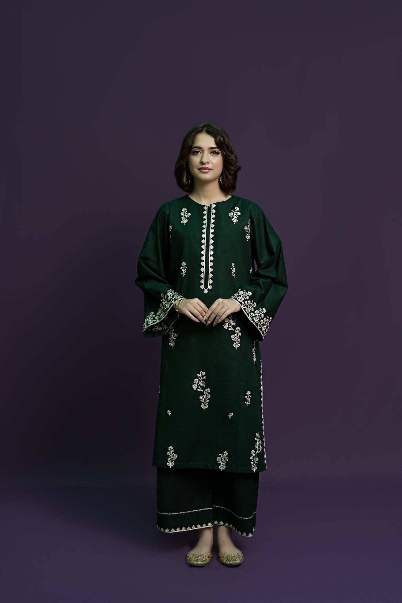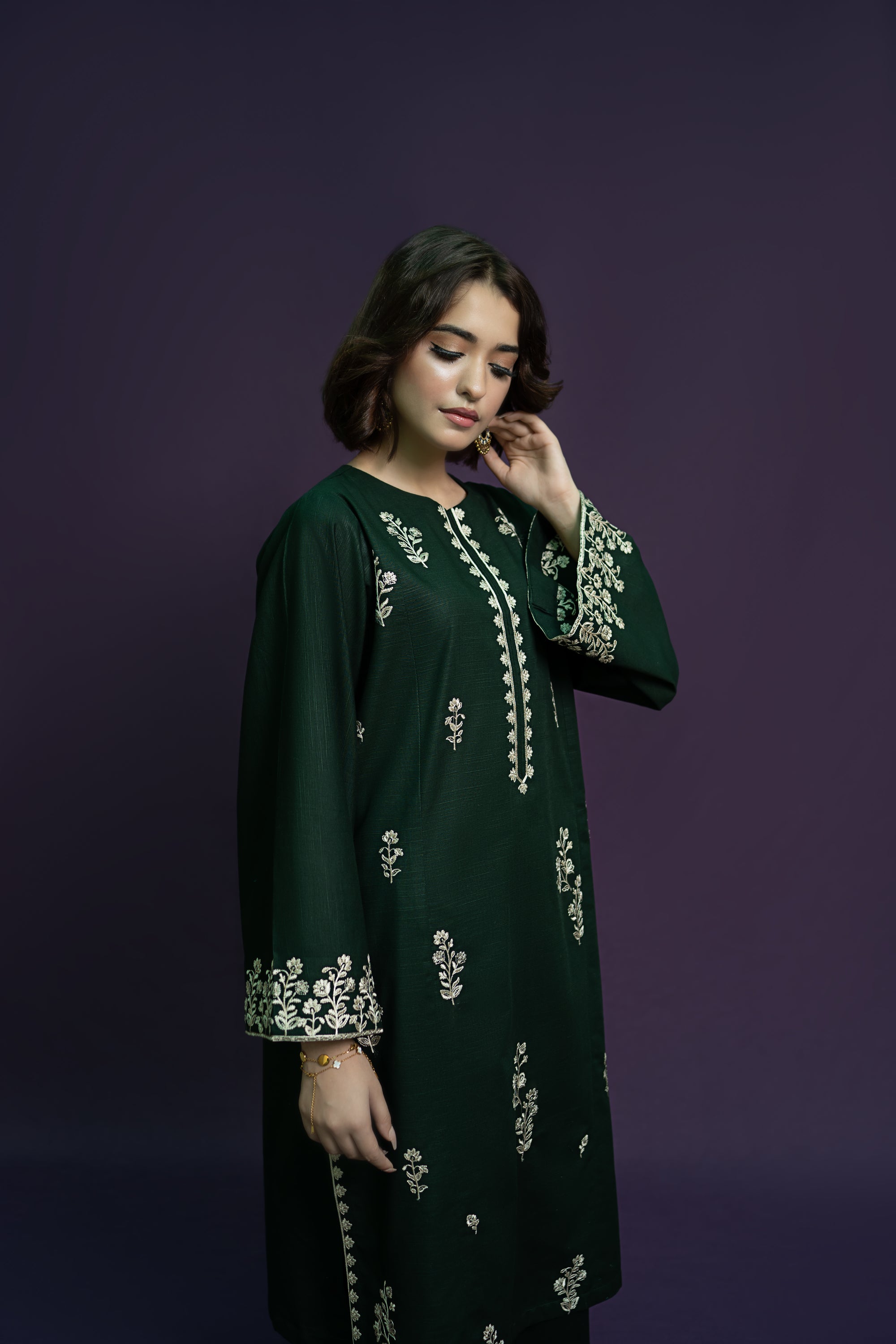 Elevate your wardrobe with HAYAT - the perfect 2pc embroidered suit. Flaunt the beautiful floral motif embroidery on the shirt front and sleeves border. Complete the look with embroidered loose trousers. Ready to wear, so you can effortlessly stand out with style.