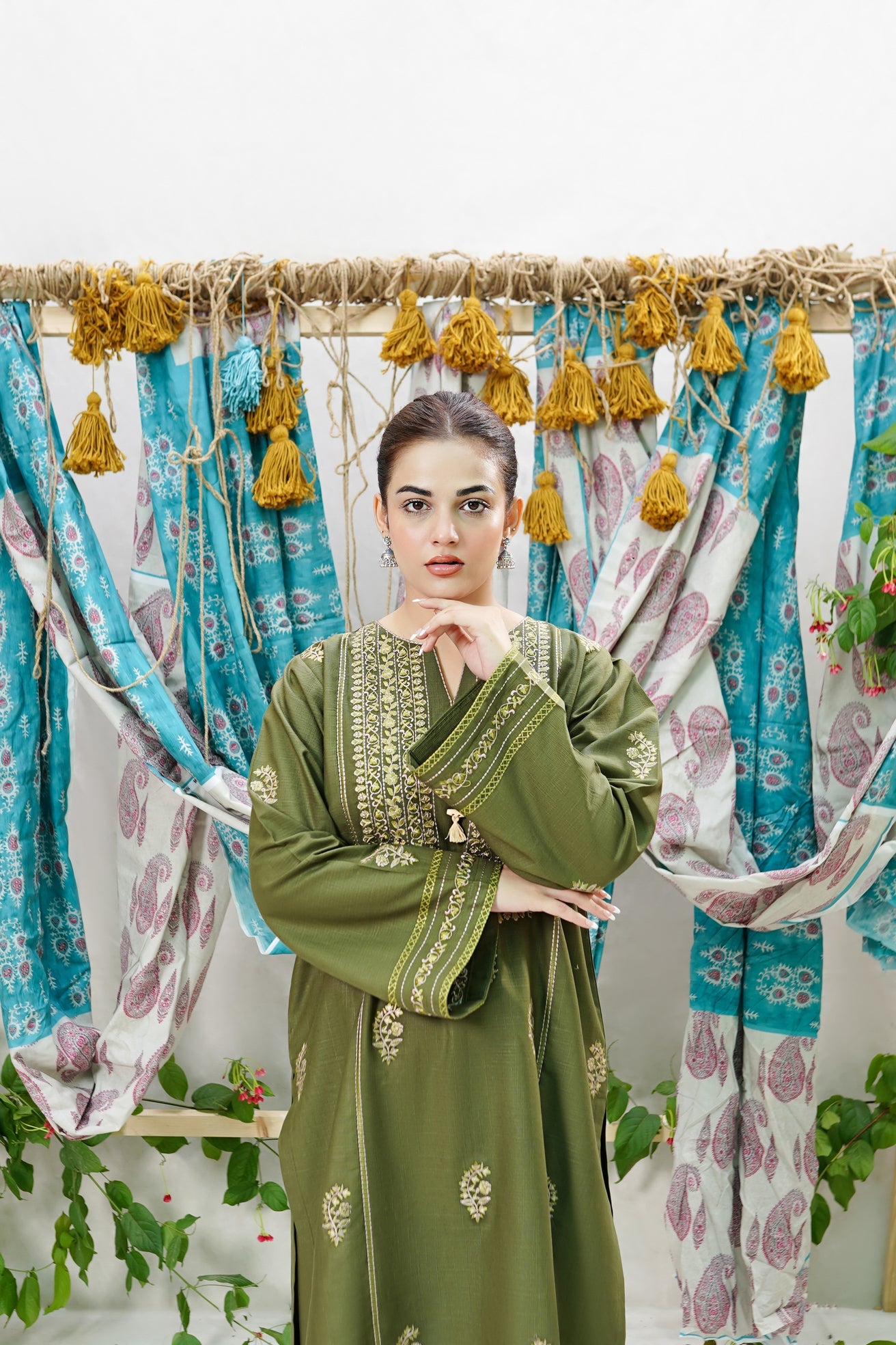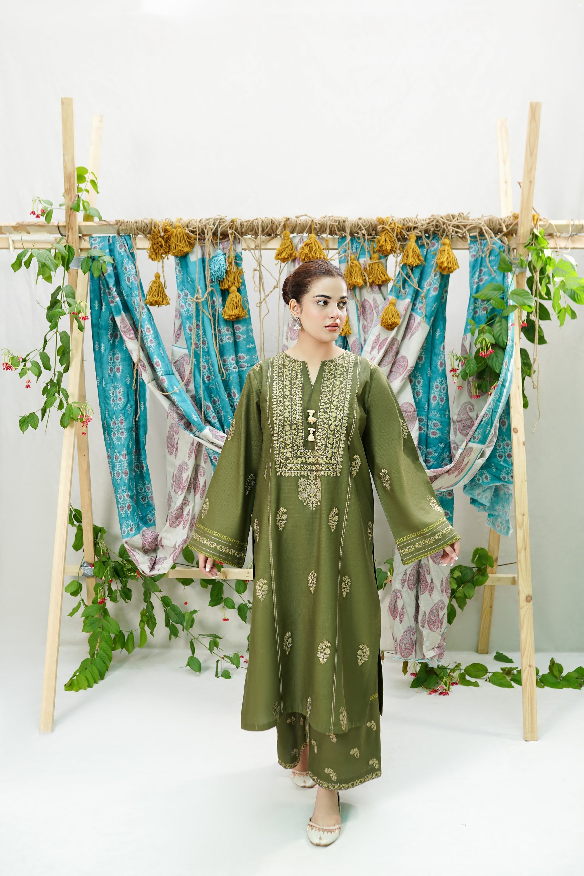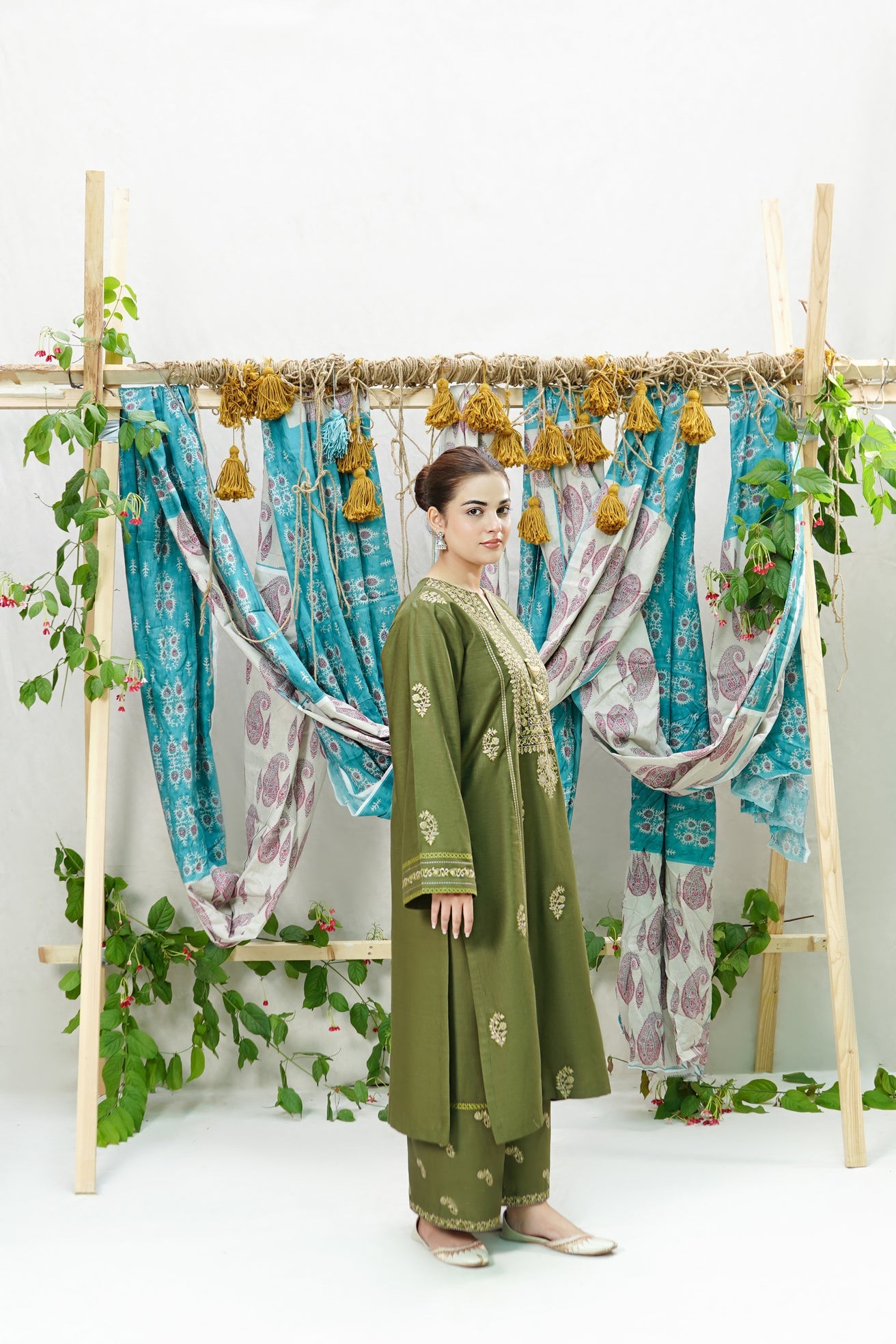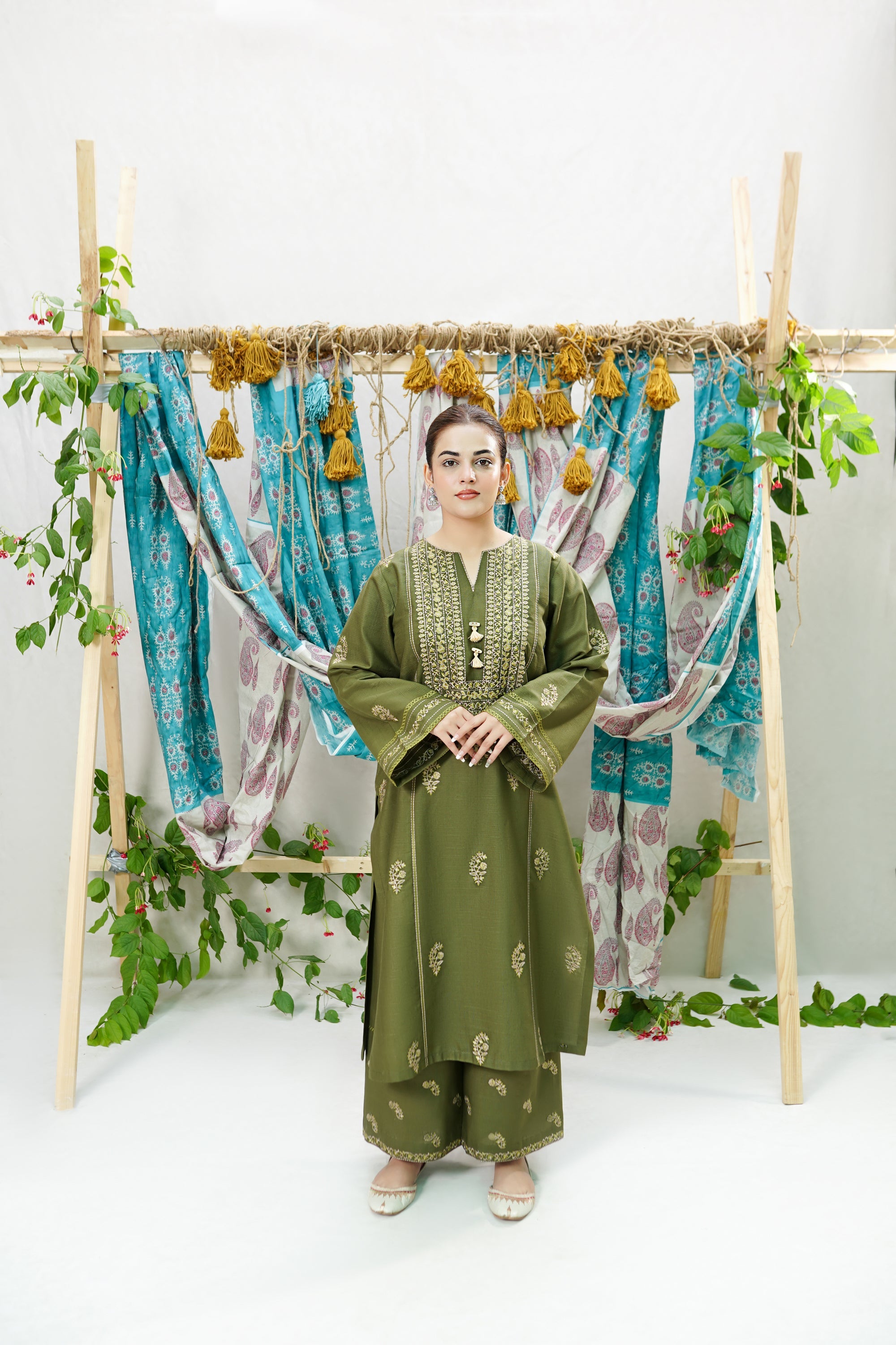 KIARA is a 2-piece khaddar suit that is ready to wear and perfect for any occasion. The intricately embroidered shirt features a beautiful neckline and a spray of embroidery motifs on the front, while the loose sleeves add a touch of elegance. Paired with embroidered trousers, this suit is a versatile and stylish addition to any wardrobe.