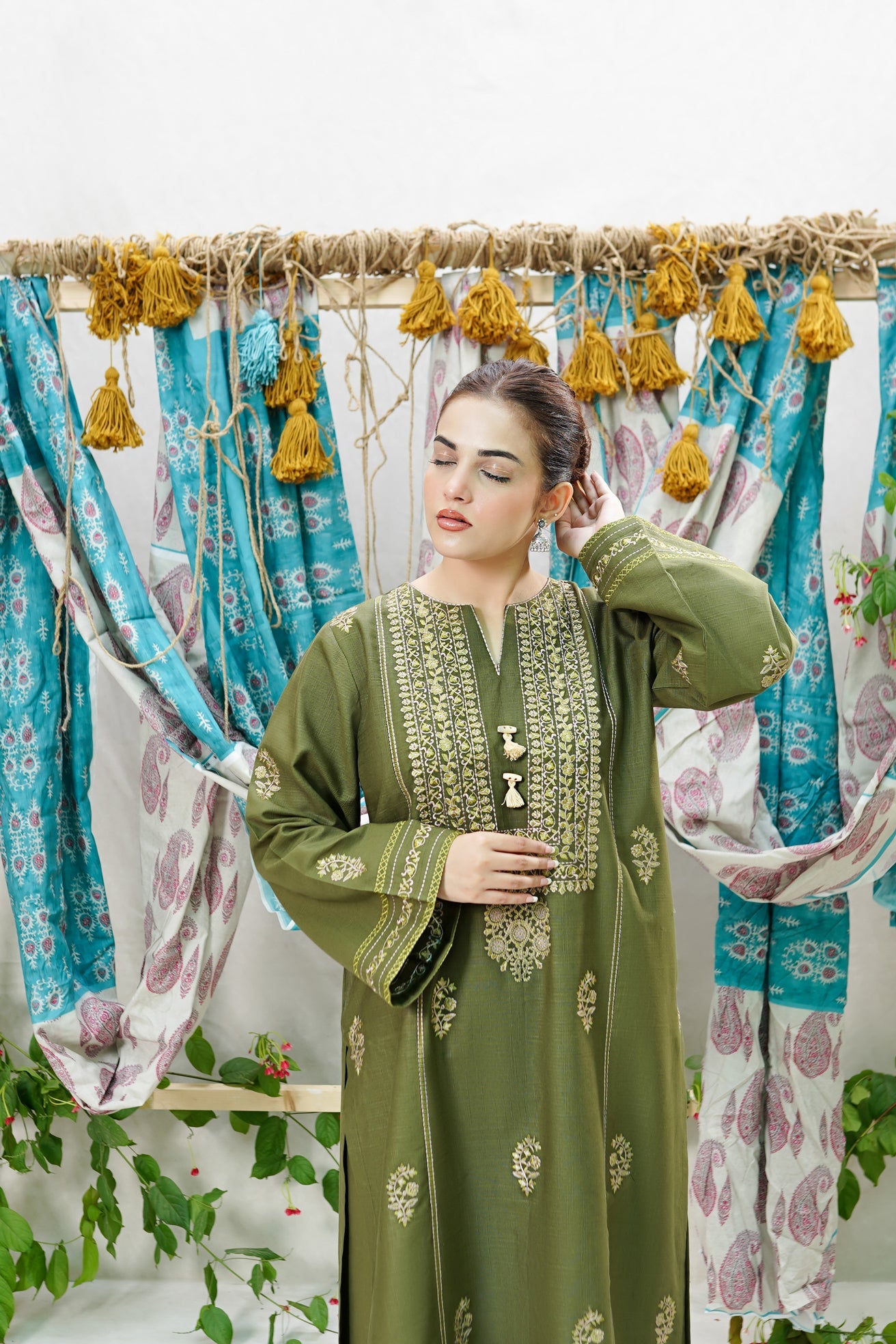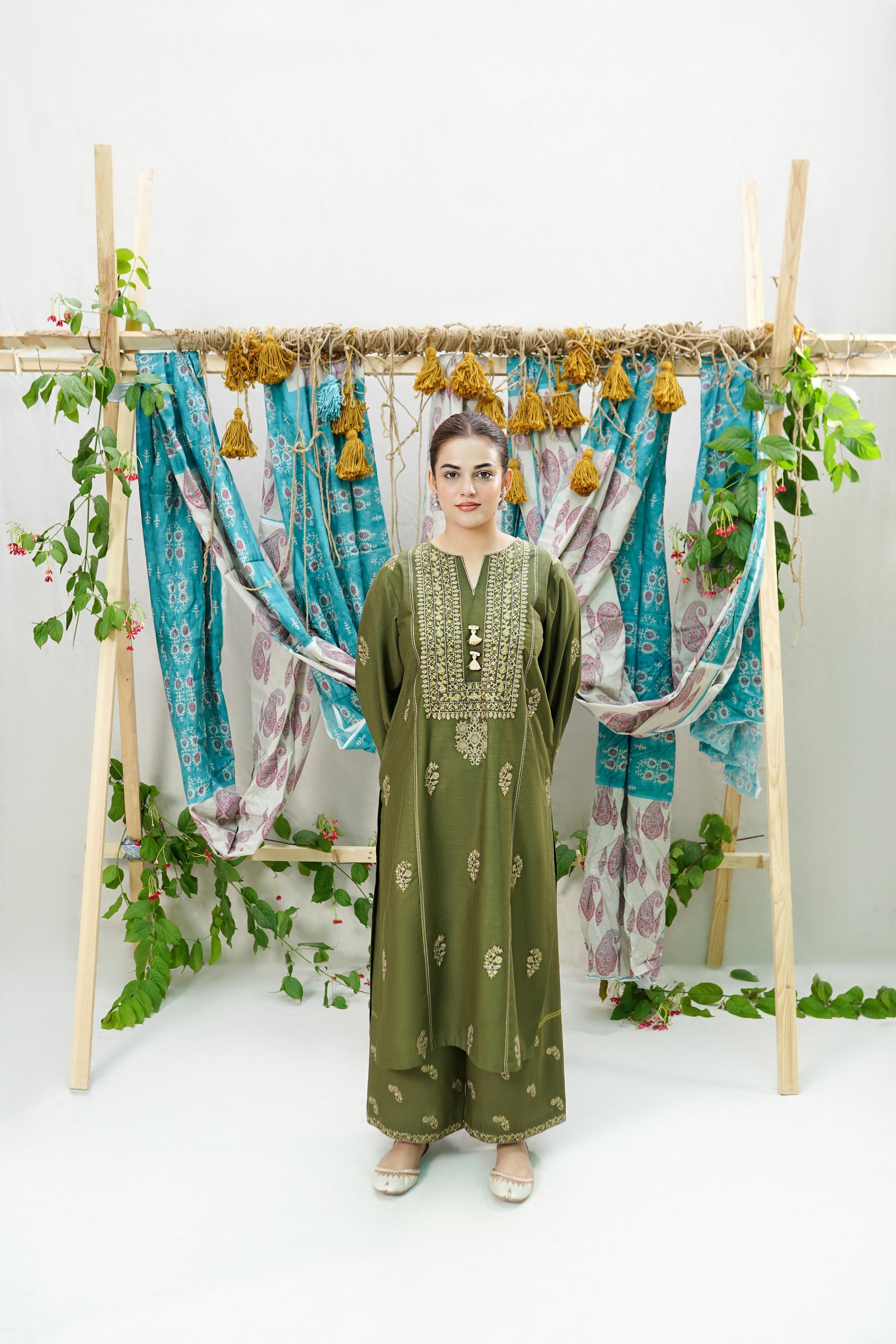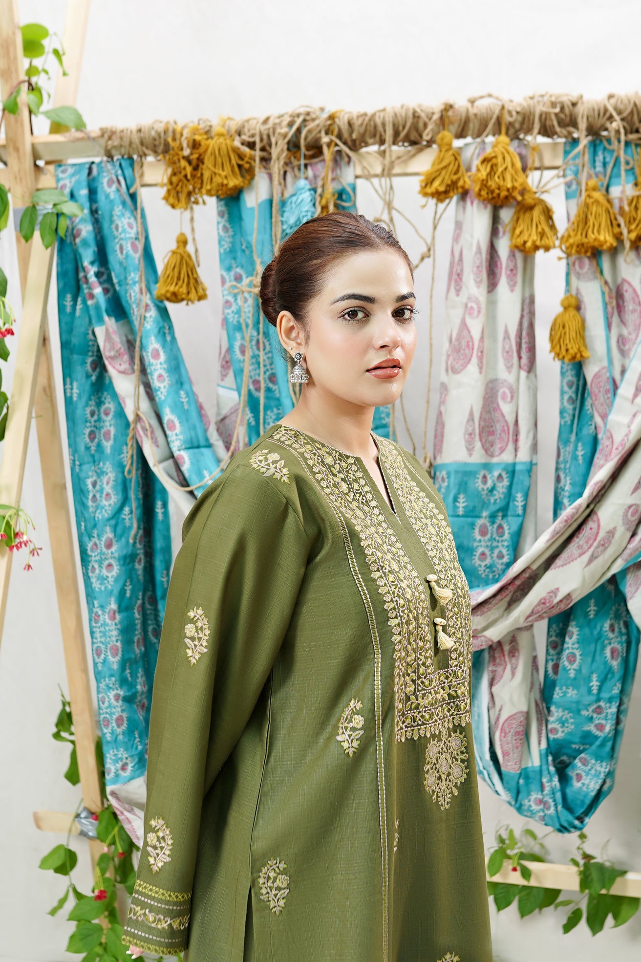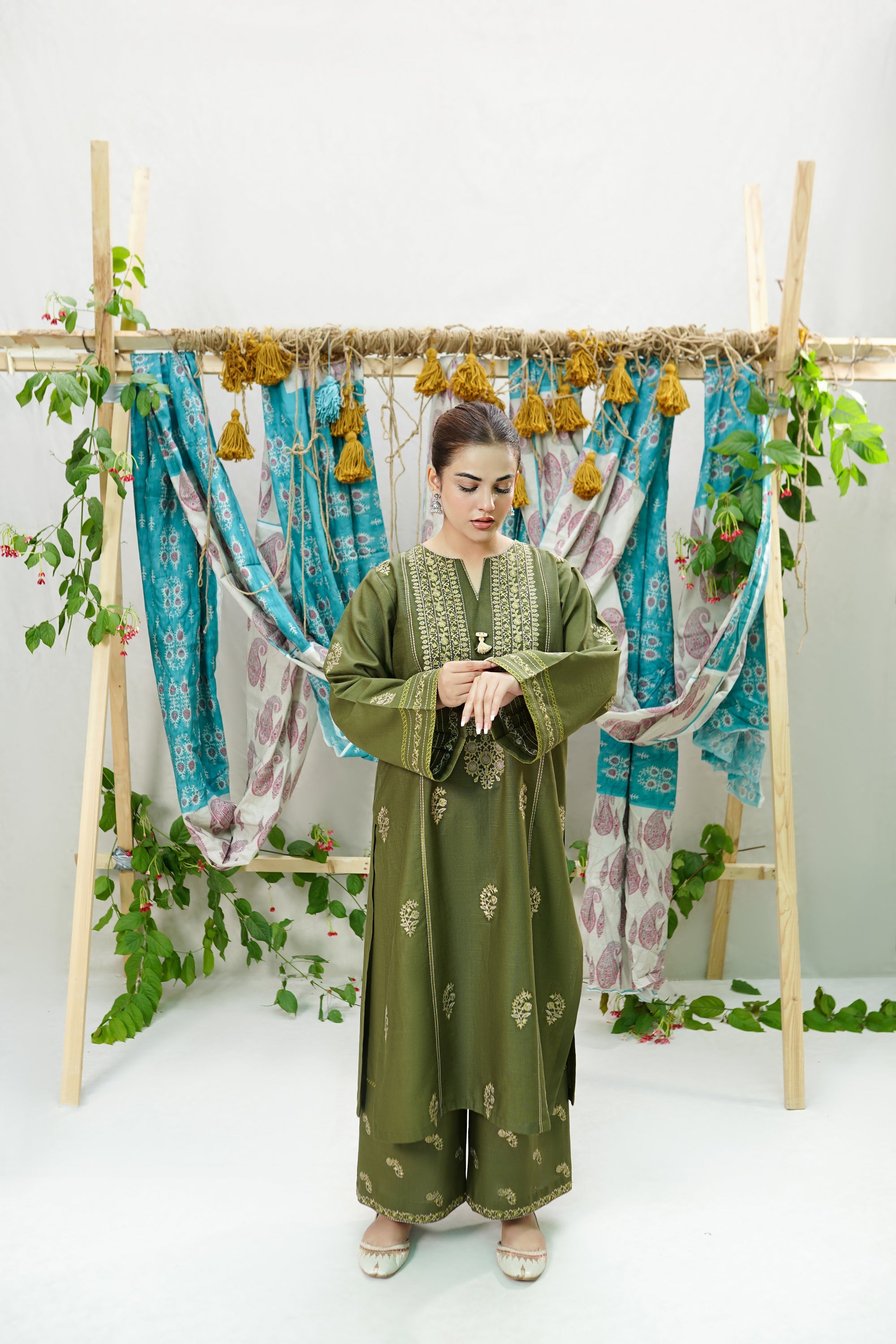 KIARA is a 2-piece khaddar suit that is ready to wear and perfect for any occasion. The intricately embroidered shirt features a beautiful neckline and a spray of embroidery motifs on the front, while the loose sleeves add a touch of elegance. Paired with embroidered trousers, this suit is a versatile and stylish addition to any wardrobe.
