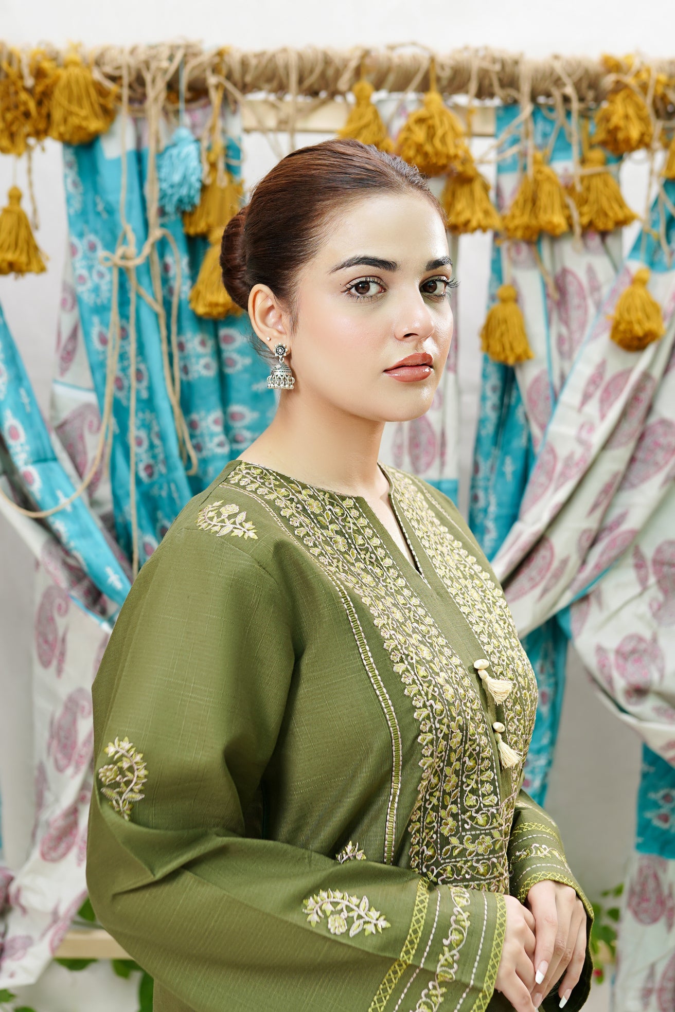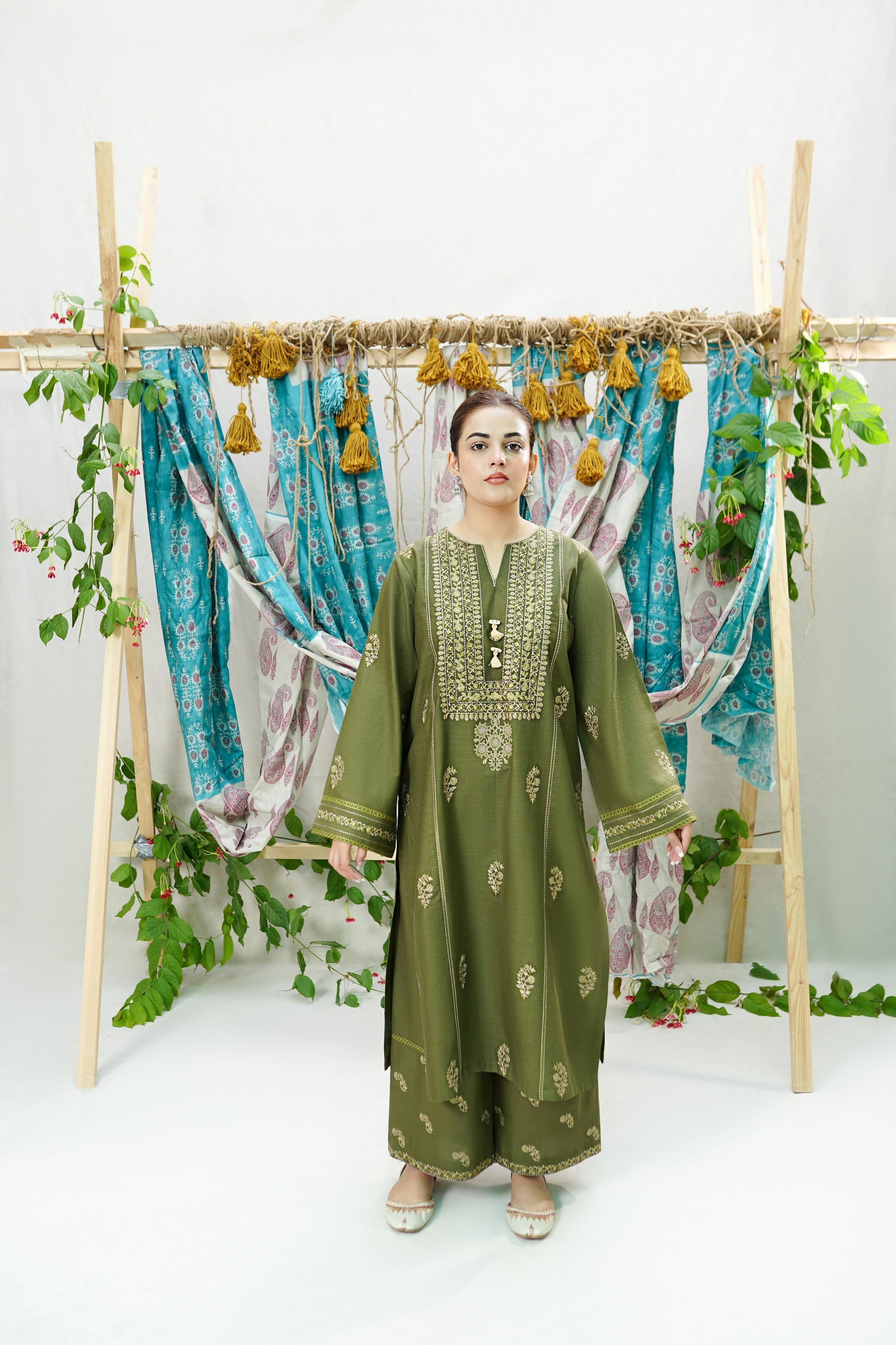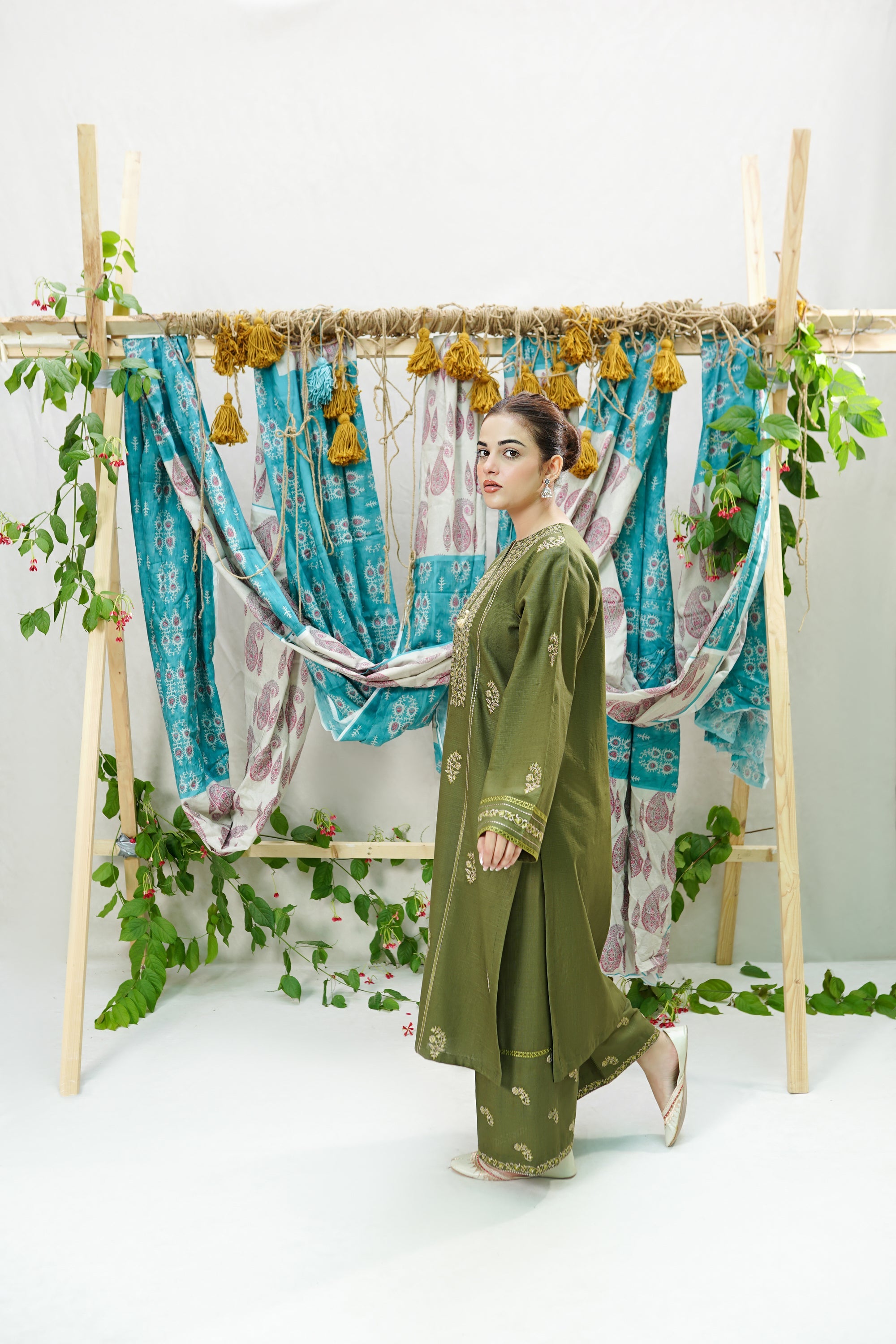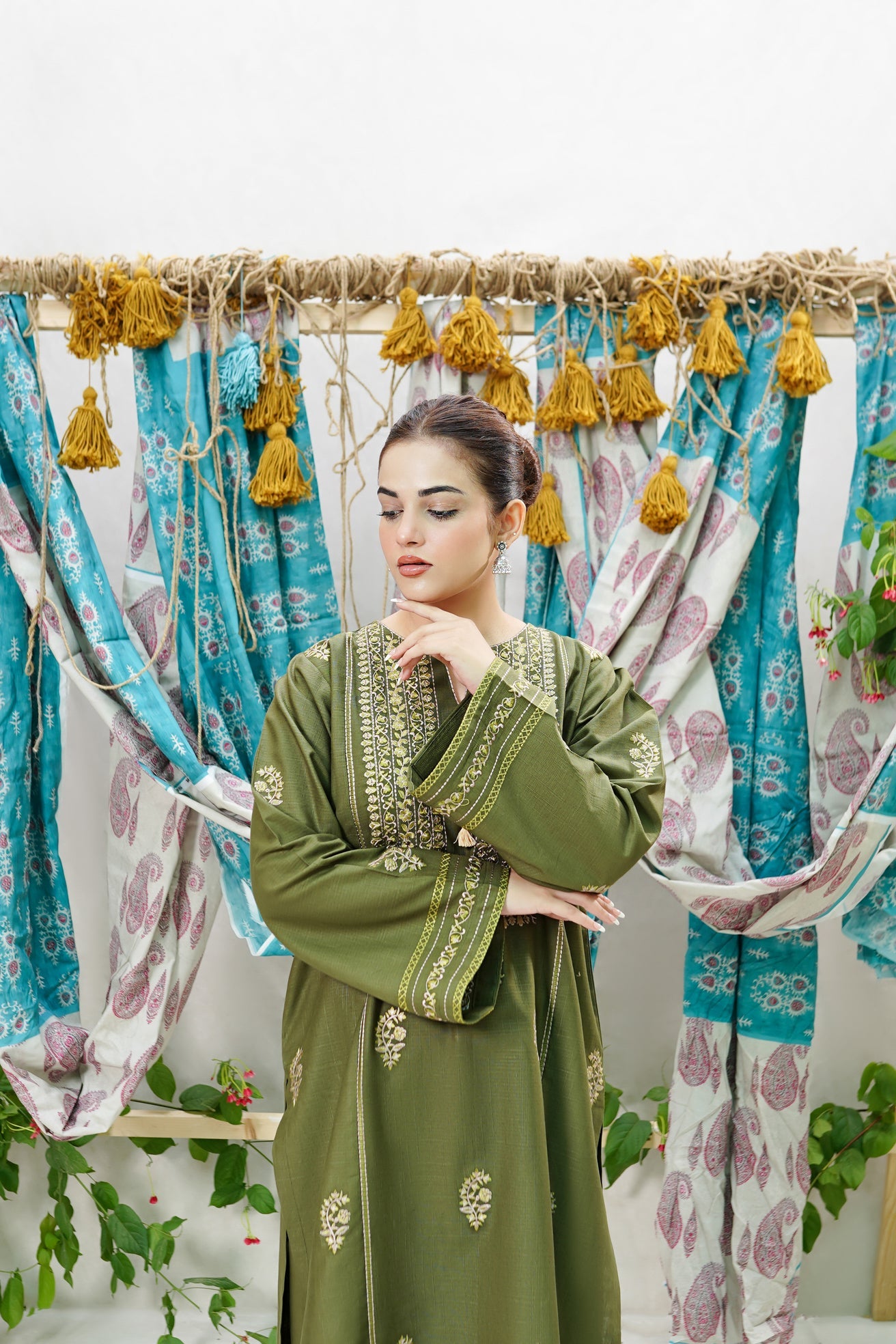 KIARA is a 2-piece khaddar suit that is ready to wear and perfect for any occasion. The intricately embroidered shirt features a beautiful neckline and a spray of embroidery motifs on the front, while the loose sleeves add a touch of elegance. Paired with embroidered trousers, this suit is a versatile and stylish addition to any wardrobe.