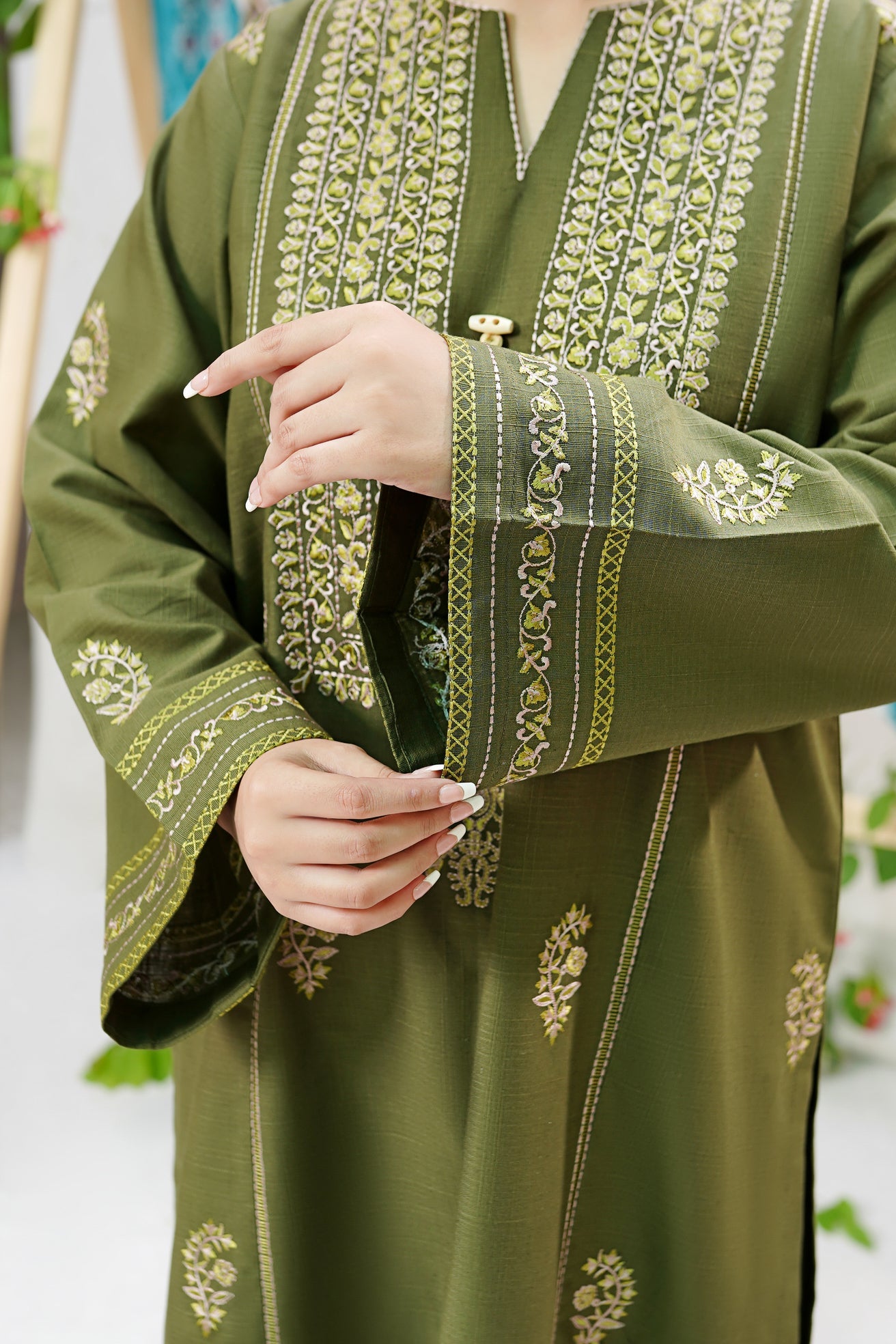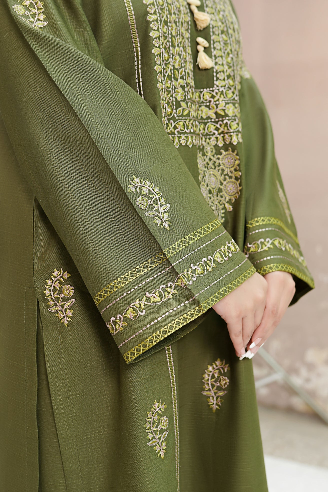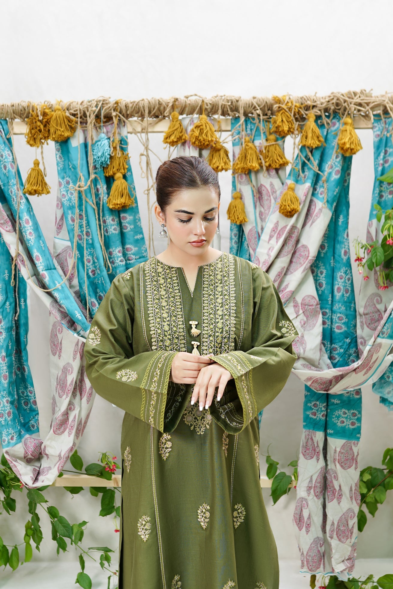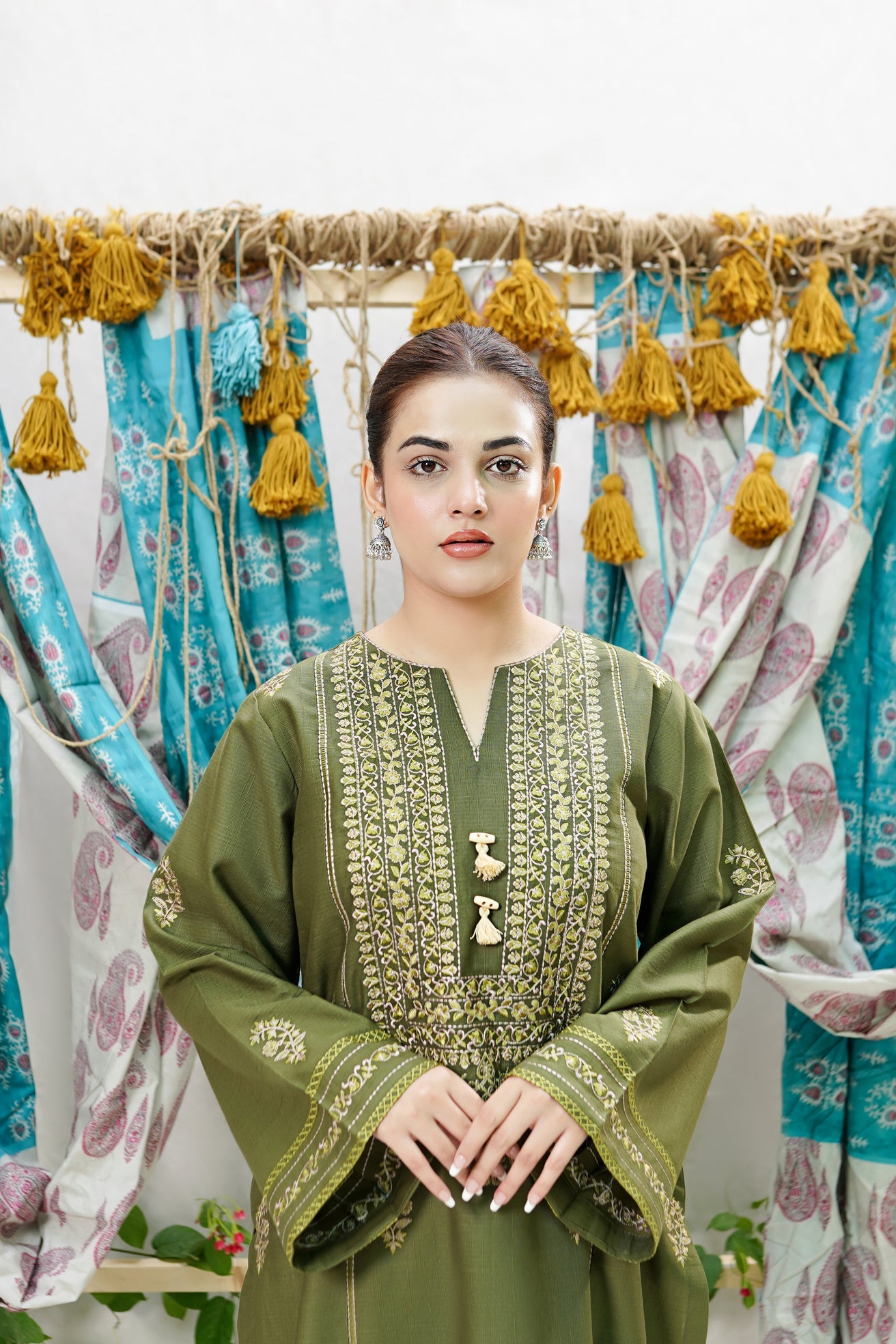 KIARA is a 2-piece khaddar suit that is ready to wear and perfect for any occasion. The intricately embroidered shirt features a beautiful neckline and a spray of embroidery motifs on the front, while the loose sleeves add a touch of elegance. Paired with embroidered trousers, this suit is a versatile and stylish addition to any wardrobe.