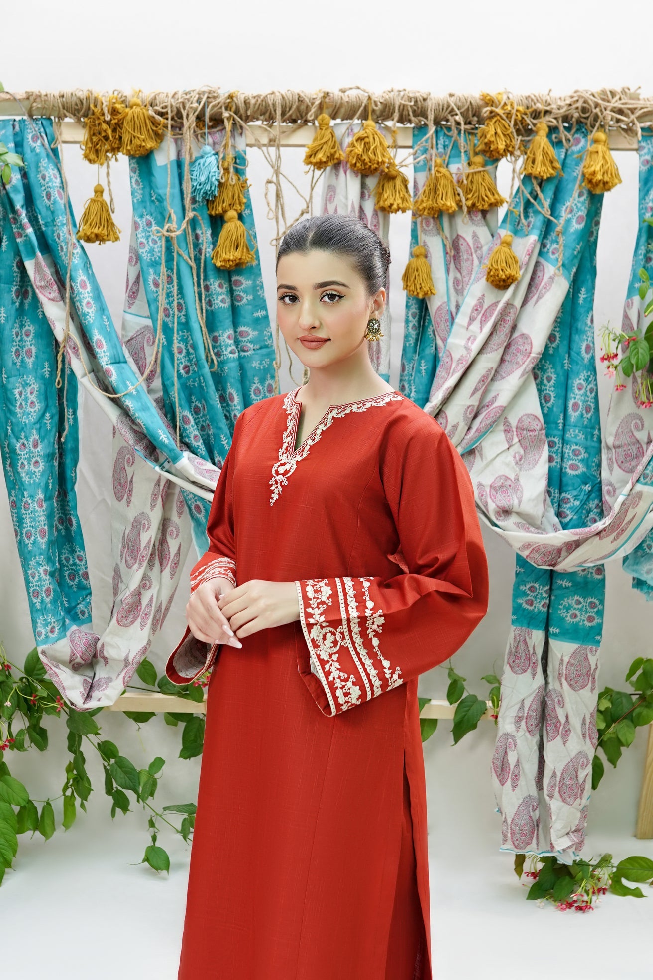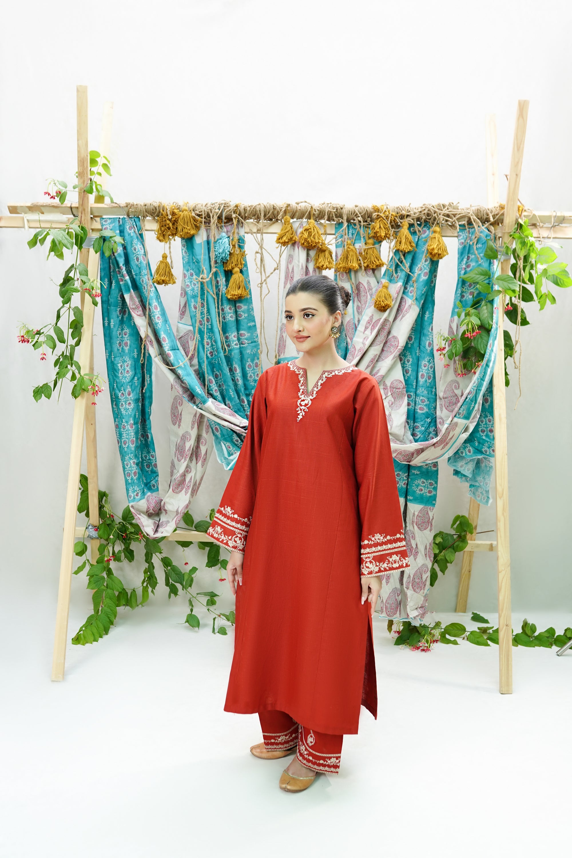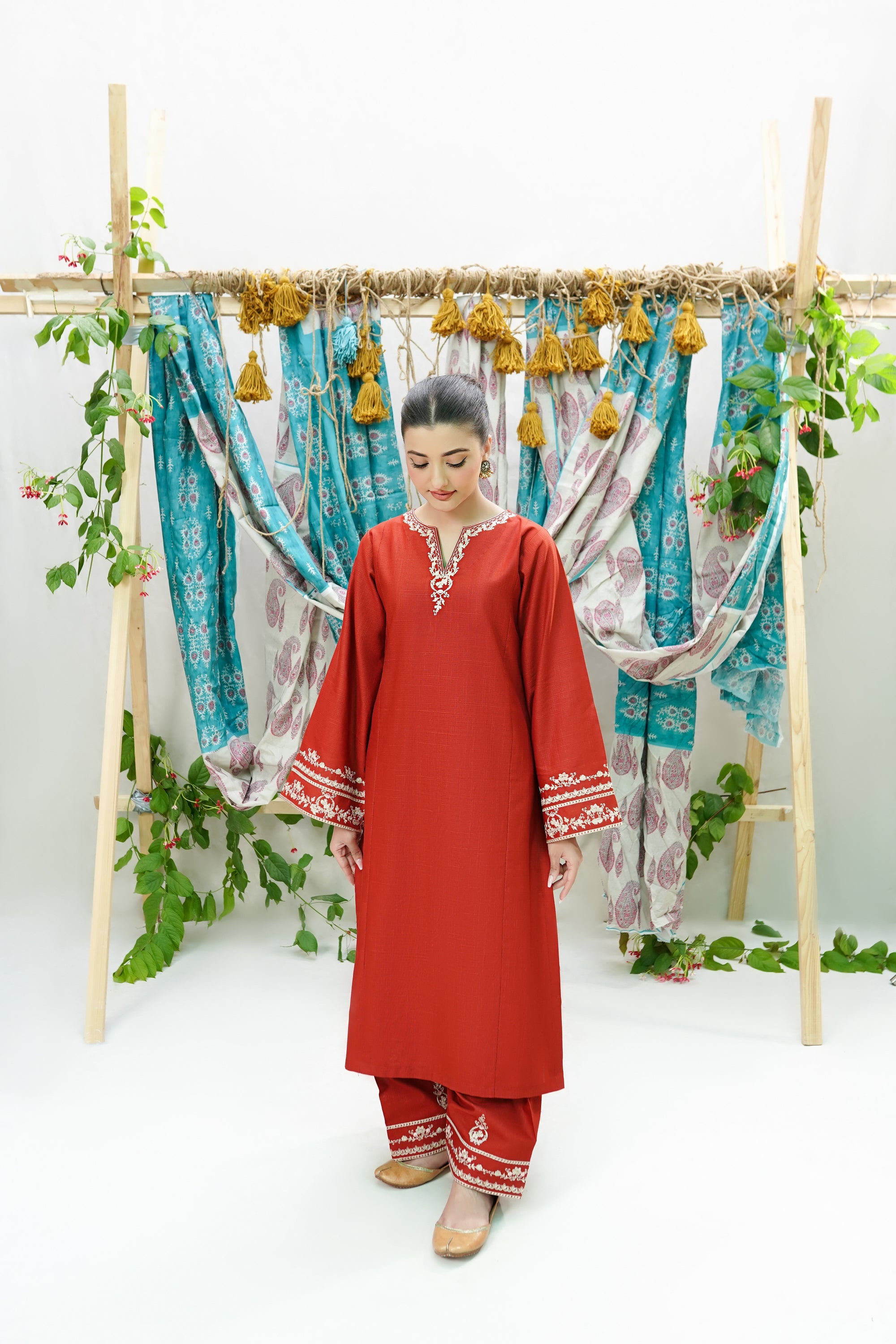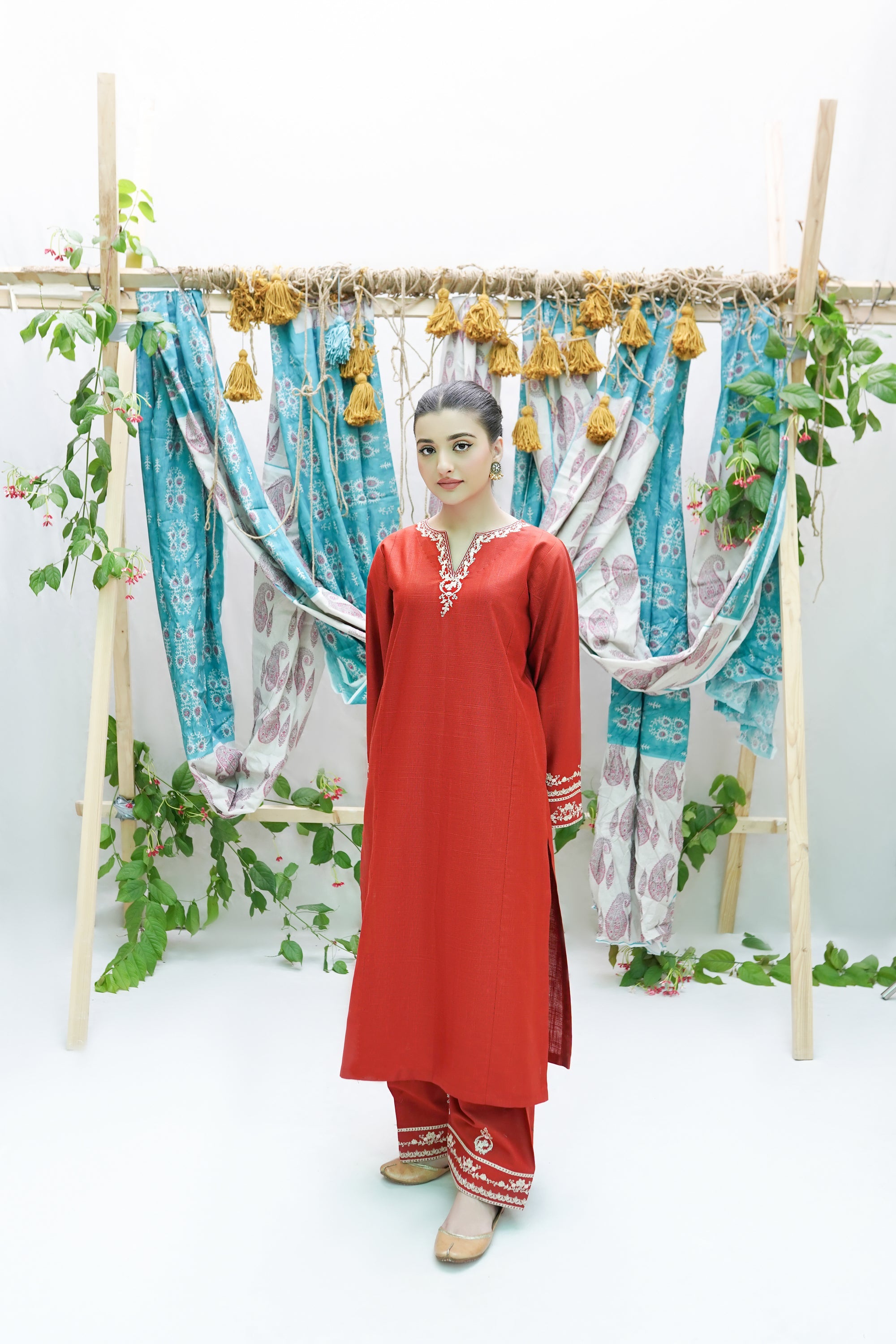 Effortlessly stylish with RITZ's beautiful embroidery! This 2 PC khaddar suit is ready to wear, featuring intricate detailing on the neckline and loose sleeves. The embroidered shalwar completes the elegant ensemble. Perfect for any occasion, feel confident and sophisticated in RITZ.