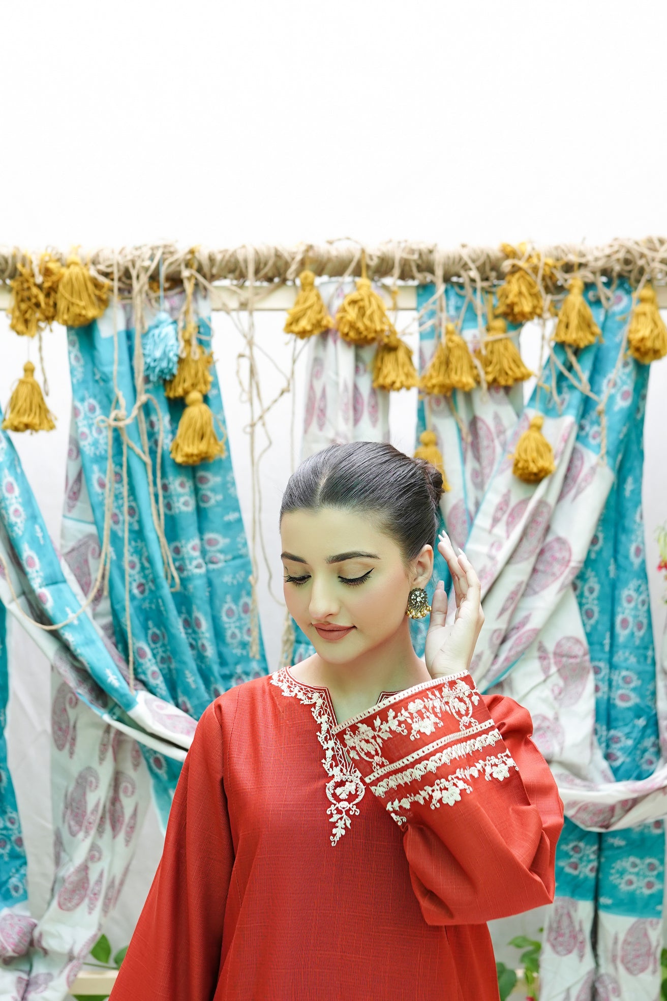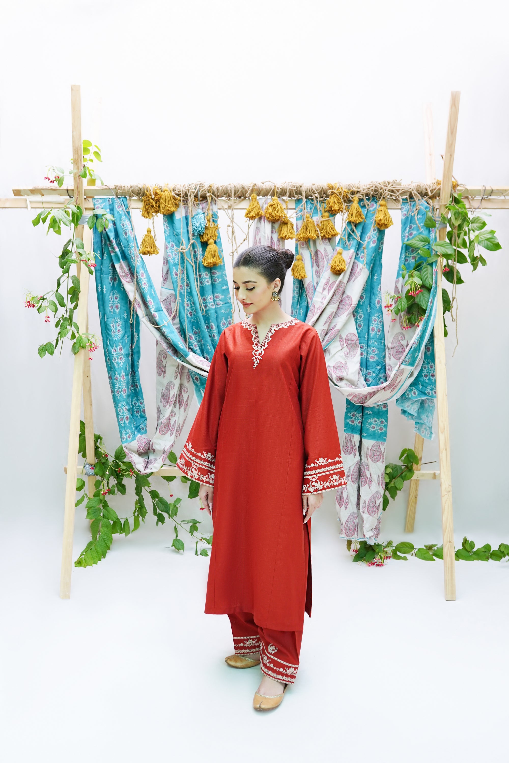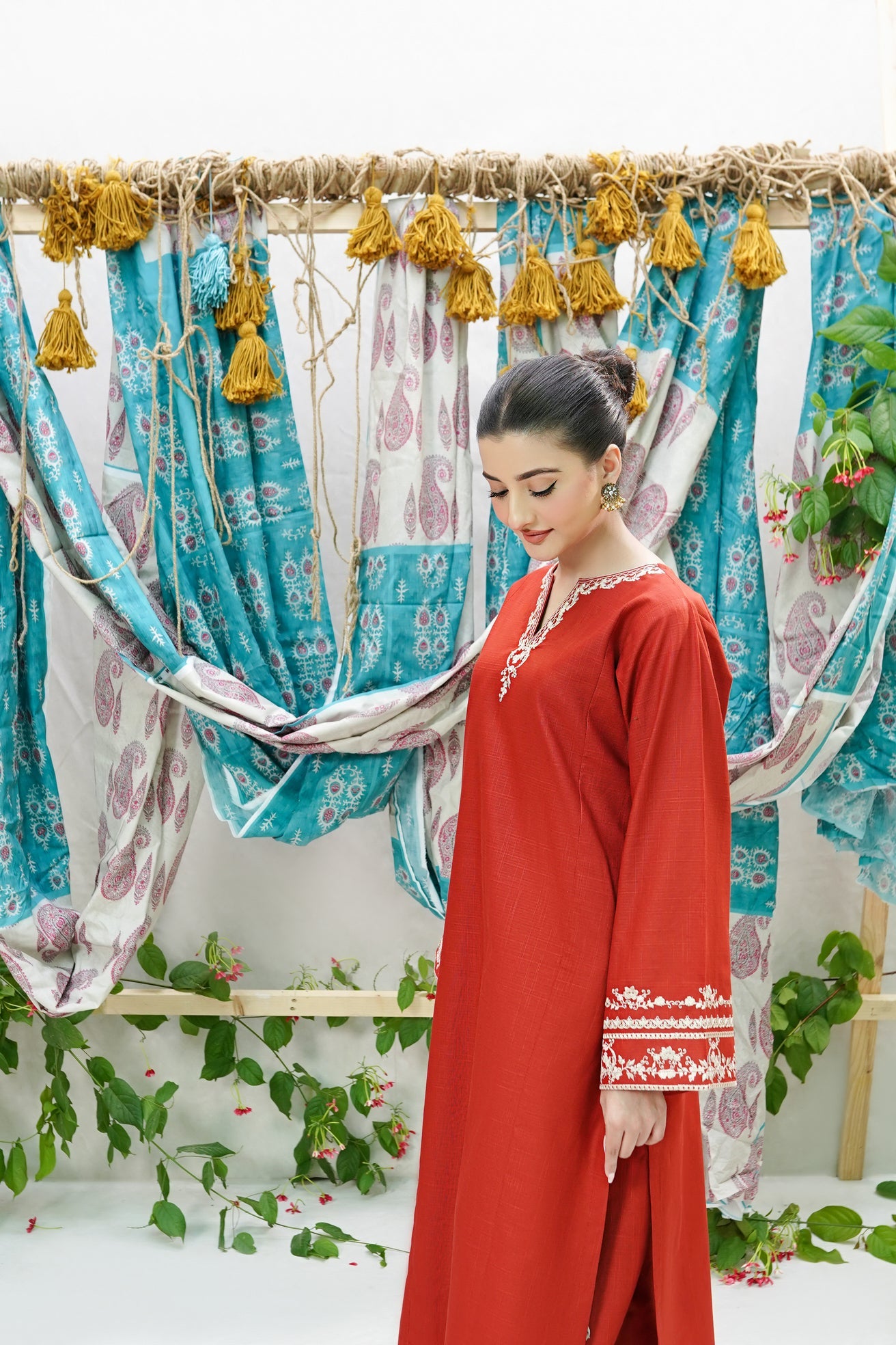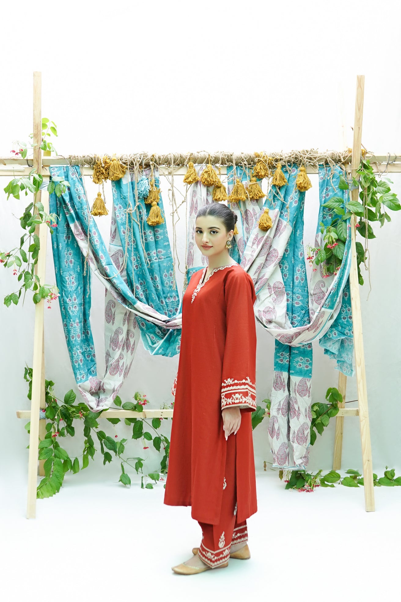 Effortlessly stylish with RITZ's beautiful embroidery! This 2 PC khaddar suit is ready to wear, featuring intricate detailing on the neckline and loose sleeves. The embroidered shalwar completes the elegant ensemble. Perfect for any occasion, feel confident and sophisticated in RITZ.