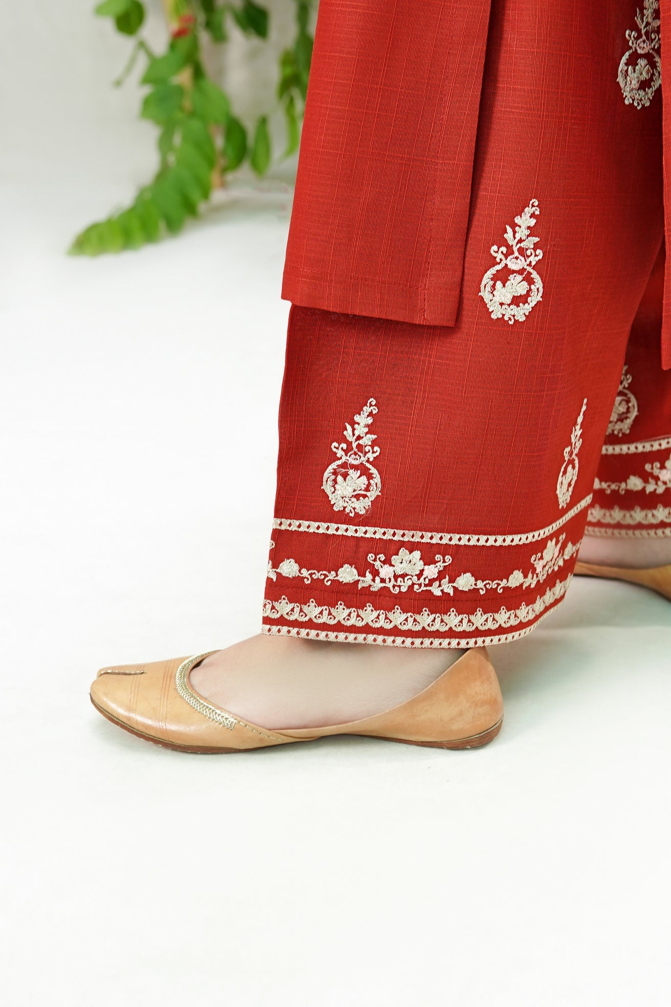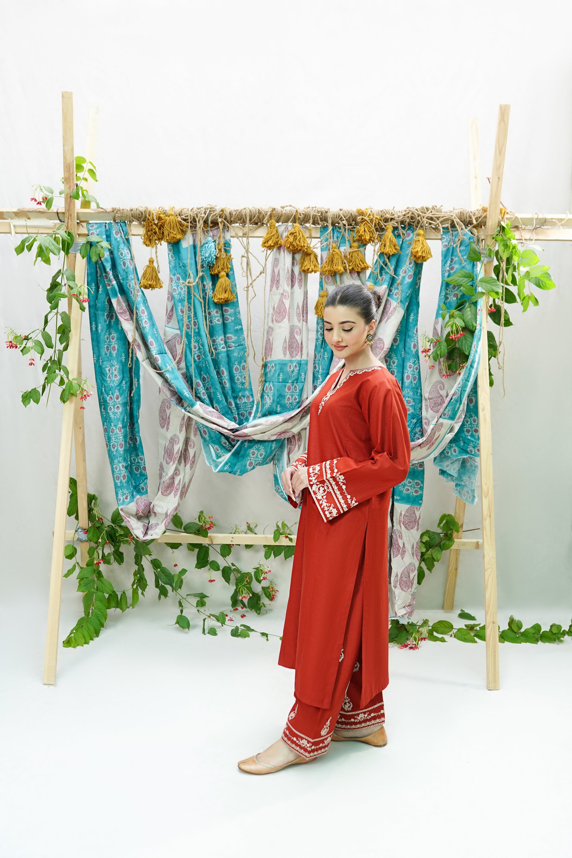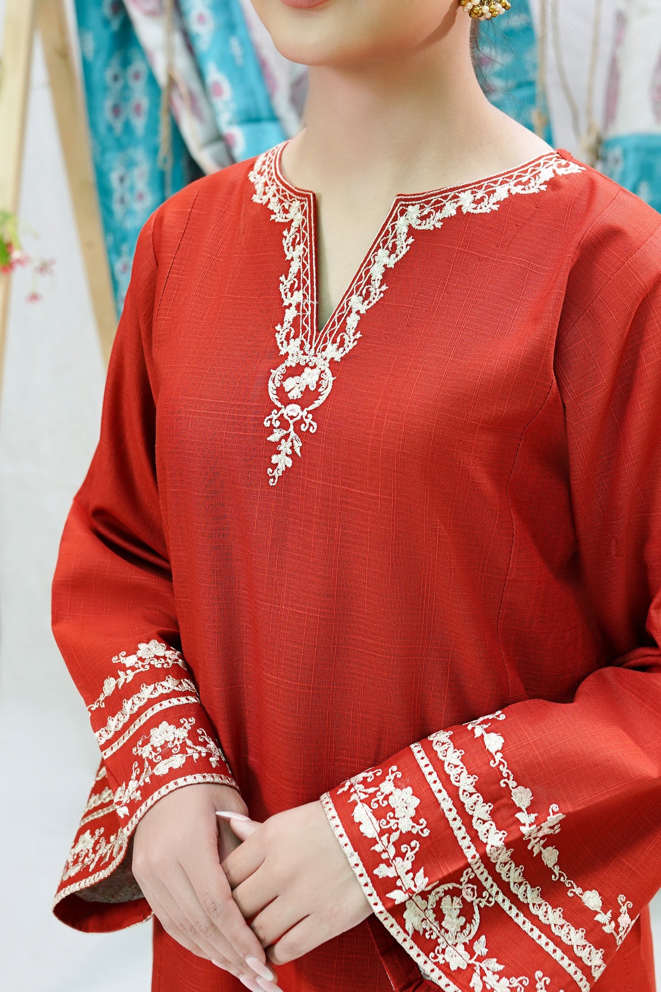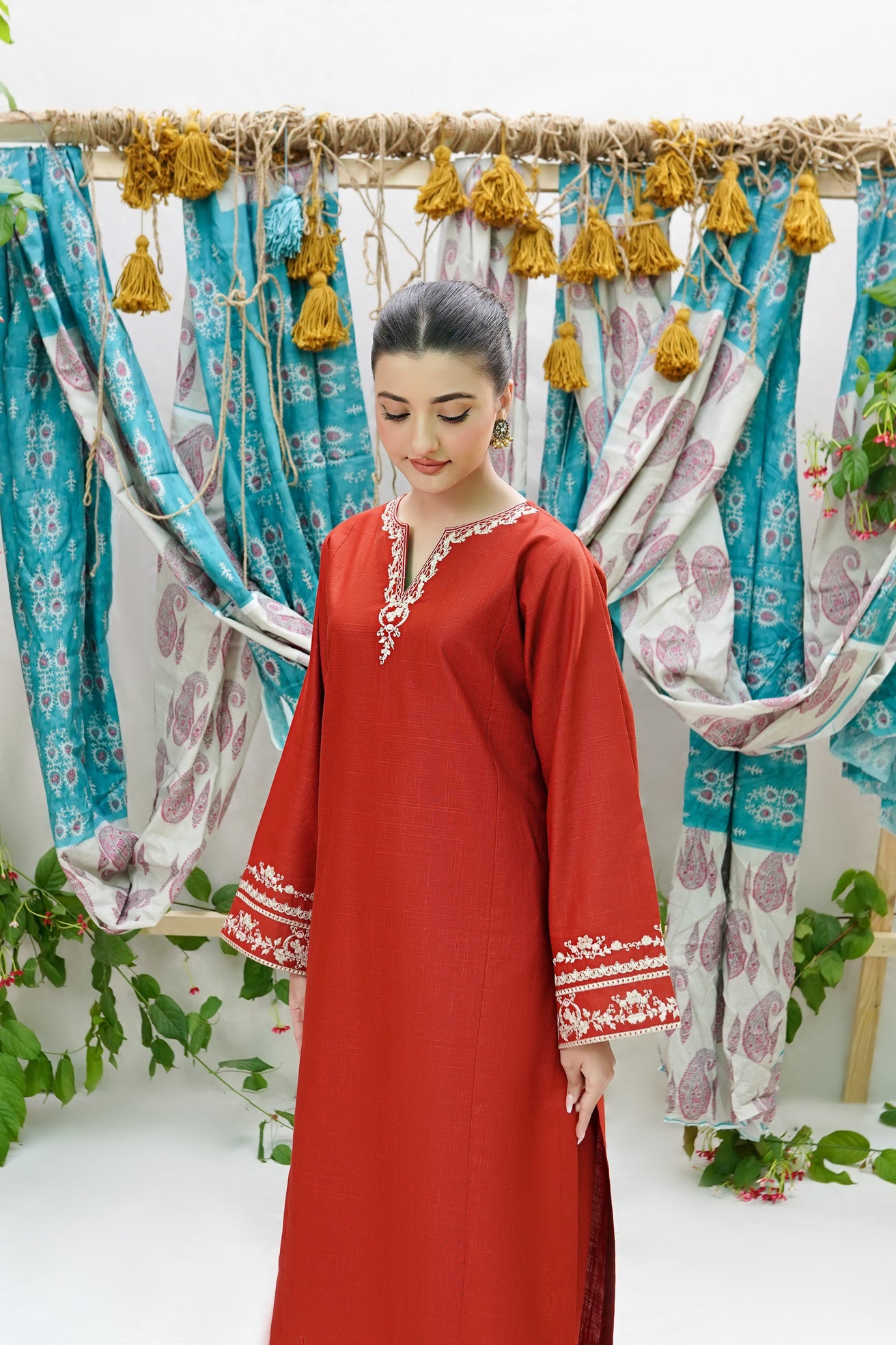 Effortlessly stylish with RITZ's beautiful embroidery! This 2 PC khaddar suit is ready to wear, featuring intricate detailing on the neckline and loose sleeves. The embroidered shalwar completes the elegant ensemble. Perfect for any occasion, feel confident and sophisticated in RITZ.