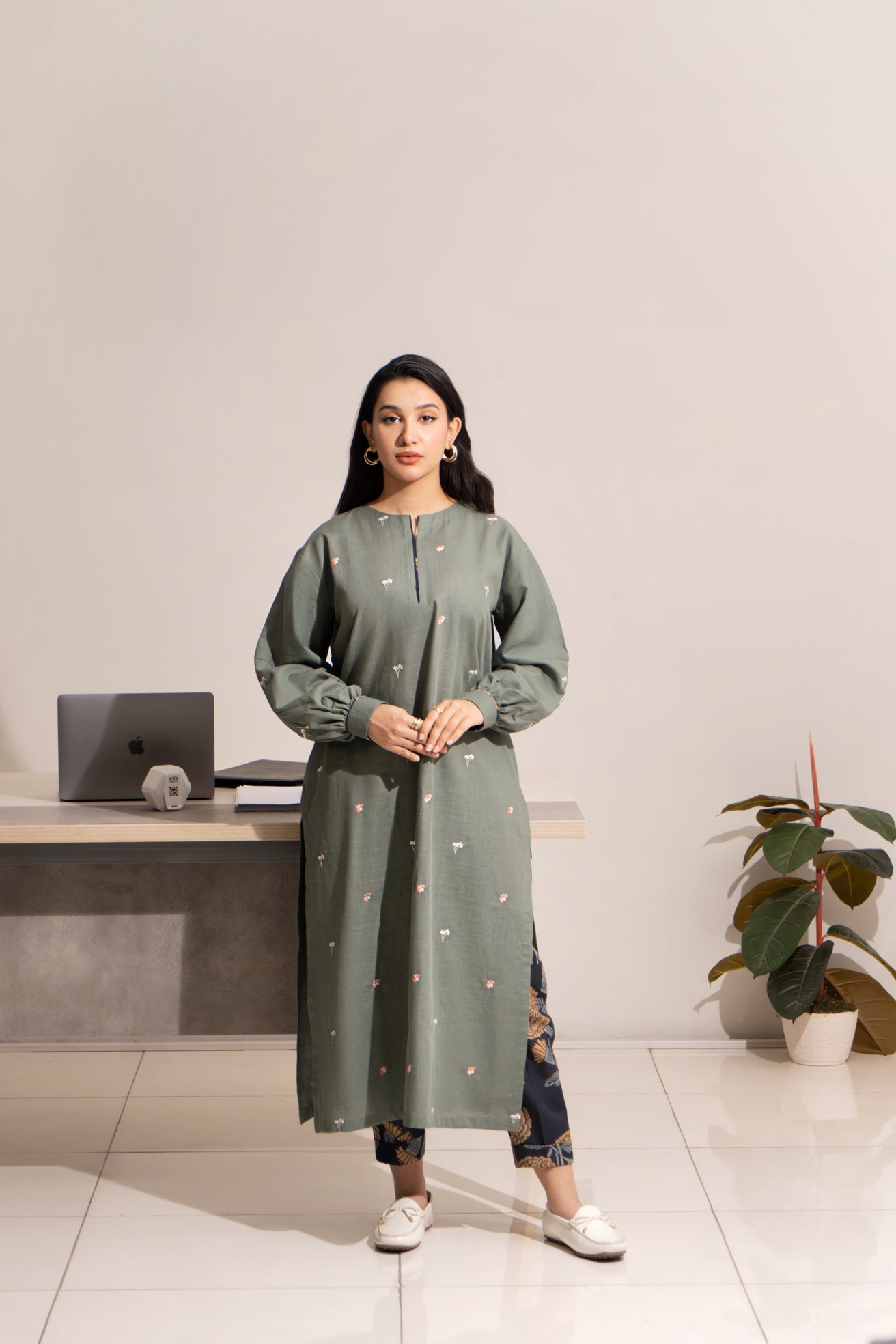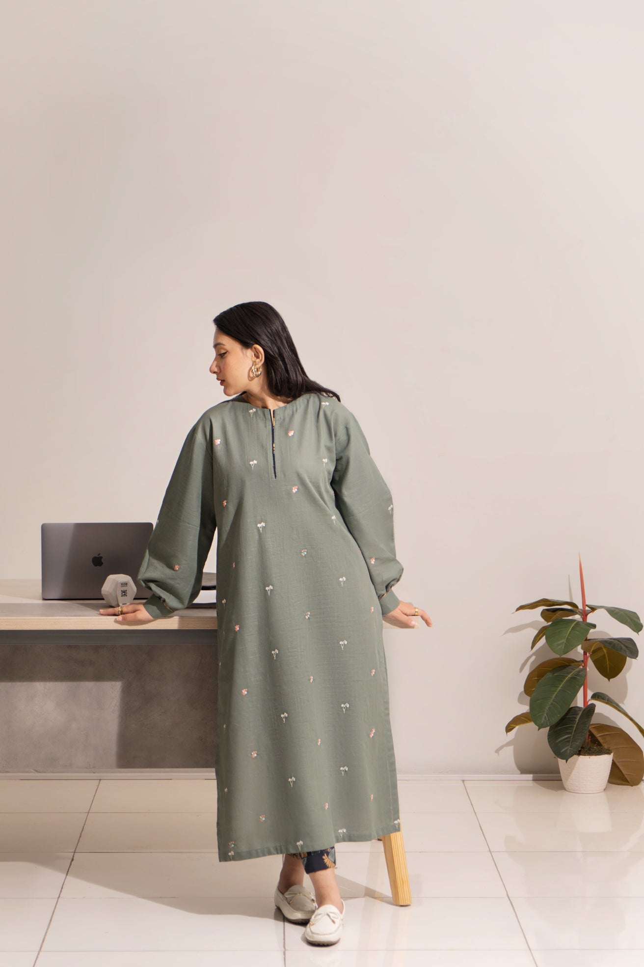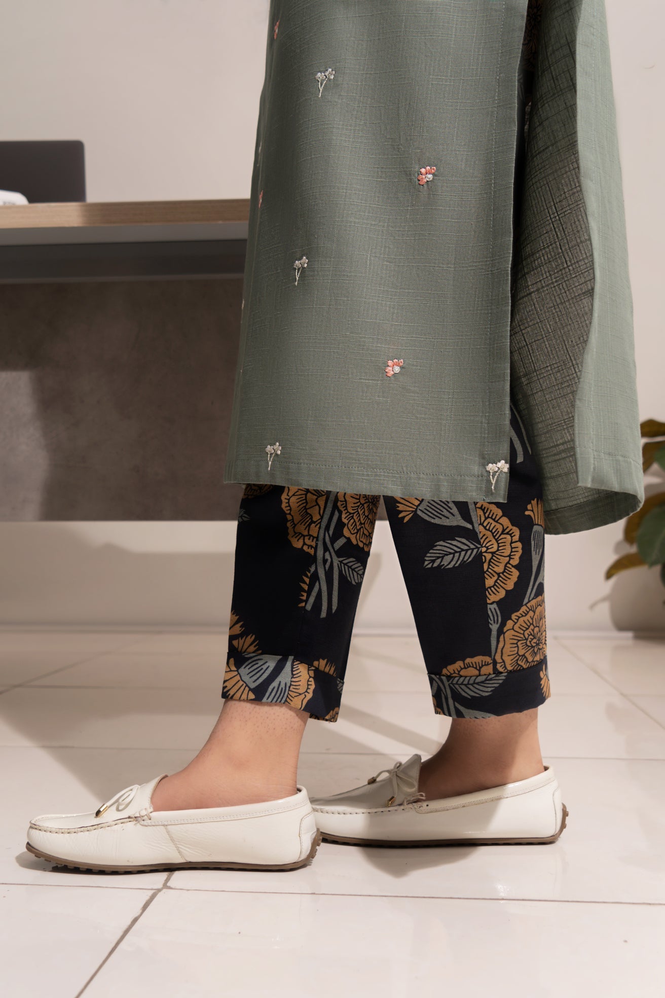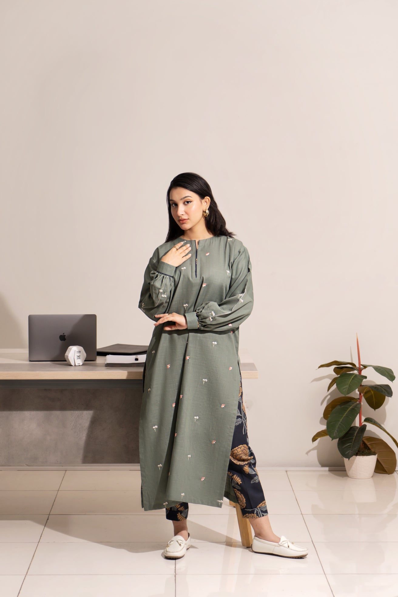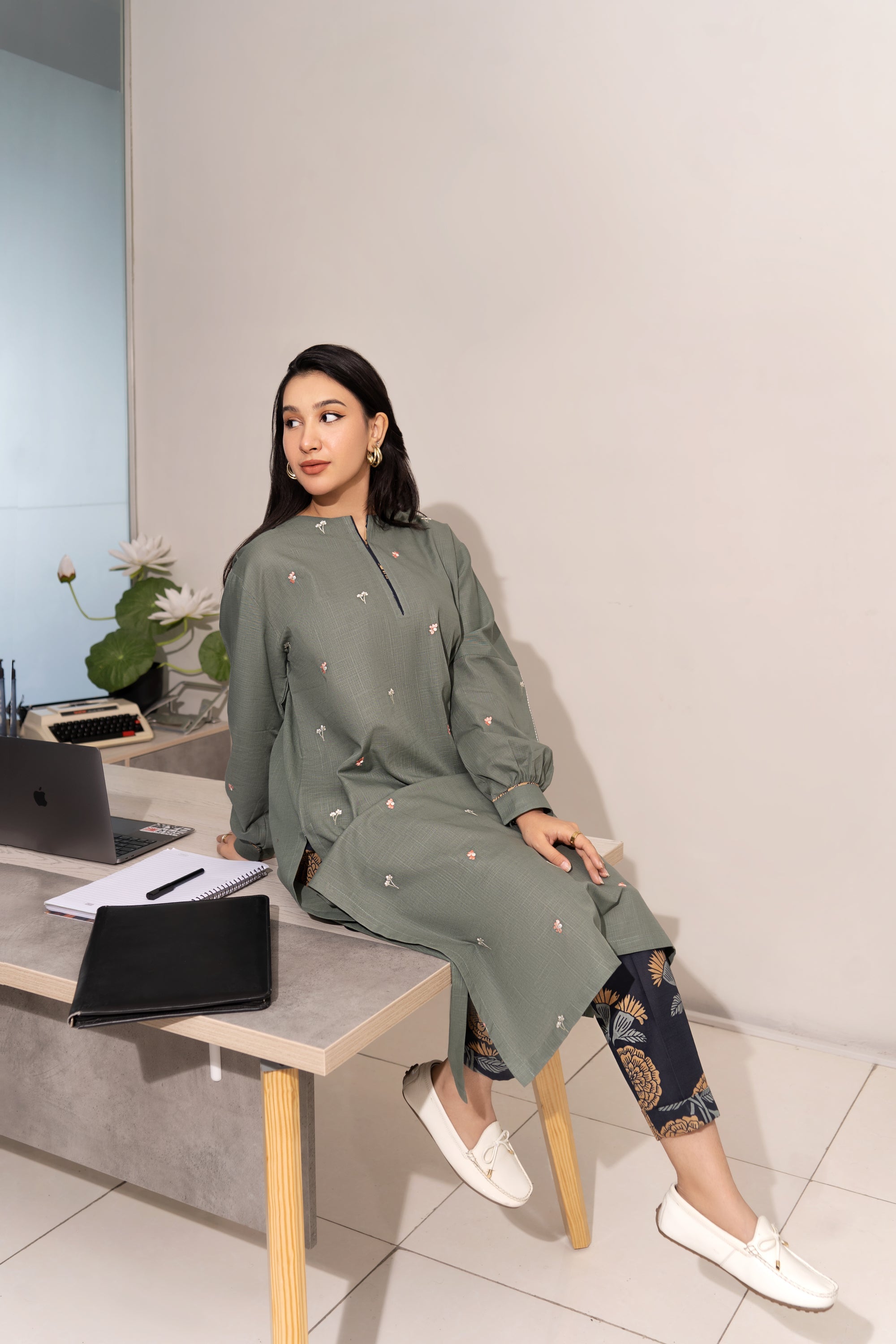 Upgrade your wardrobe with SLEEK CURVE - the ready-to-wear 2pc khaddar suit featuring a long loose shirt with pleated cuffs and intricate embroidery. Paired with straight printed trousers, this modern design is perfect for any occasion. Comfort and style combined in one!