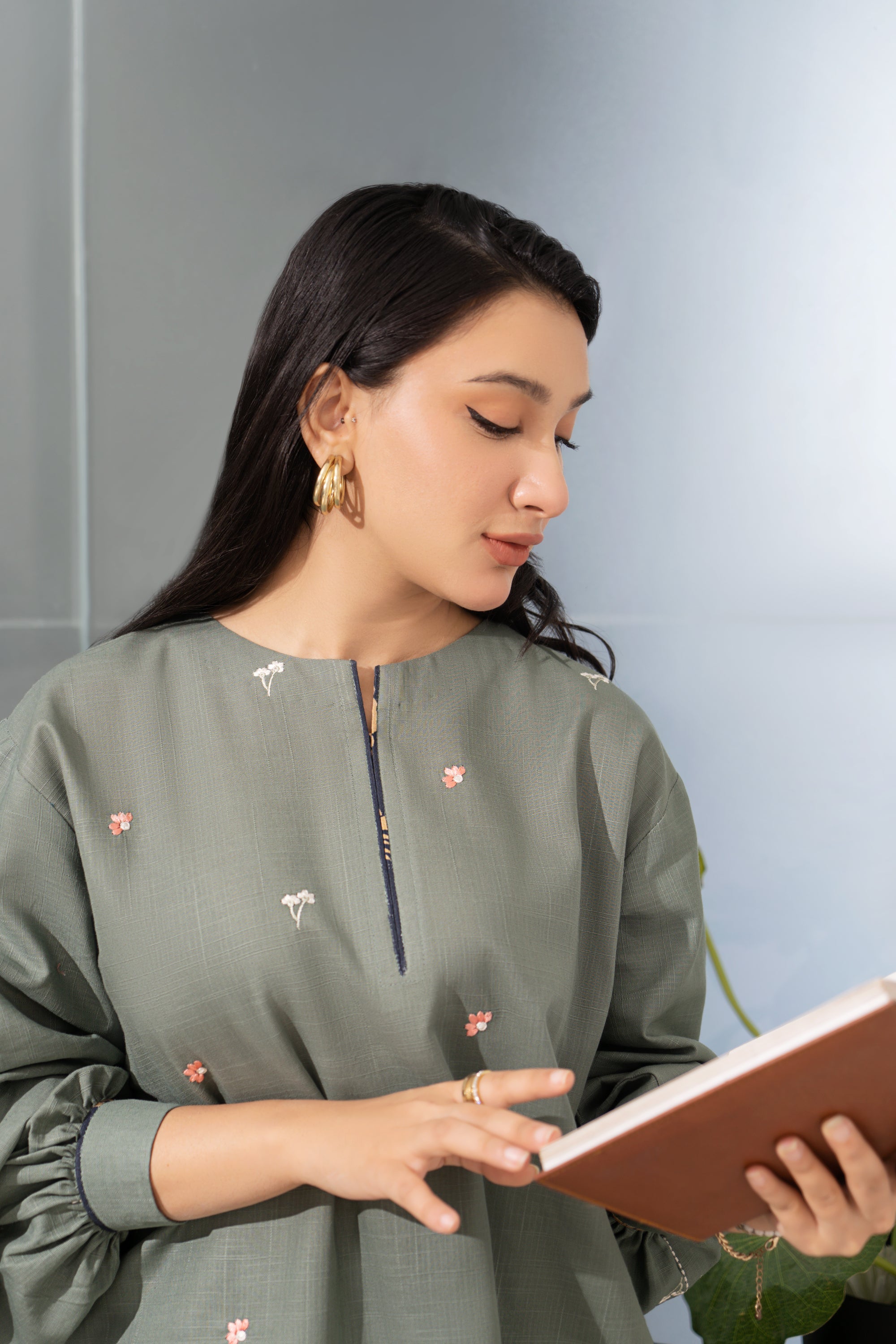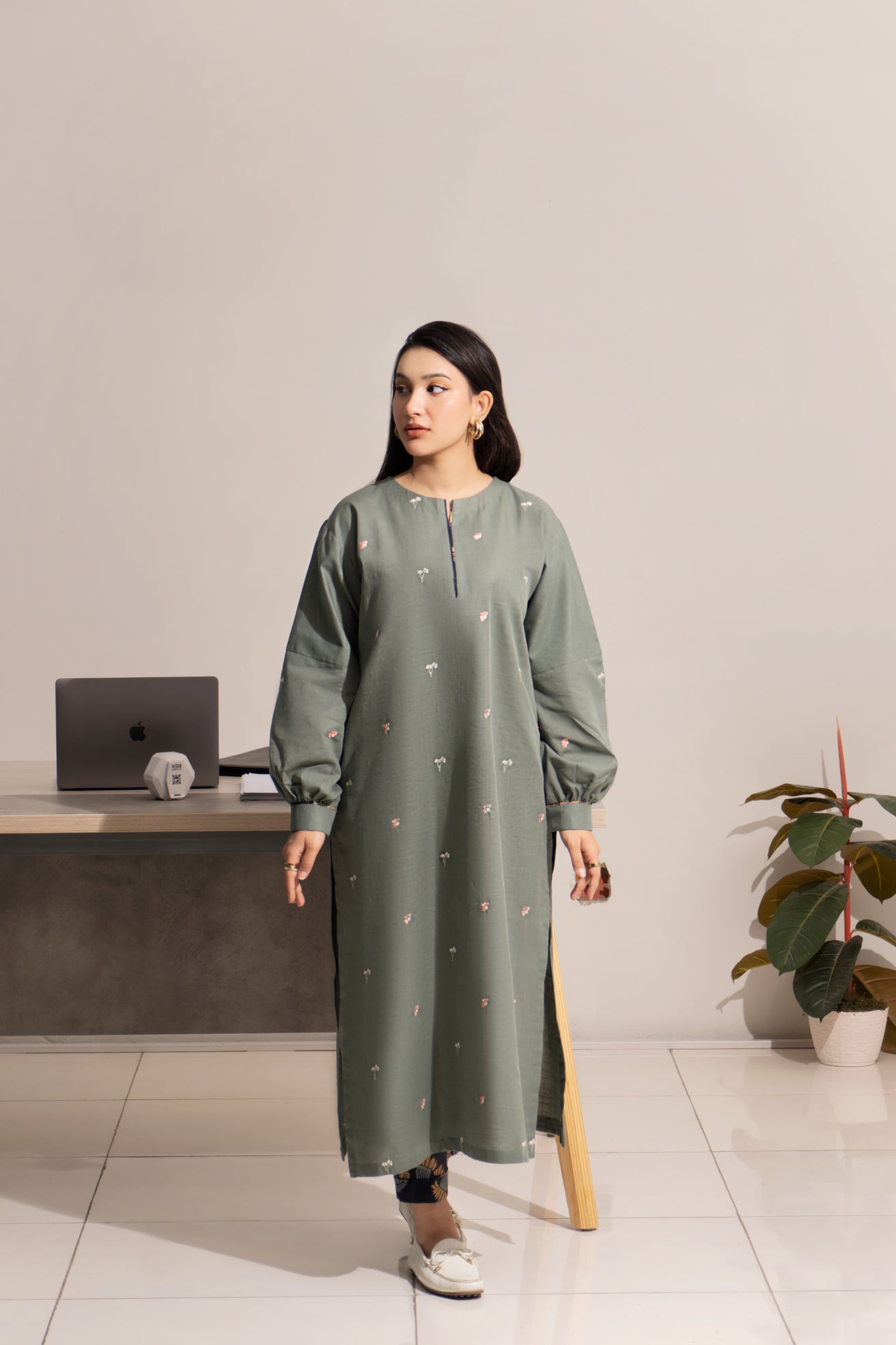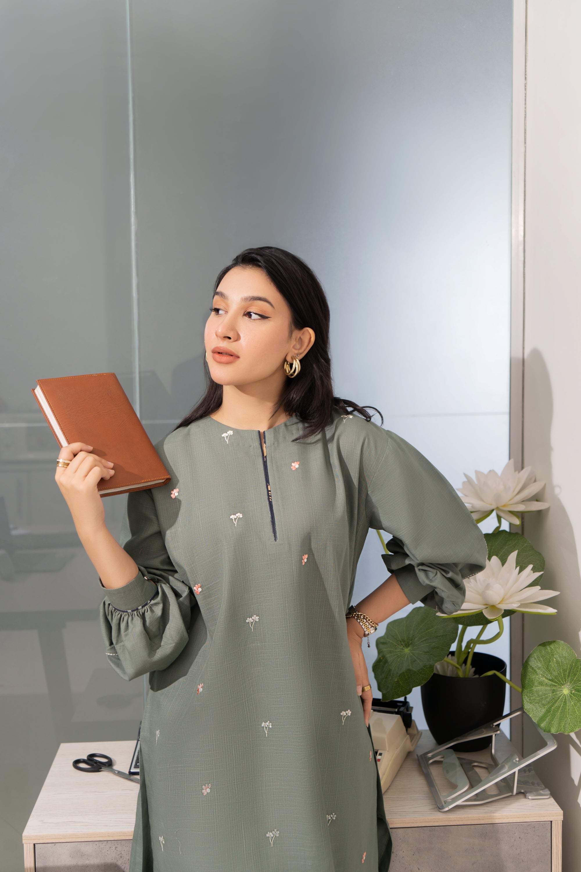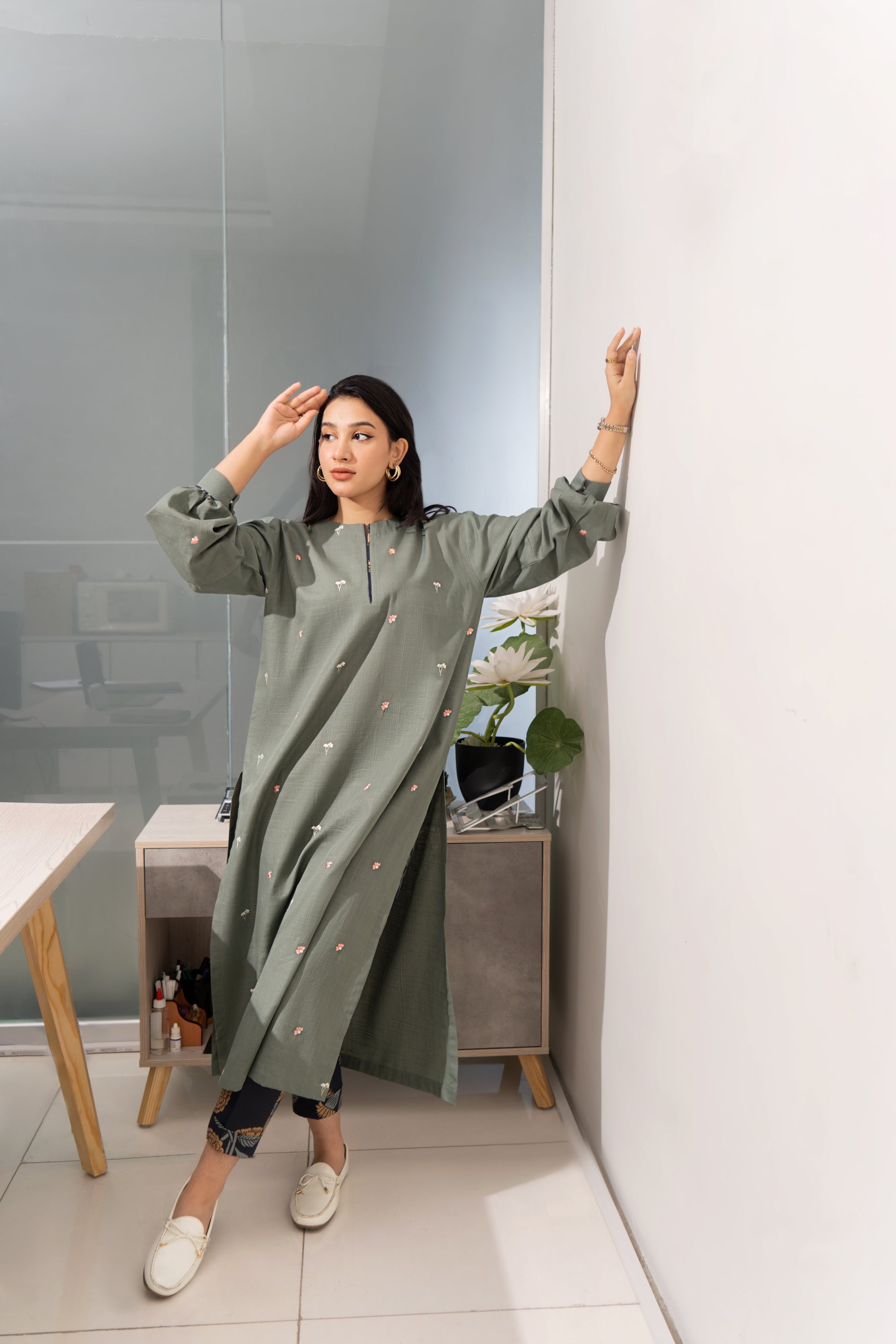 Upgrade your wardrobe with SLEEK CURVE - the ready-to-wear 2pc khaddar suit featuring a long loose shirt with pleated cuffs and intricate embroidery. Paired with straight printed trousers, this modern design is perfect for any occasion. Comfort and style combined in one!
