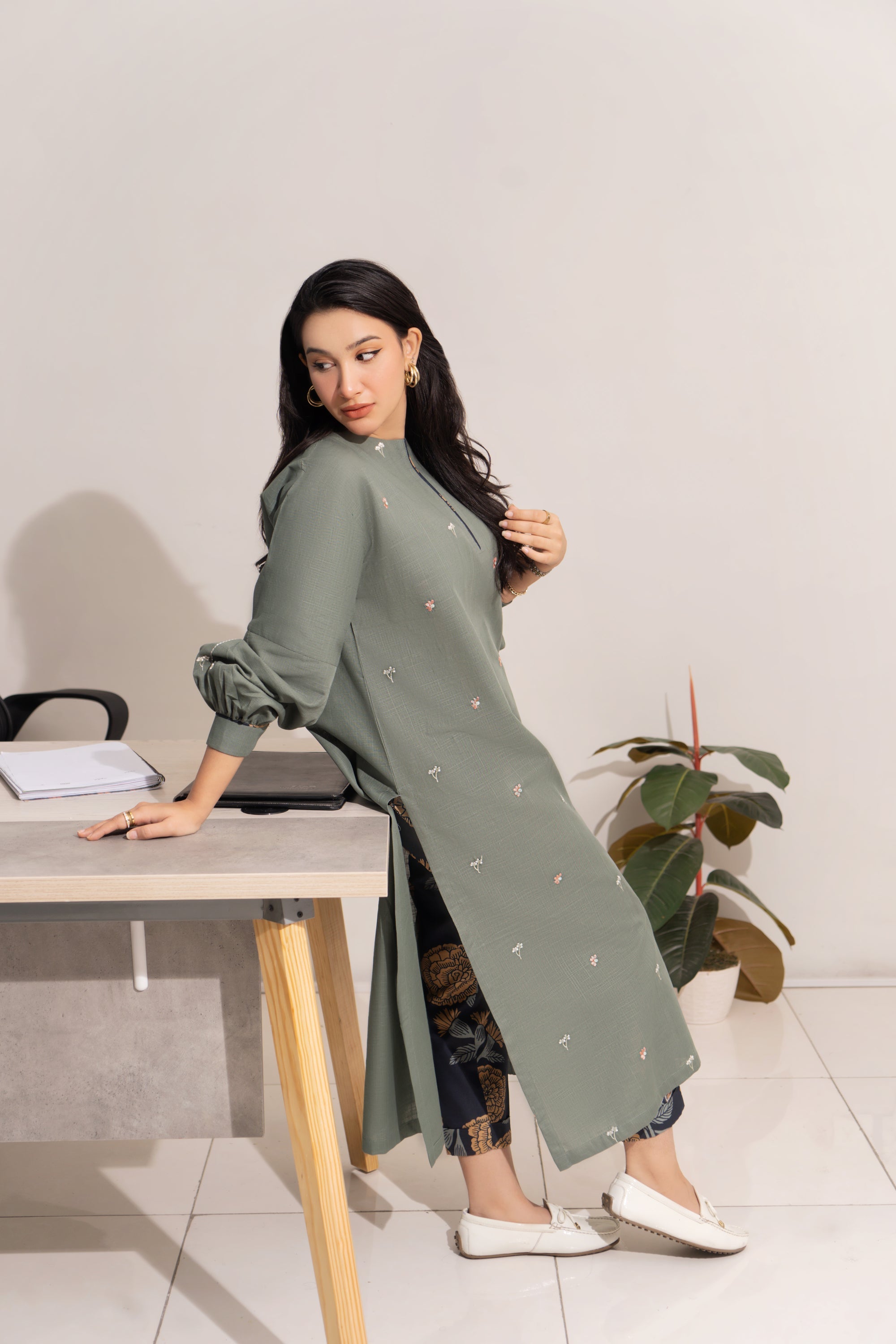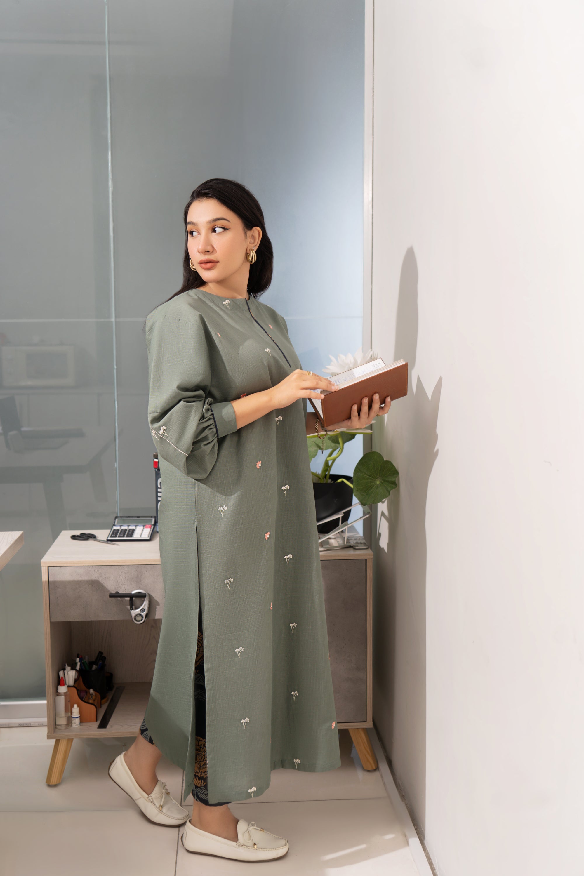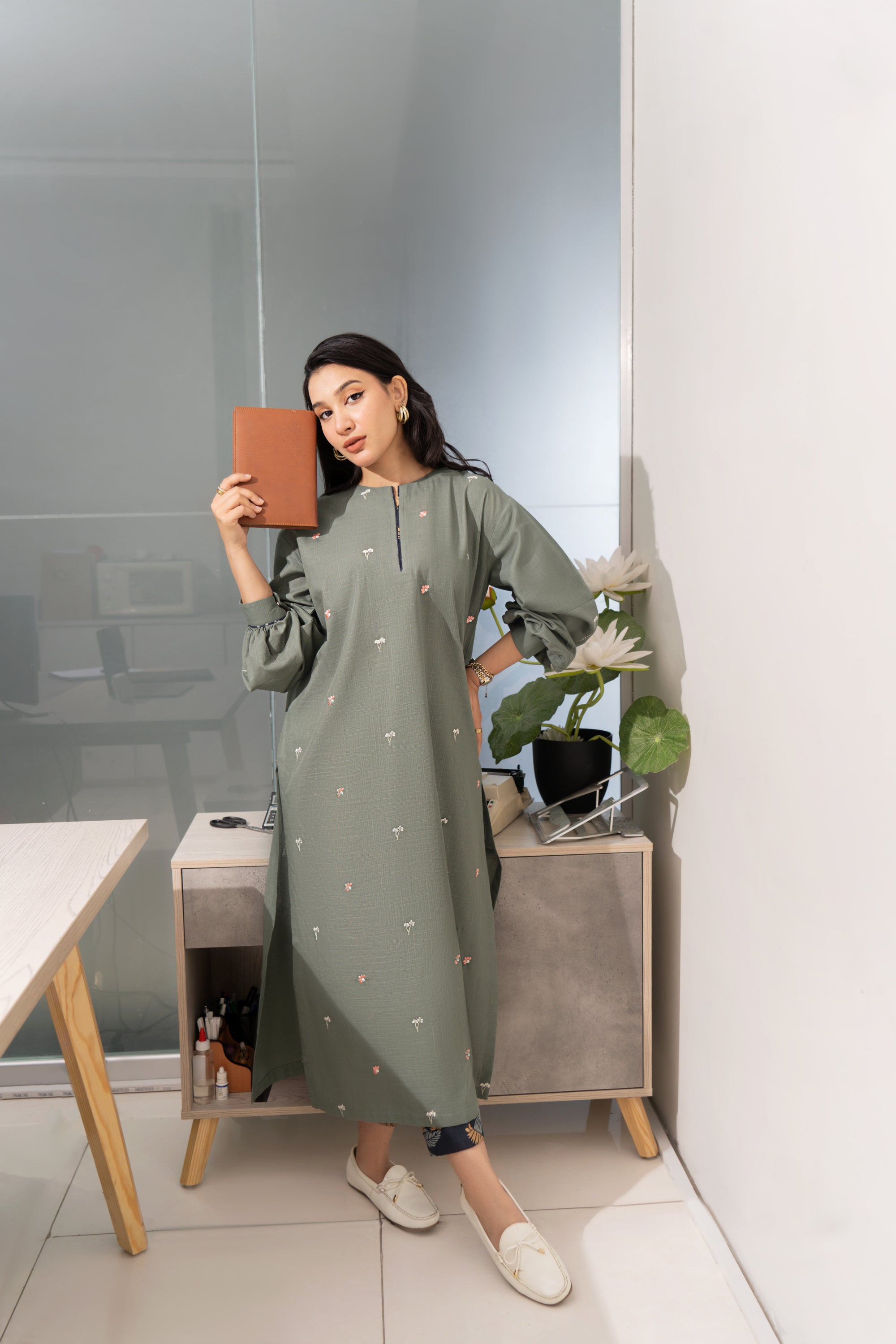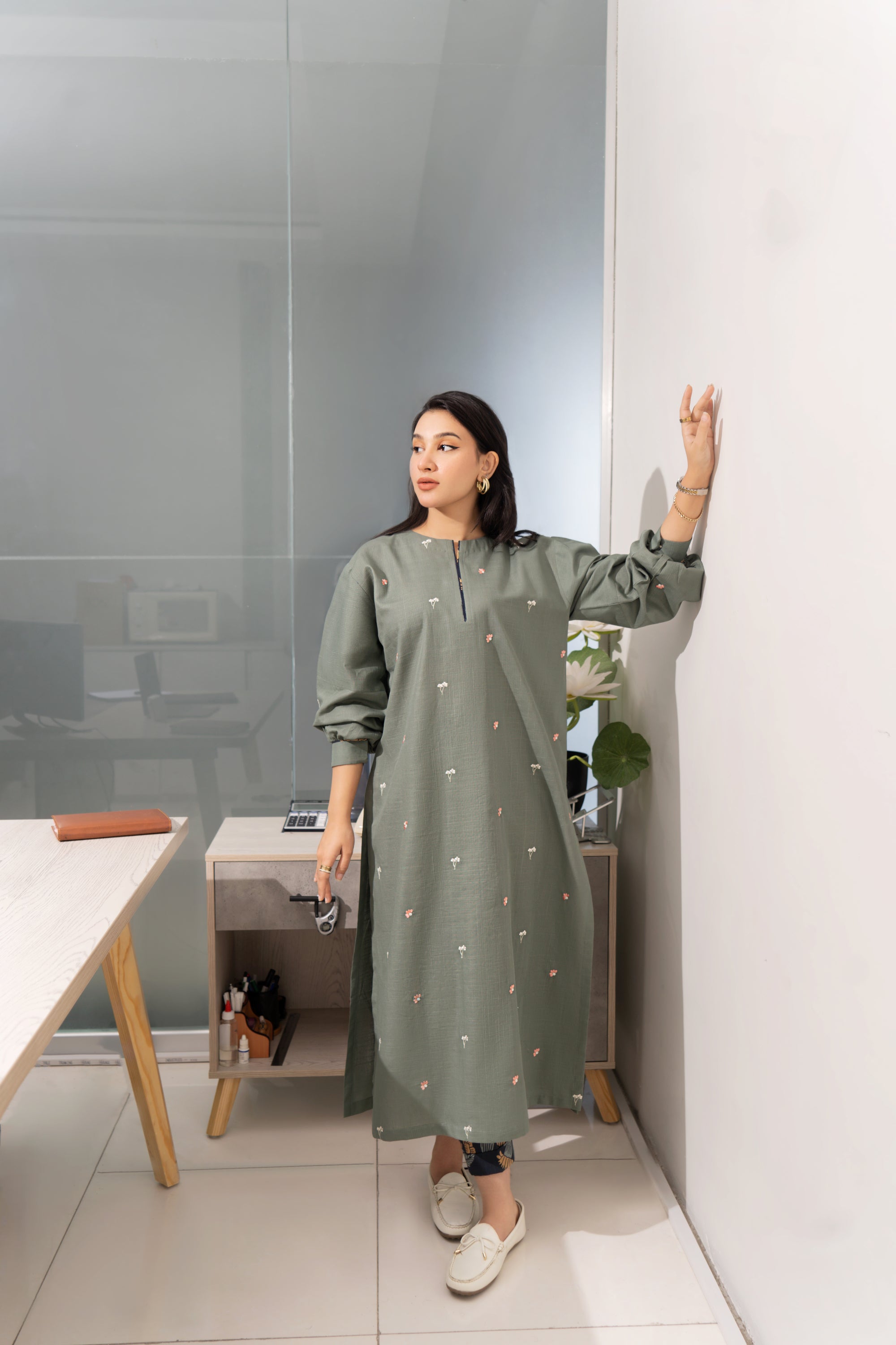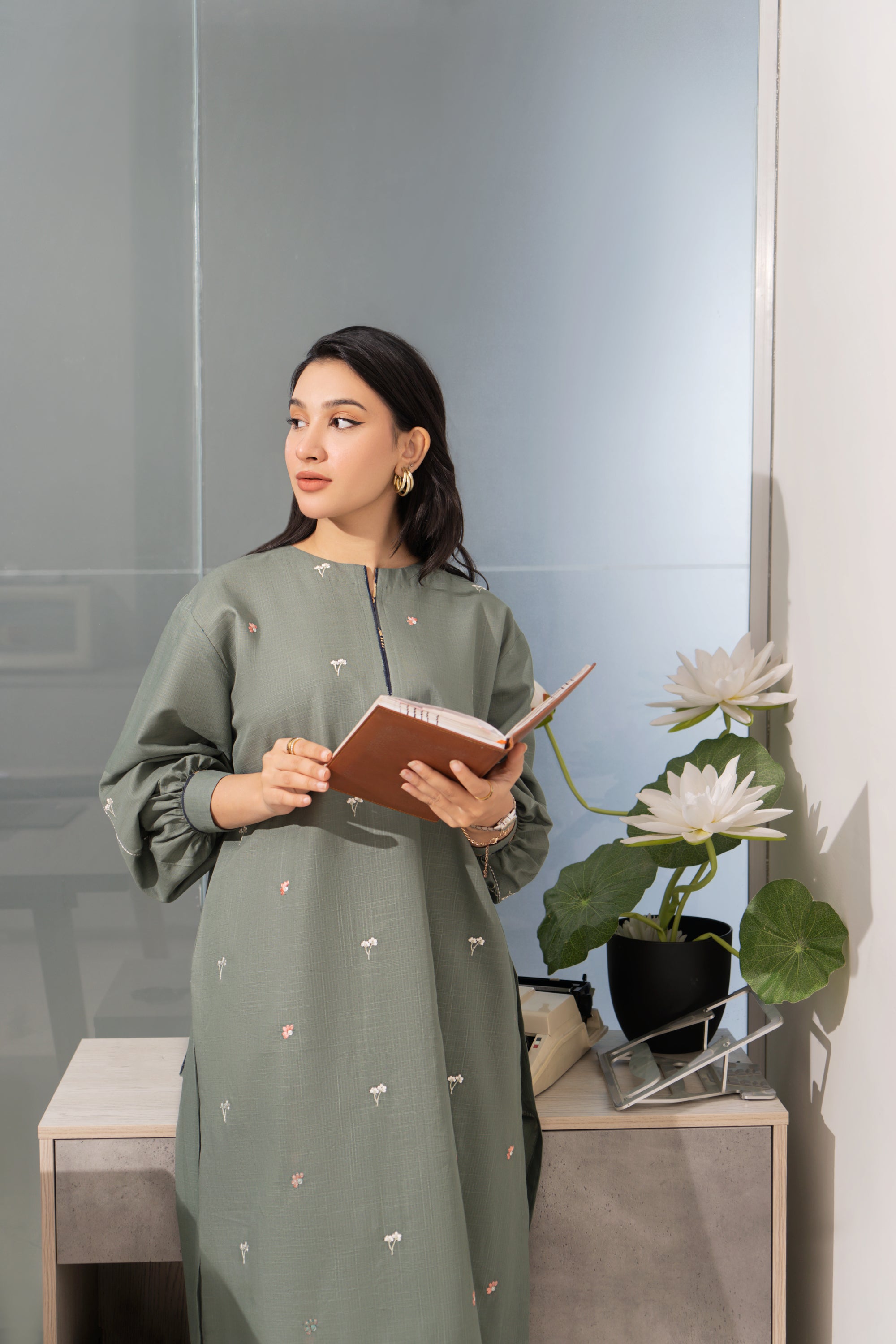 Upgrade your wardrobe with SLEEK CURVE - the ready-to-wear 2pc khaddar suit featuring a long loose shirt with pleated cuffs and intricate embroidery. Paired with straight printed trousers, this modern design is perfect for any occasion. Comfort and style combined in one!