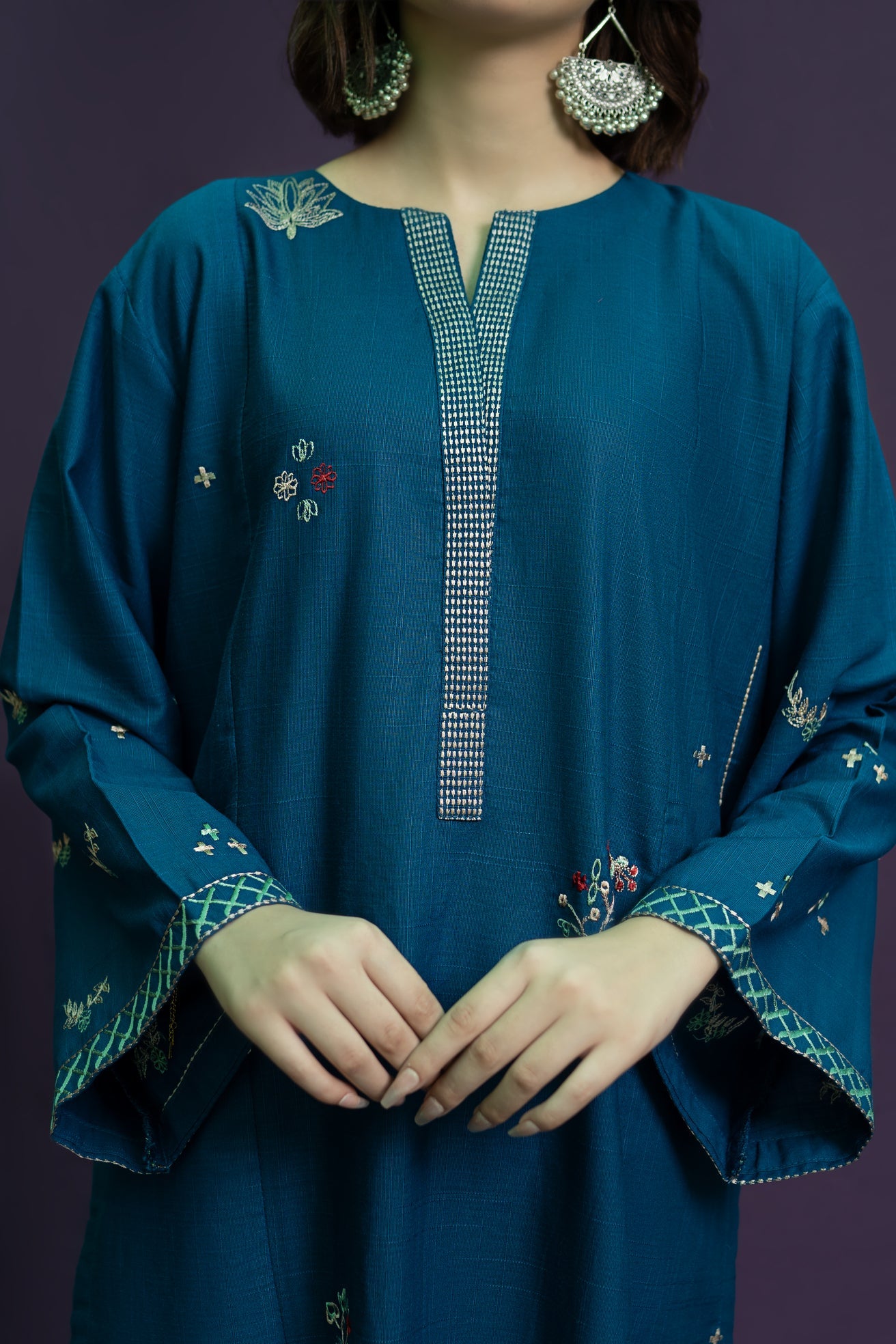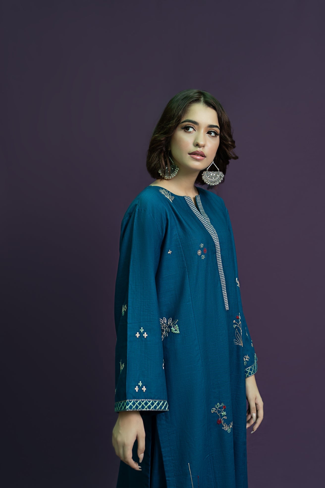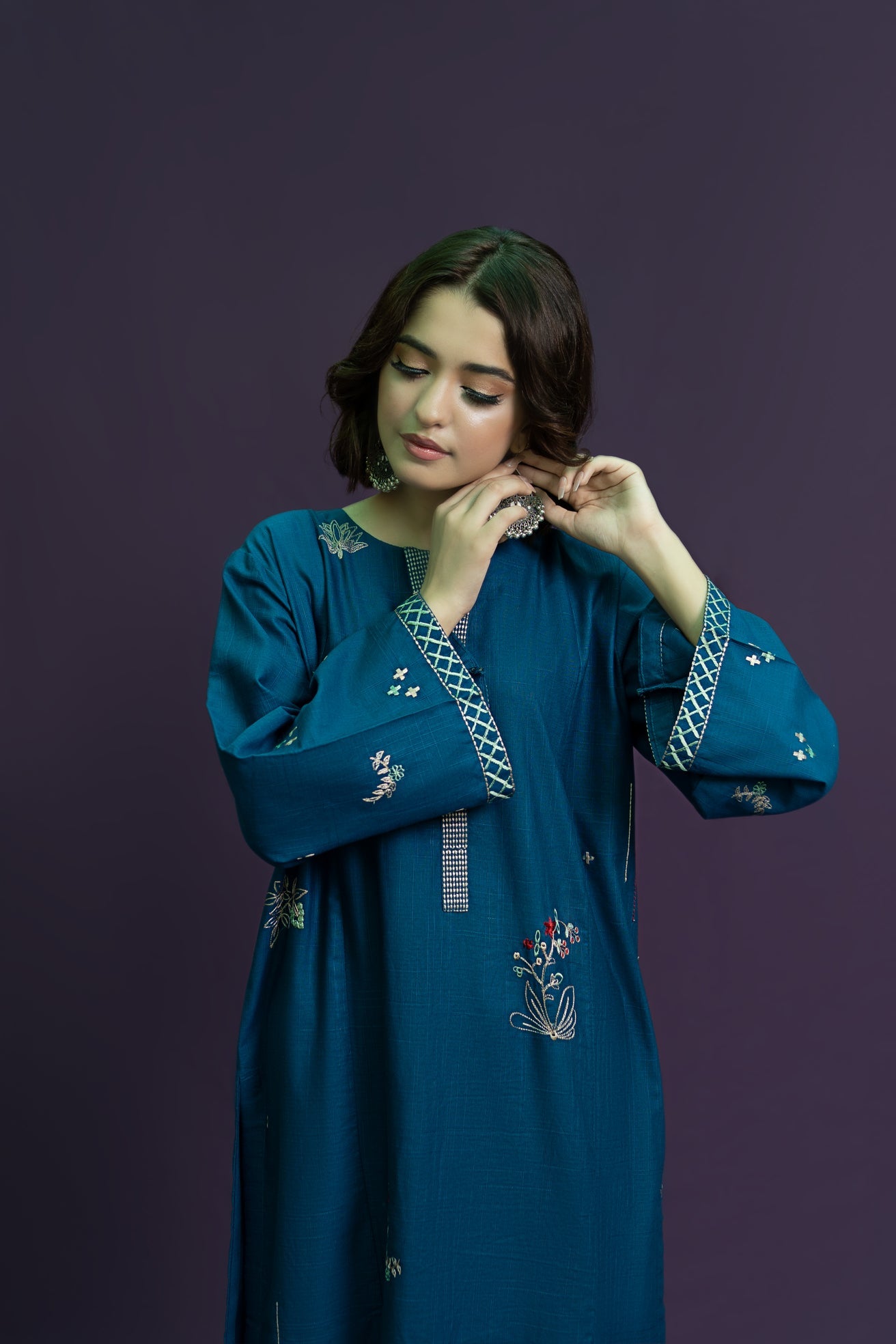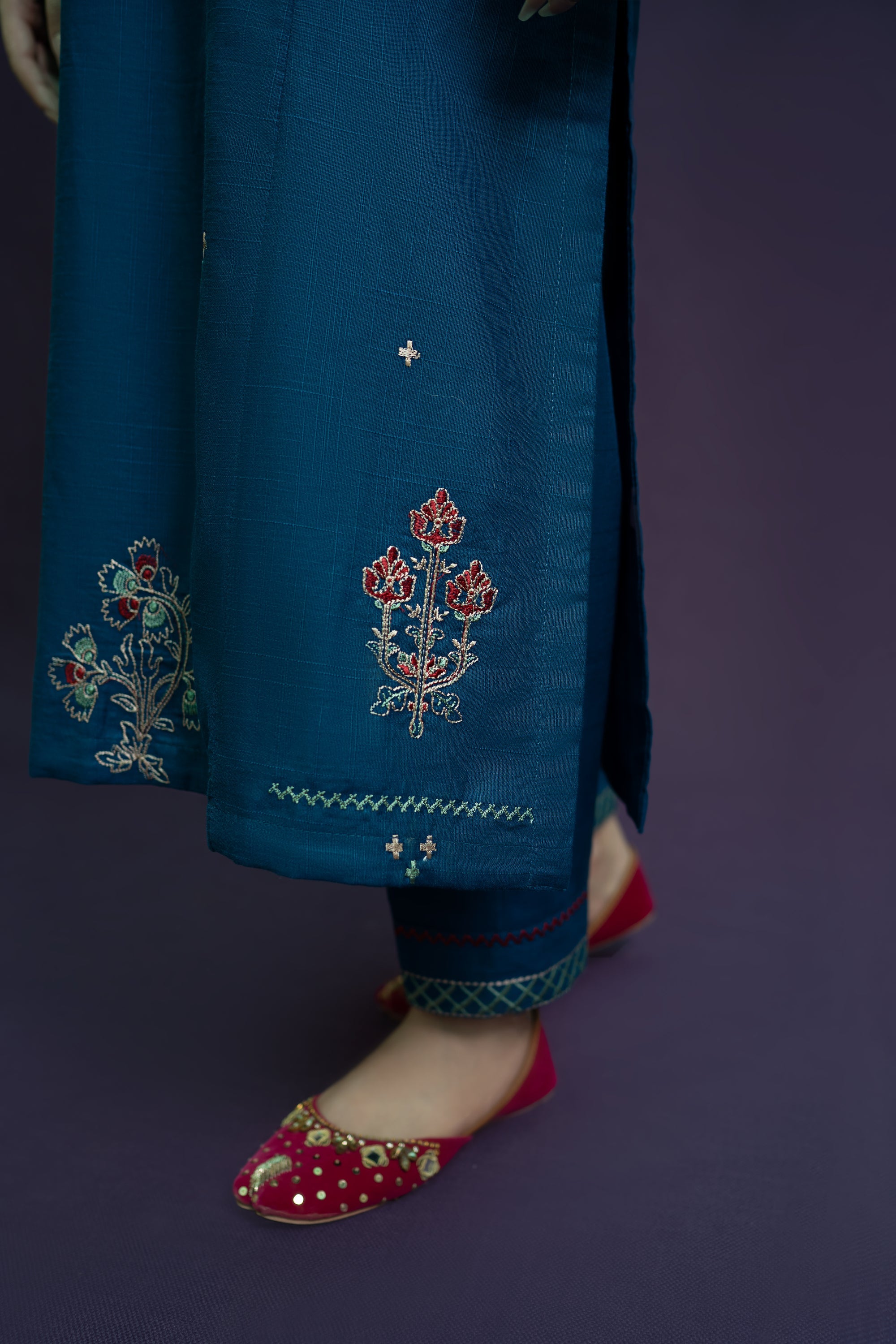 Introducing TARA, the perfect ready-to-wear 2pc embroidered khaddar suit. Featuring unique embroidery motifs on the shirt front and sleeves, paired with embroidered straight trousers. Elevate your style with this one-of-a-kind ensemble.